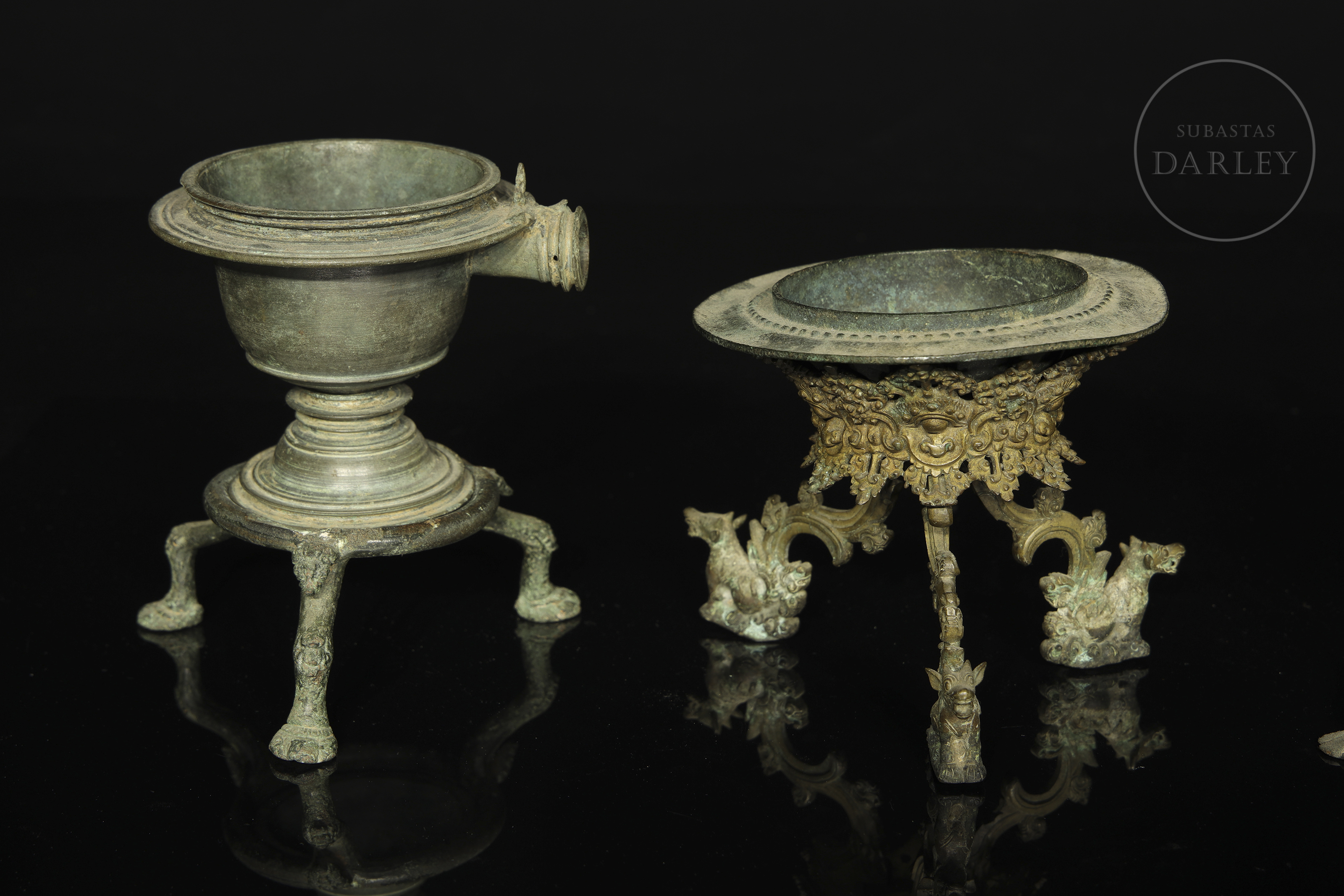 Set of four antique bronze objects with oxidation patina, partially revealing the colour of the underlying metal. They have varied shapes, including two pieces resembling ceremonial braziers on tall legs, a cylindrical incense burner with a lid, and a small decorative container.