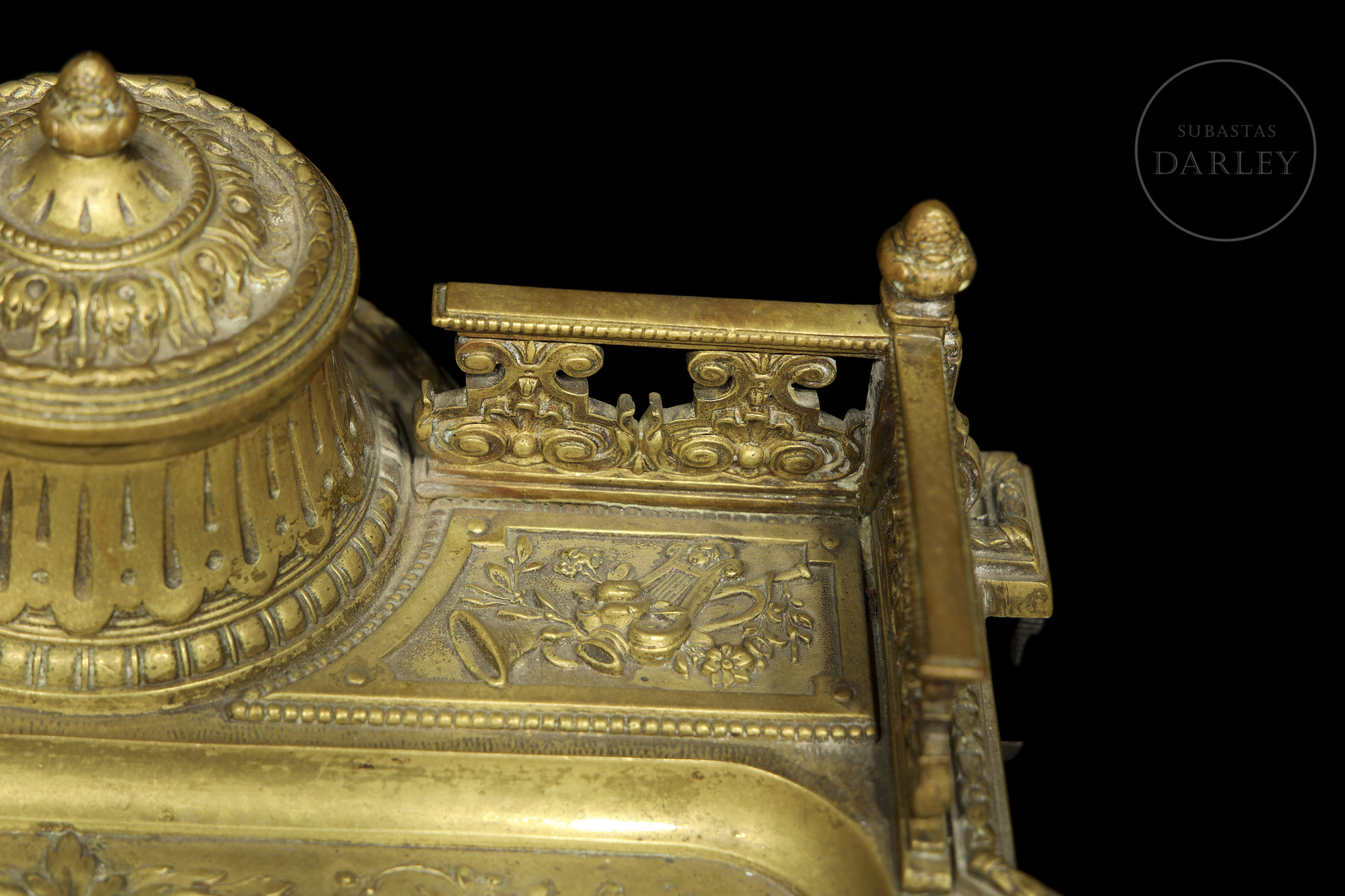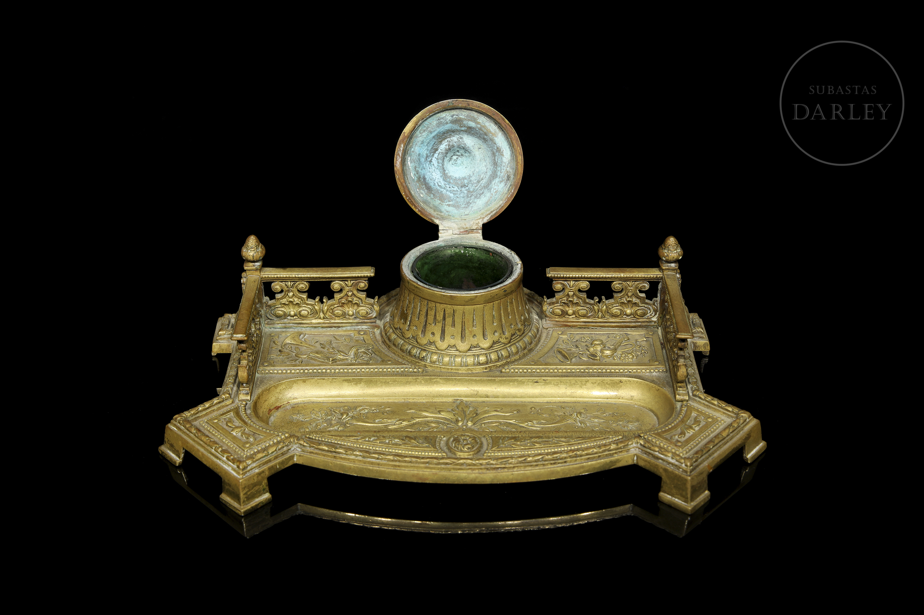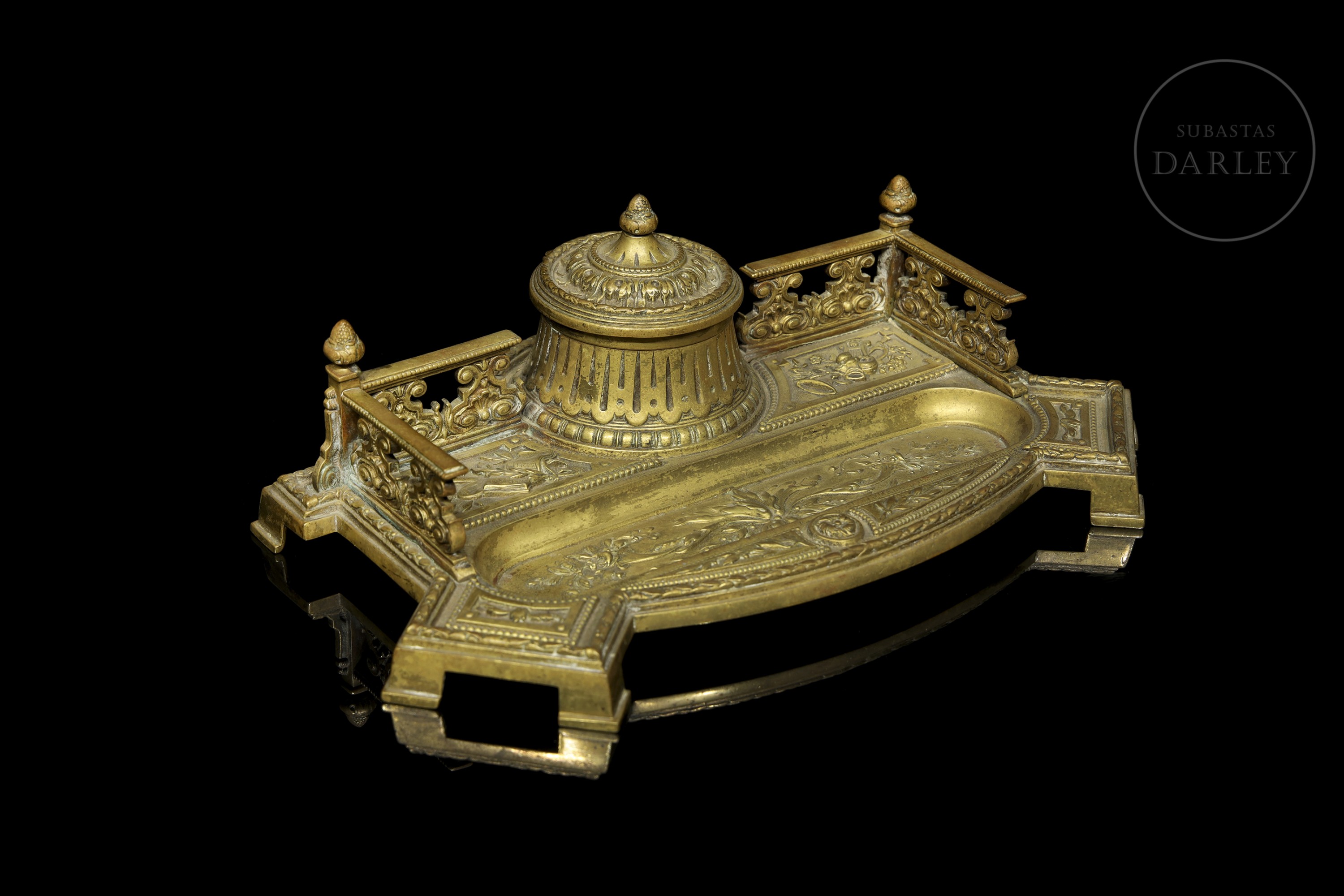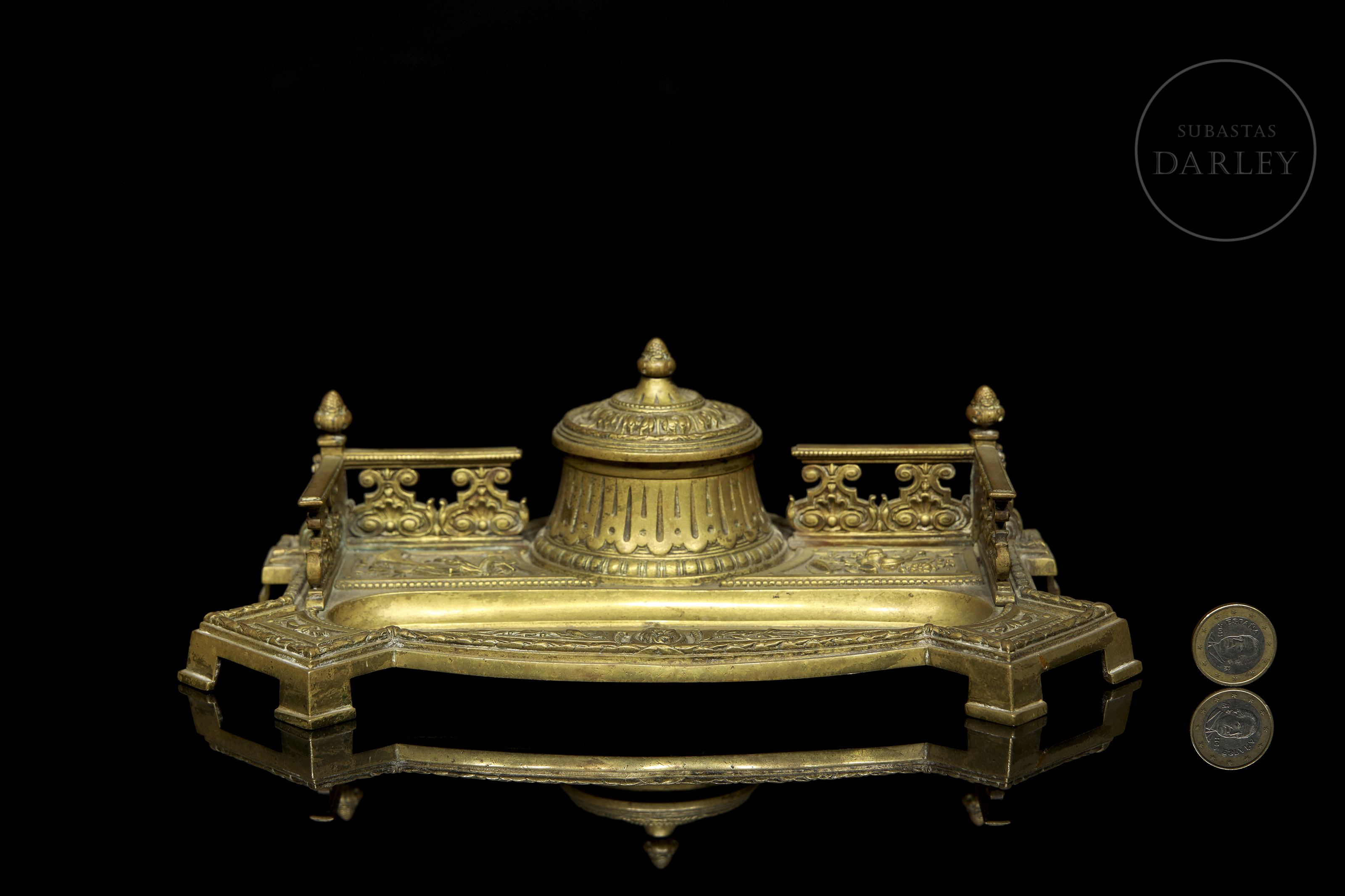 Metal writing desk with inkwell and small frontal basin. Relief decoration with floral and architectural themes, with the presence of some musical instruments. It shows some wear due to age.