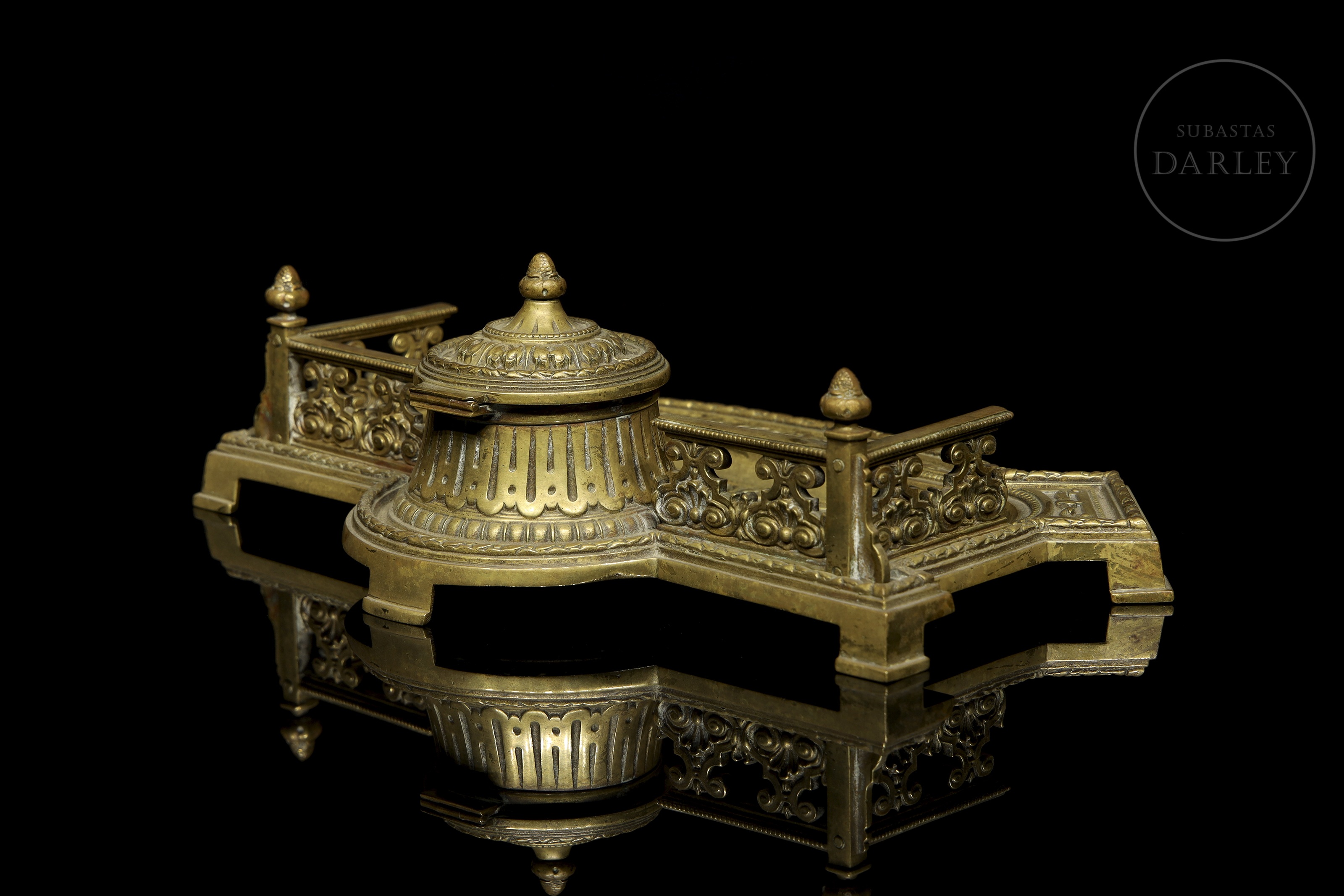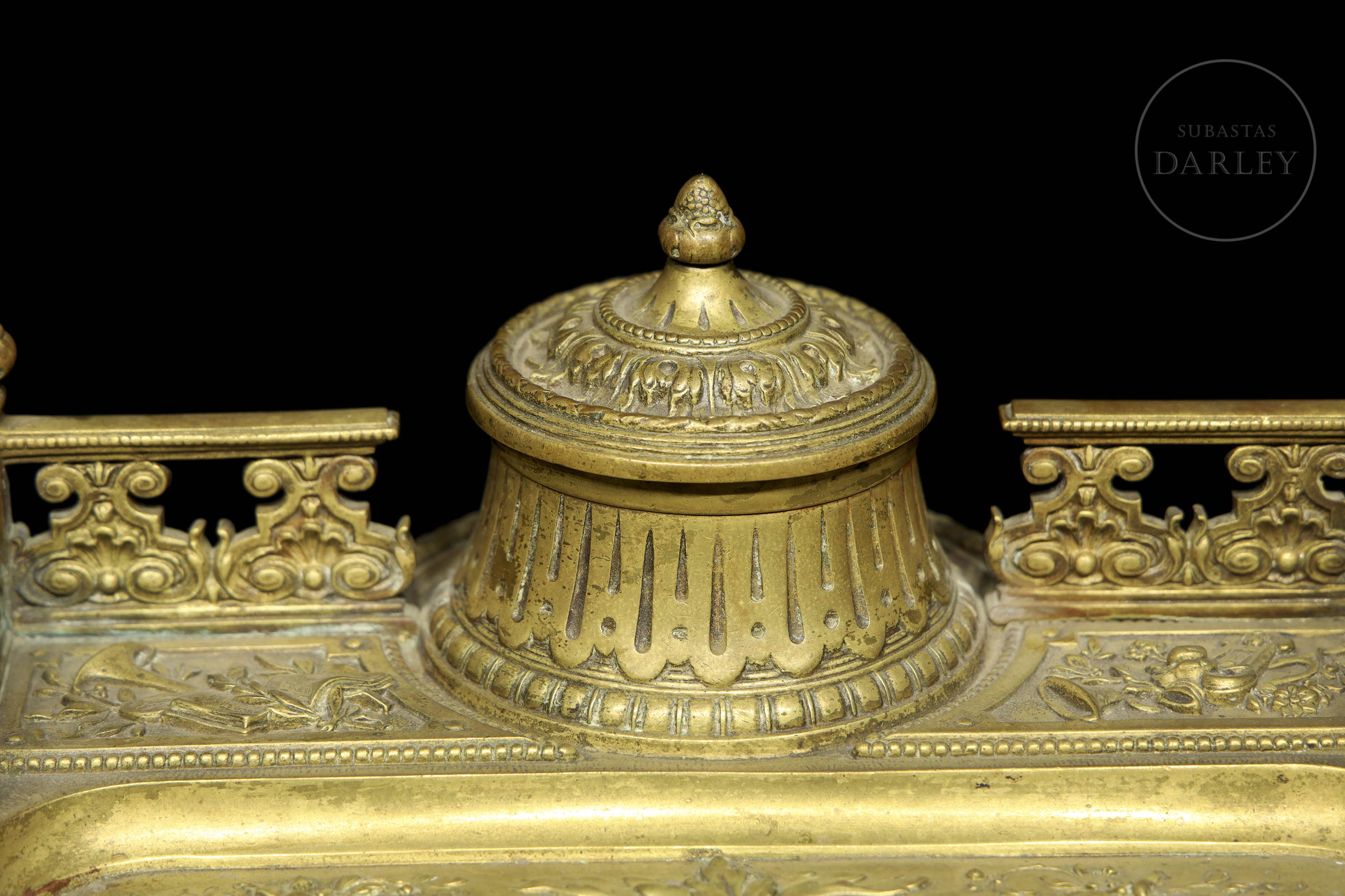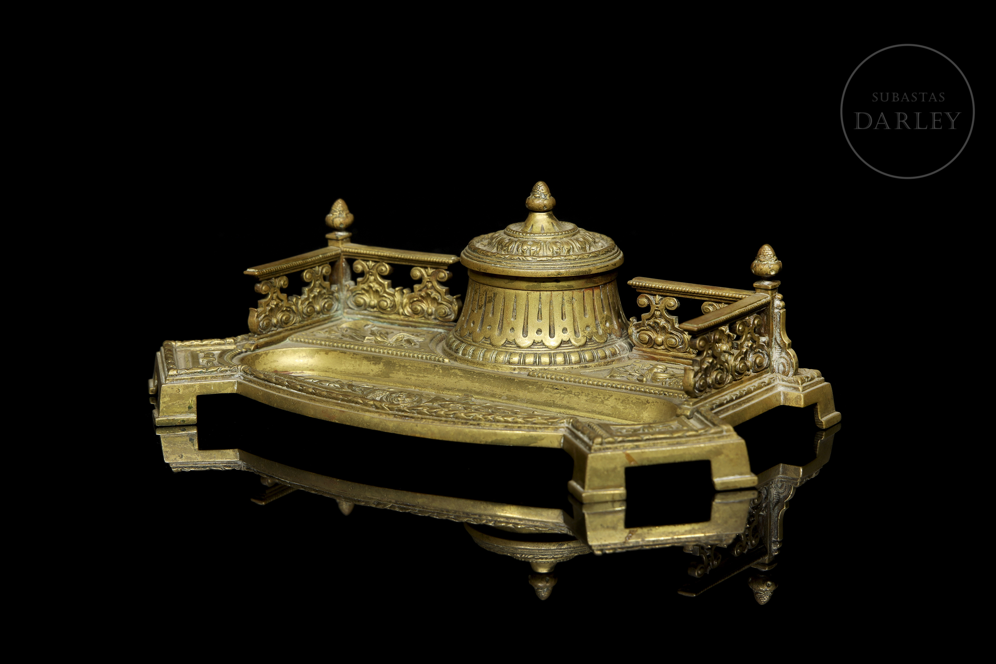 Metal writing desk with inkwell and small frontal basin. Relief decoration with floral and architectural themes, with the presence of some musical instruments. It shows some wear due to age.