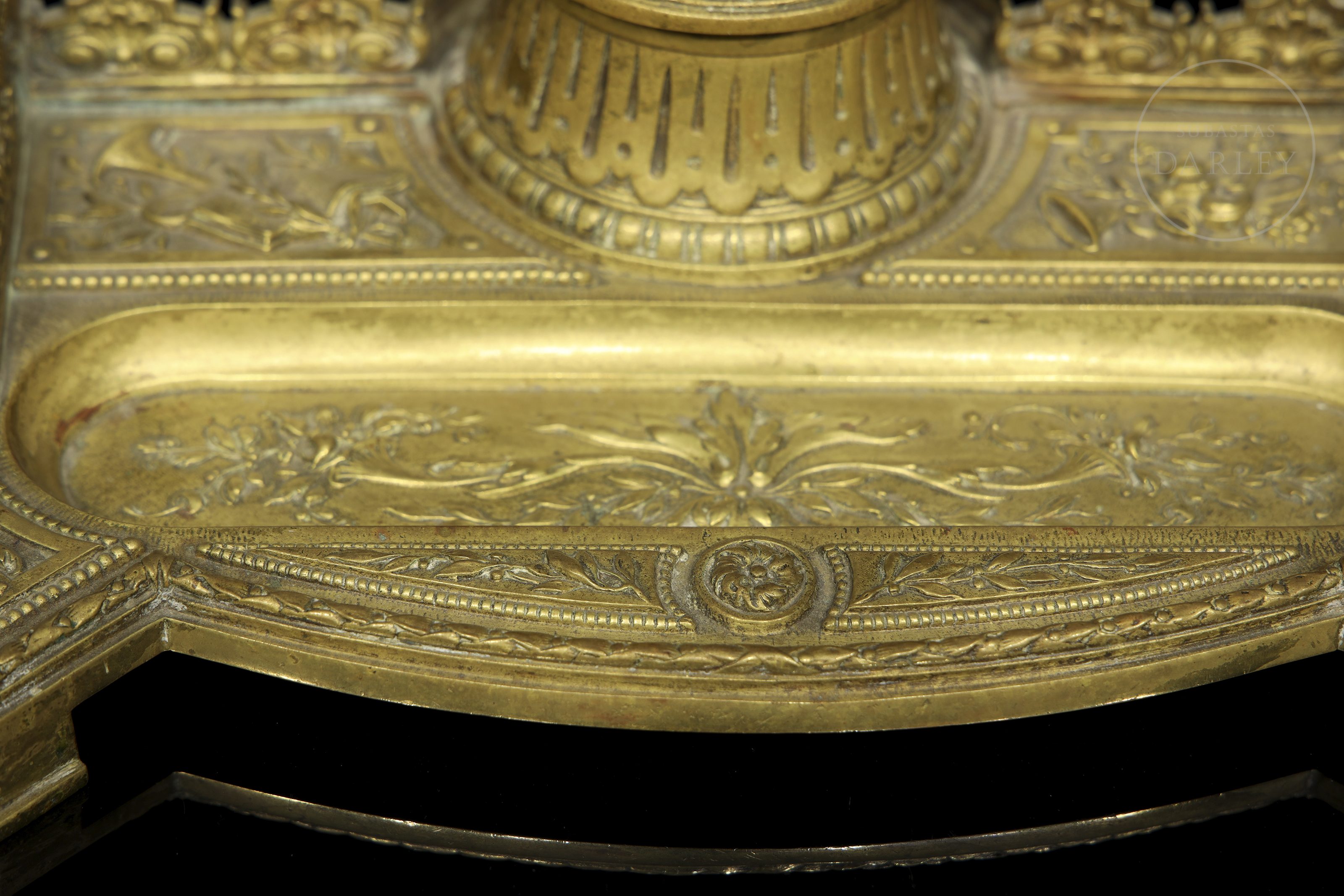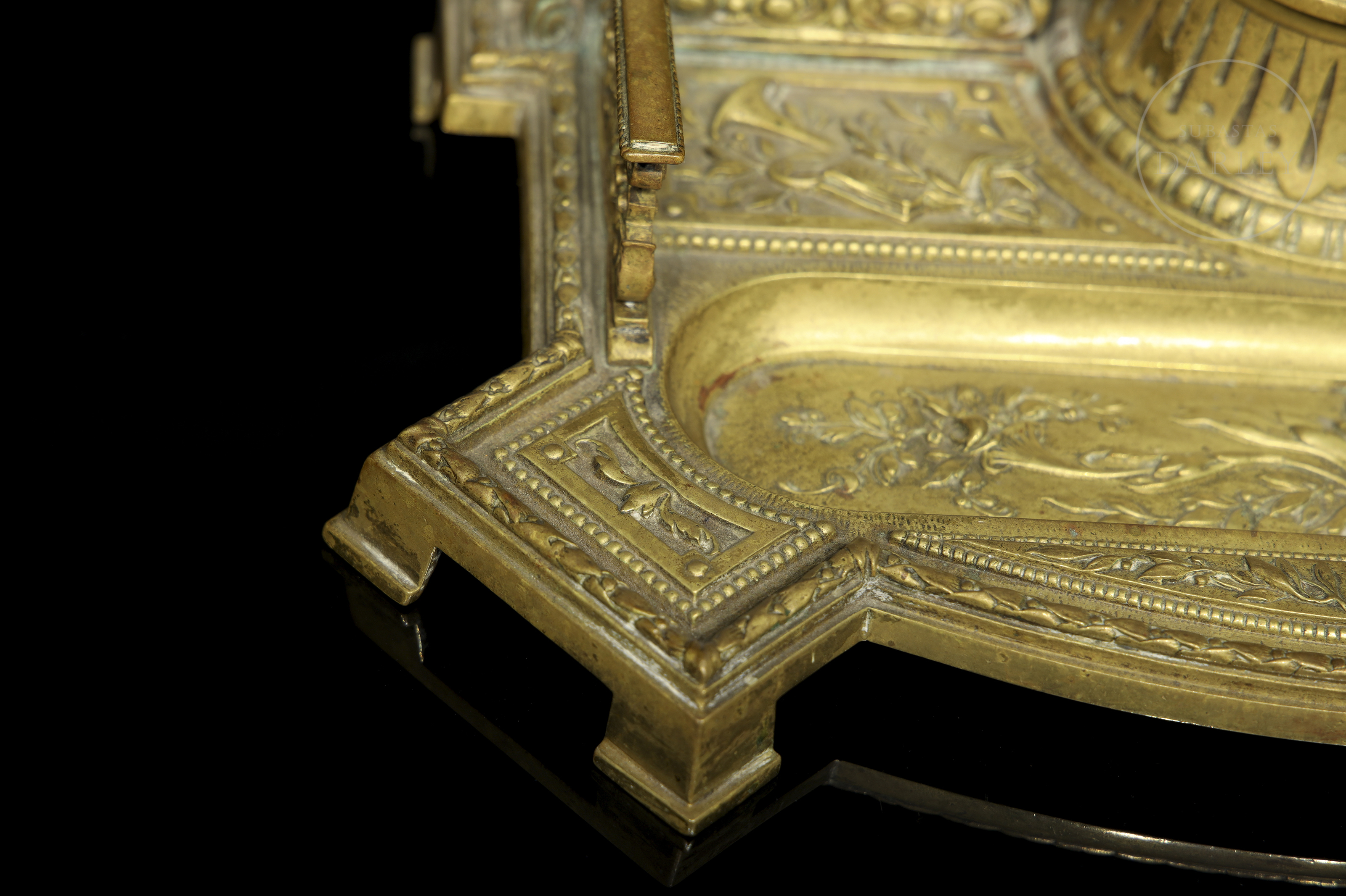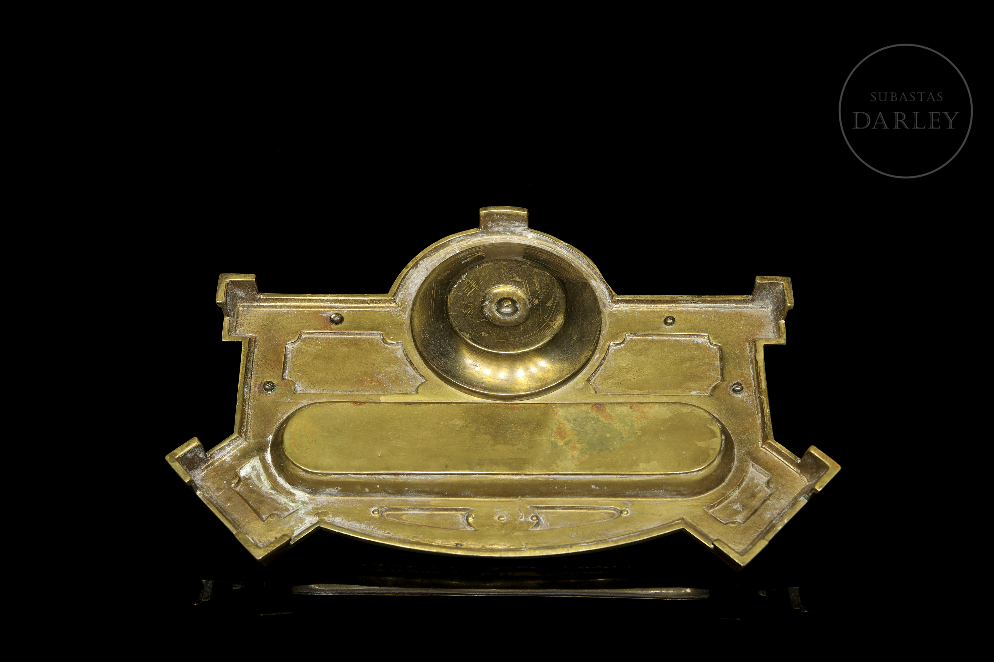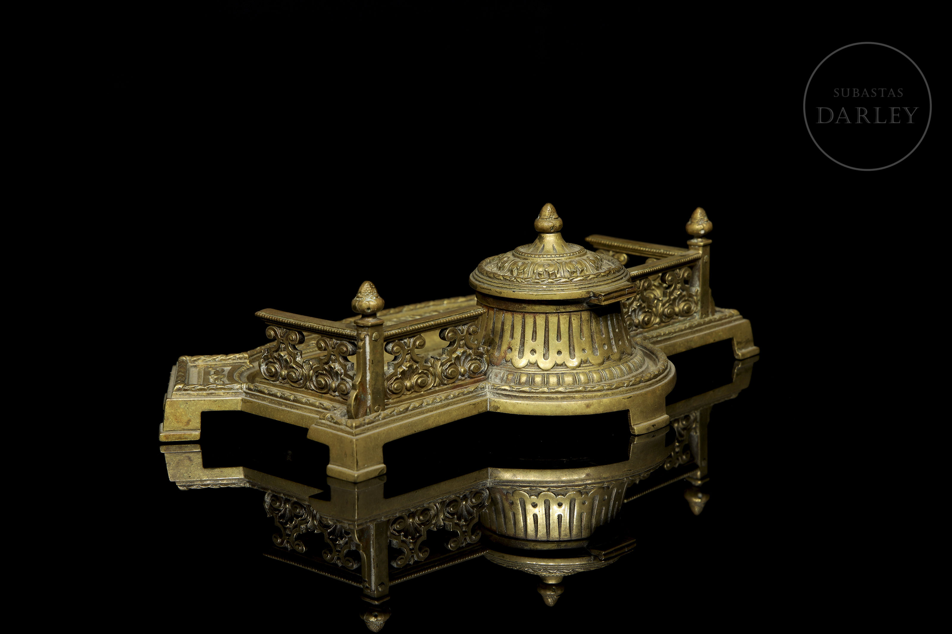 Metal writing desk with inkwell and small frontal basin. Relief decoration with floral and architectural themes, with the presence of some musical instruments. It shows some wear due to age.