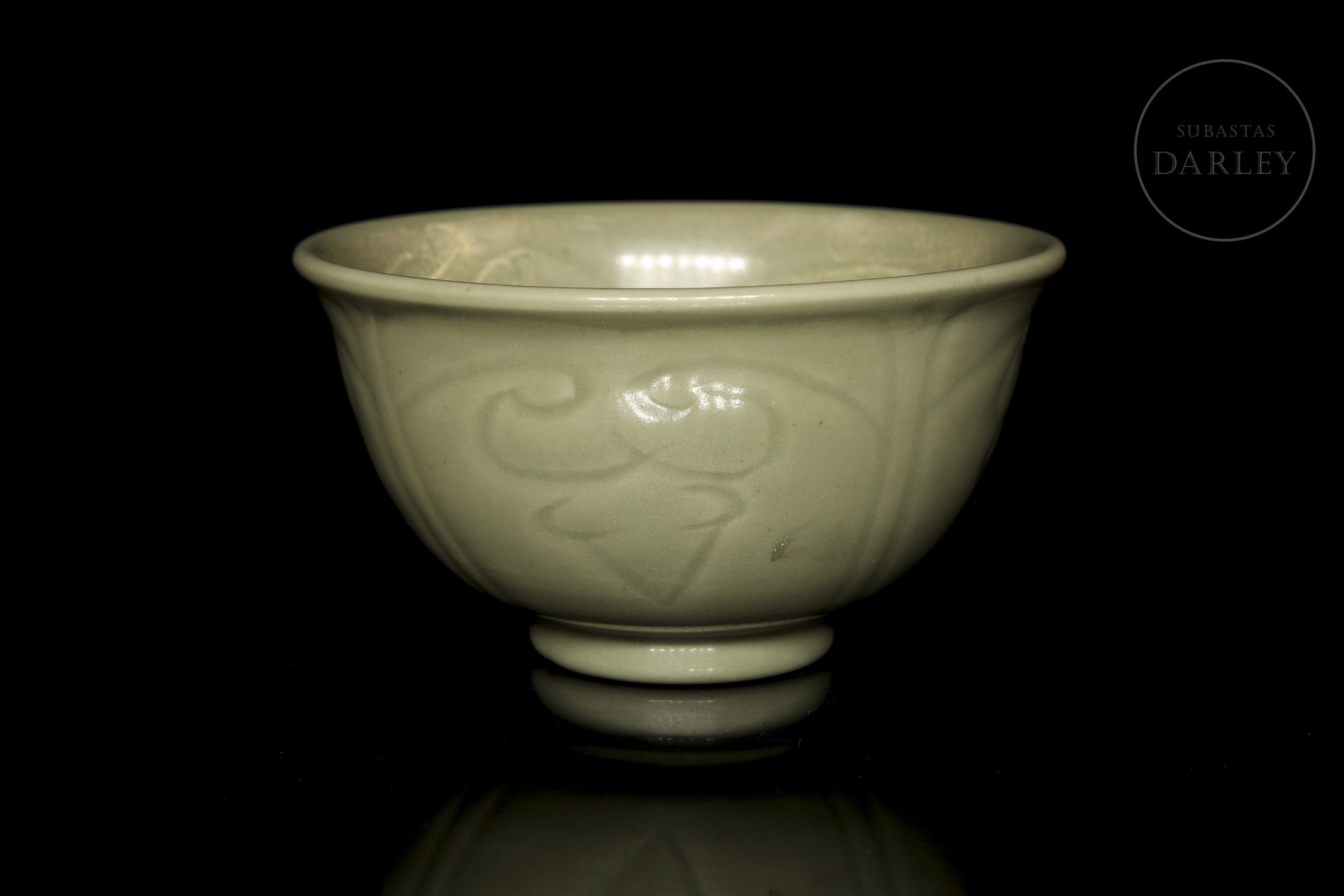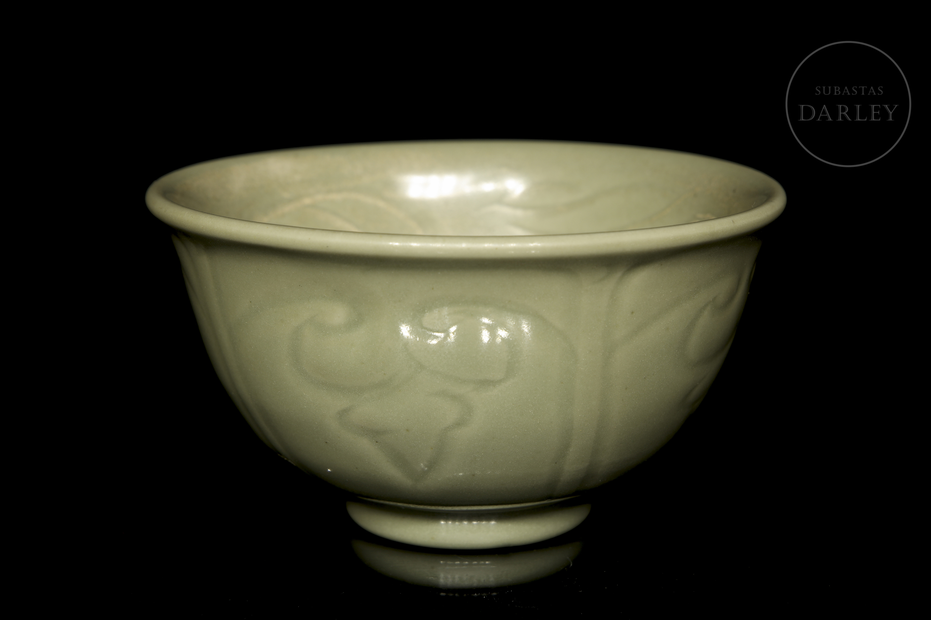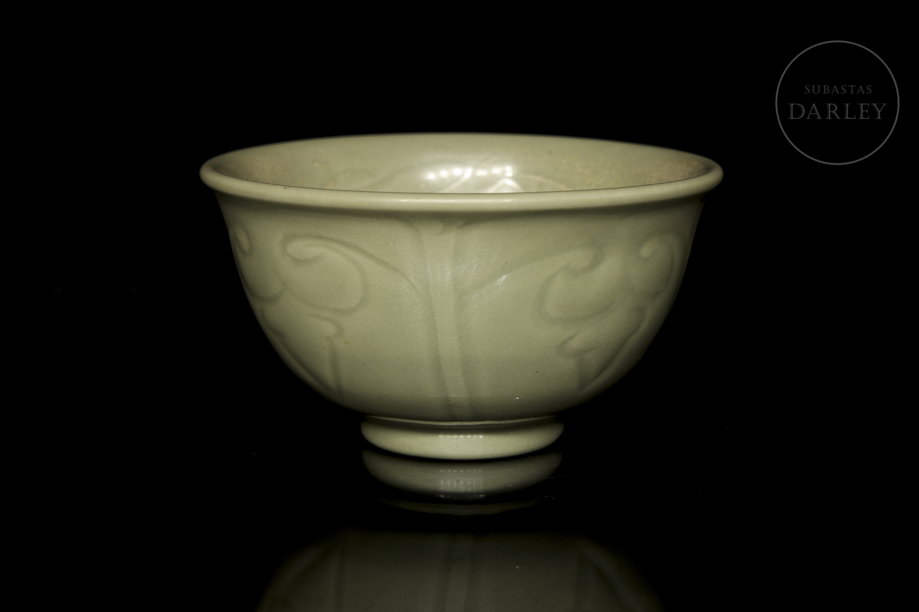 Ceramic modelled in the form of a bowl, with a narrow circular foot and a deep body that widens towards a turned-up mouth. Decorated with incised details of vegetal motifs and a thick olive-green glaze.