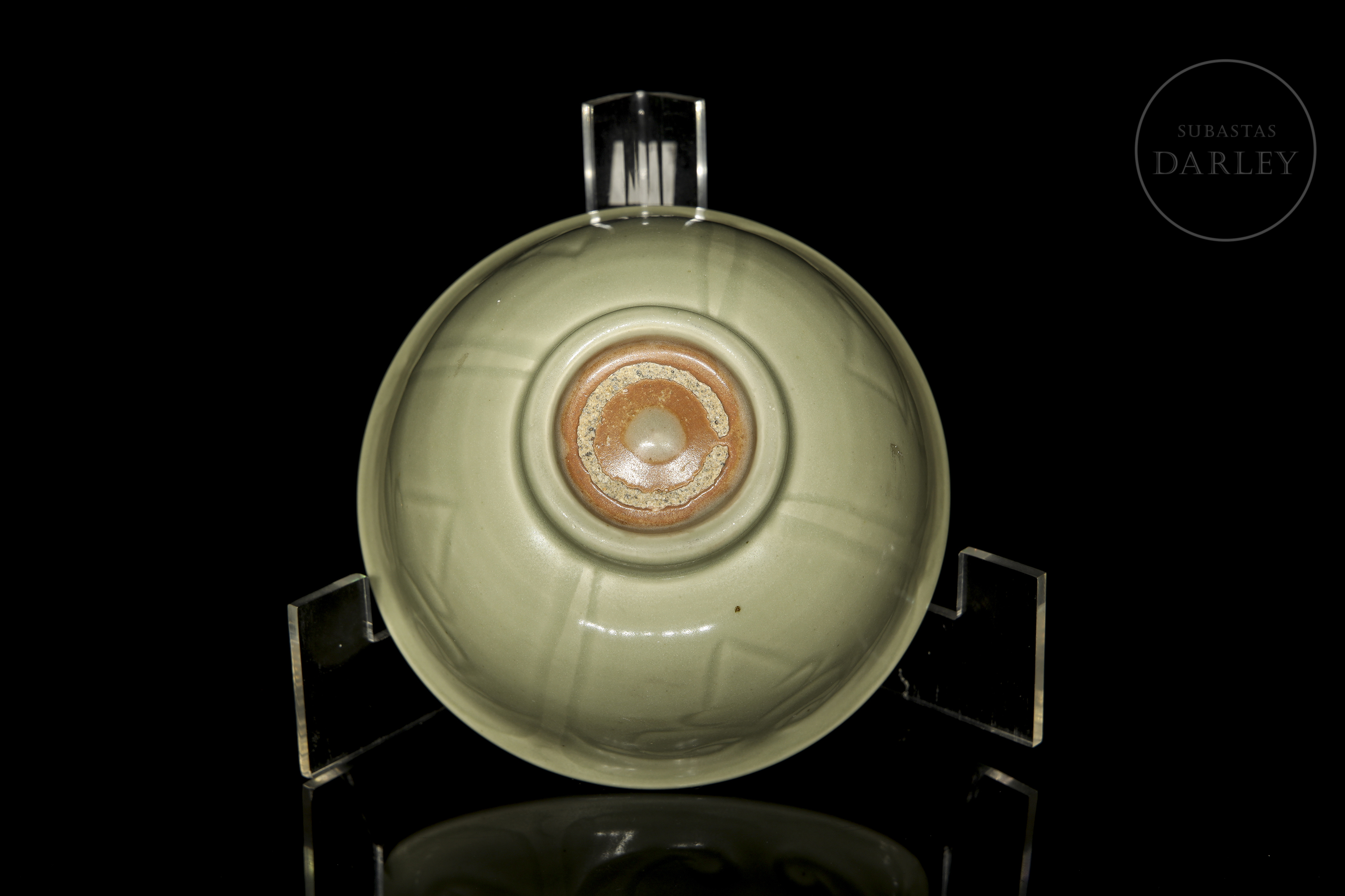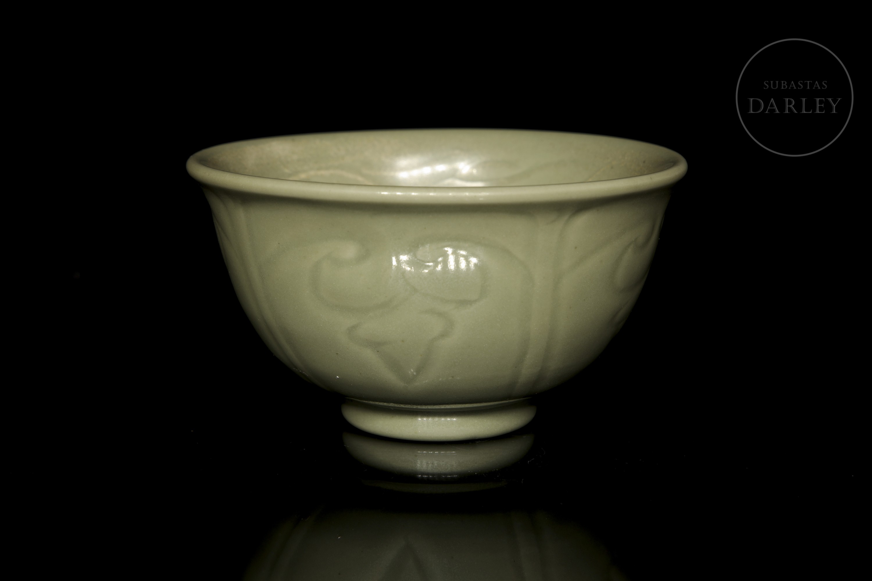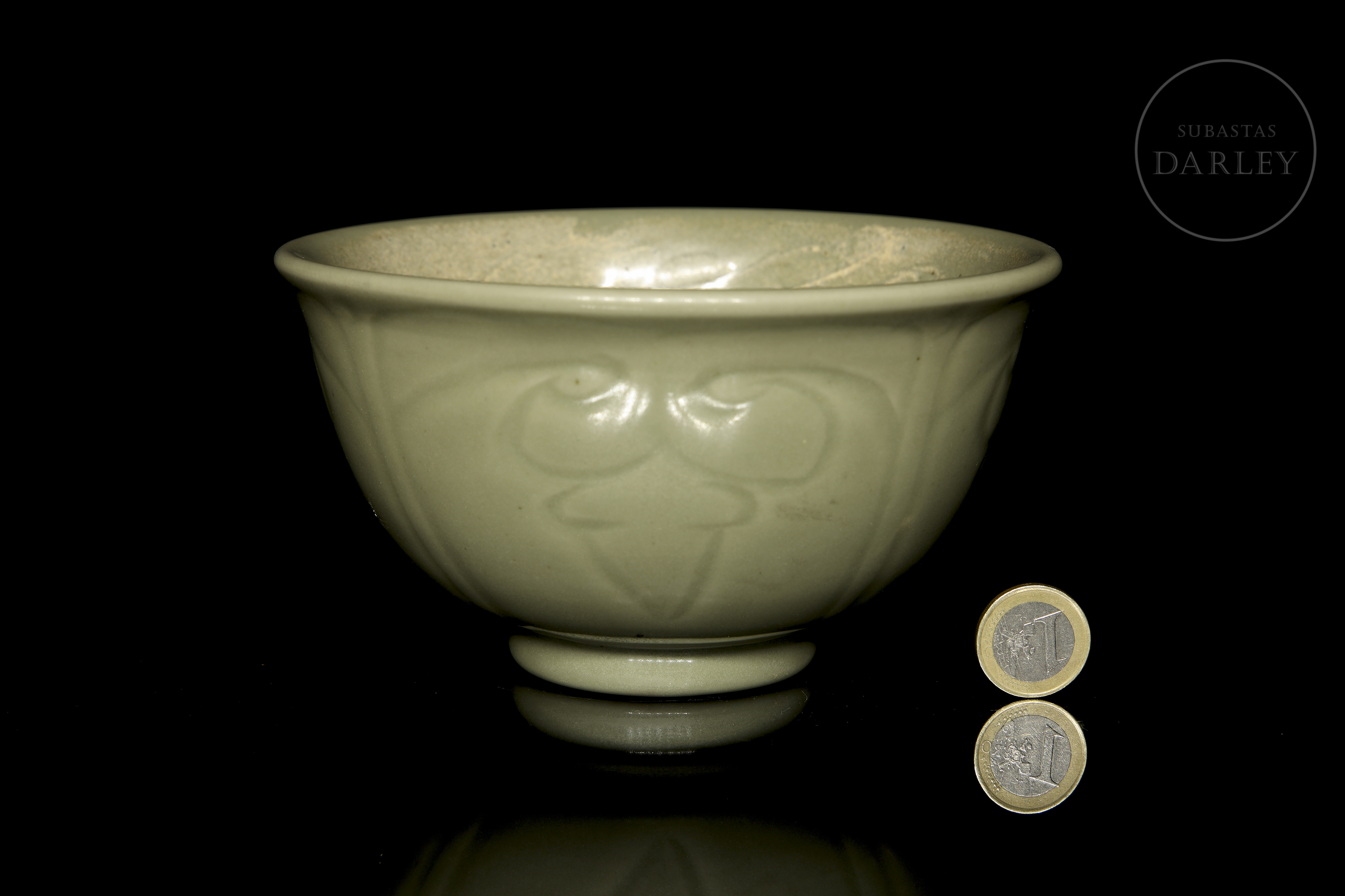 Ceramic modelled in the form of a bowl, with a narrow circular foot and a deep body that widens towards a turned-up mouth. Decorated with incised details of vegetal motifs and a thick olive-green glaze.