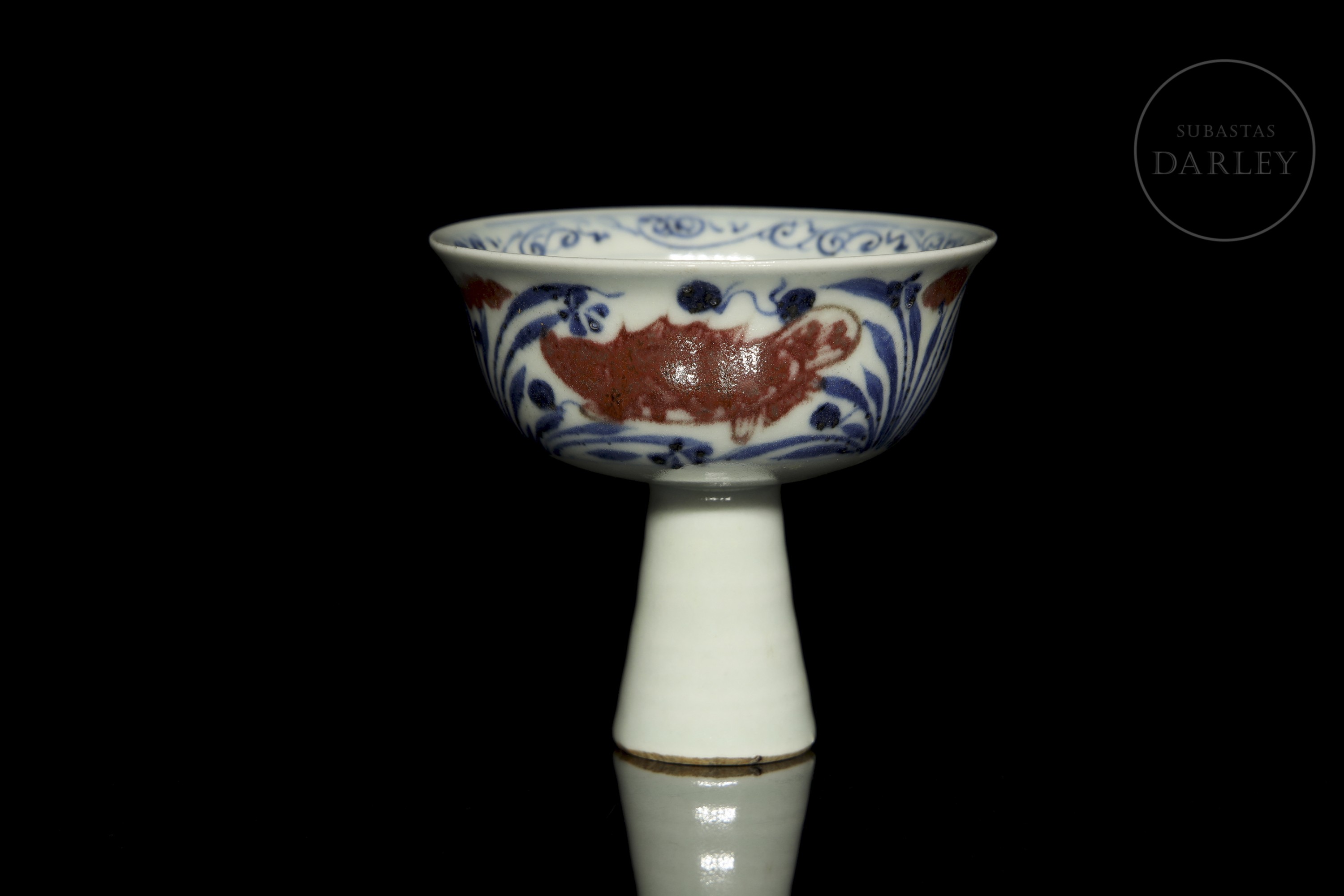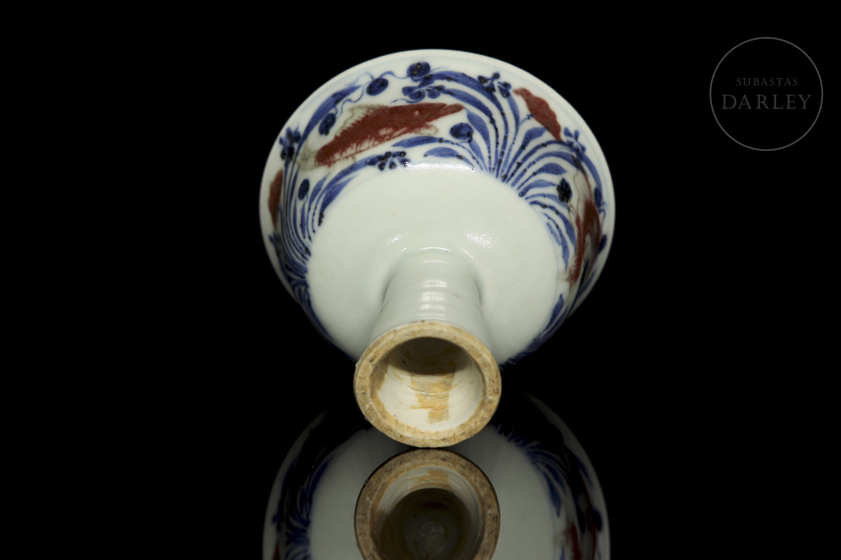Porcelain cup with an elongated conical foot and a deep body, with a curved profile that widens slightly towards the mouth. Decorated on the upper part with a continuous motif of fish swimming among seaweed and aquatic plants, executed in red iron and cobalt blue underglaze enamel.