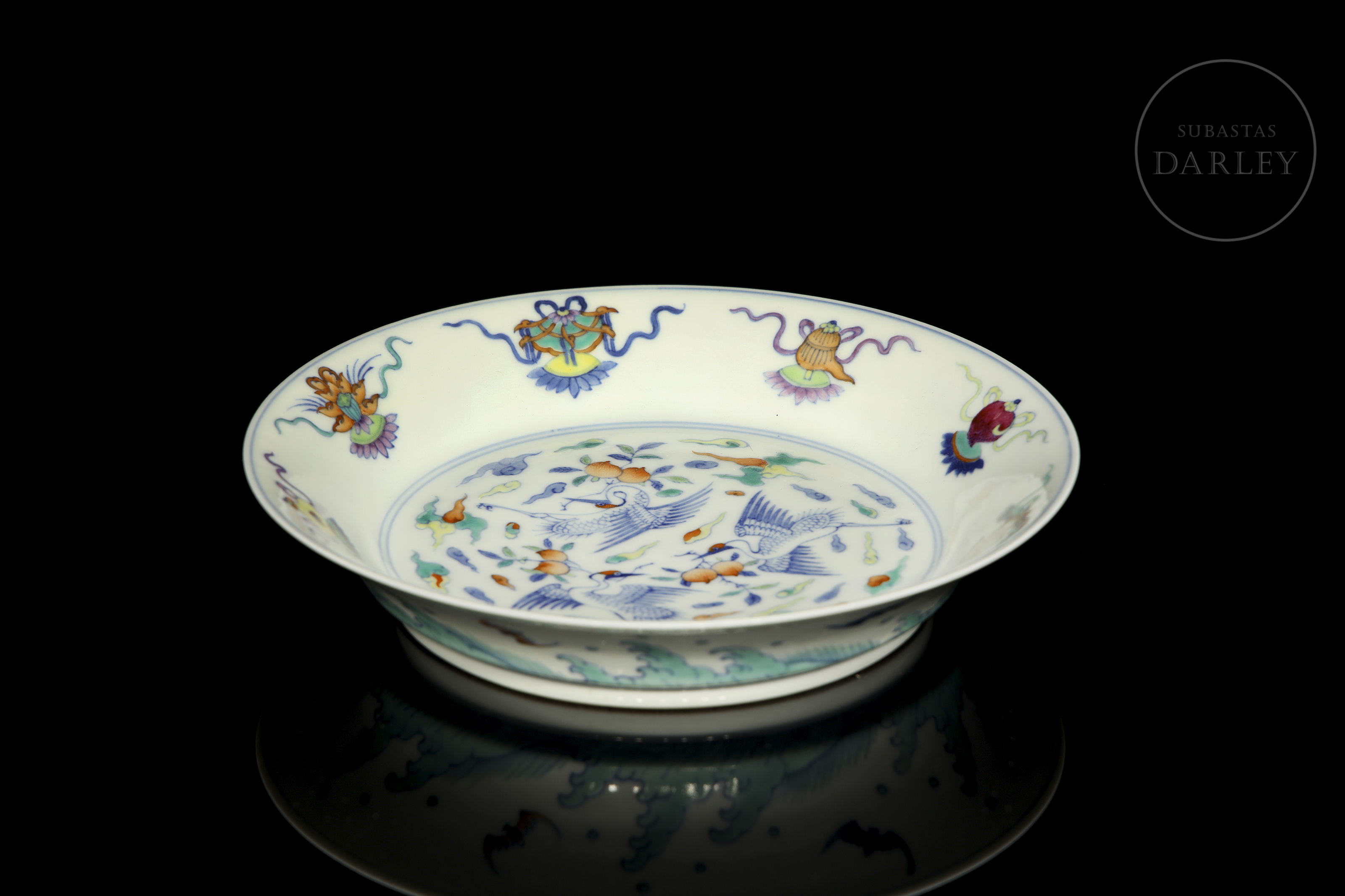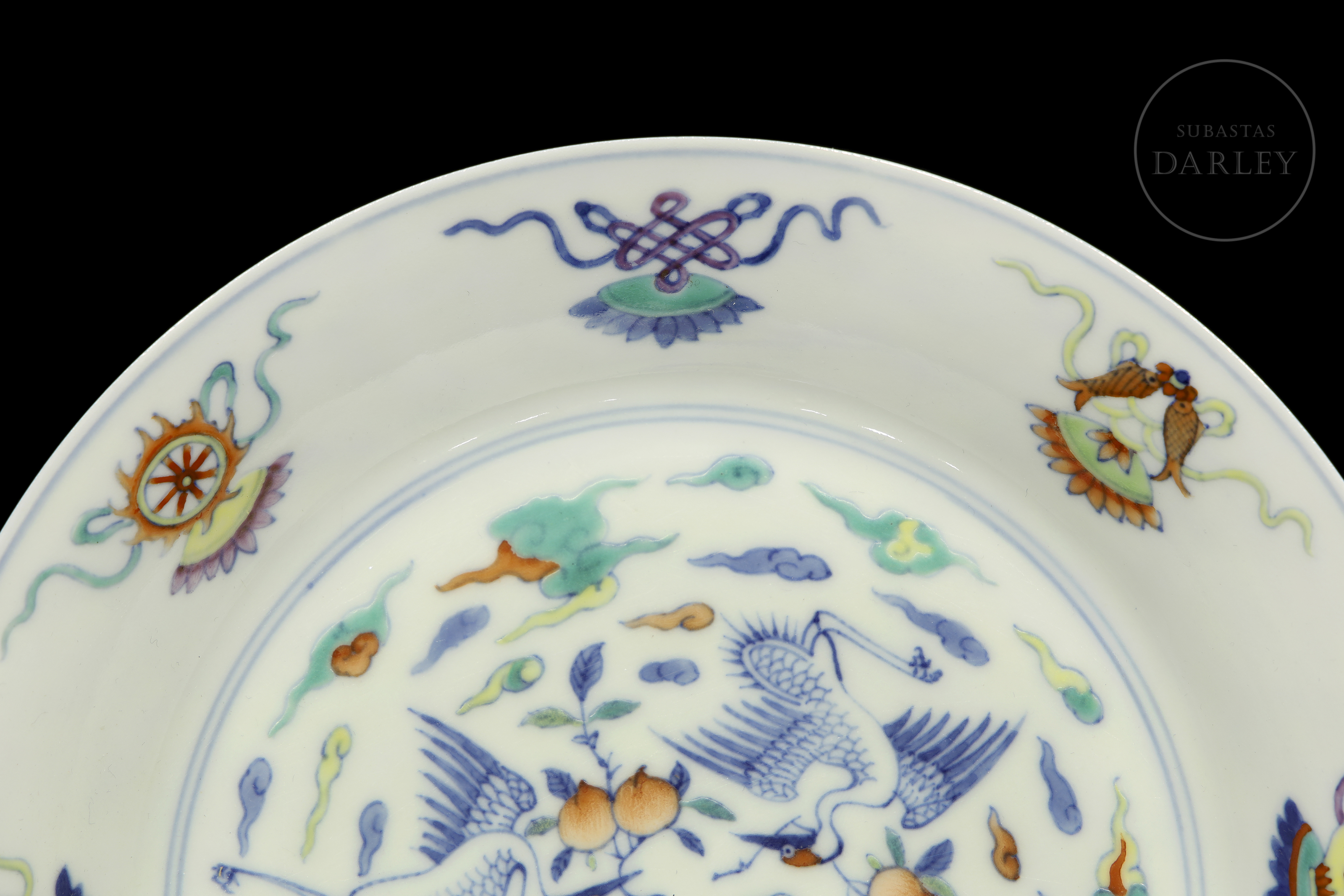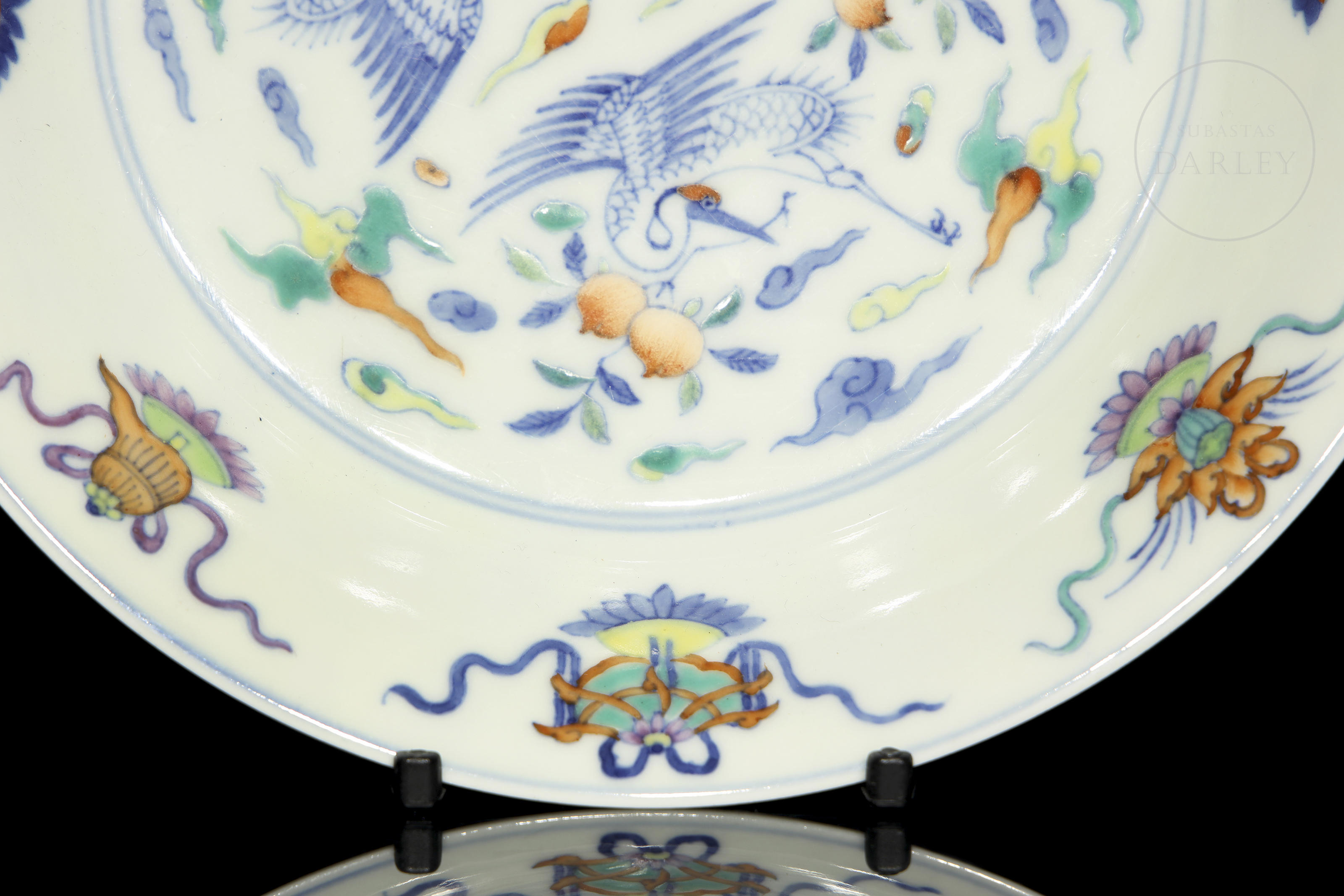 Porcelain decorated with polychrome enamels on glaze. The central scene depicts a group of cranes among auspicious clouds and peach tree branches. The rim is decorated with the Eight Buddhist Symbols arranged in a radial pattern. The reverse shows a border of stylised waves with bats in flight, and in the centre, a six-character seal ‘大清雍正年制’ in blue underglaze.
