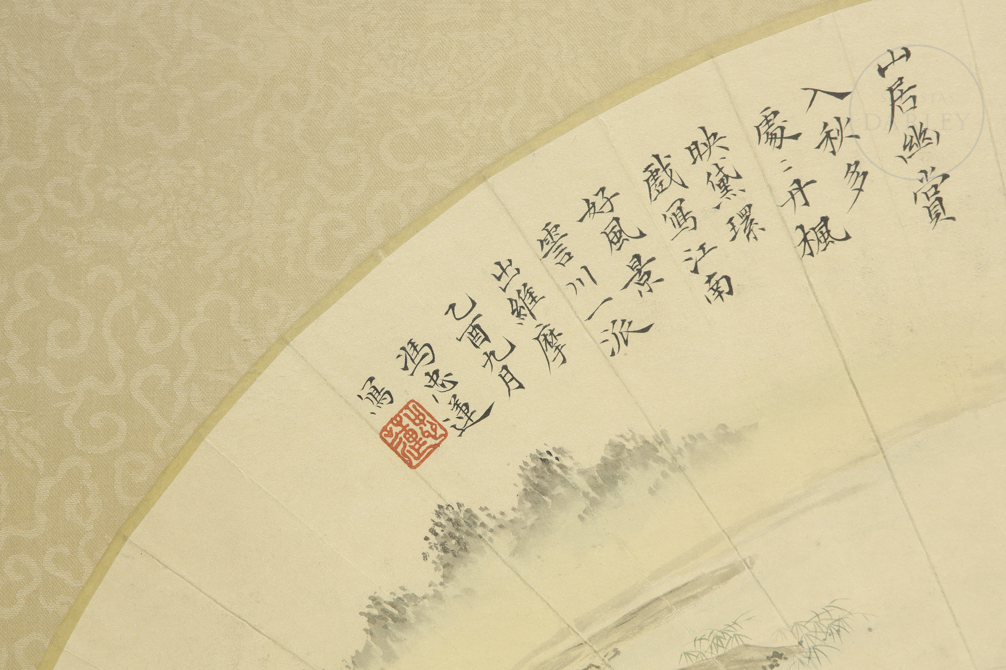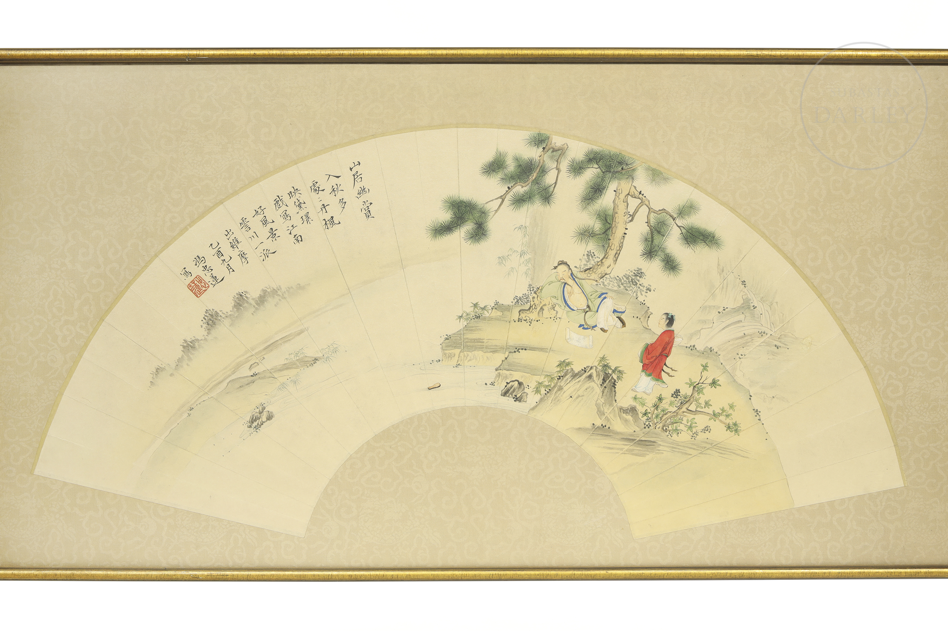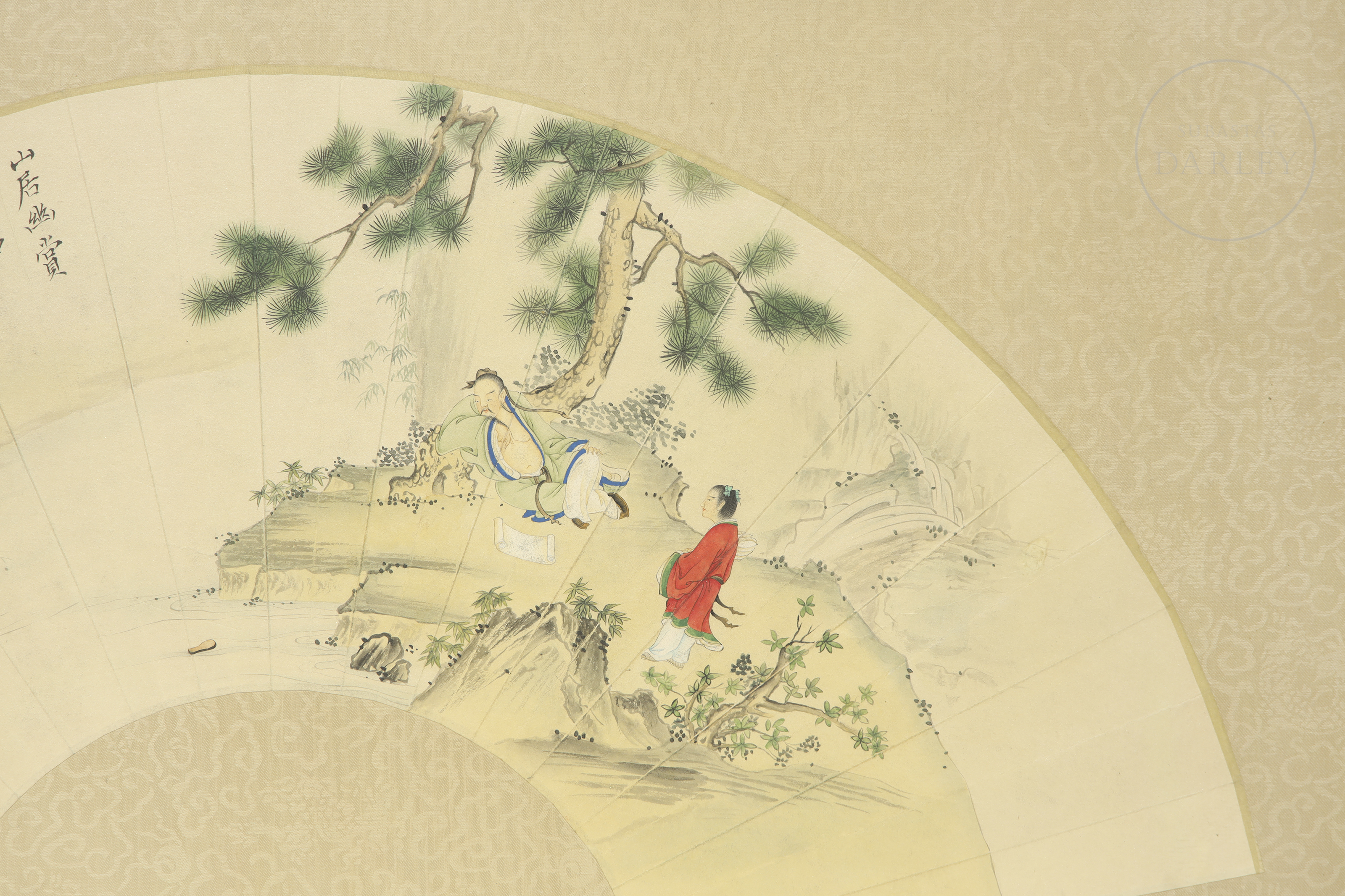 Fan-paper leaf, painted with ink and pigments and set in a frame with a silk background. It shows a beautiful landscape with a calm lake, on the shore of which two figures are arranged under the shade of a tree. In the upper left area, a poem is shown next to a seal in red.