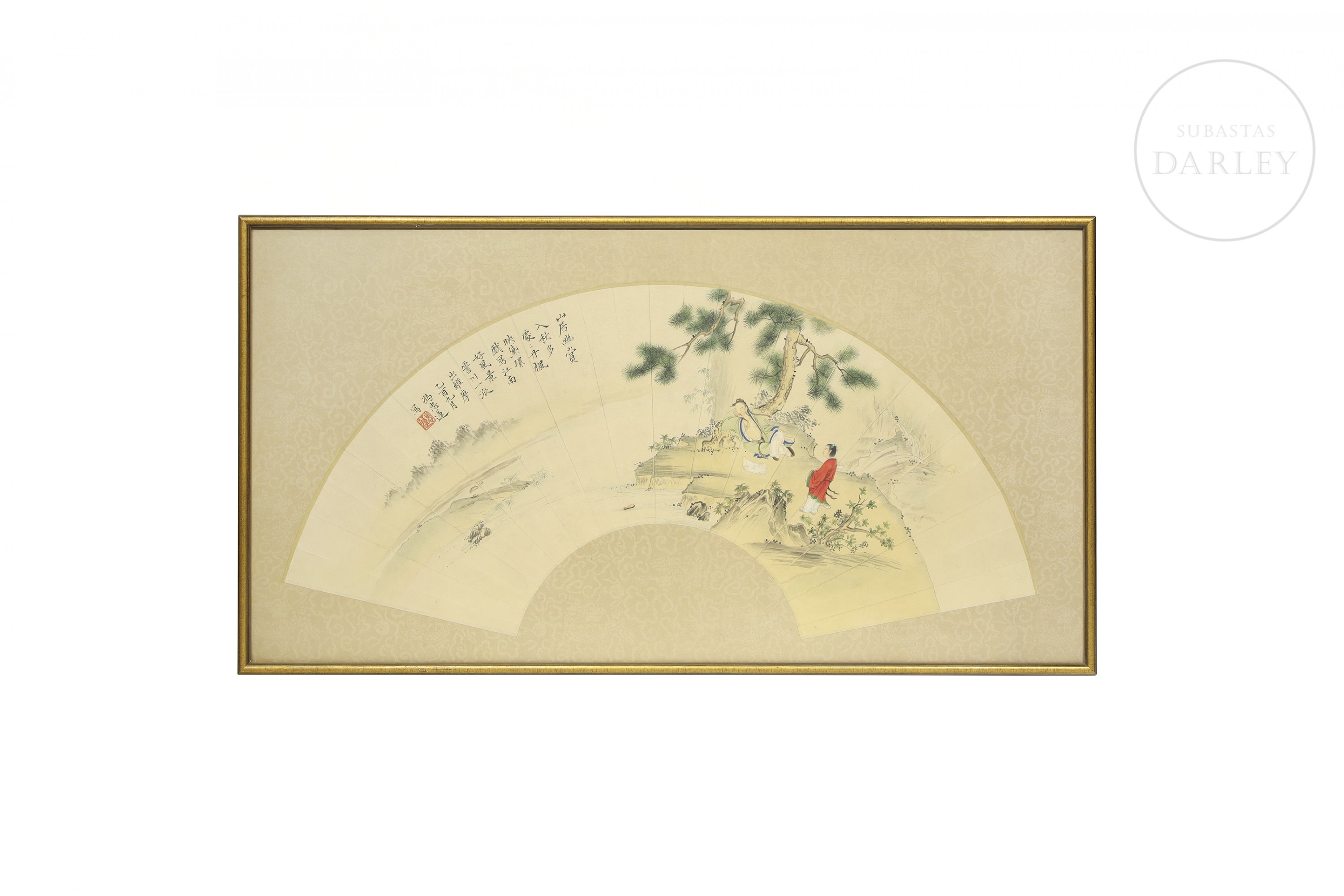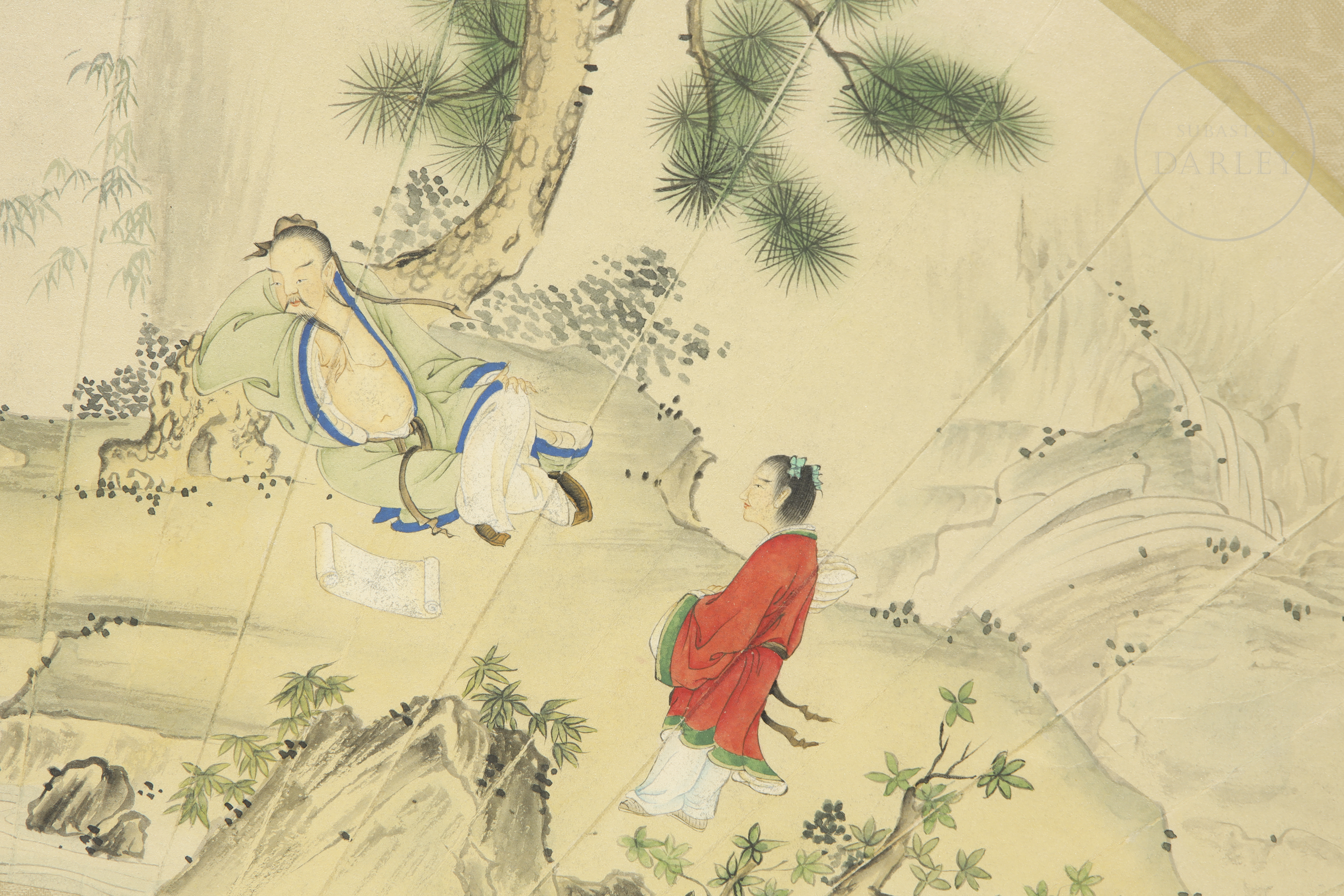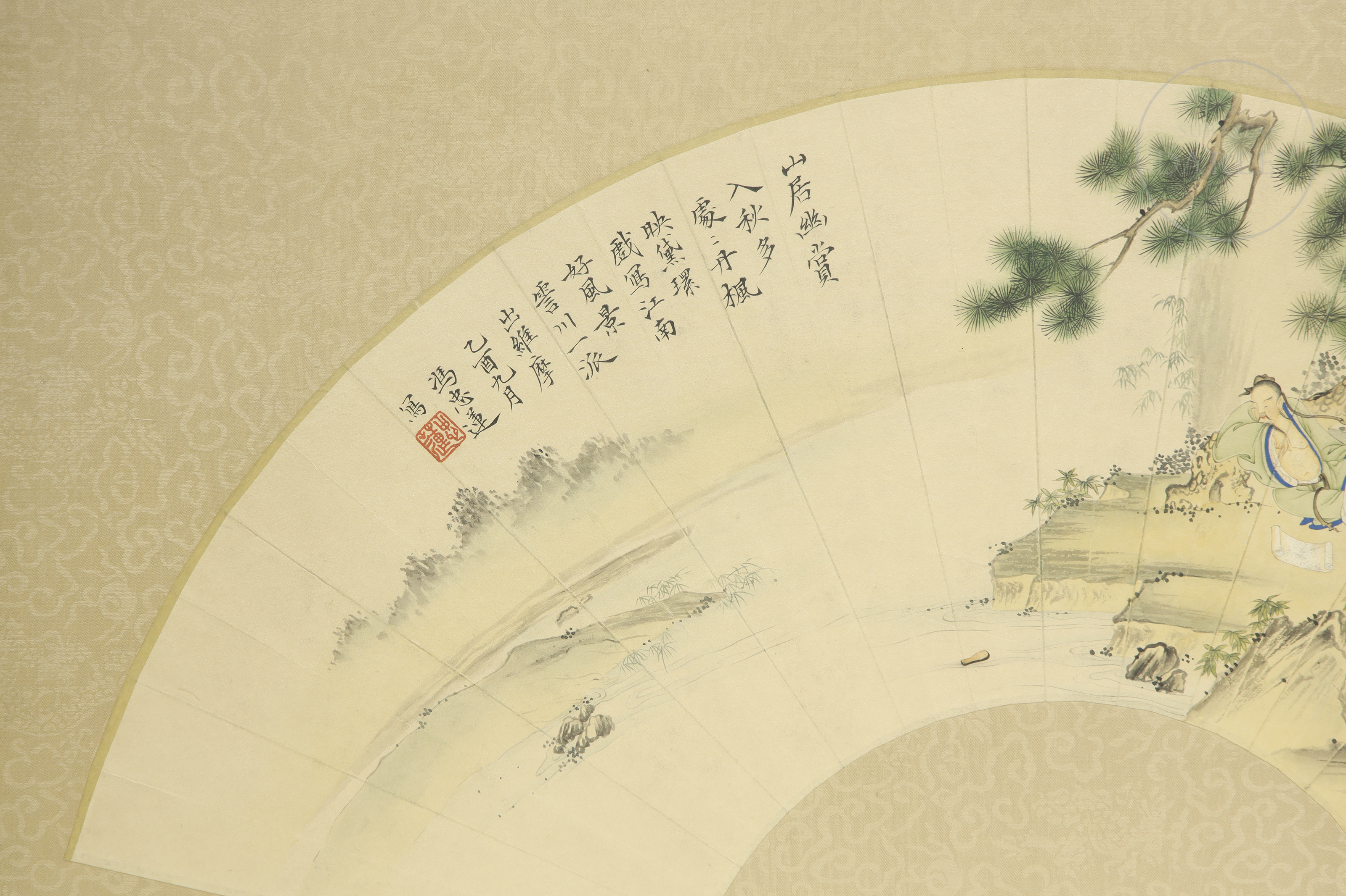 Fan-paper leaf, painted with ink and pigments and set in a frame with a silk background. It shows a beautiful landscape with a calm lake, on the shore of which two figures are arranged under the shade of a tree. In the upper left area, a poem is shown next to a seal in red.