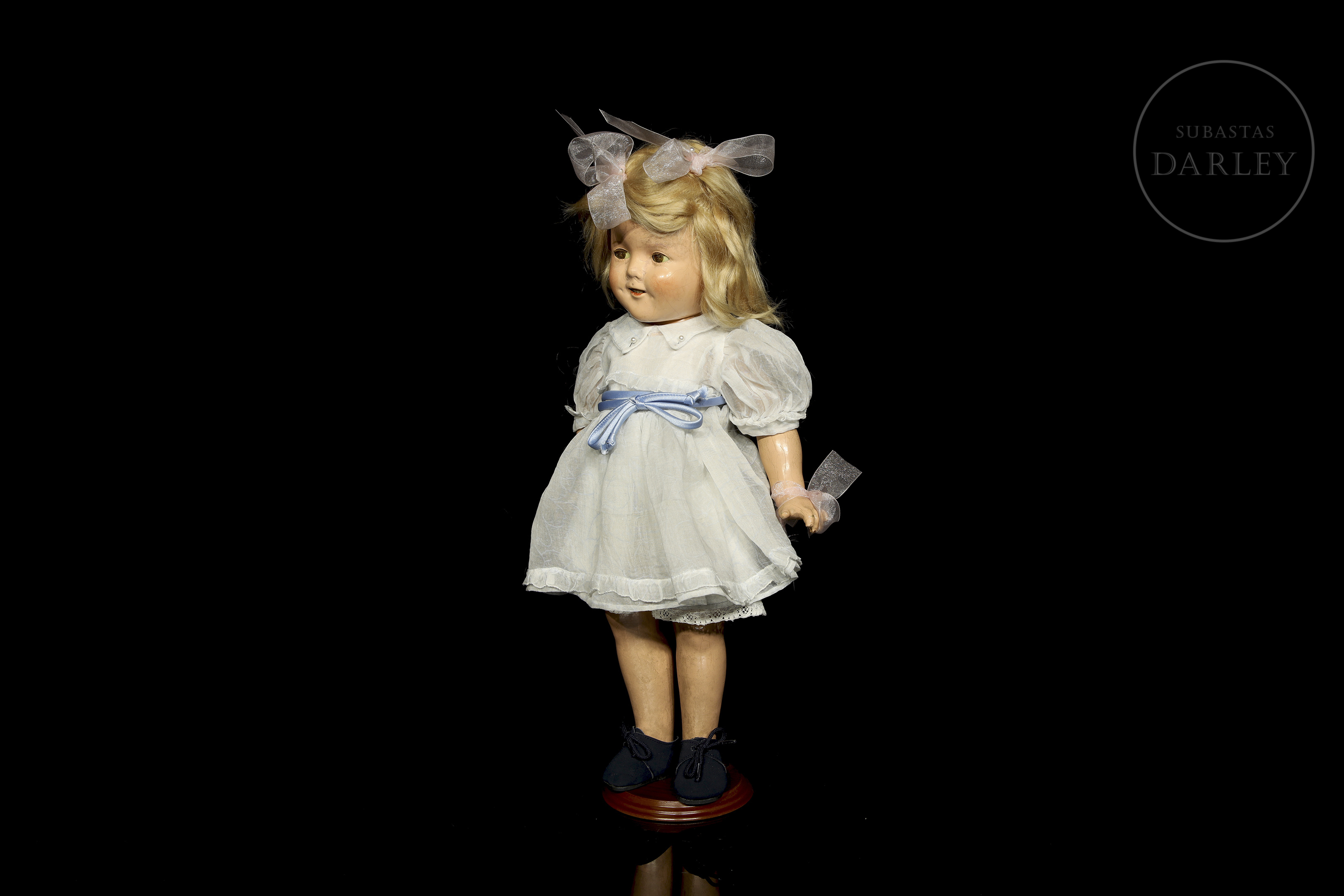 Made of articulated composition paste. Her face captures her iconic dimples and open mouth showing her teeth. She retains her original blonde mohair wig. With original chiffon dress and hair bows at the back. With manufacturing marks on the back of the neck and back.