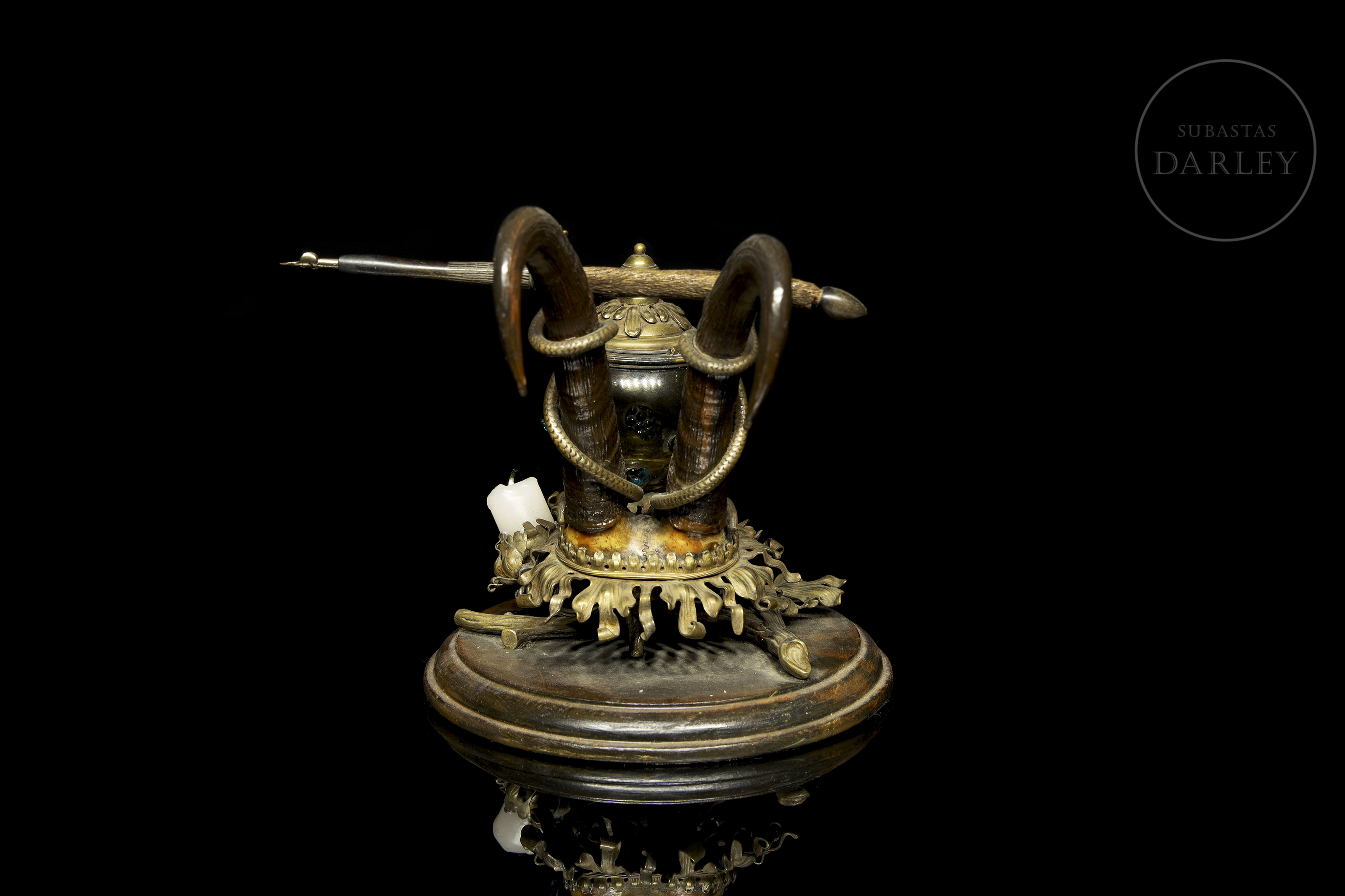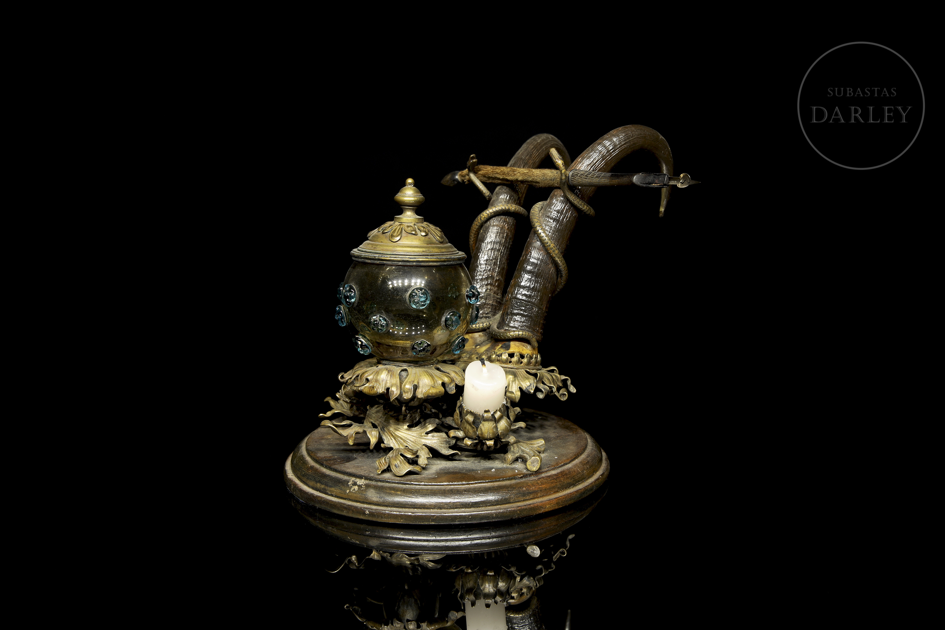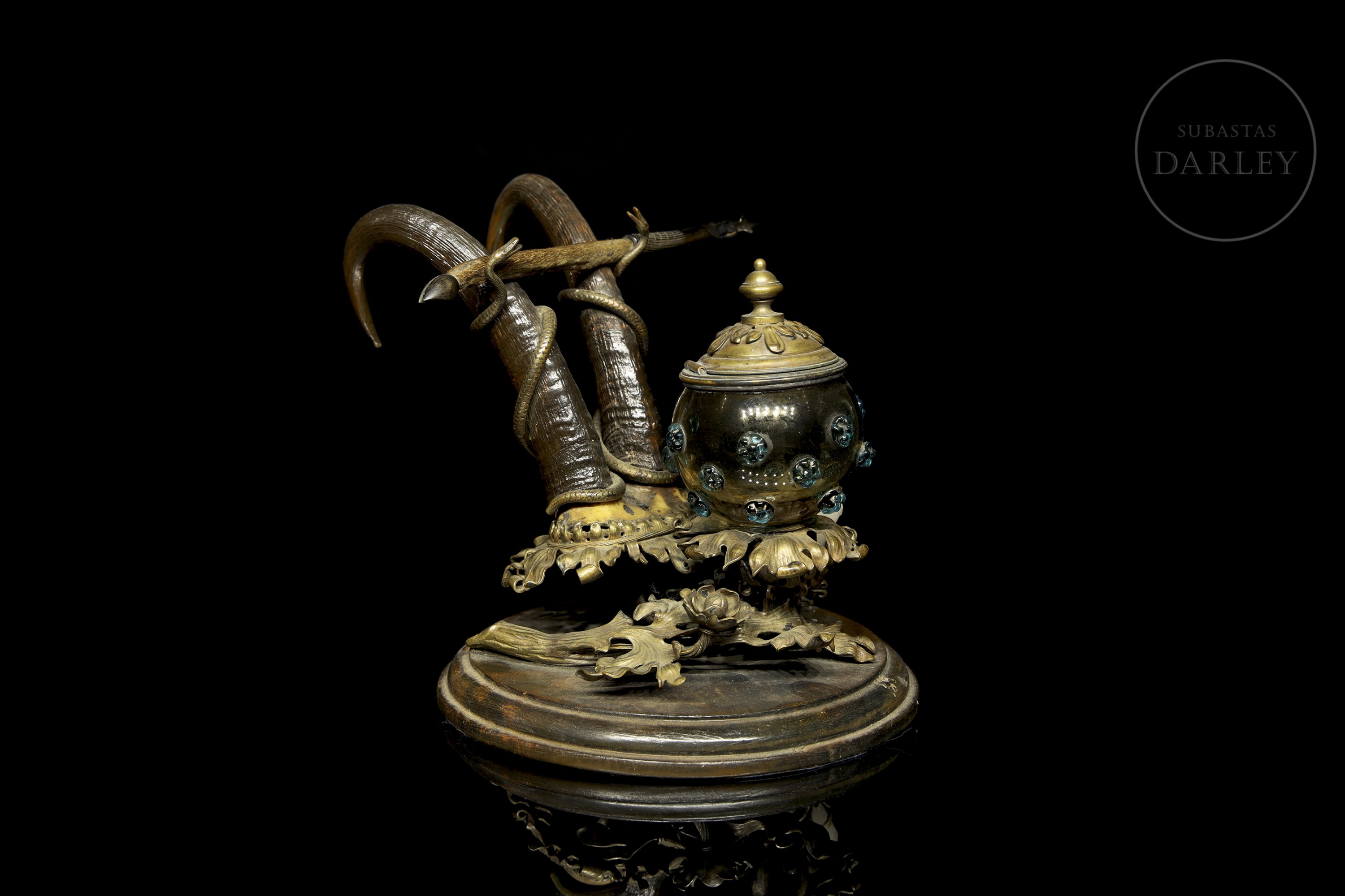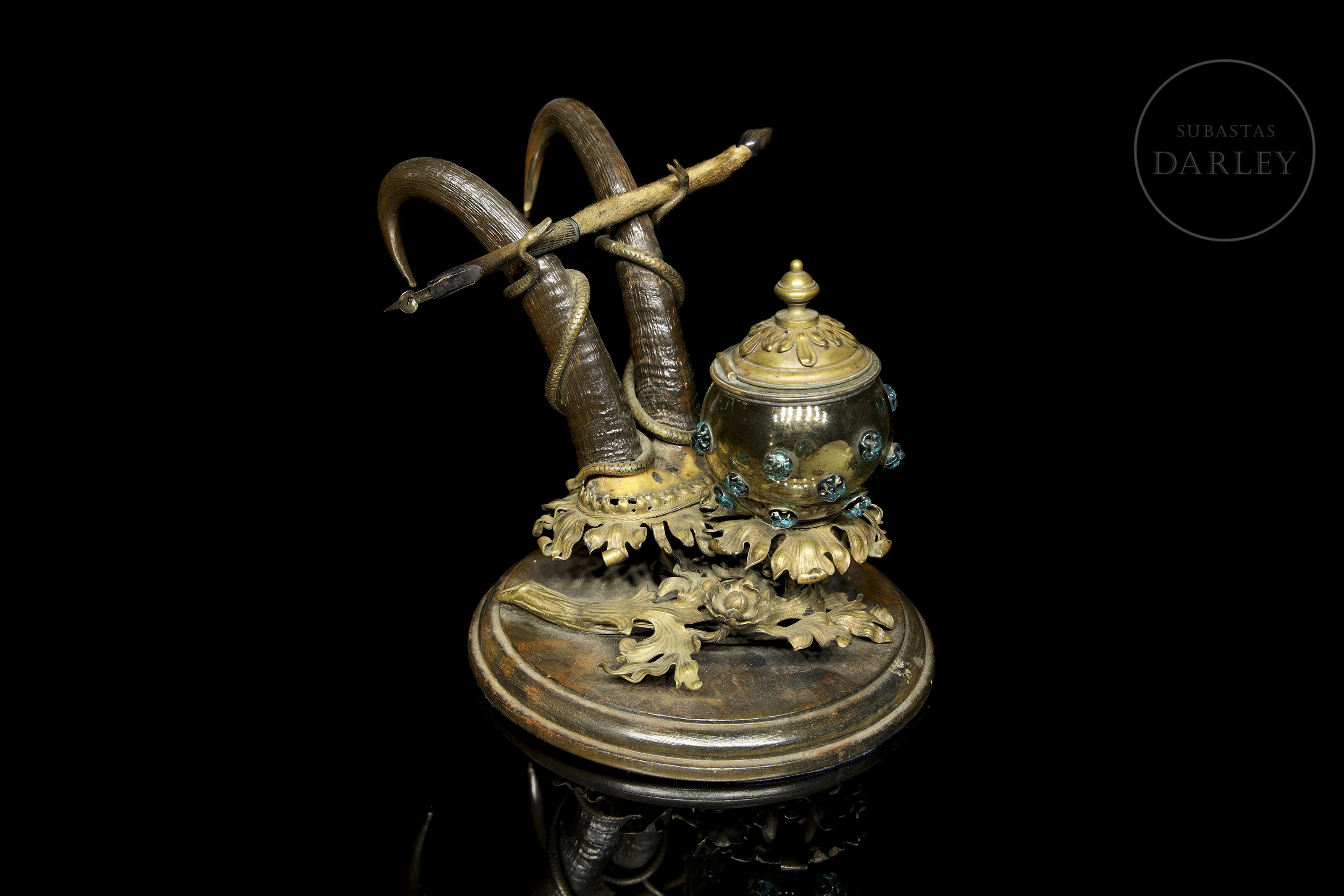 Inkwell of gilt metal, glass, wood, goat antlers and blown glass. The nib is not original. With a receptacle for a small candle. Plant and animal decoration, with flowers, animals and plants in relief on which the horns and a small circular glass bottle rest. The bottle is also decorated with flowers in blue glass. No hallmarks or manufacturer's marks. In good condition.