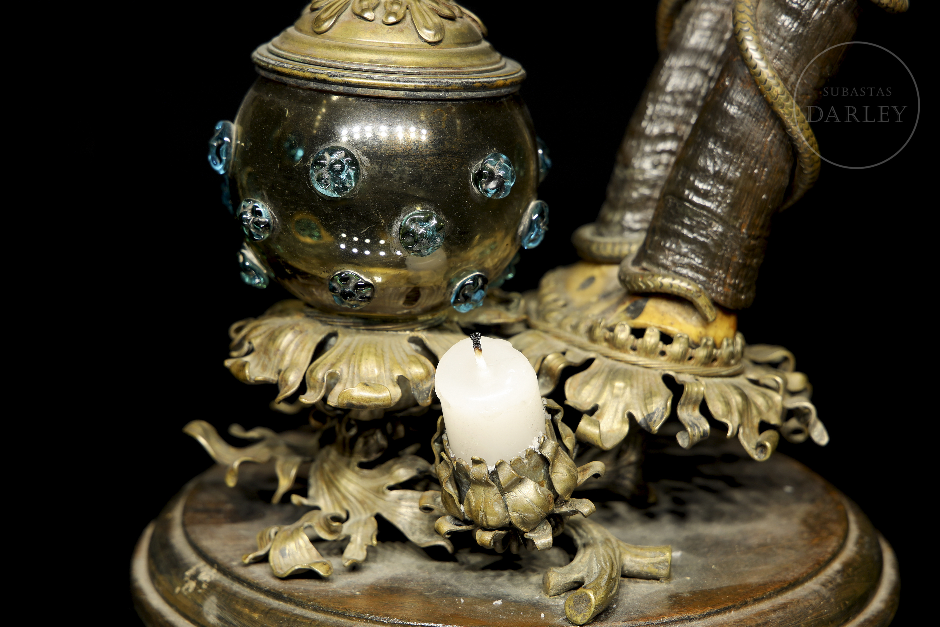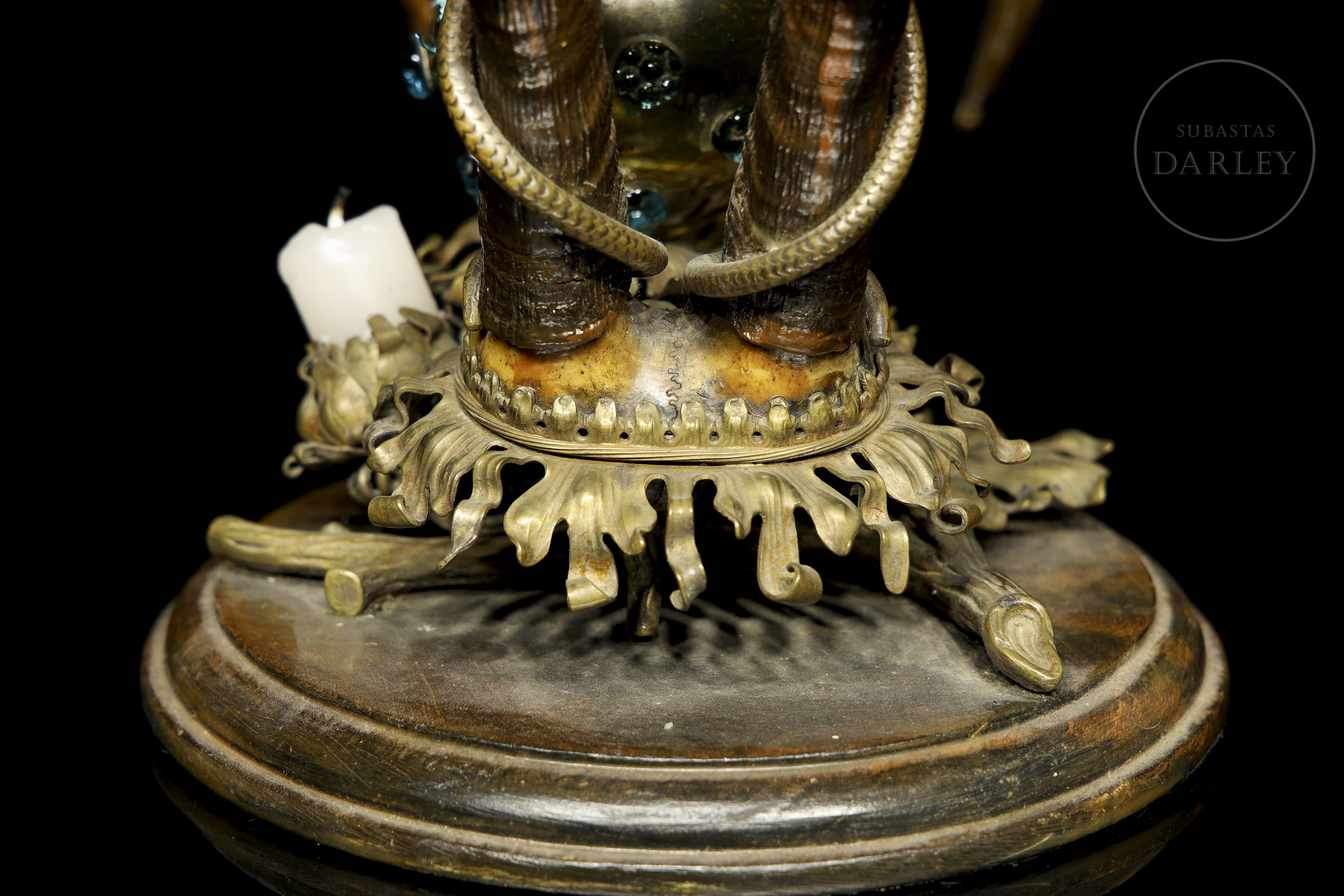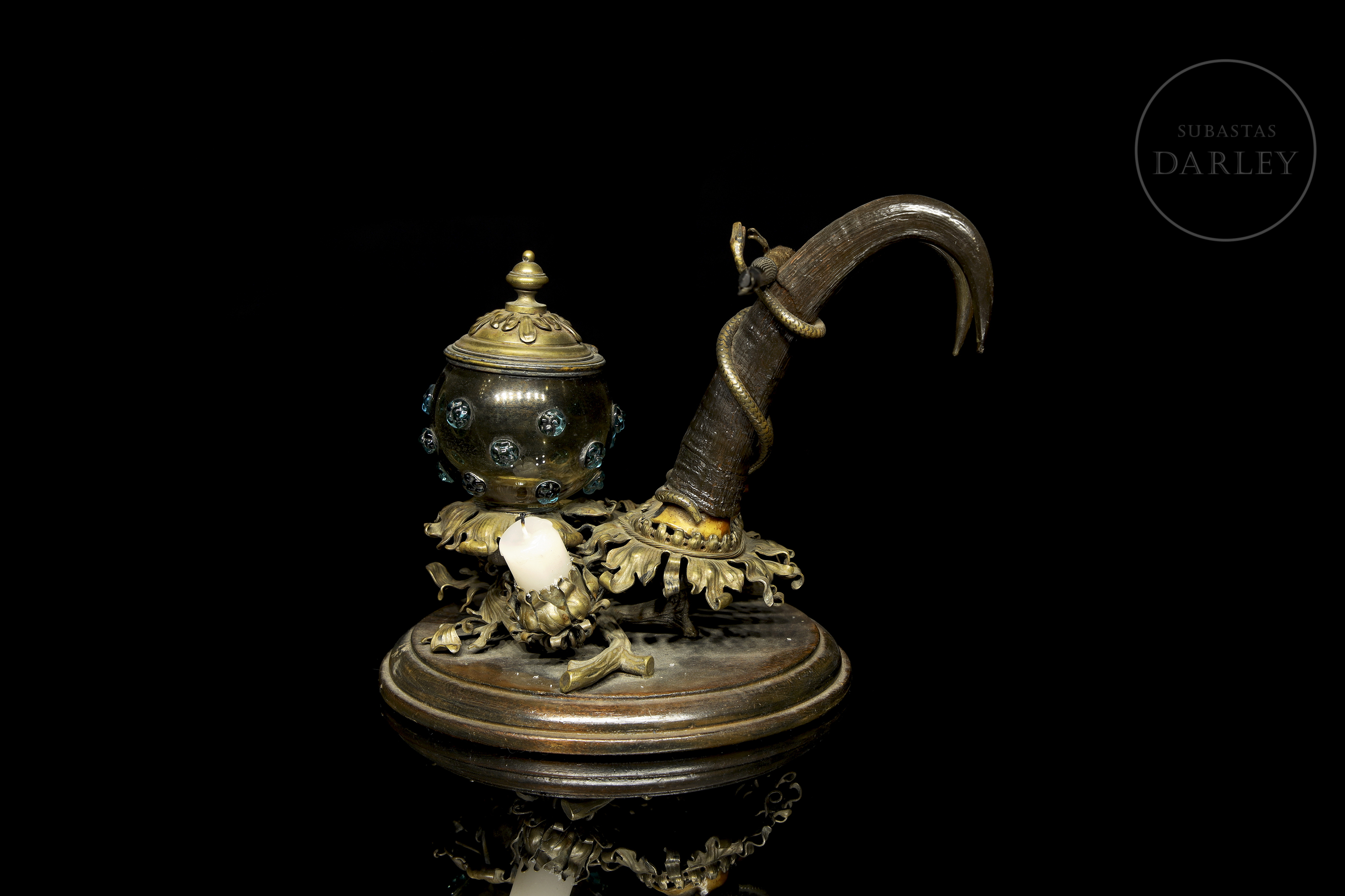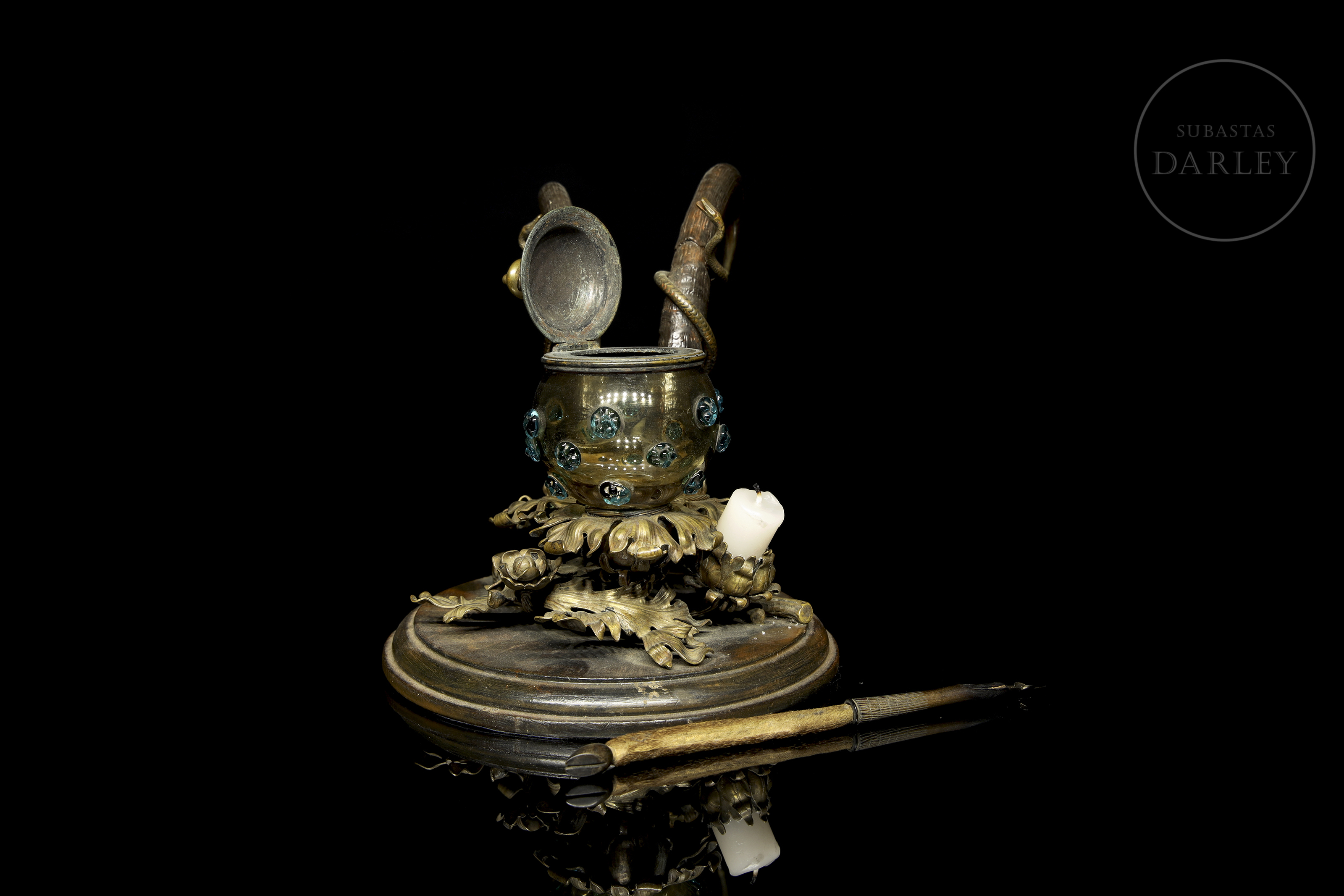 Inkwell of gilt metal, glass, wood, goat antlers and blown glass. The nib is not original. With a receptacle for a small candle. Plant and animal decoration, with flowers, animals and plants in relief on which the horns and a small circular glass bottle rest. The bottle is also decorated with flowers in blue glass. No hallmarks or manufacturer's marks. In good condition.