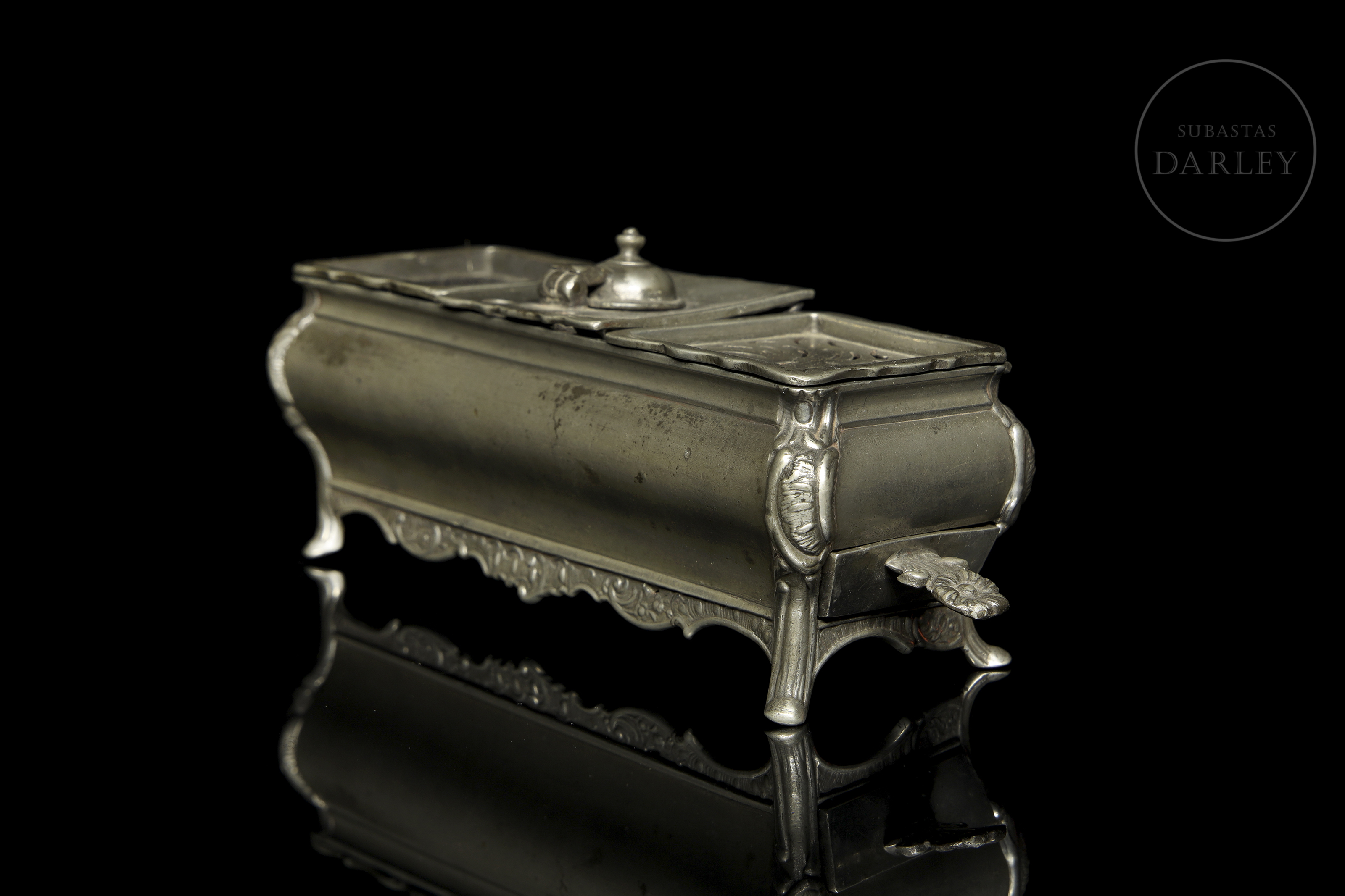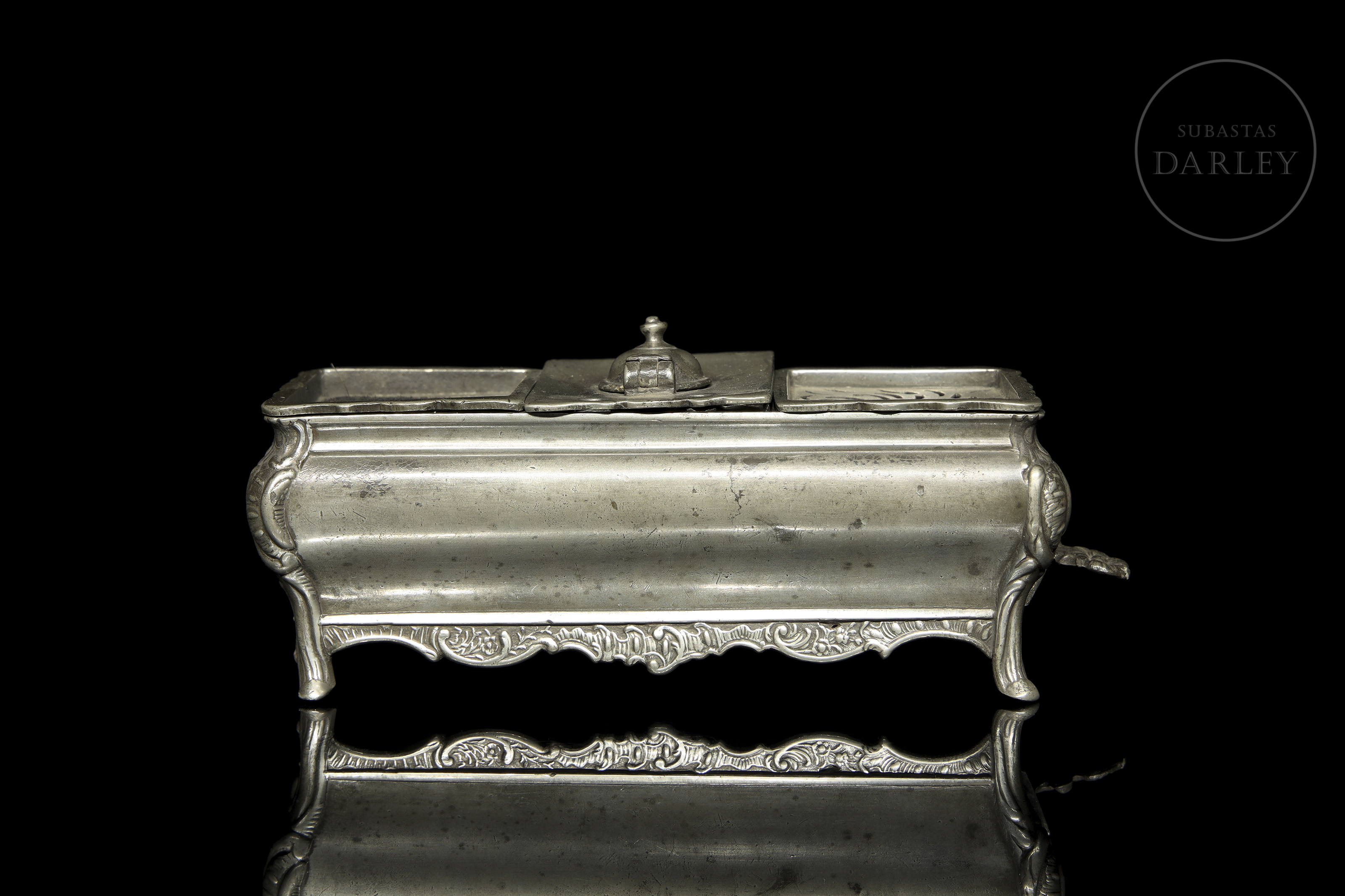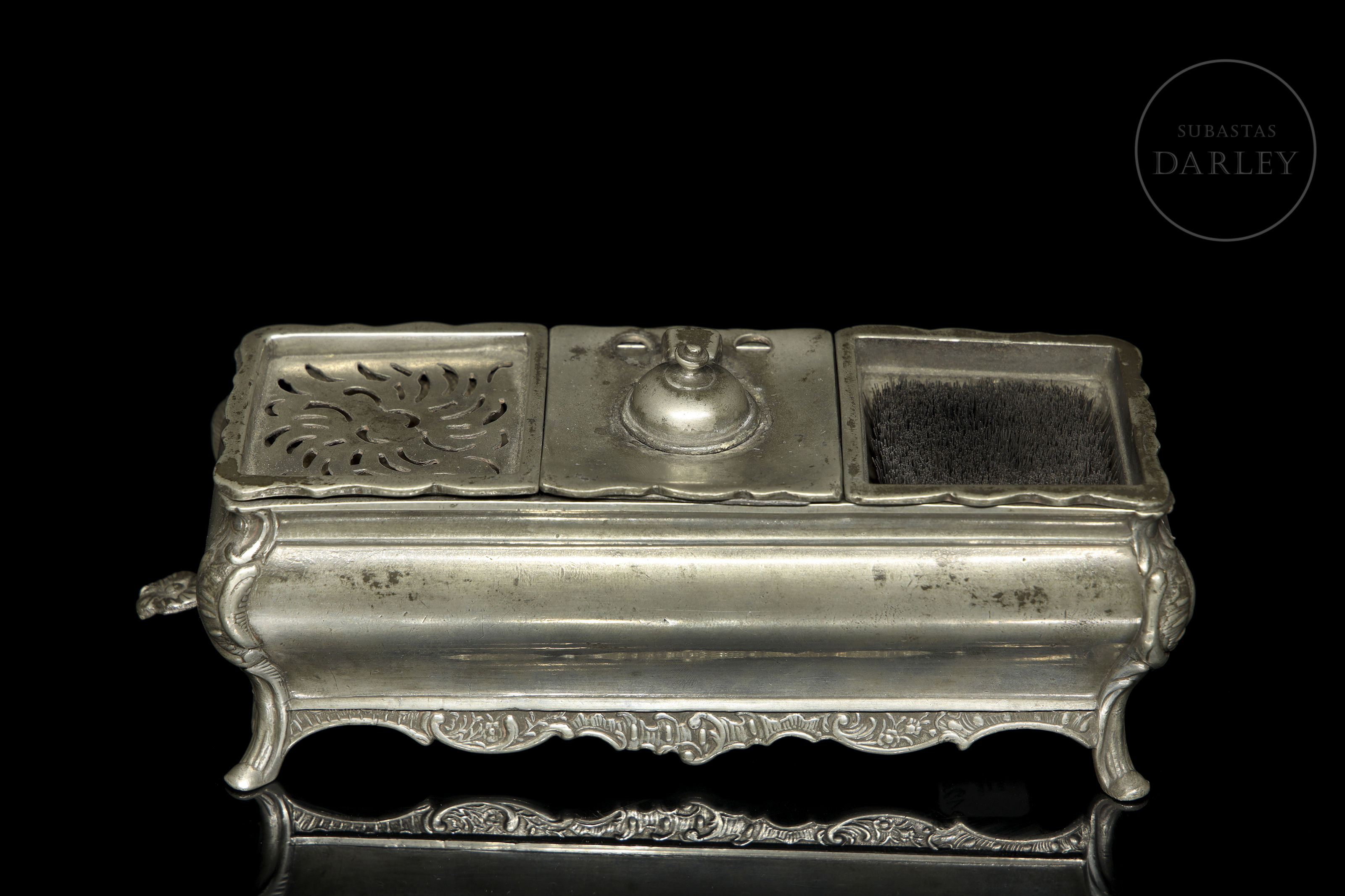 Louis XIV style inkwell with pen-cleaner and saver. With three compartments (inkwell, brush and sprinkler) and side drawer. Crowned X control mark. With quality stamp and J.Hoofmans hallmark on the base. Master received at the end of the 18th century.