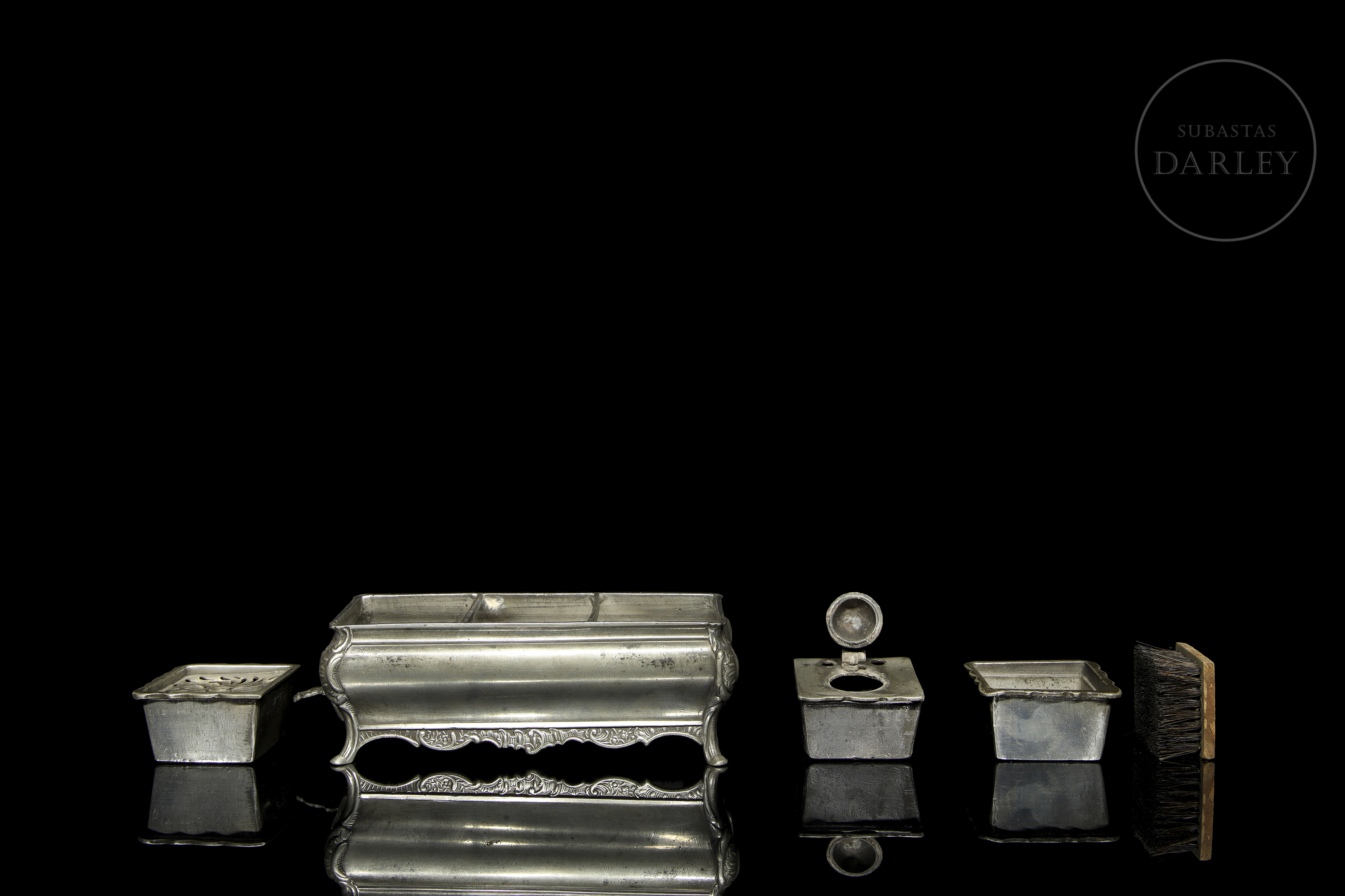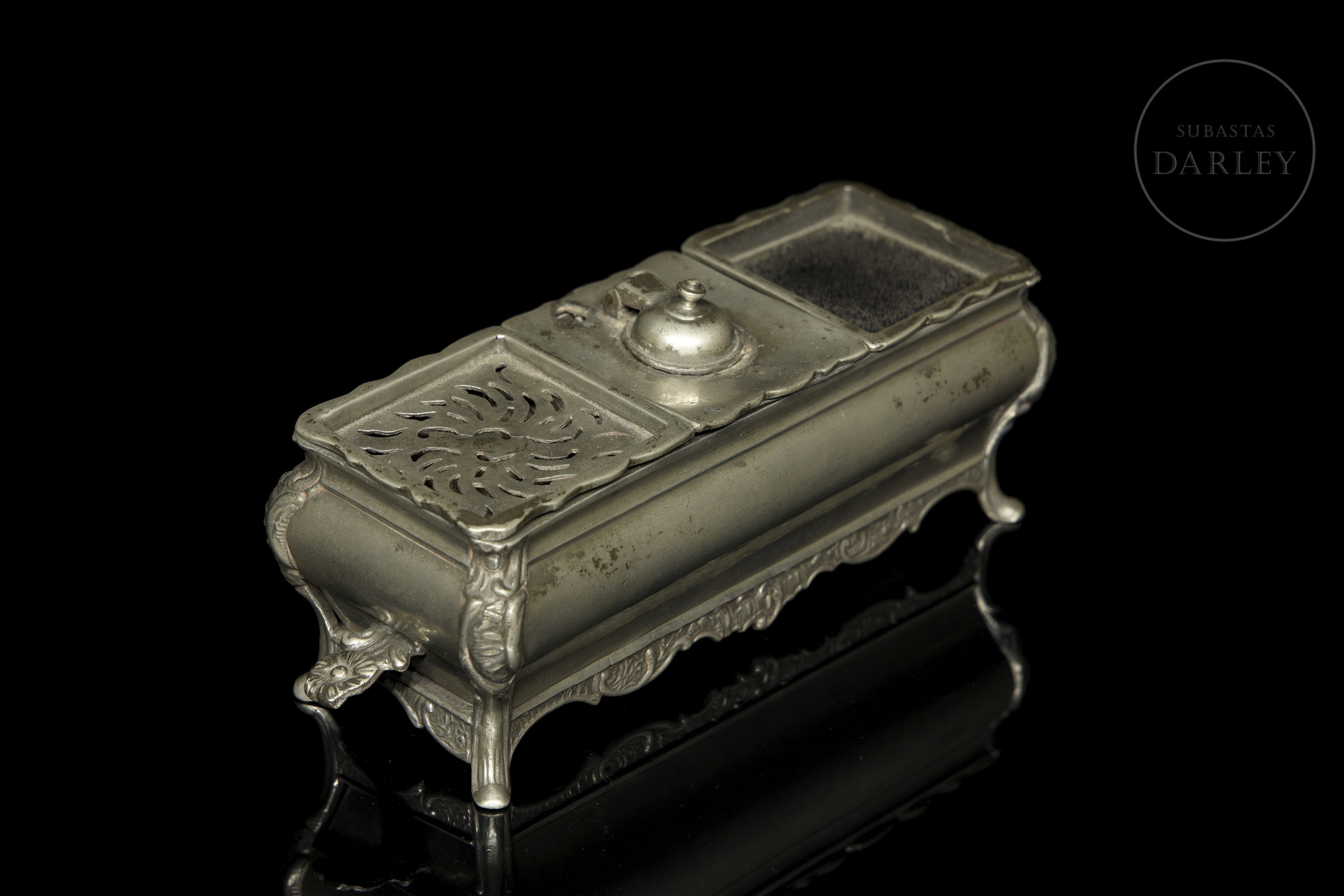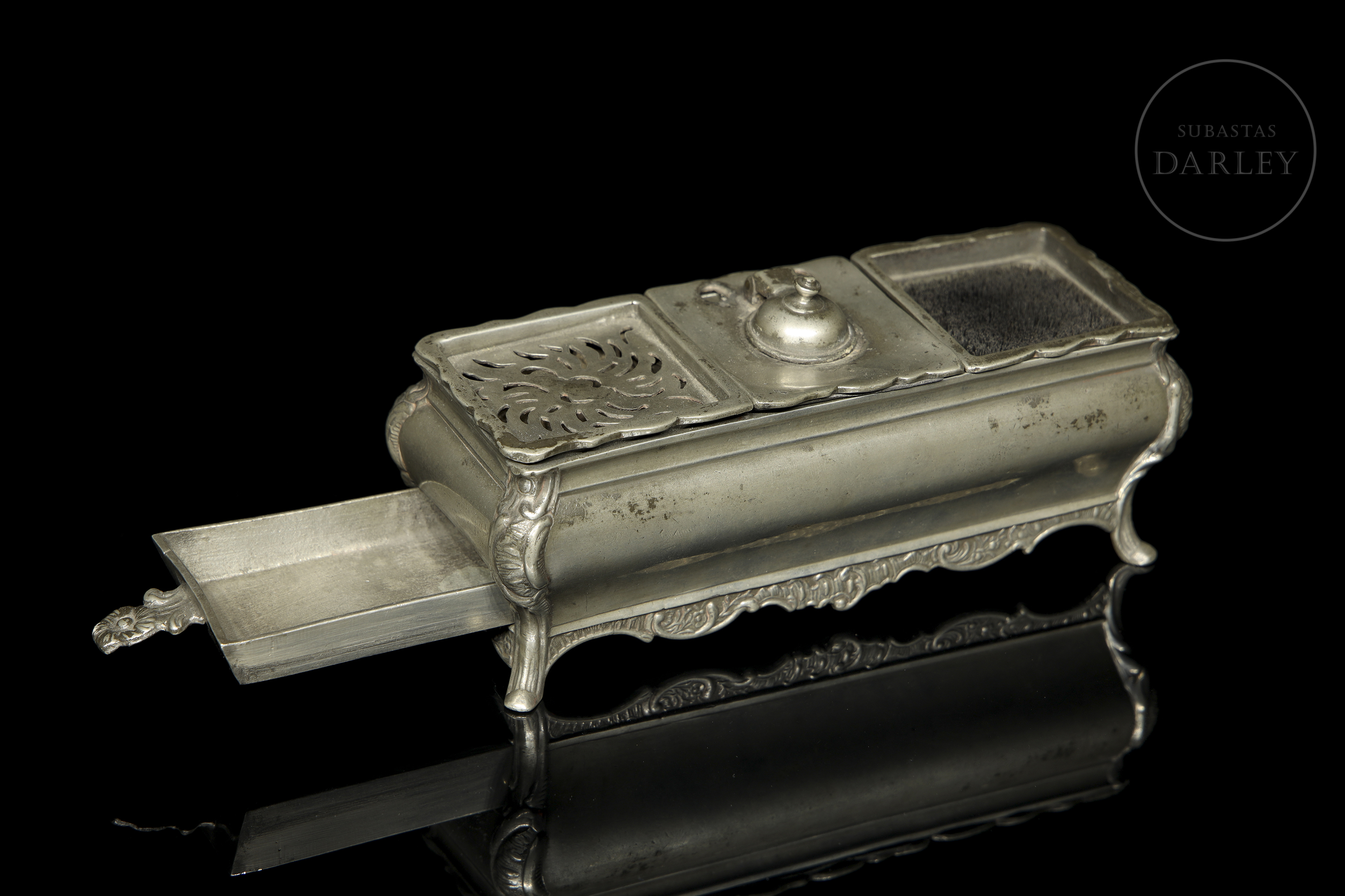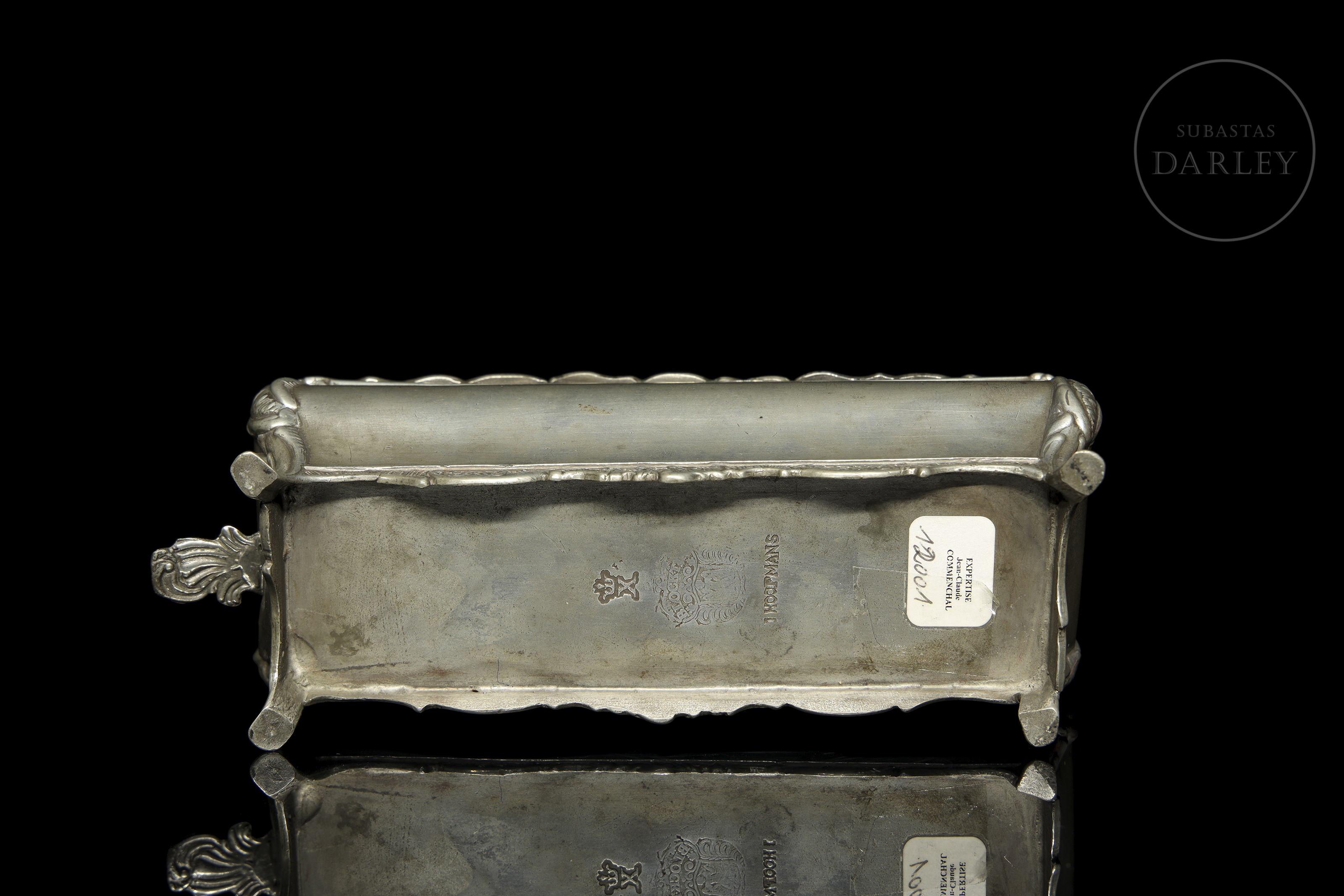 Louis XIV style inkwell with pen-cleaner and saver. With three compartments (inkwell, brush and sprinkler) and side drawer. Crowned X control mark. With quality stamp and J.Hoofmans hallmark on the base. Master received at the end of the 18th century.