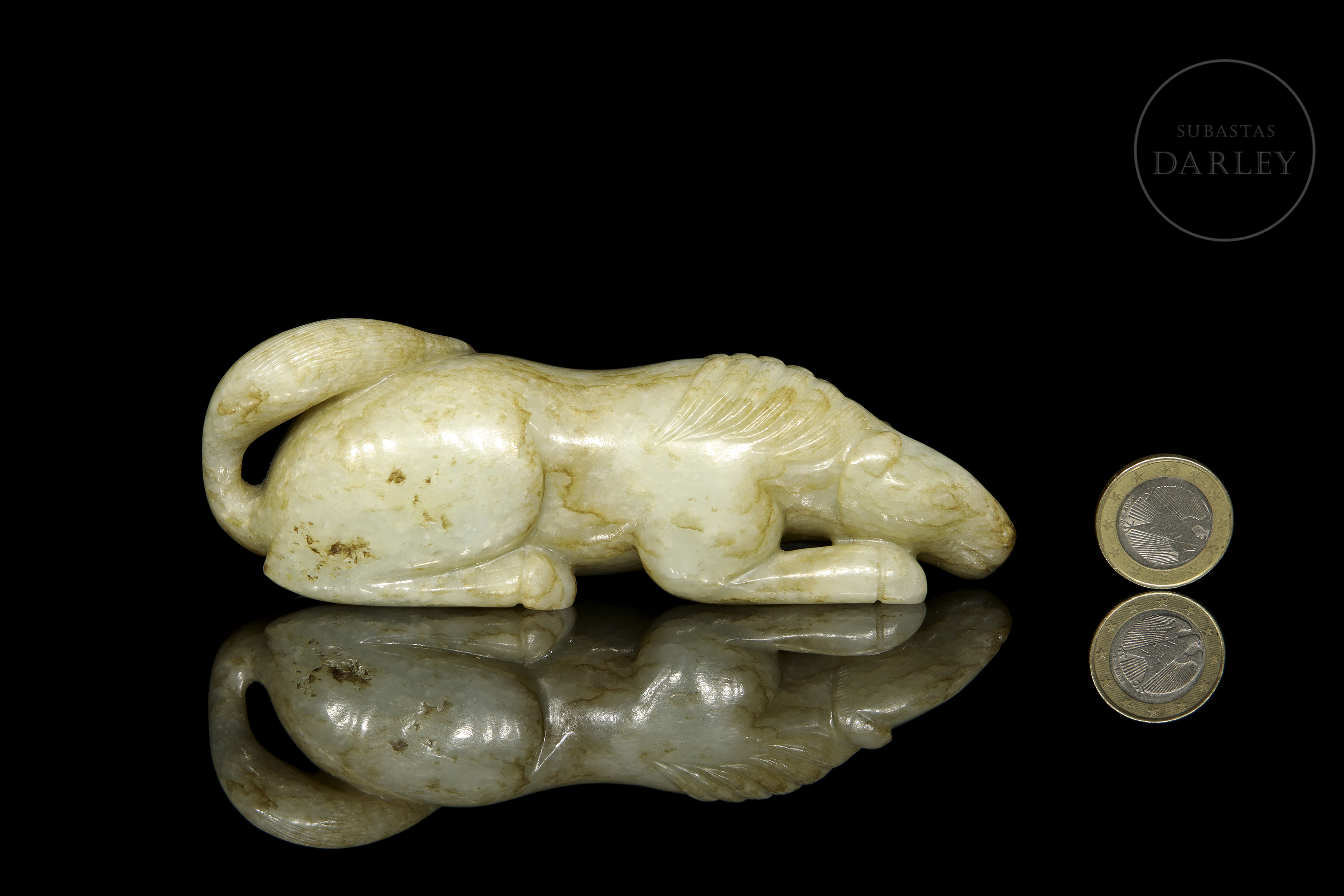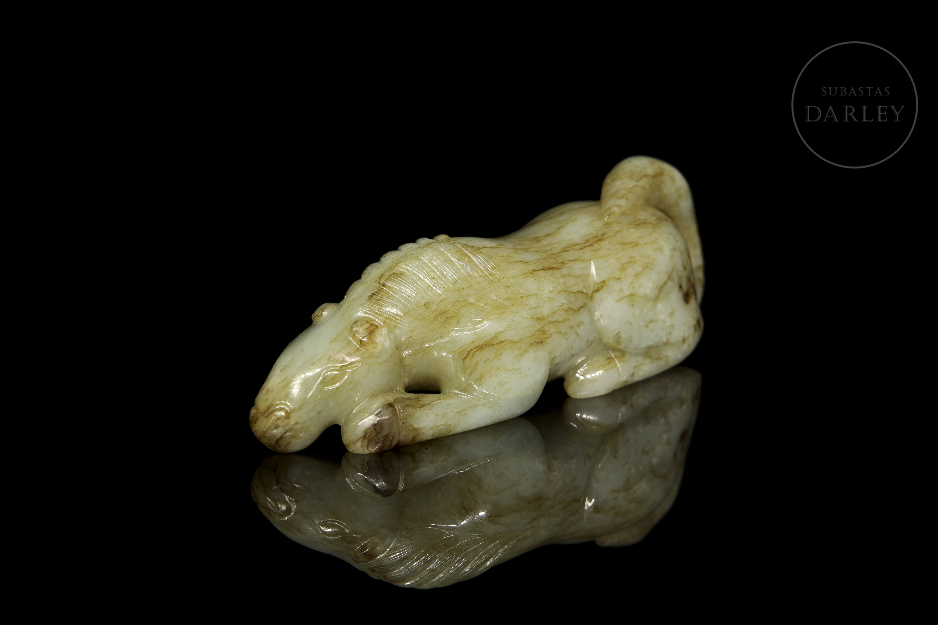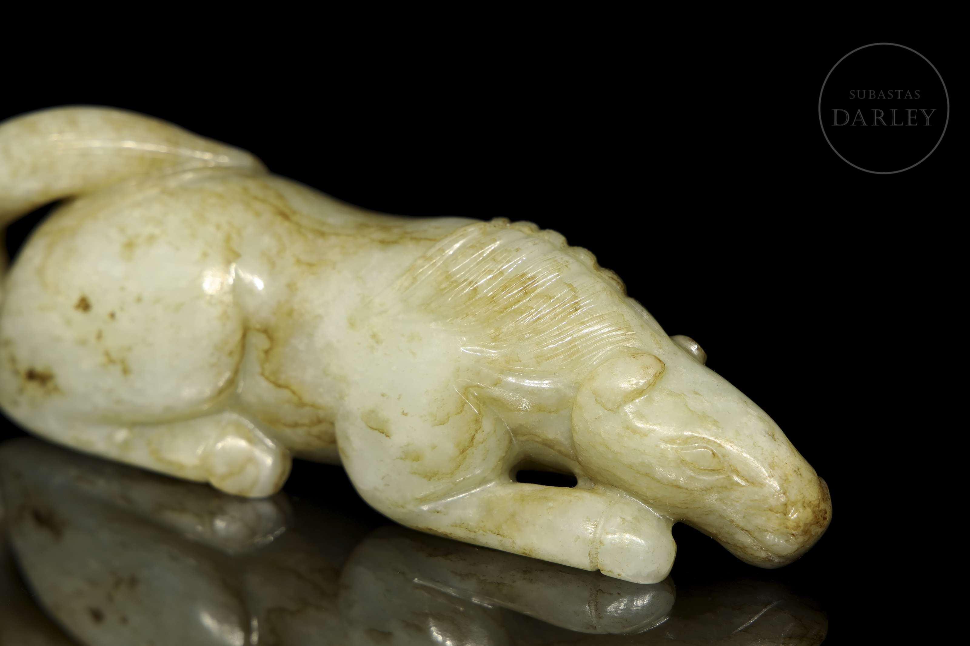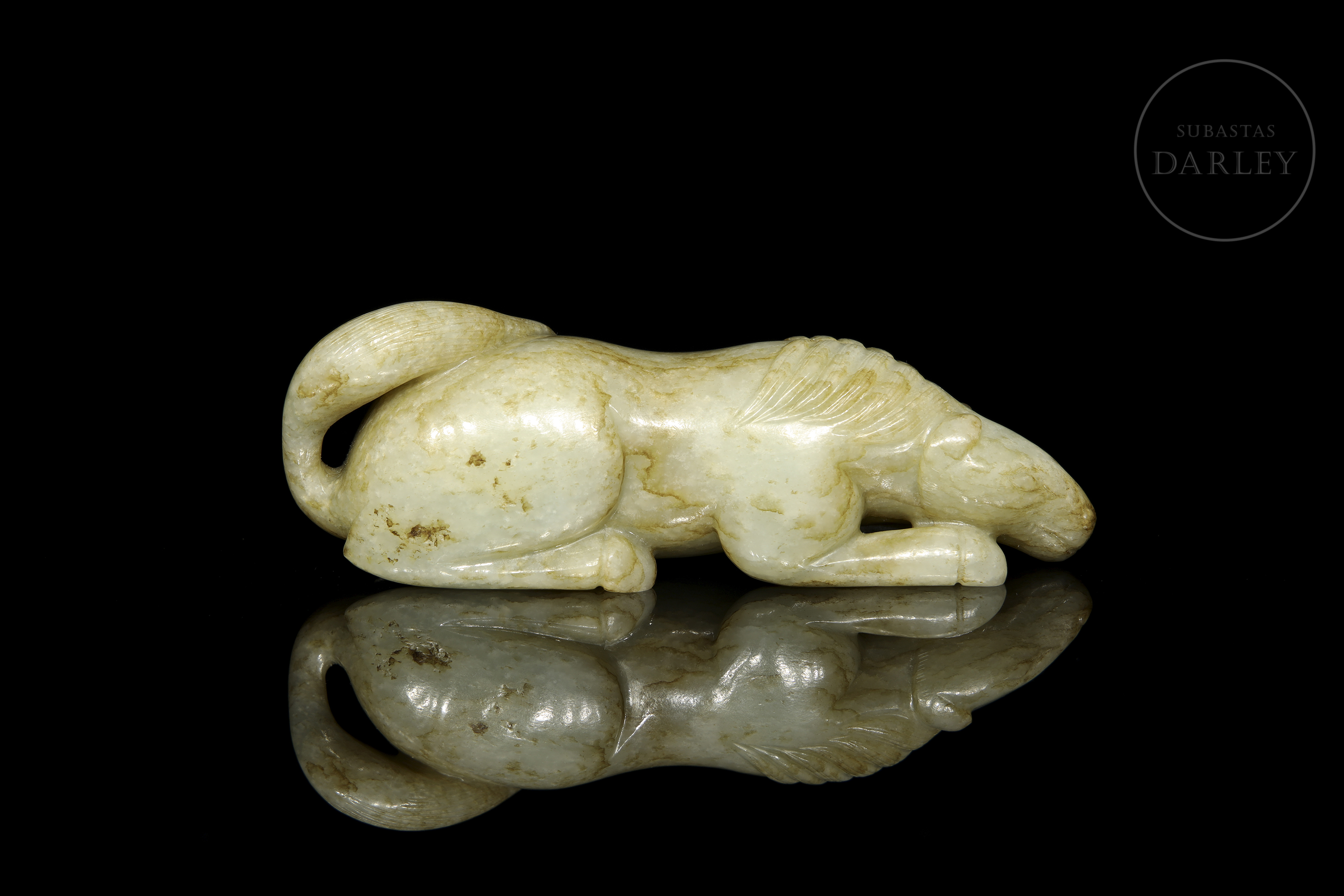 Carved jade figure, representing a small horse resting on its four extended legs, with its head facing forward and tail bent towards the hindquarters. It shows in detail the mane and the face made by incisions. The jade has a light, slightly greenish color, with brownish spots.
