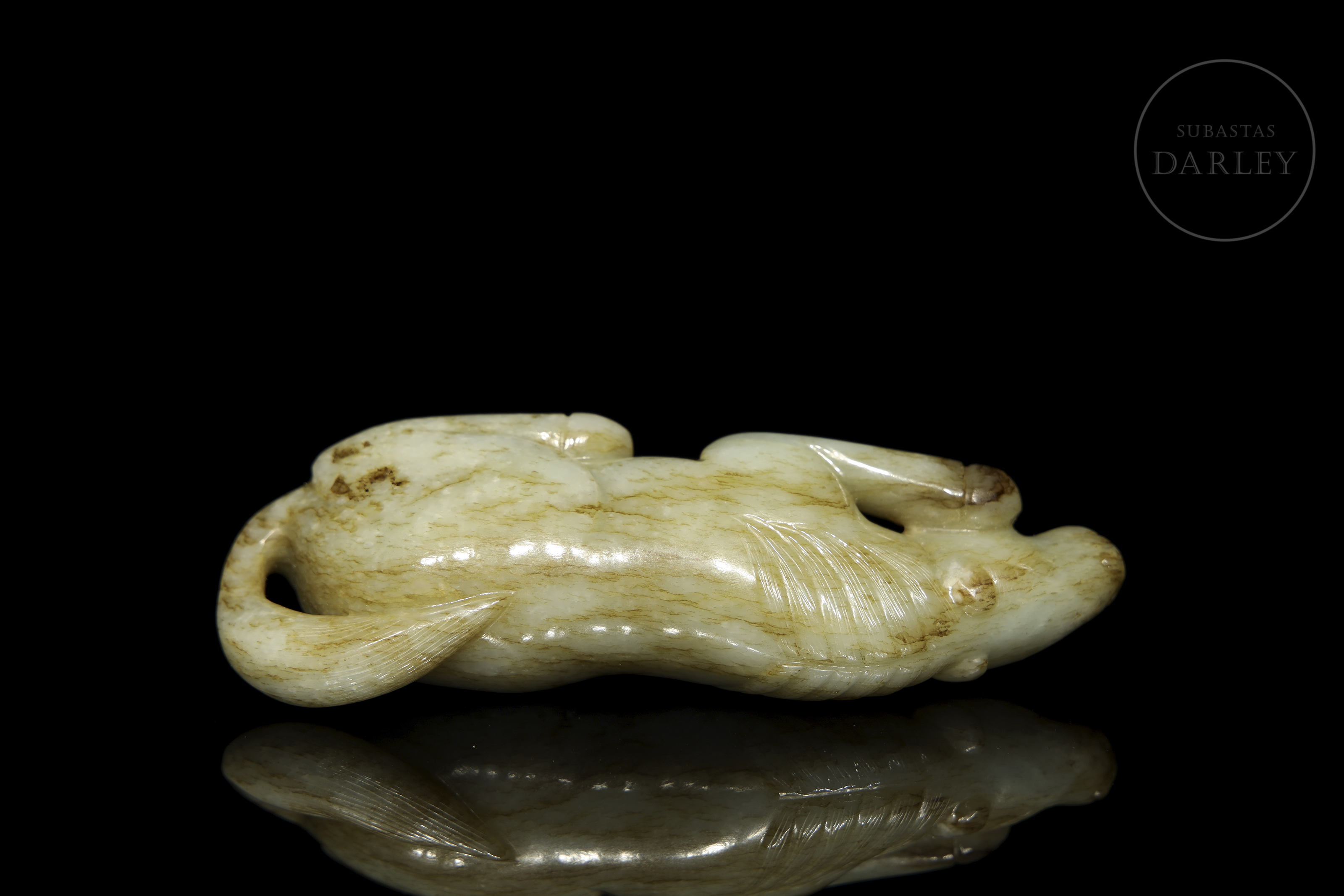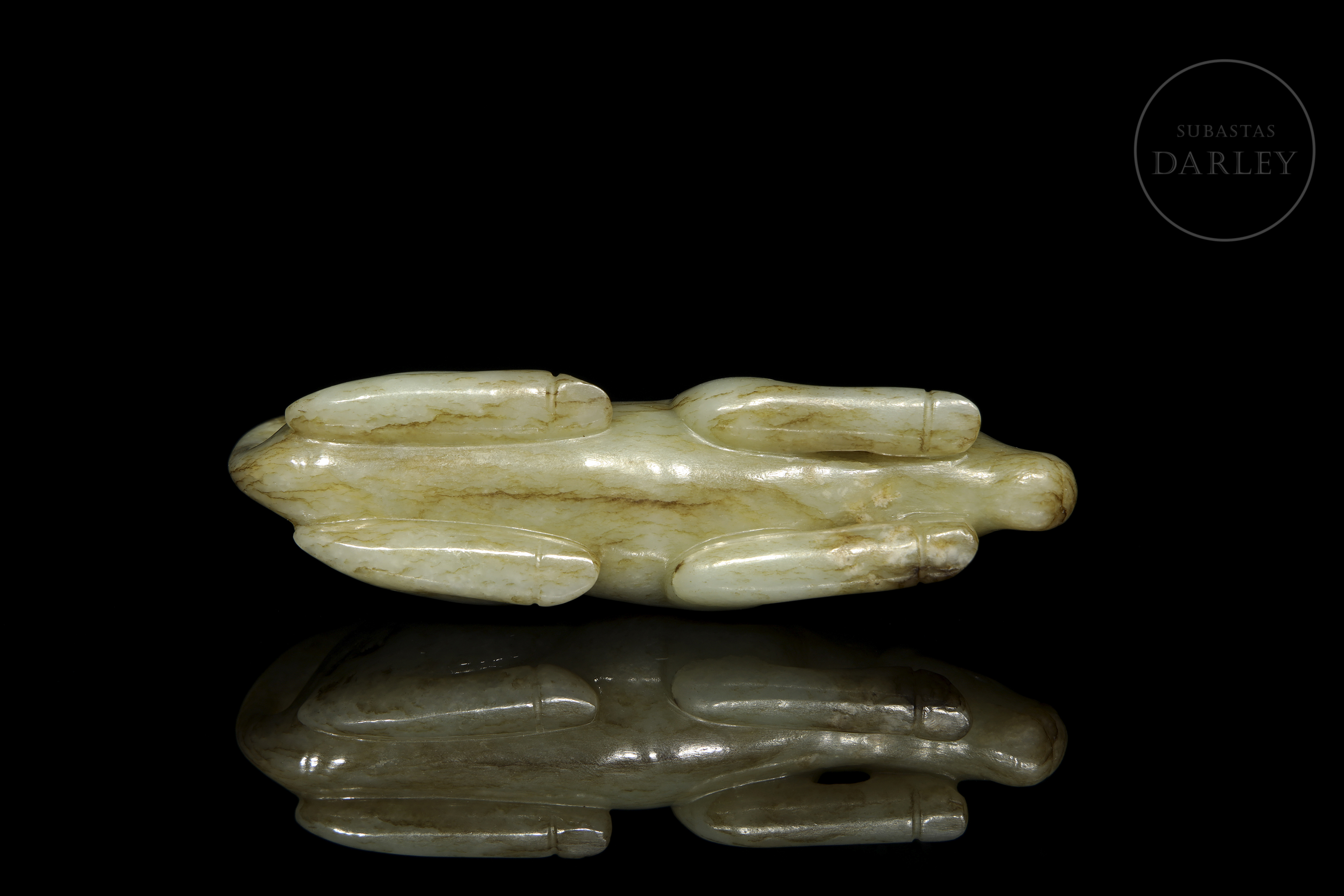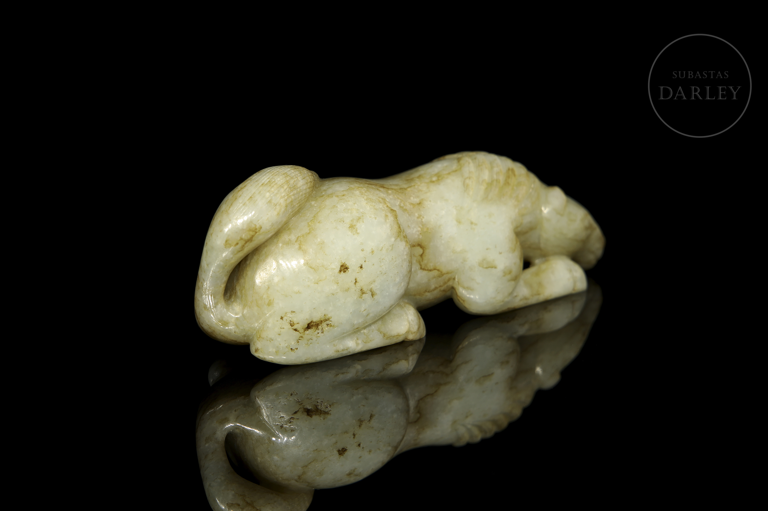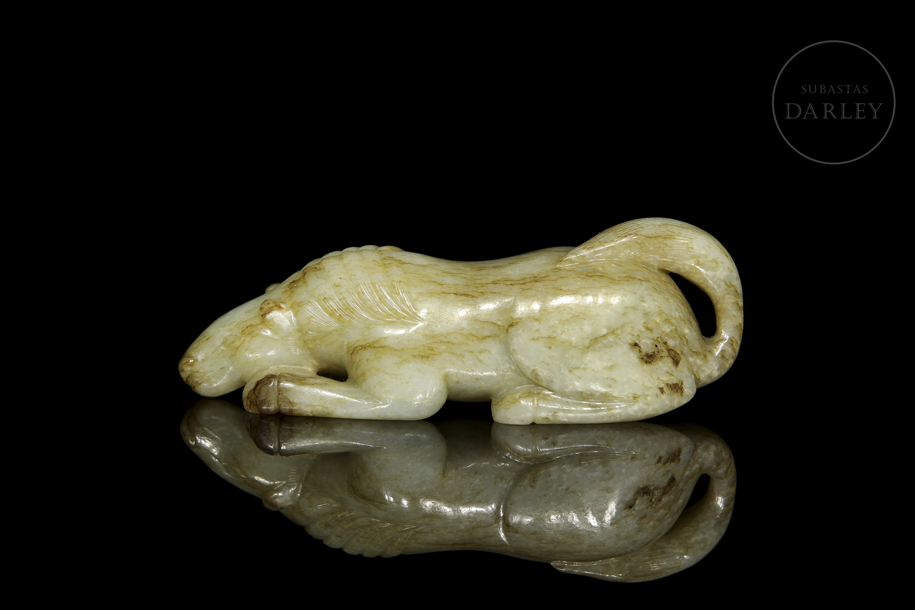 Carved jade figure, representing a small horse resting on its four extended legs, with its head facing forward and tail bent towards the hindquarters. It shows in detail the mane and the face made by incisions. The jade has a light, slightly greenish color, with brownish spots.
