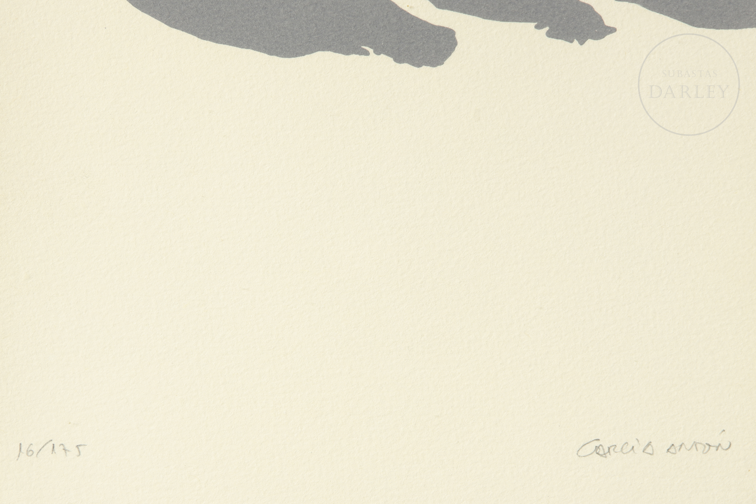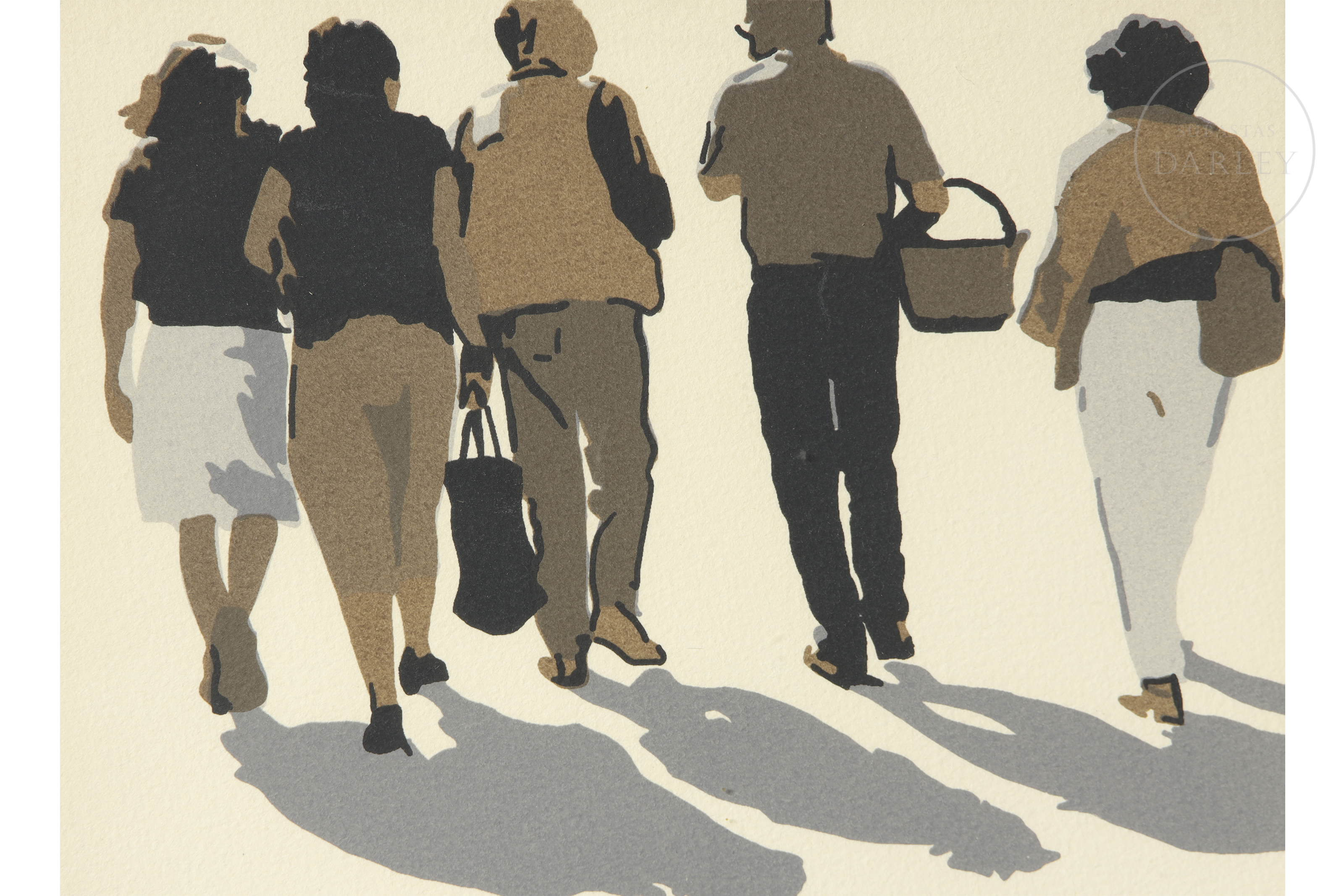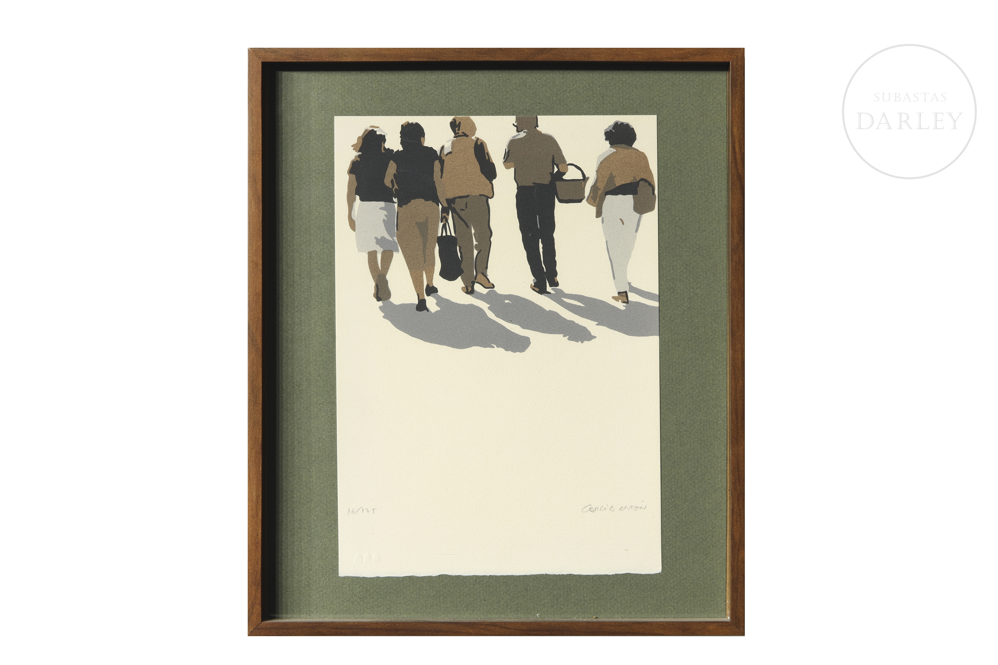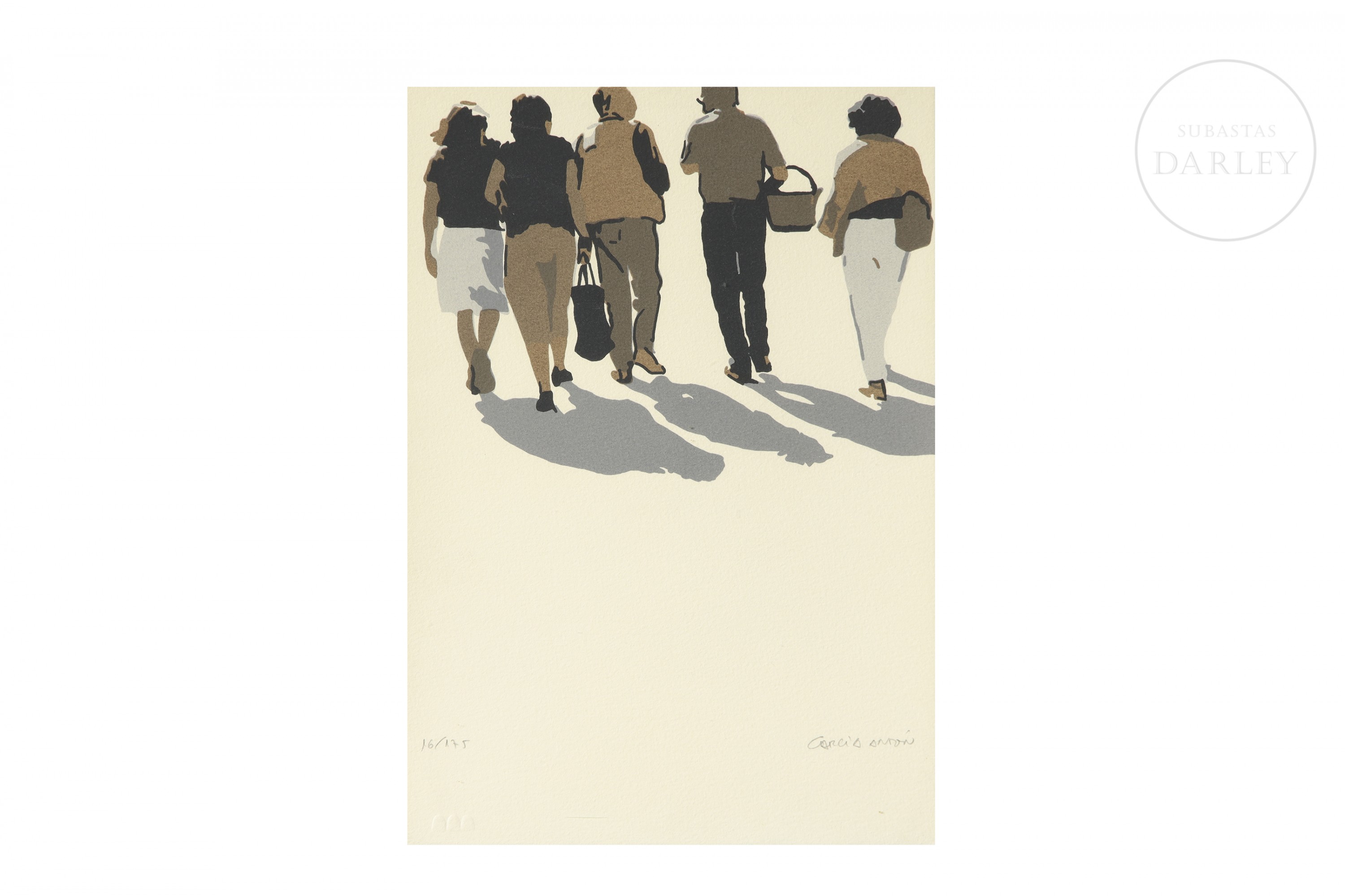 Silkscreen print on paper. It depicts a group of figures walking under intense light that casts elongated shadows, a common device in the artist's work to explore the relationship between figure, environment, and light. Numbered 16/175 and signed in pencil in the lower right corner.