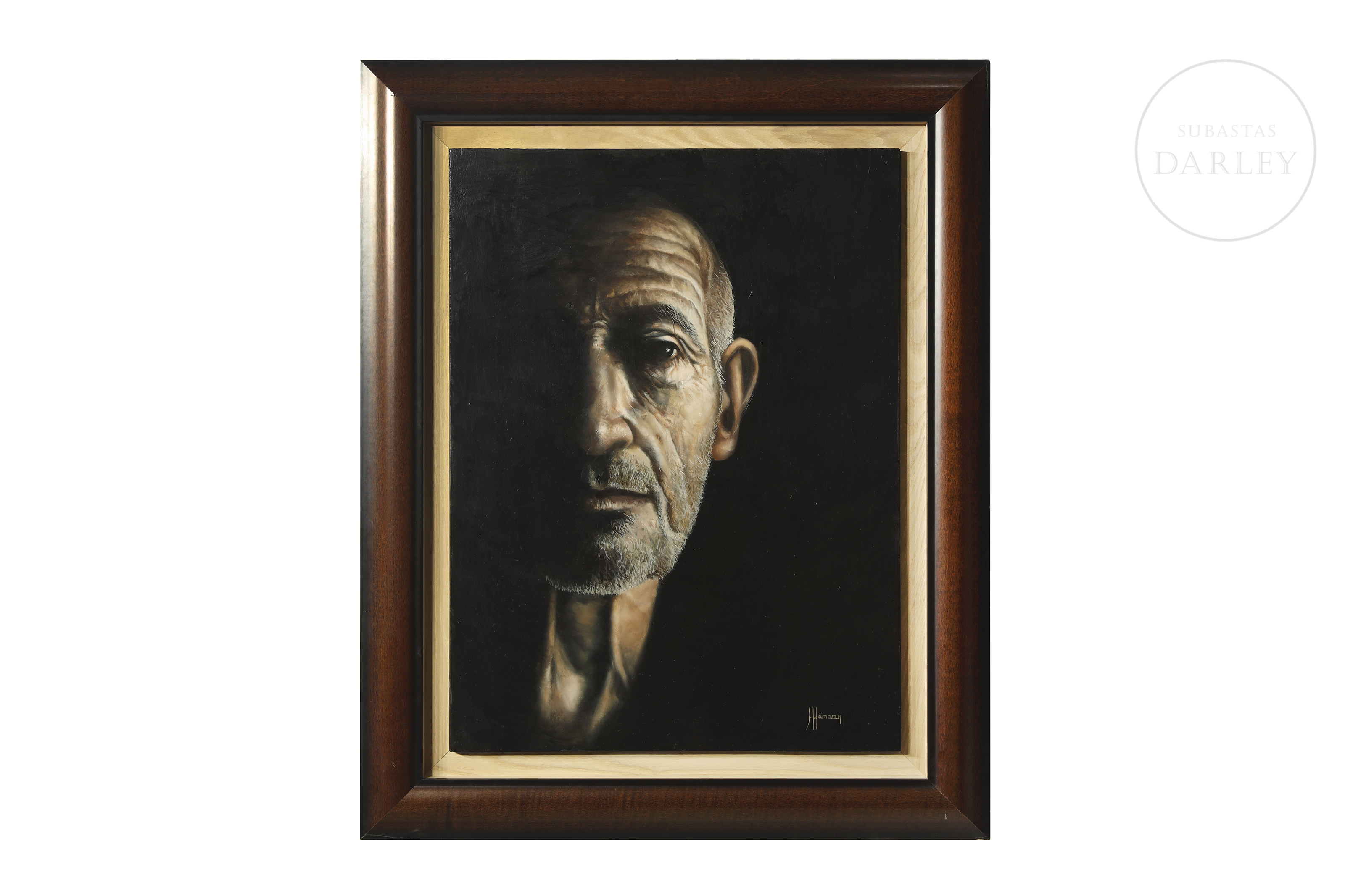 Oil on panel. Hyperrealistic male portrait in close-up against a black background. Signed ‘J. Humaran’ in the lower right corner.