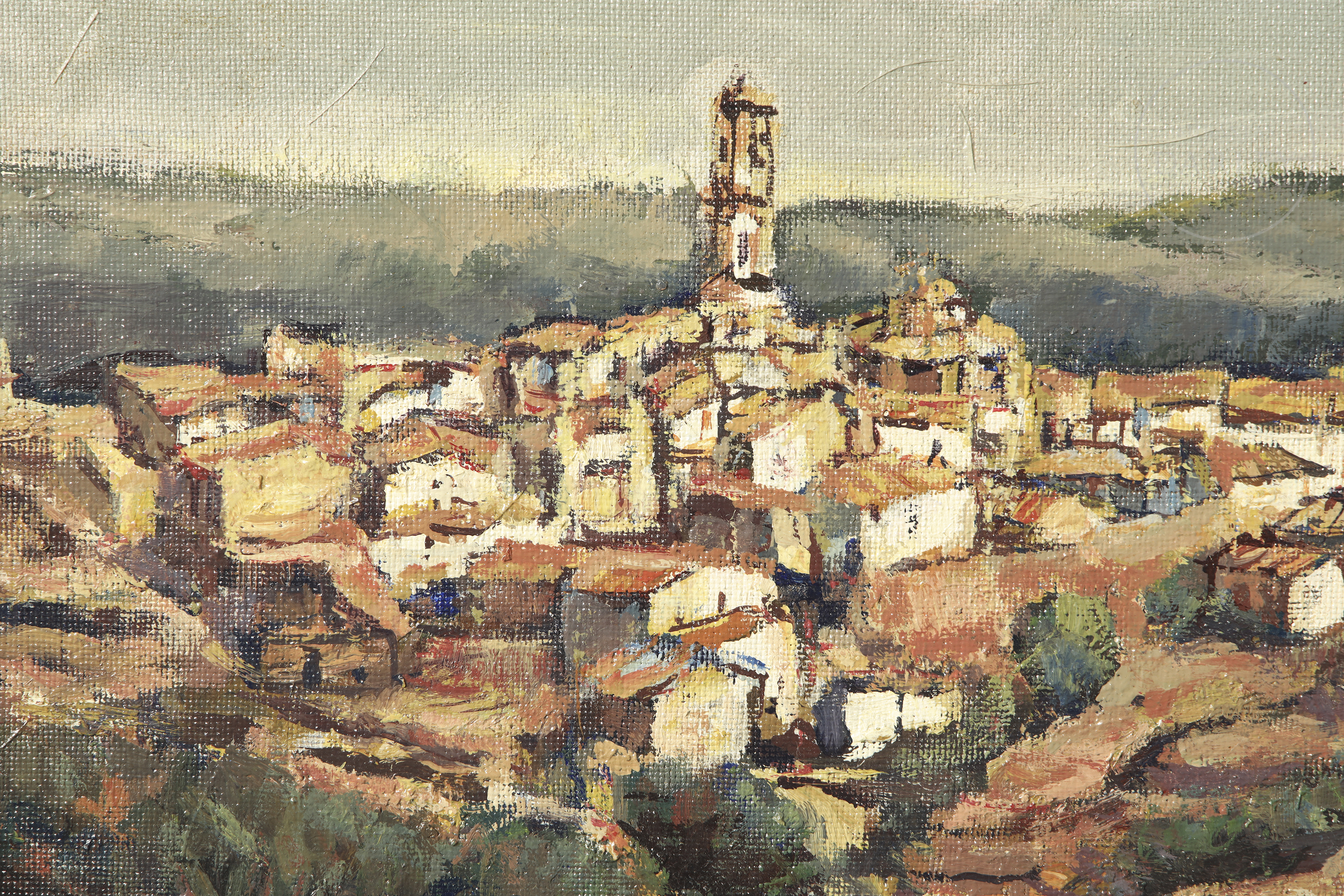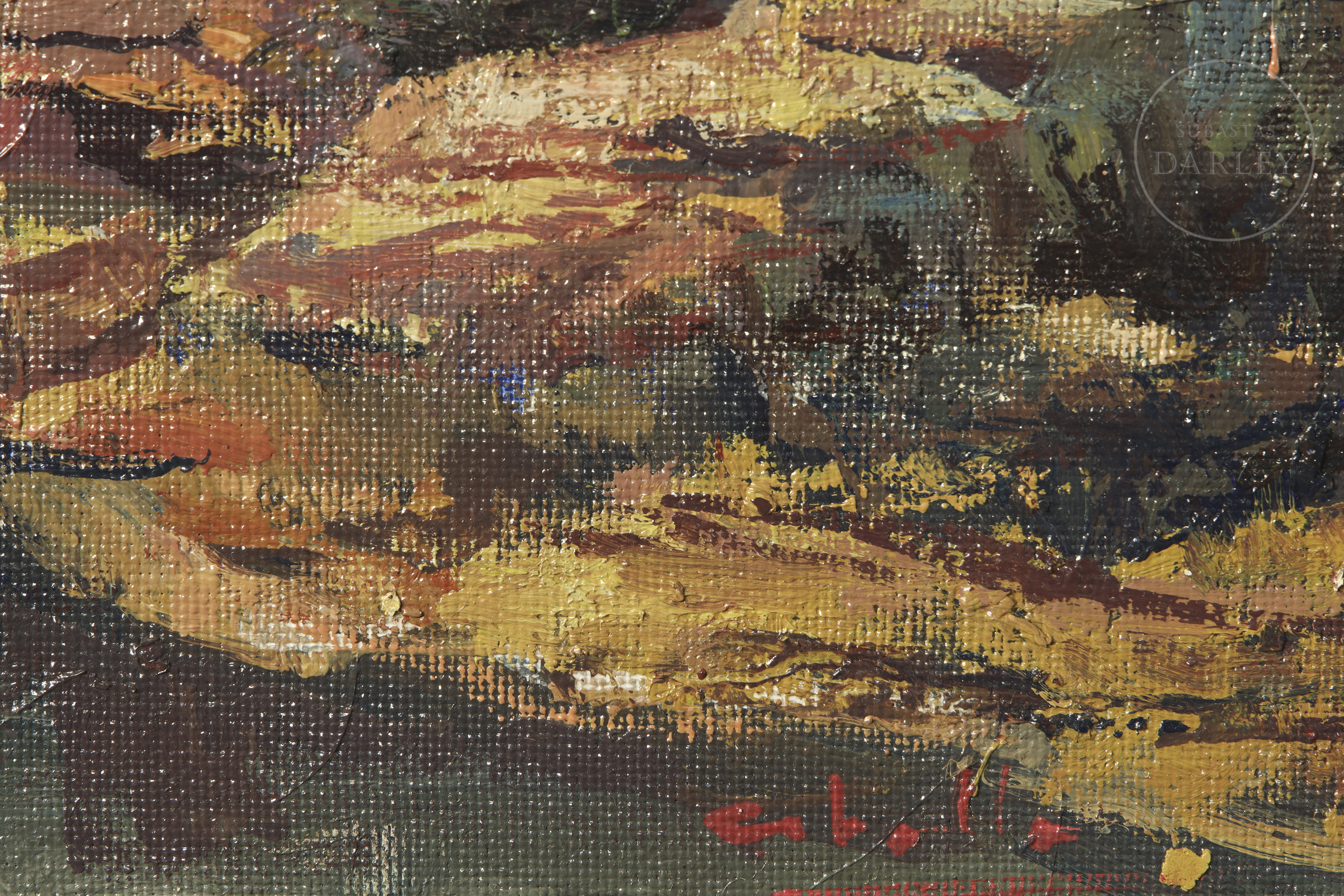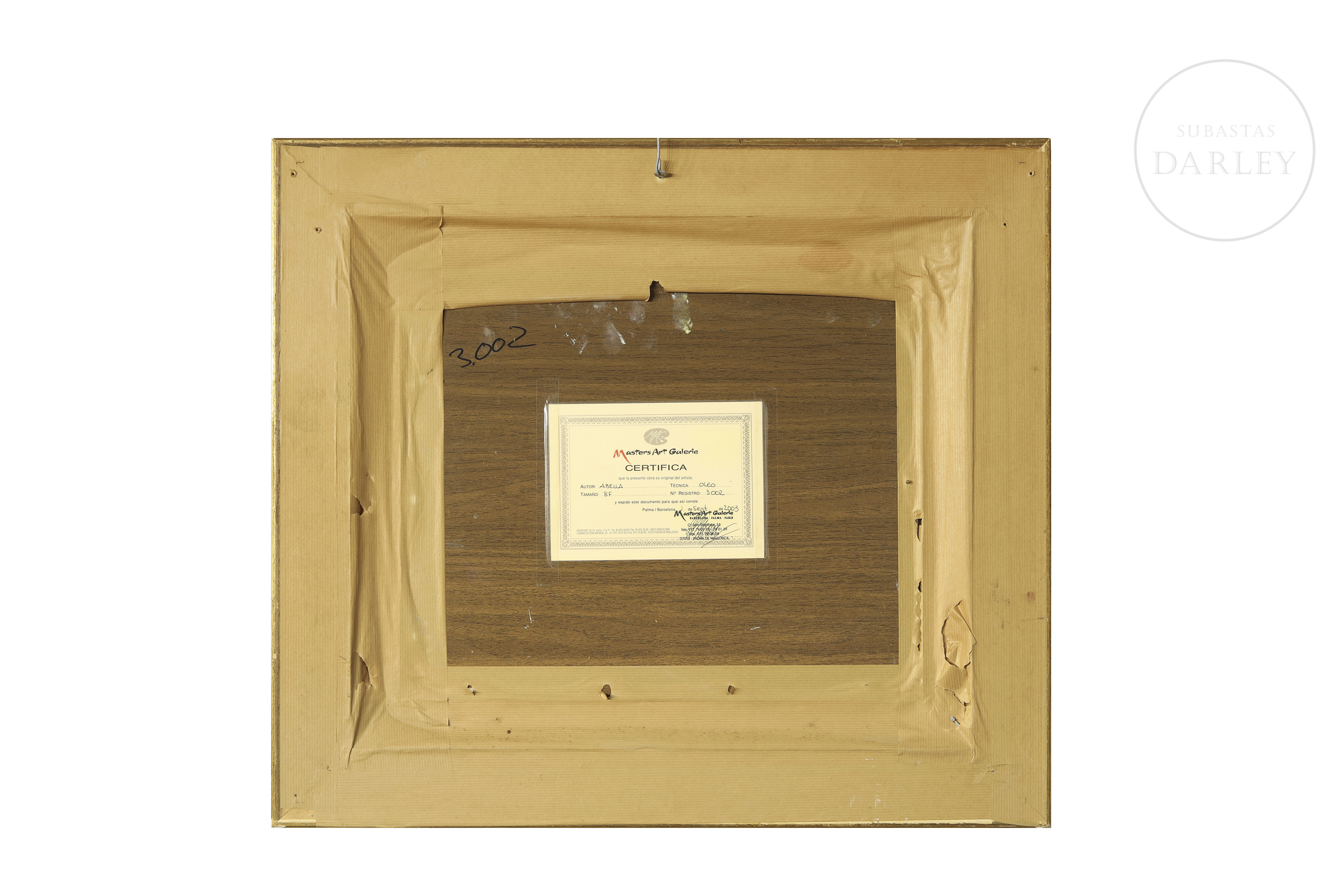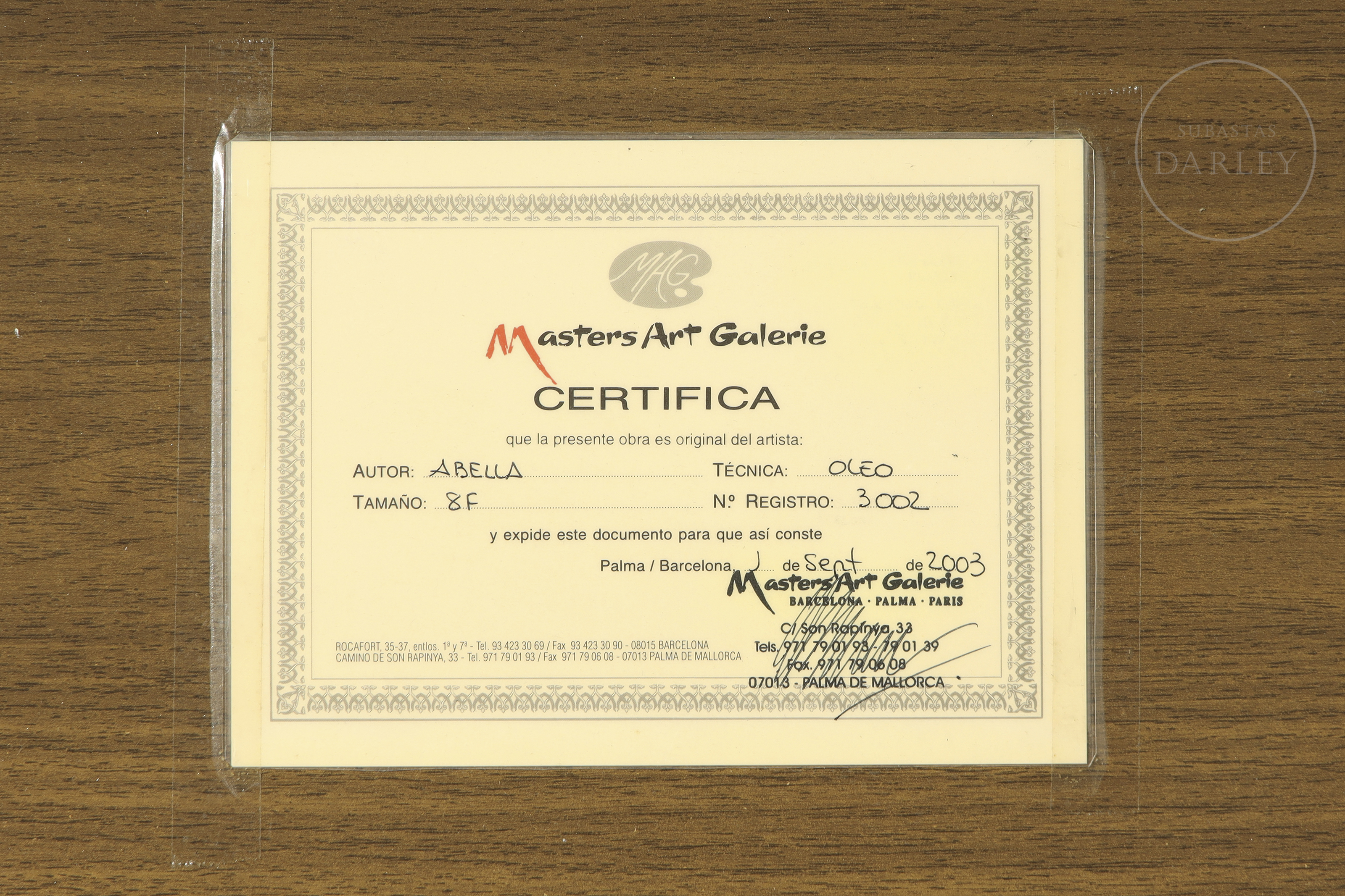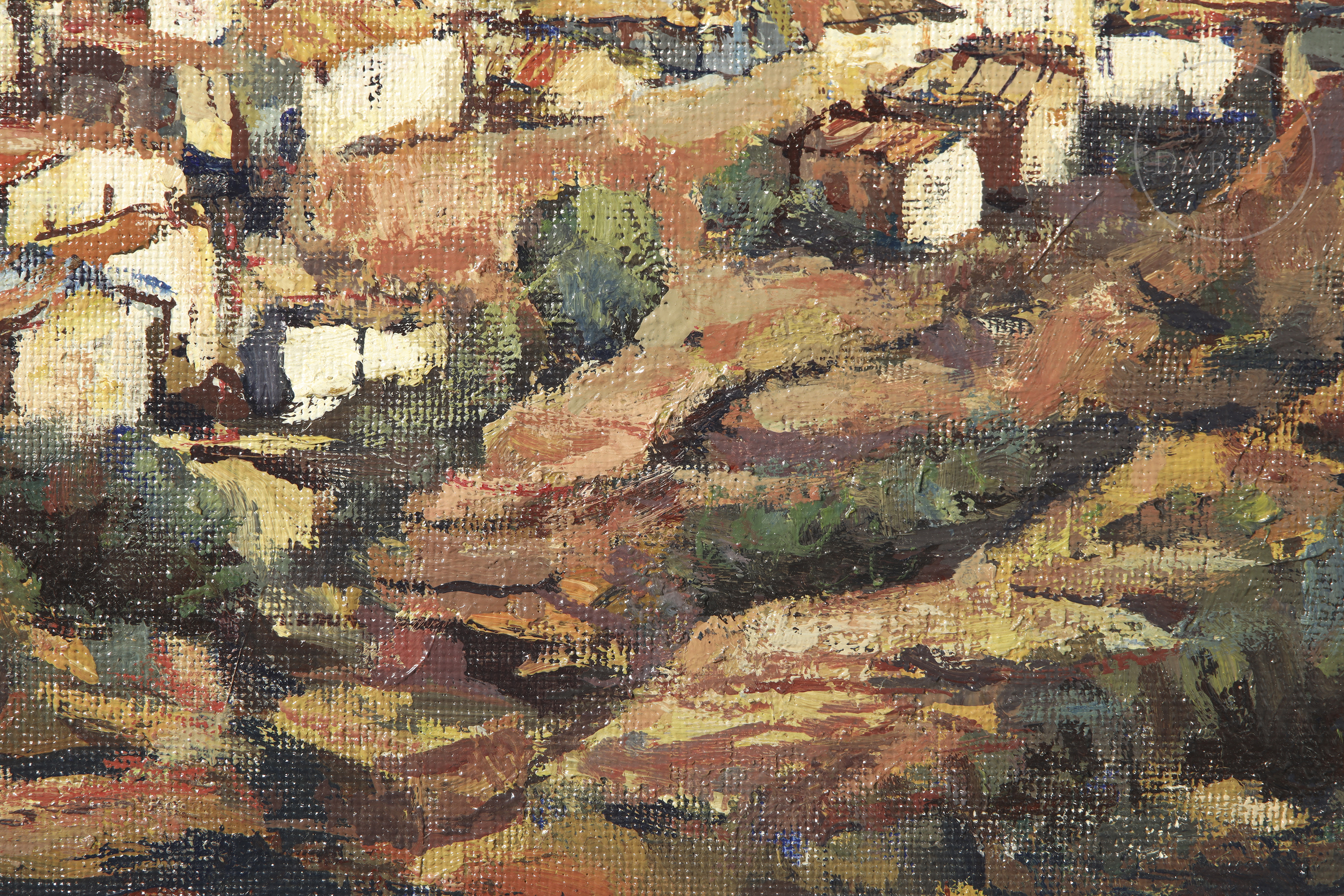 Oil on the back of táblex. Landscape depicting a panoramic view of a village nestled on a hill. Signed “Abella” in the lower right corner. Certificate on the back.