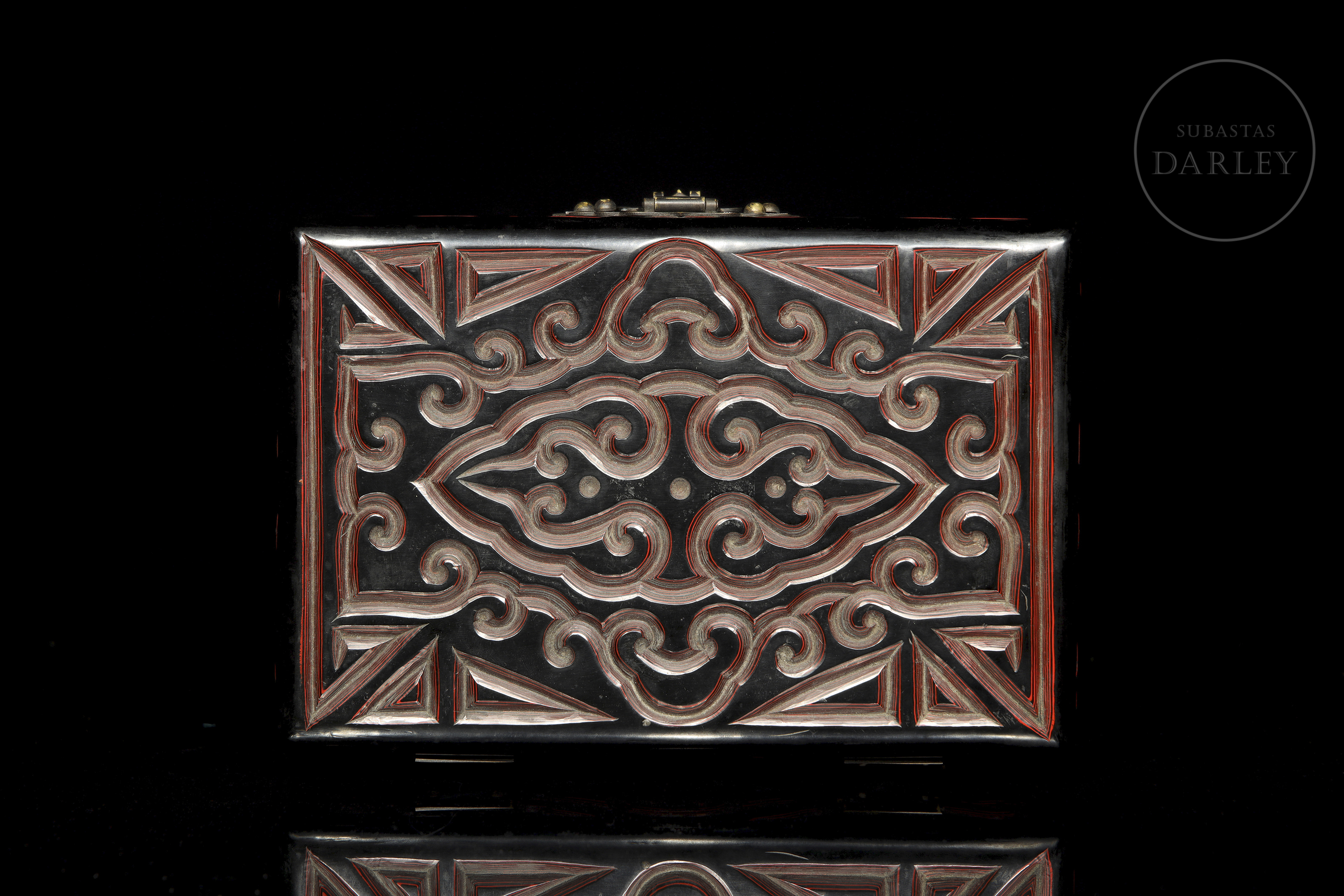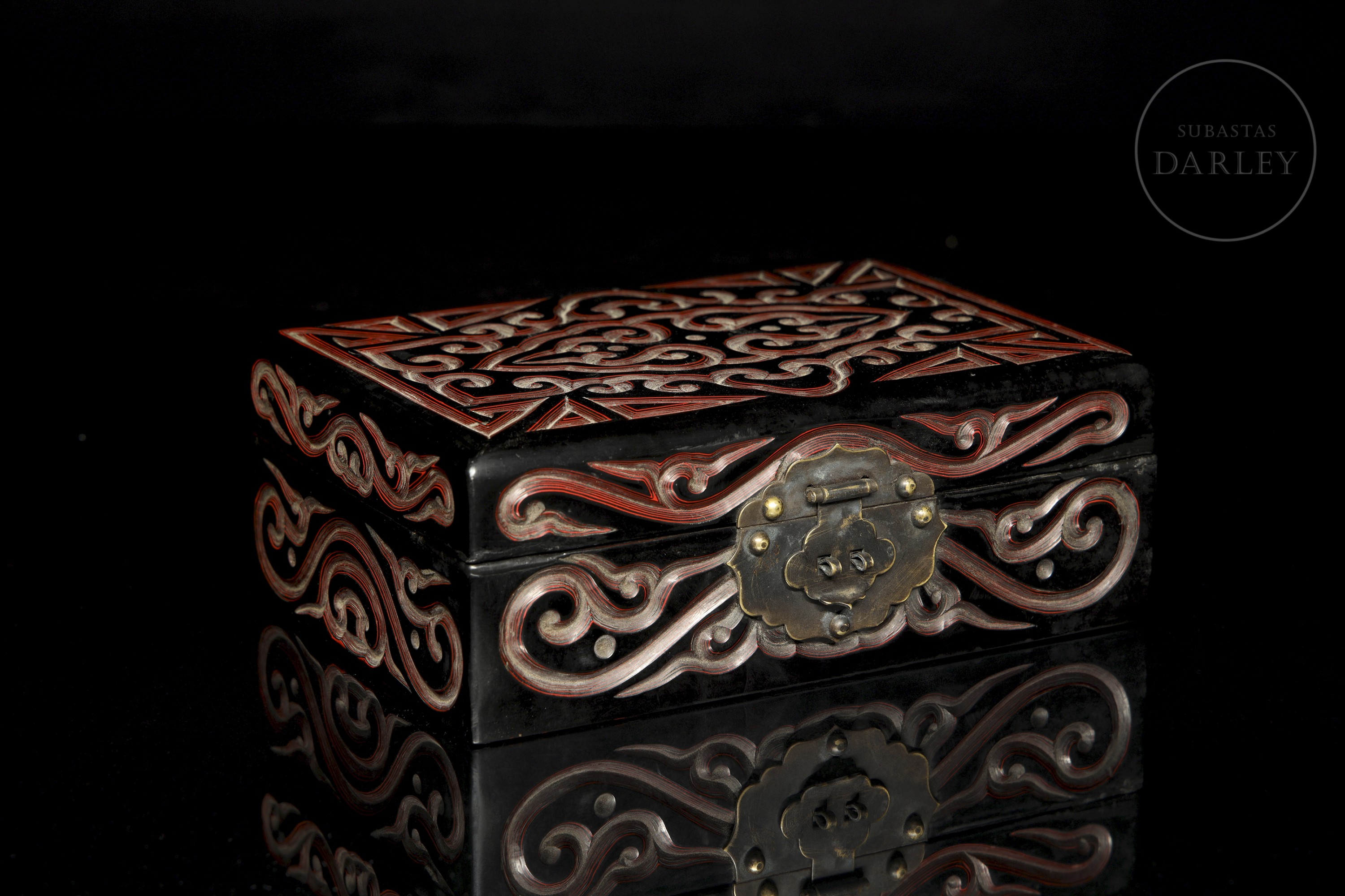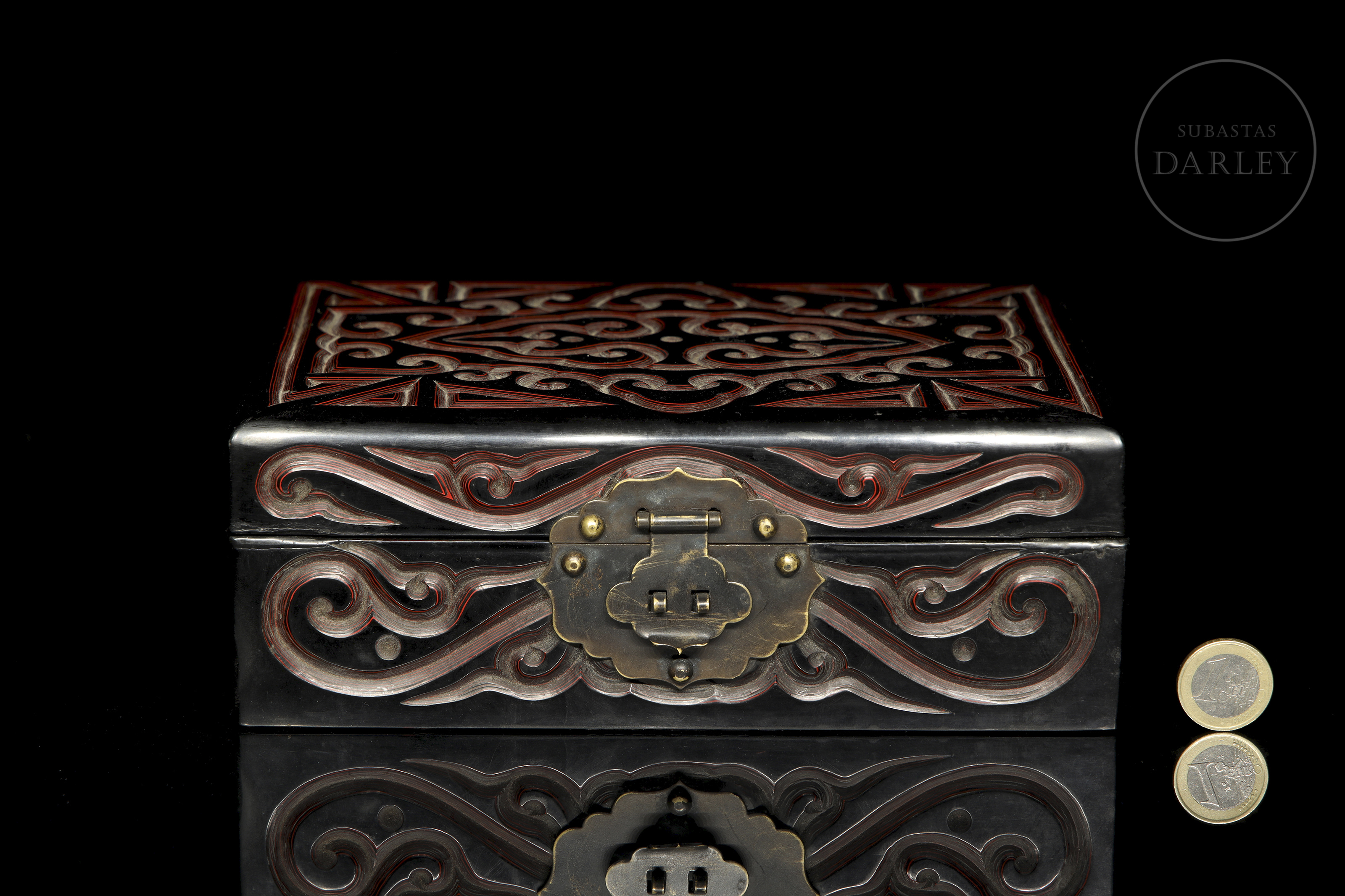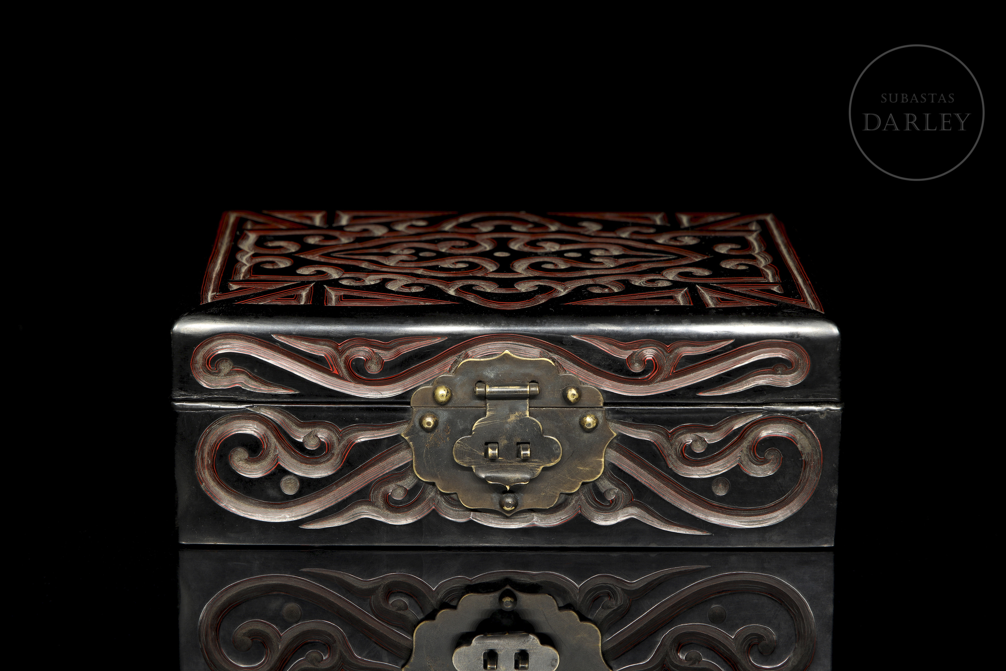 Rectangular box in lacquered and carved wood with overlapping layers of red and black, decorated with intertwined scrollwork and geometric motifs in relief. It retains its metal fittings on the front and a clasp on the lid. The base bears an apocryphal seal reading ‘大清乾隆御制’.