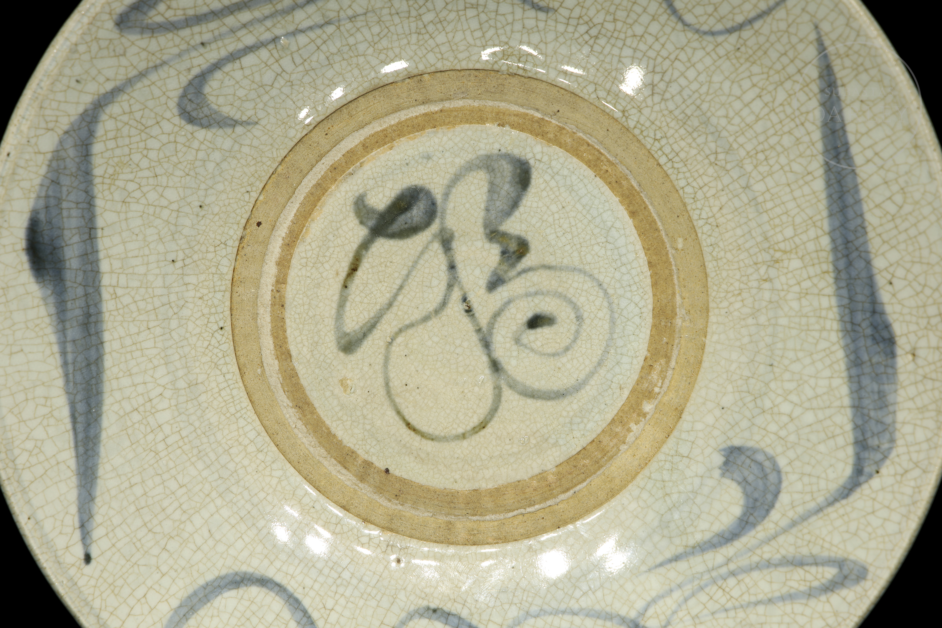 Glazed ceramic with underglaze decoration in white and grayish blue. It has a circular body and slightly flared walls. It is decorated with a motif of stylized lines and thick brushstrokes. There is an underglaze symbol on the base. Ming Dynasty (1368-1644).