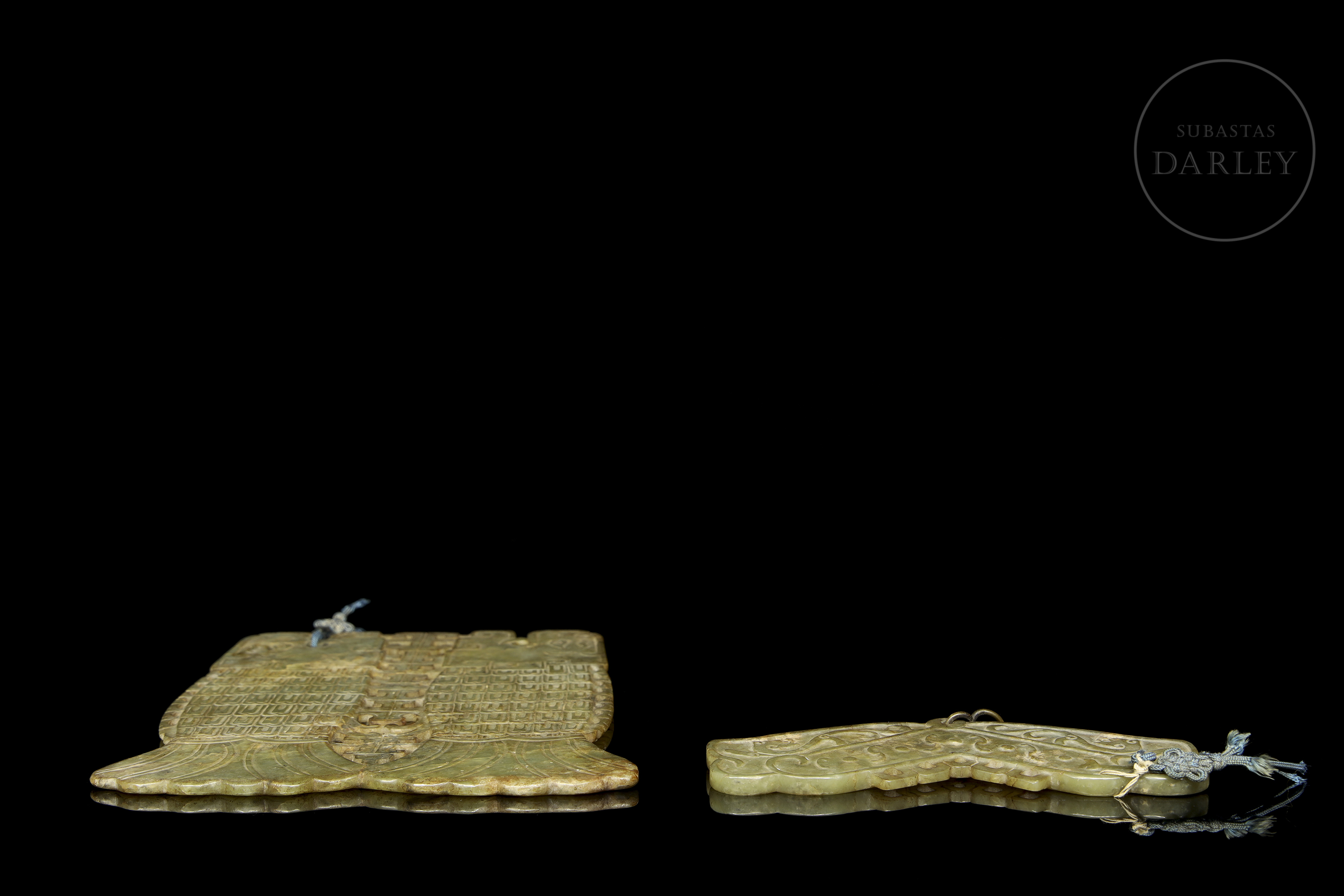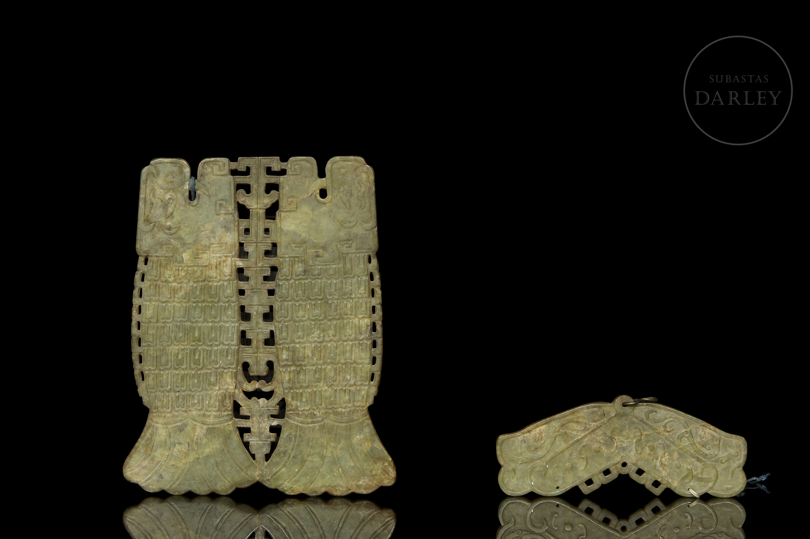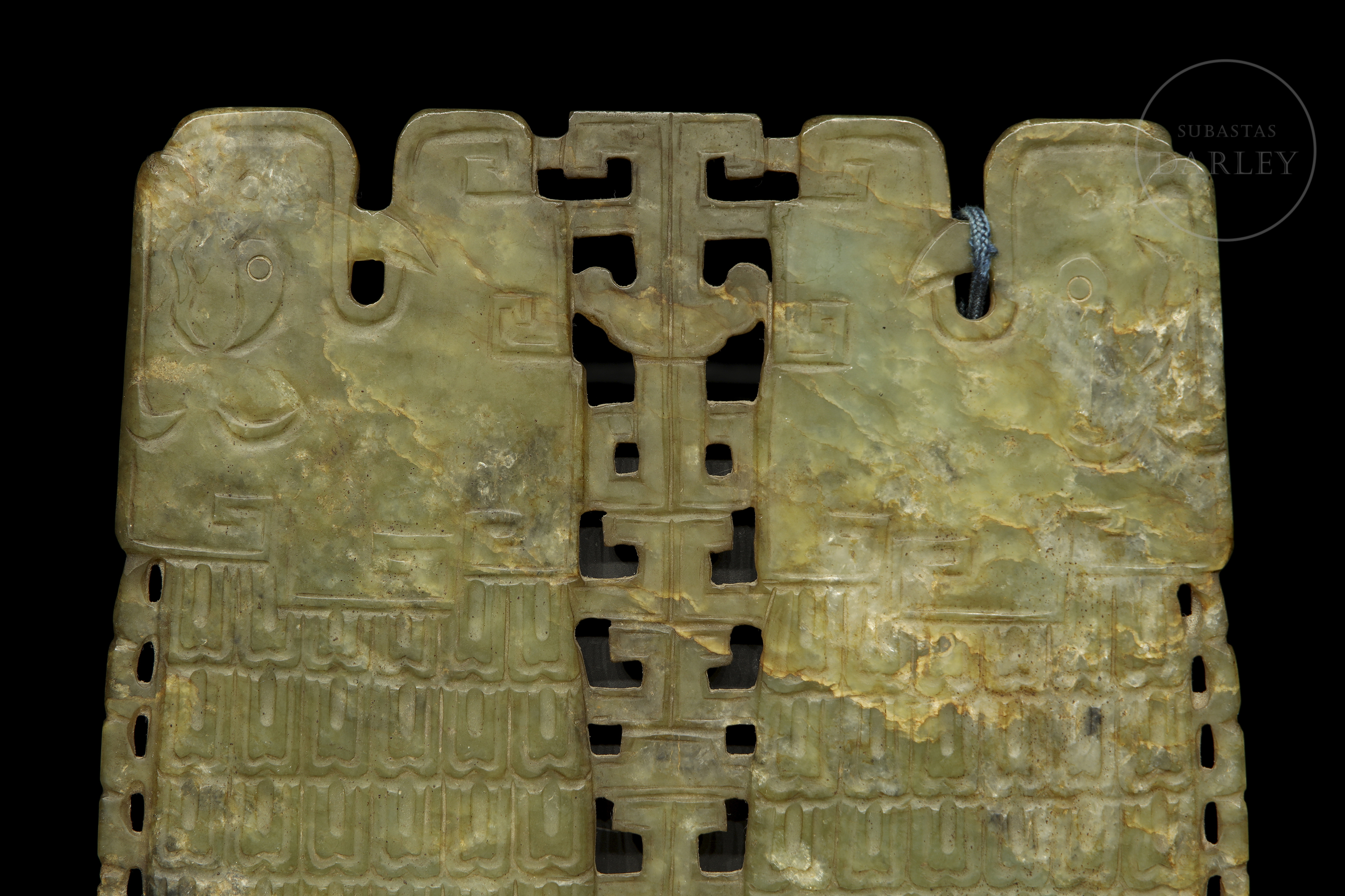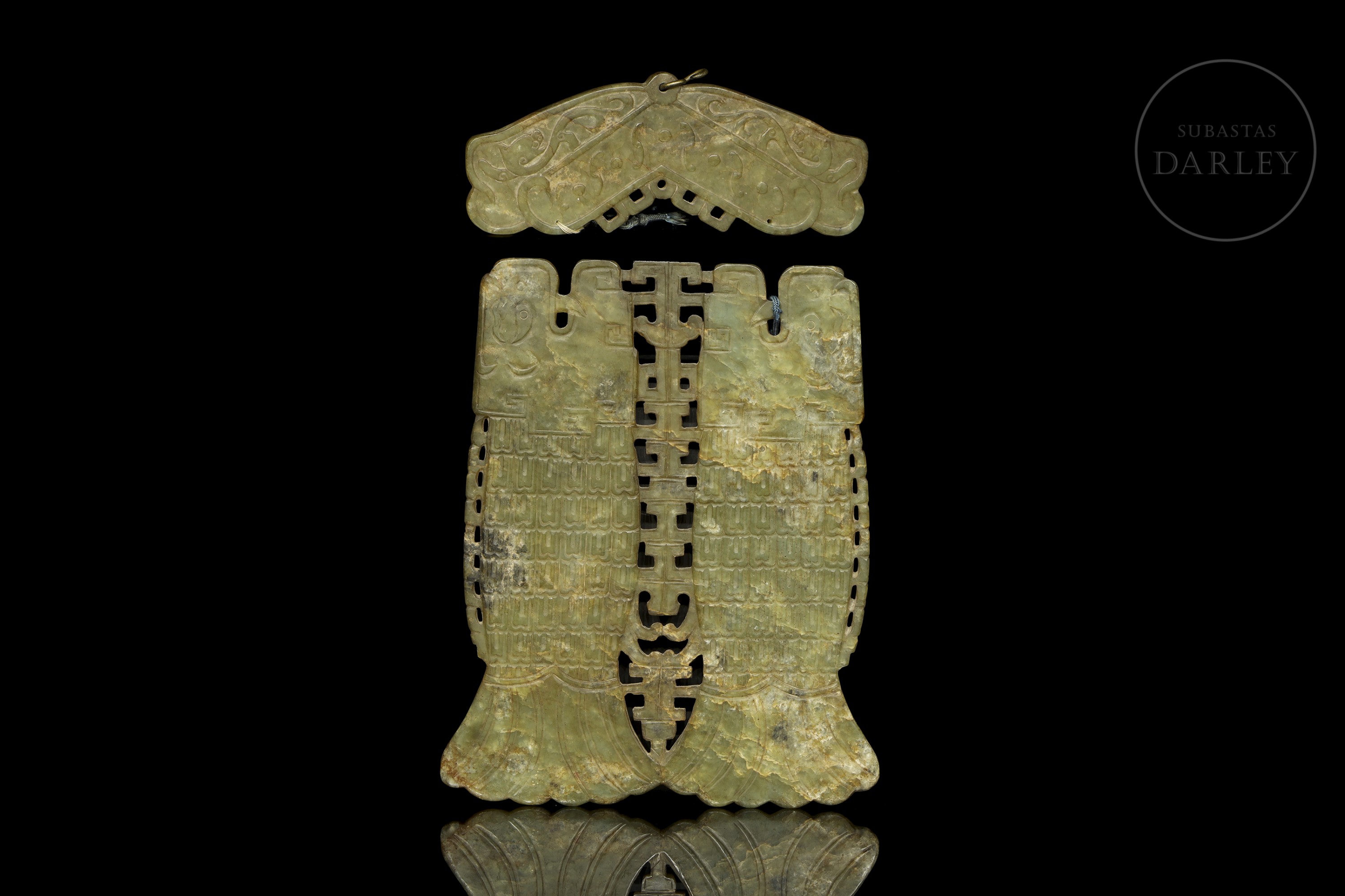 Set of two carved jade plaques of greenish tonality with golden spots. First, there is a large plate carved in the form of two elongated fish with open mouth and intense look, with the body covered with scales and a large flared tail; which are joined in the center by a succession of carved and openwork geometric elements. The upper part is composed by a smaller triangular plate, adorned by relief motifs of small sinuous and elongated dragons, pearls and scrolls.