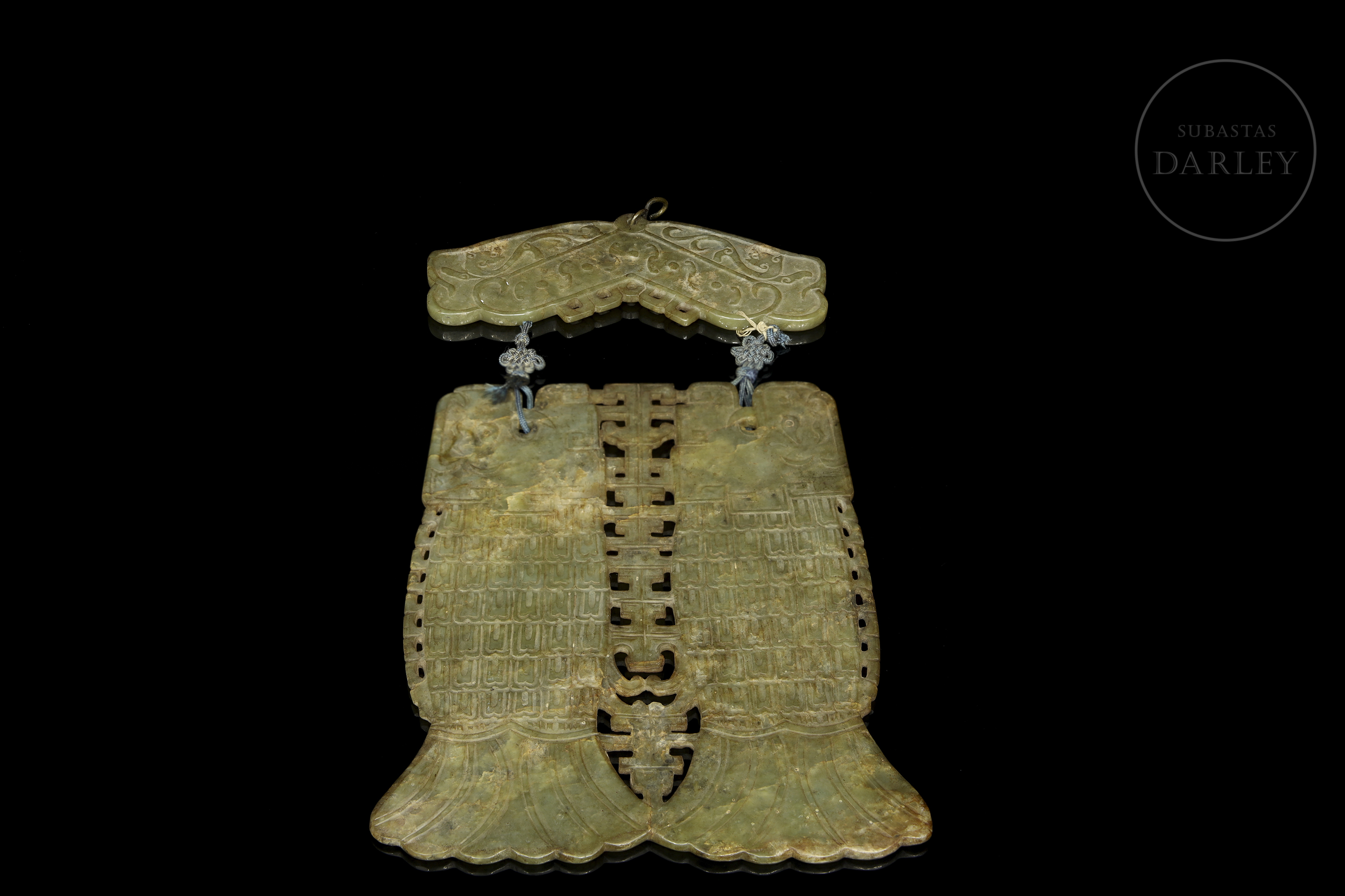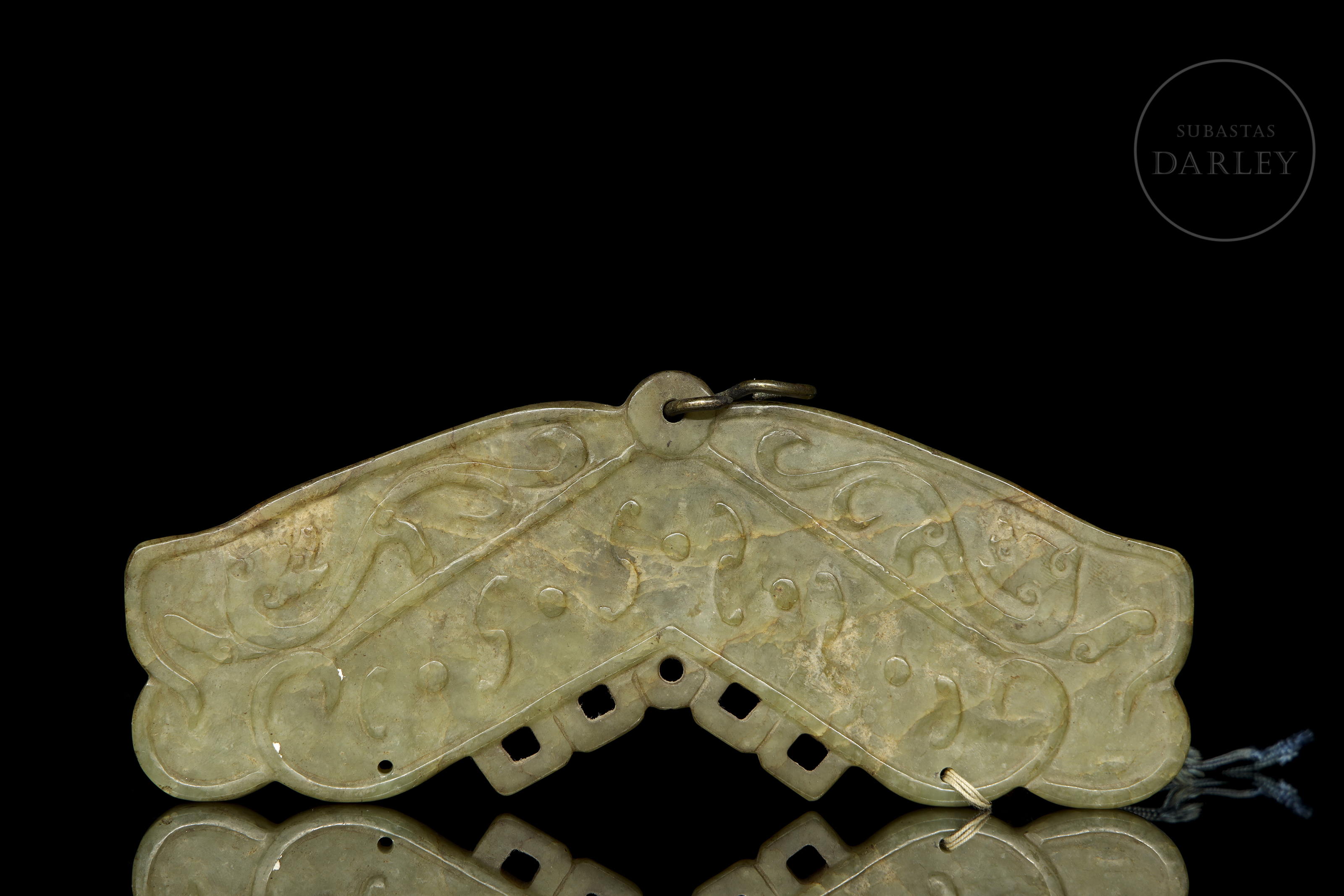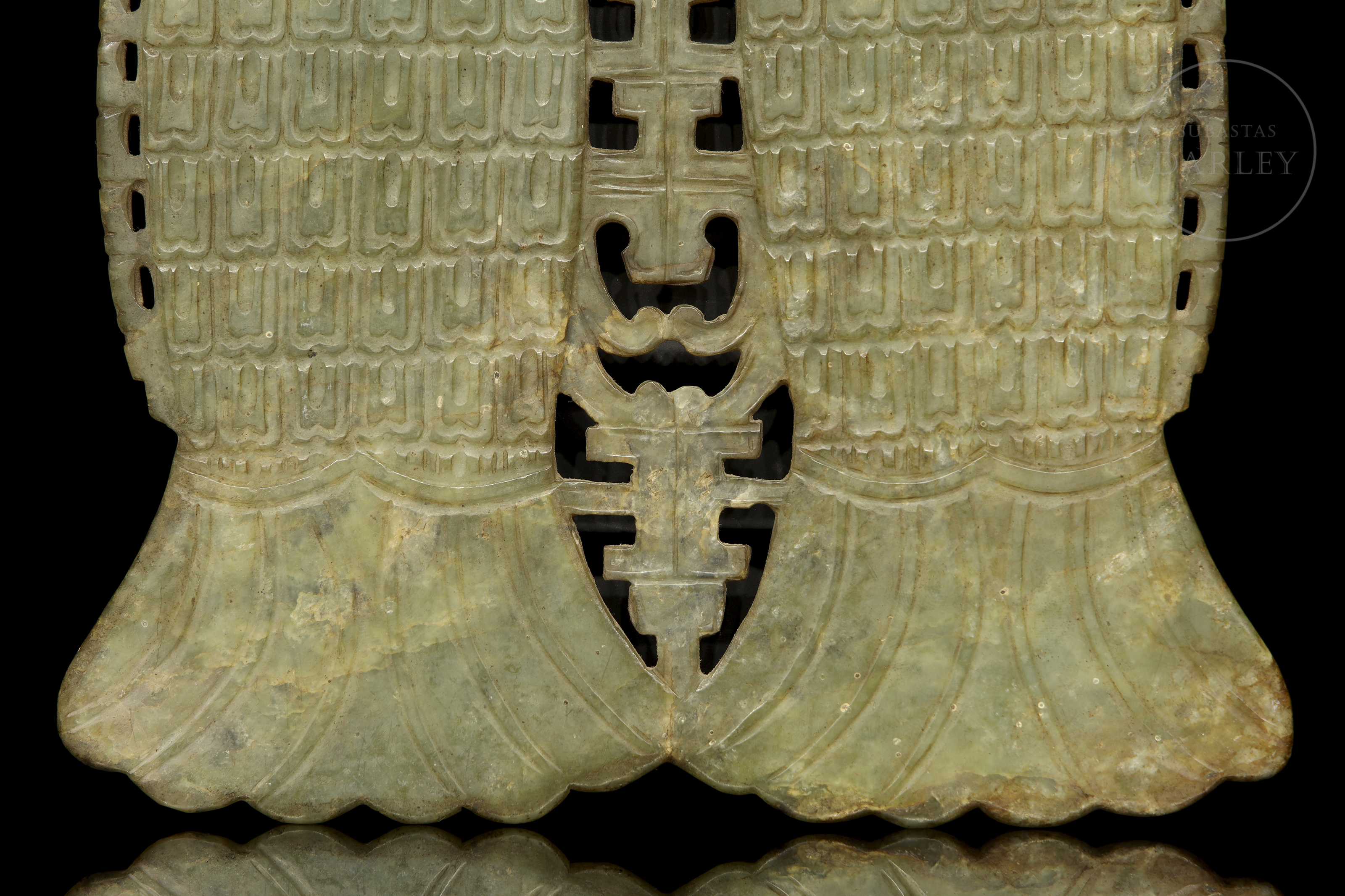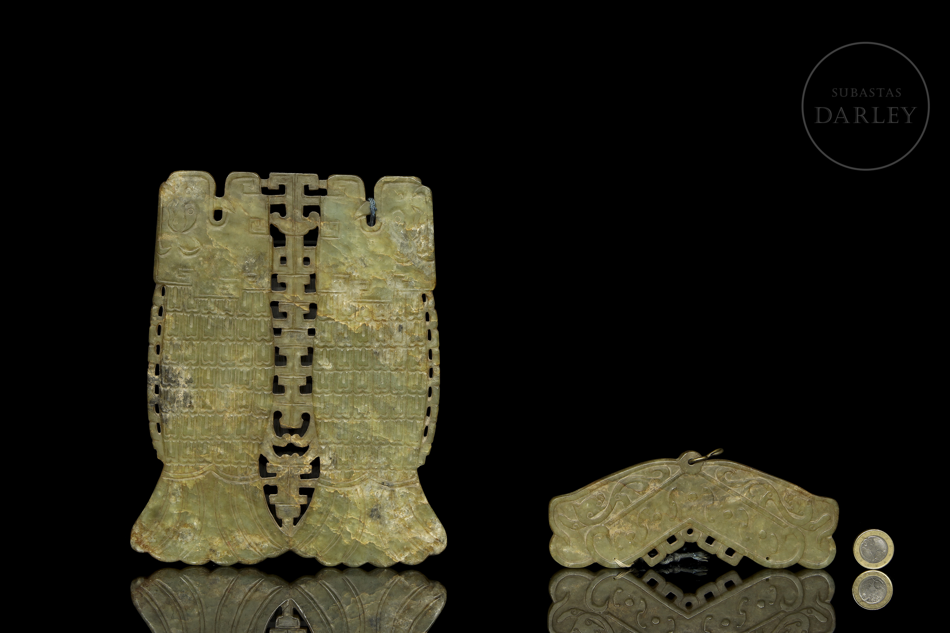 Set of two carved jade plaques of greenish tonality with golden spots. First, there is a large plate carved in the form of two elongated fish with open mouth and intense look, with the body covered with scales and a large flared tail; which are joined in the center by a succession of carved and openwork geometric elements. The upper part is composed by a smaller triangular plate, adorned by relief motifs of small sinuous and elongated dragons, pearls and scrolls.