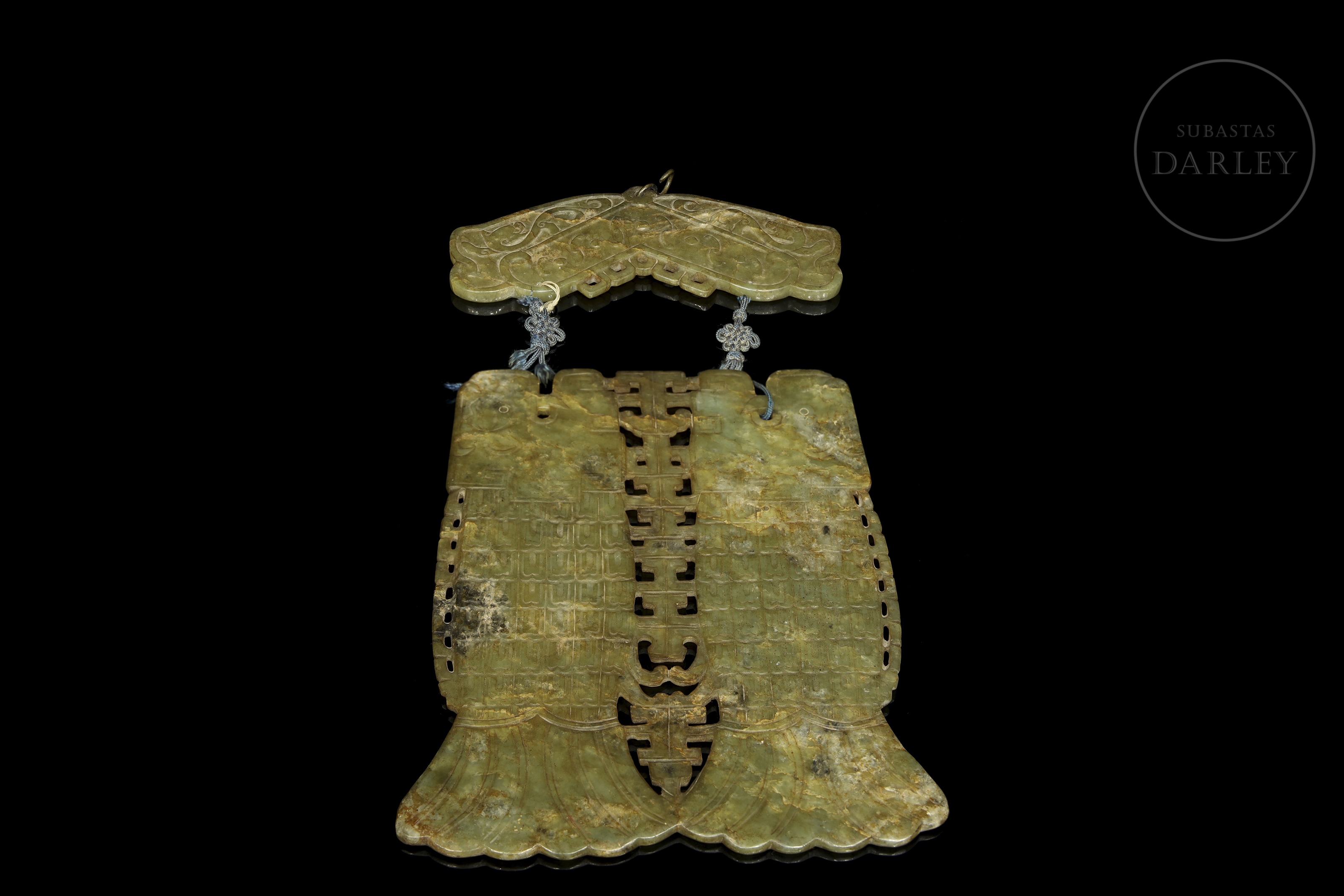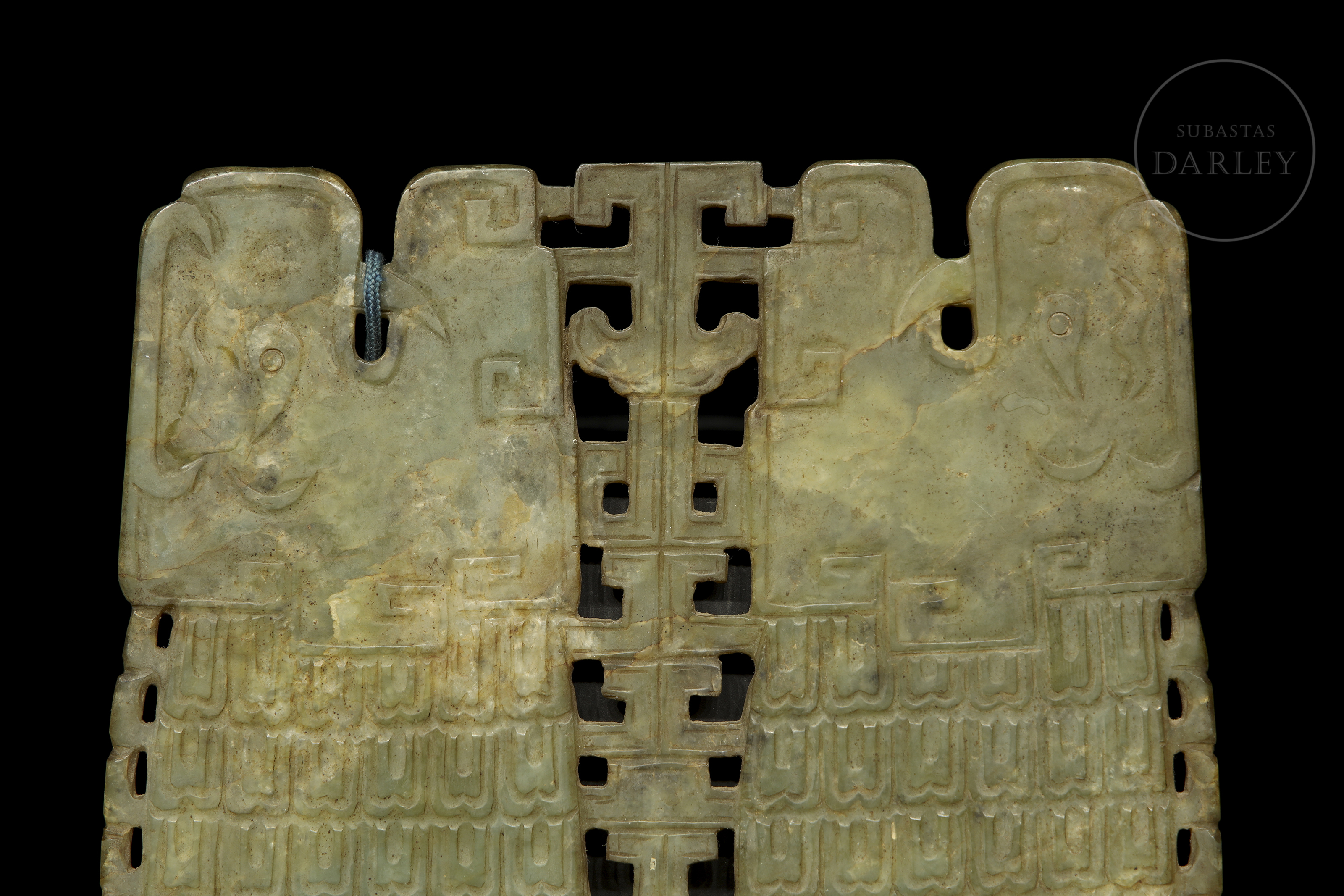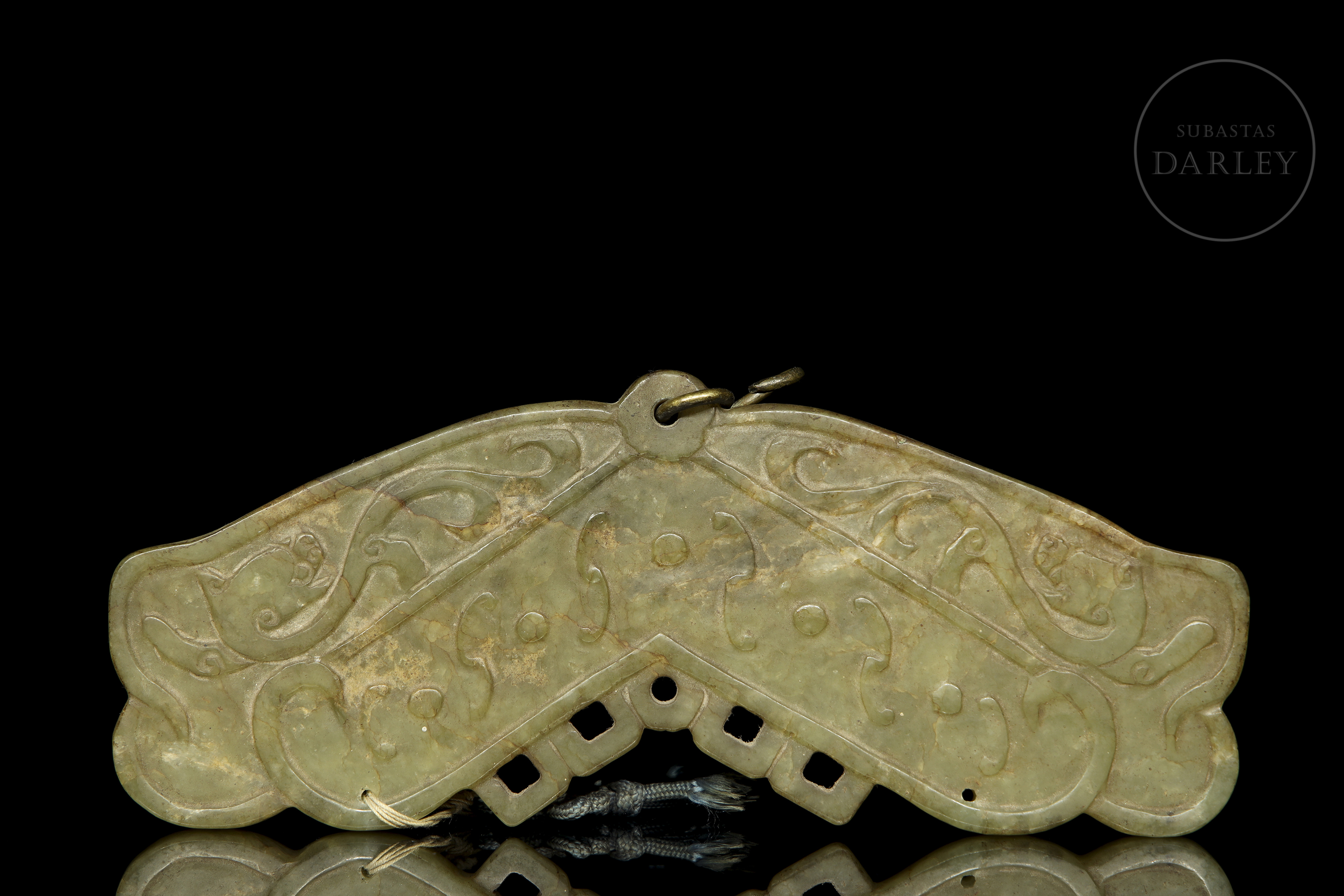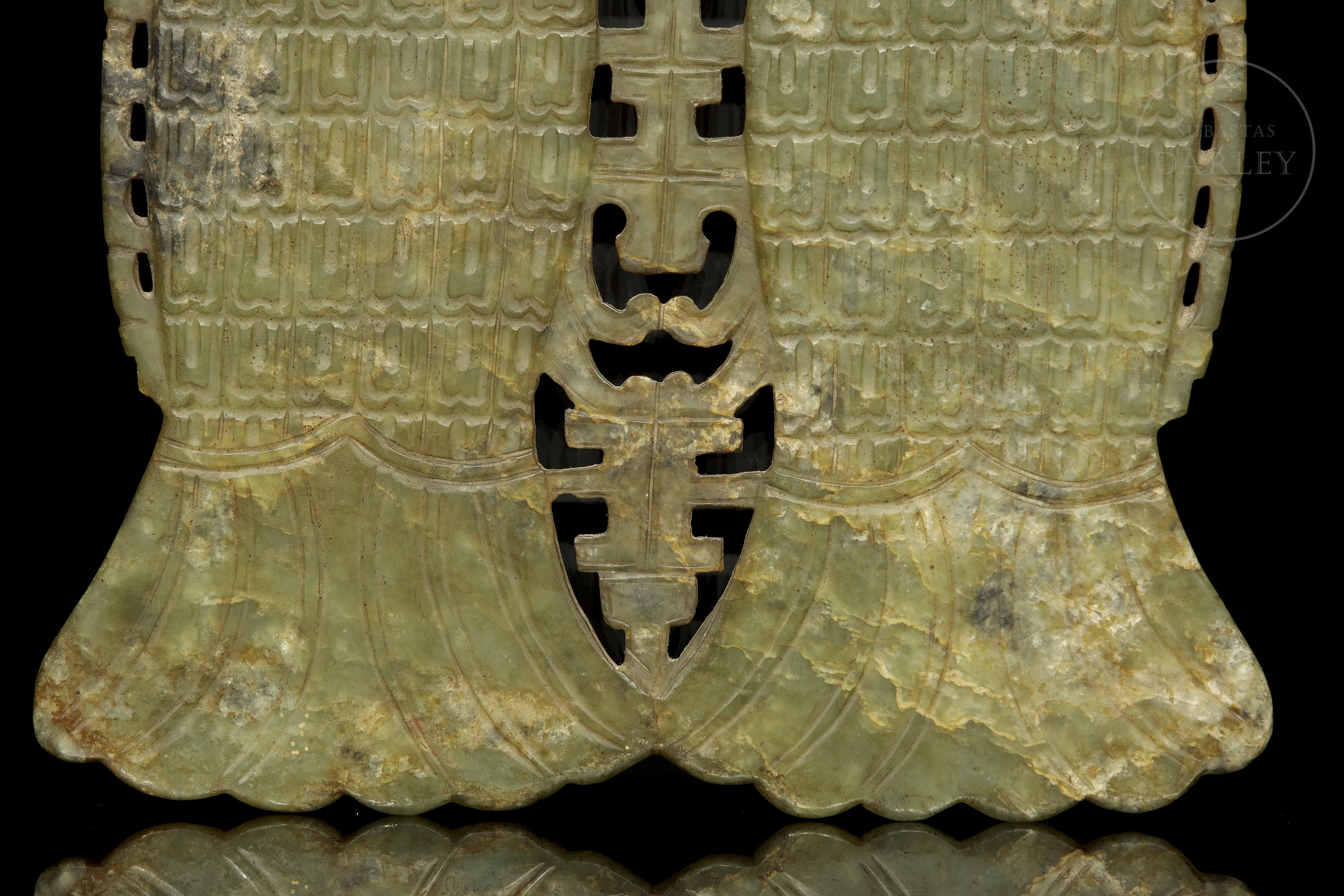 Set of two carved jade plaques of greenish tonality with golden spots. First, there is a large plate carved in the form of two elongated fish with open mouth and intense look, with the body covered with scales and a large flared tail; which are joined in the center by a succession of carved and openwork geometric elements. The upper part is composed by a smaller triangular plate, adorned by relief motifs of small sinuous and elongated dragons, pearls and scrolls.
