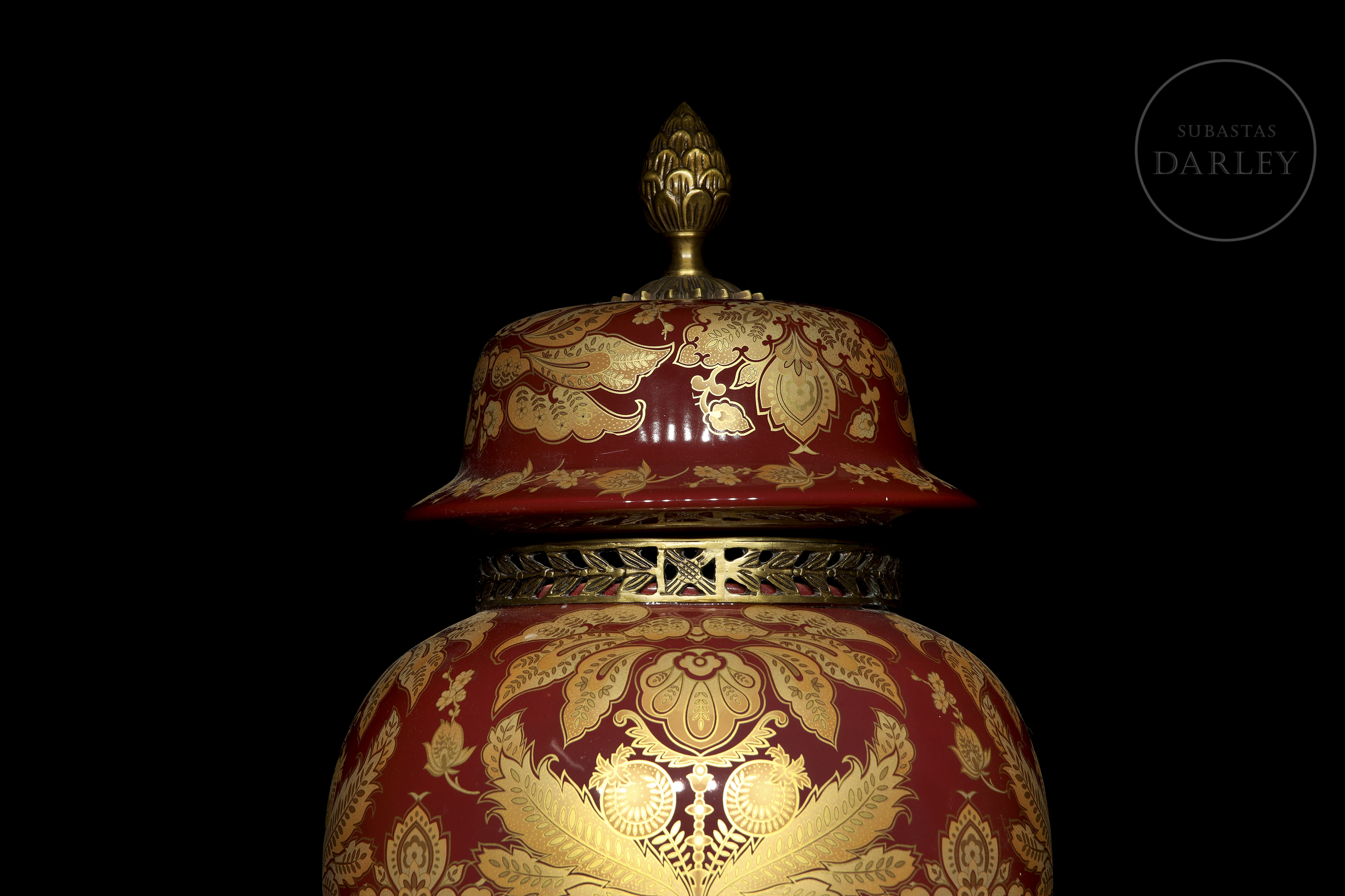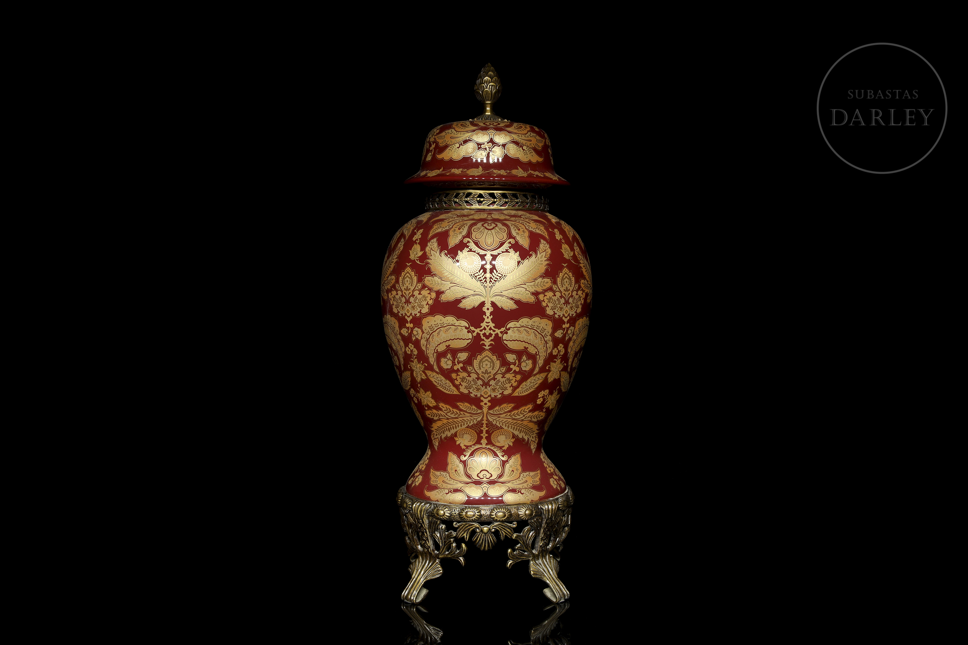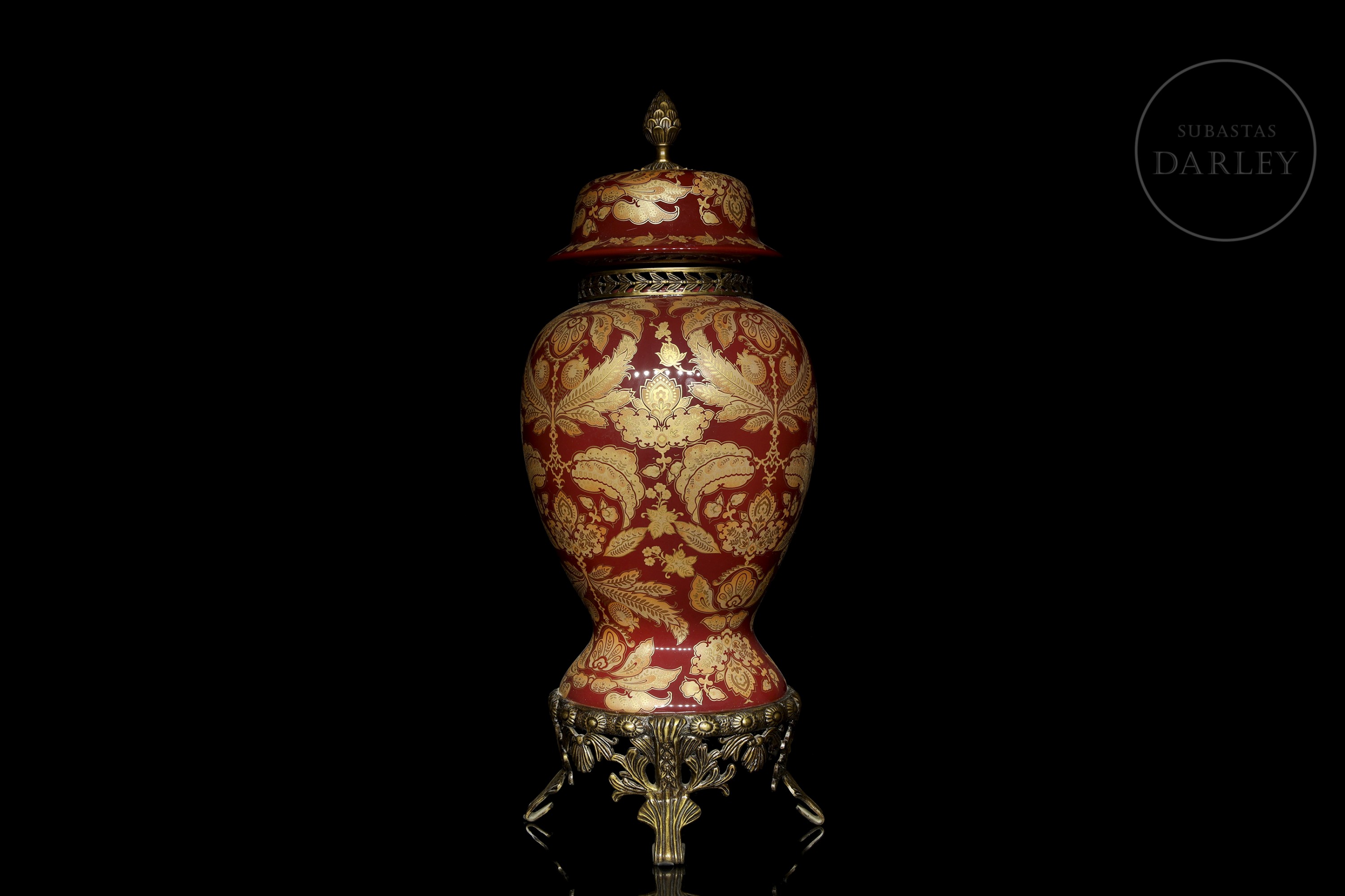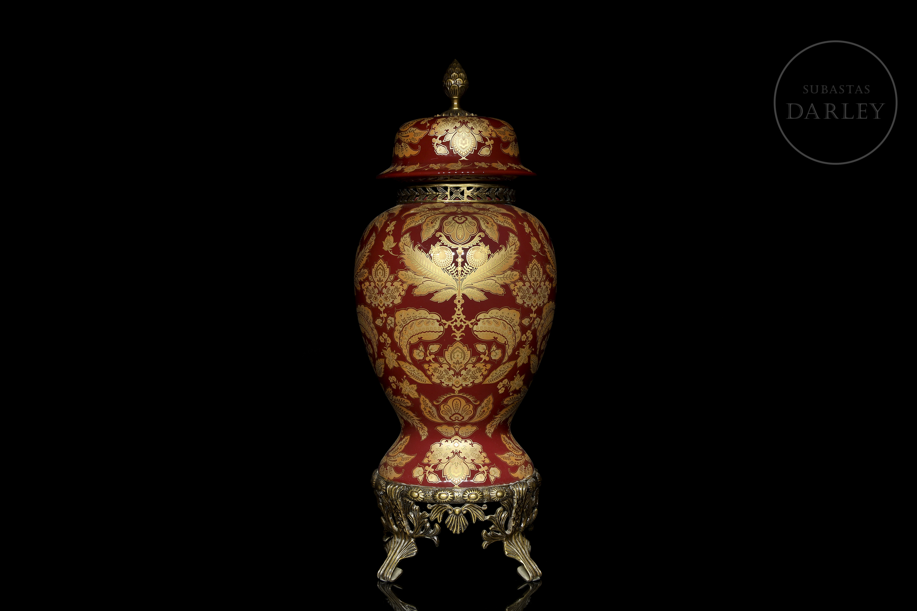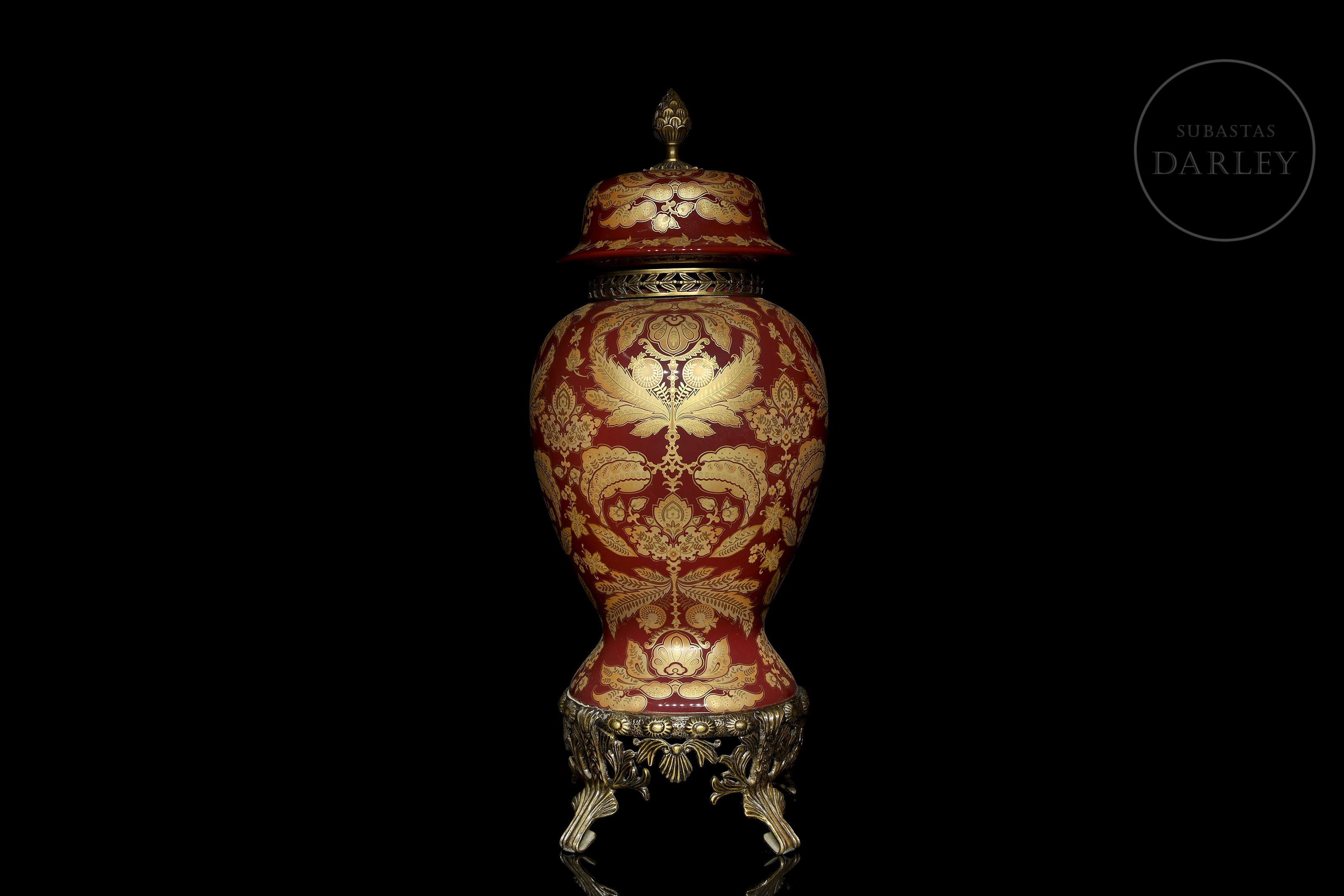 A large porcelain vase with a lid. It is decorated in gilding on a maroon background, with numerous floral and vegetal motifs. As a support, there is a four-legged metal base on which the vase rests, and an upper ring that holds the lid, both in a floral aesthetic and in the shape of leaves.
