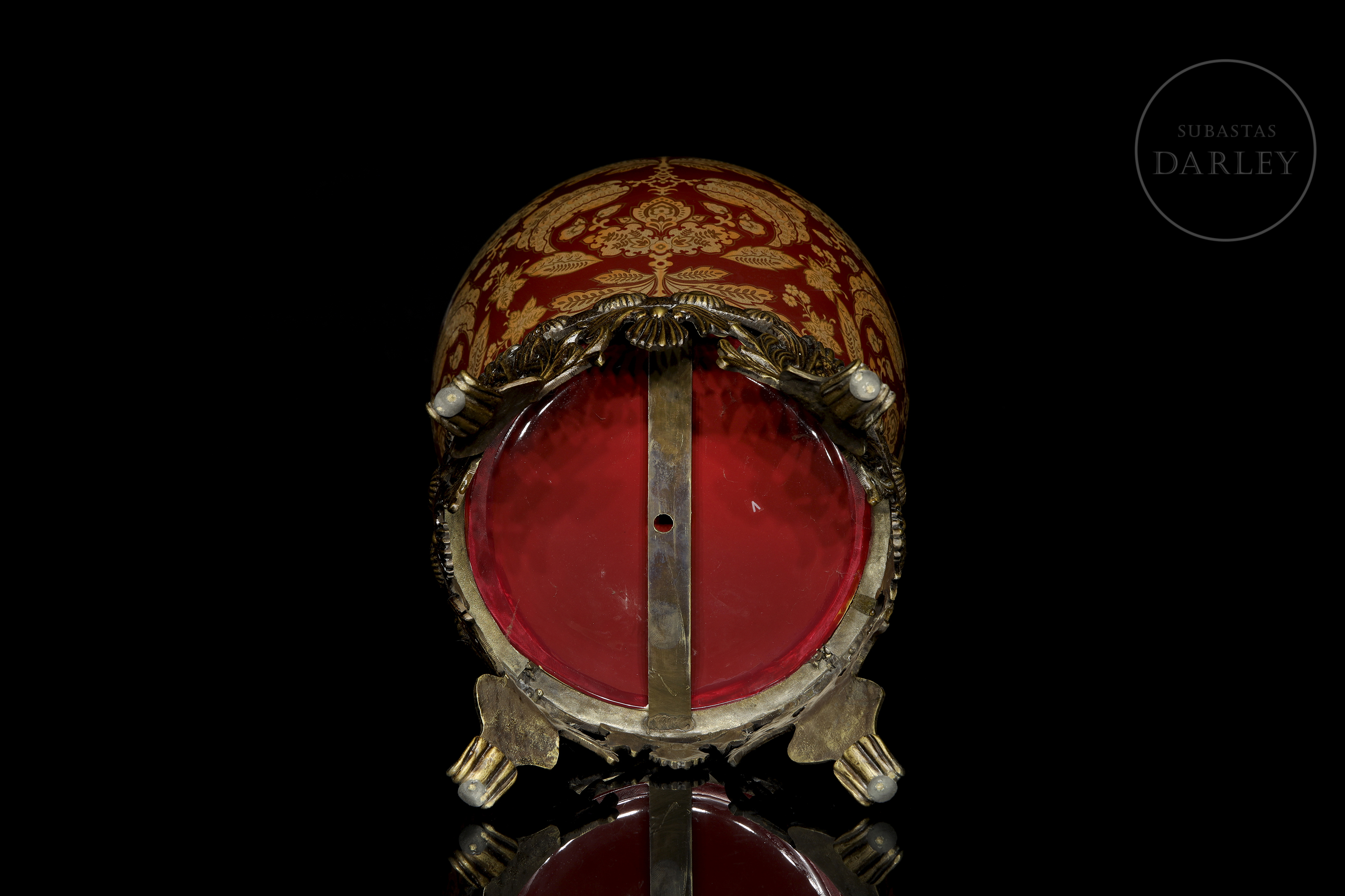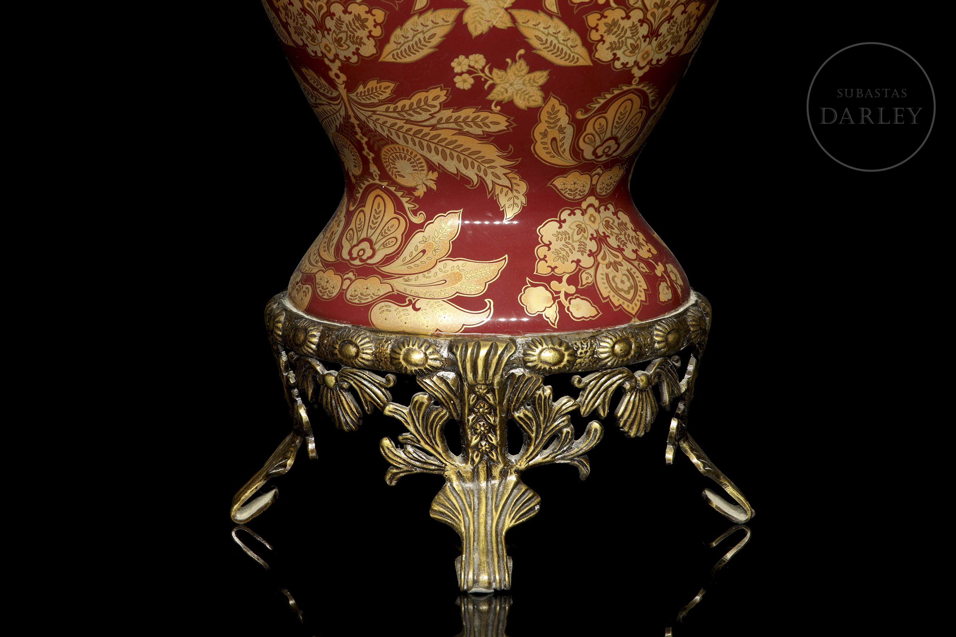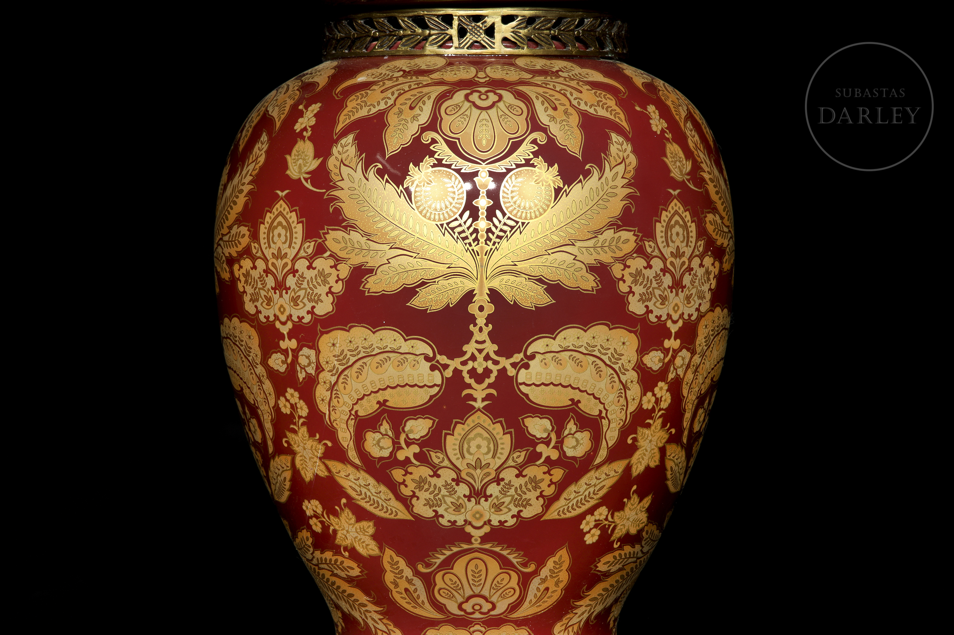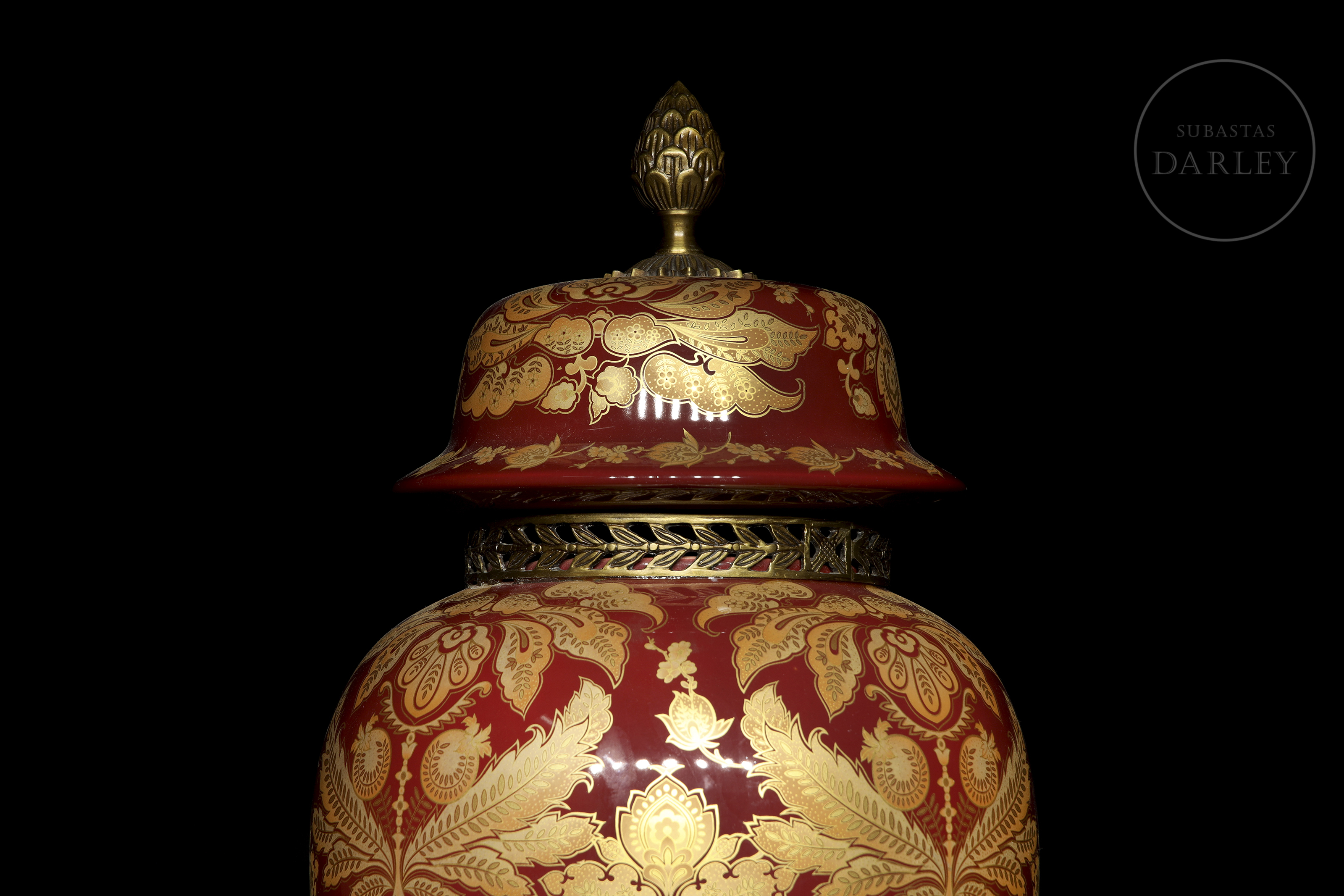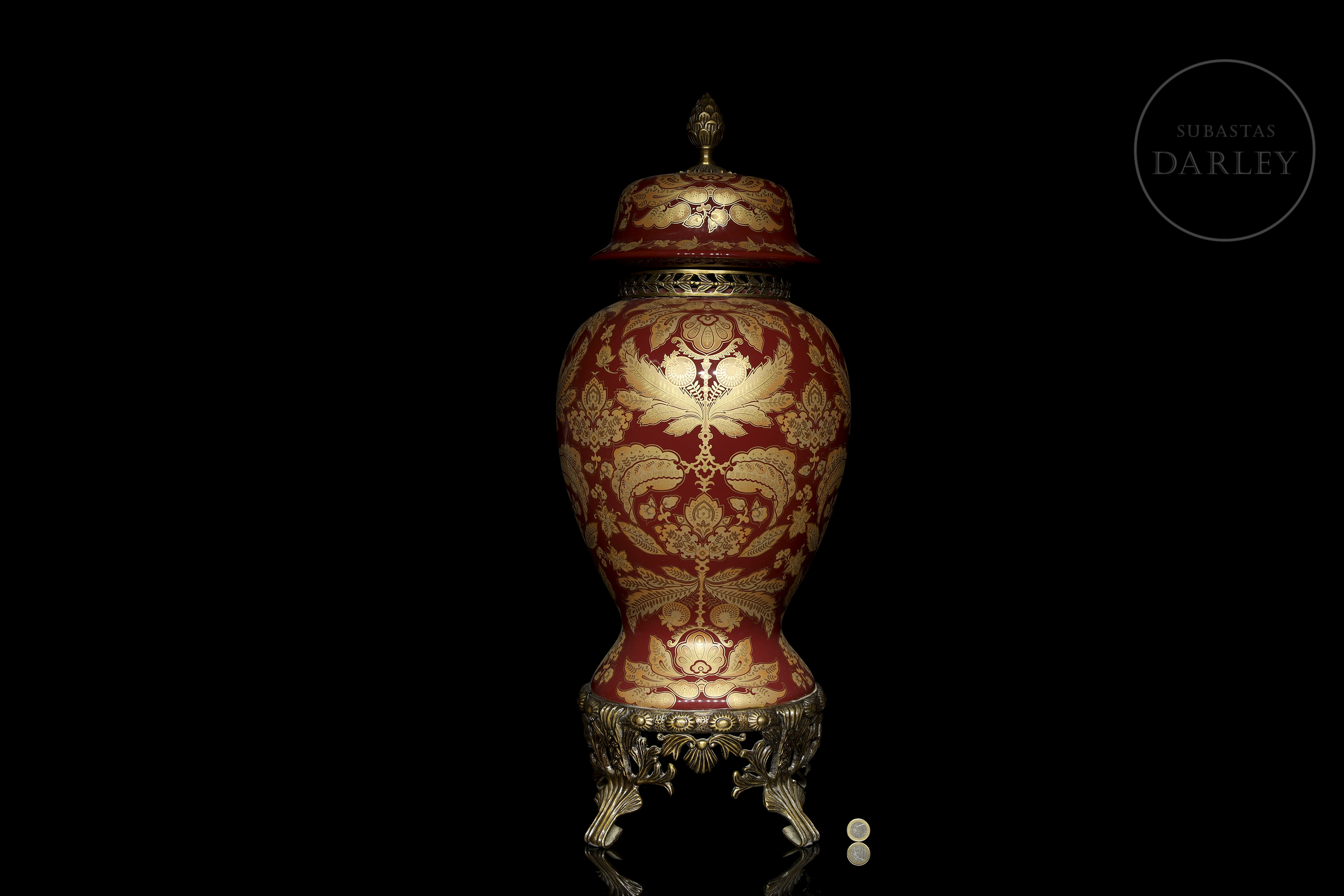 A large porcelain vase with a lid. It is decorated in gilding on a maroon background, with numerous floral and vegetal motifs. As a support, there is a four-legged metal base on which the vase rests, and an upper ring that holds the lid, both in a floral aesthetic and in the shape of leaves.