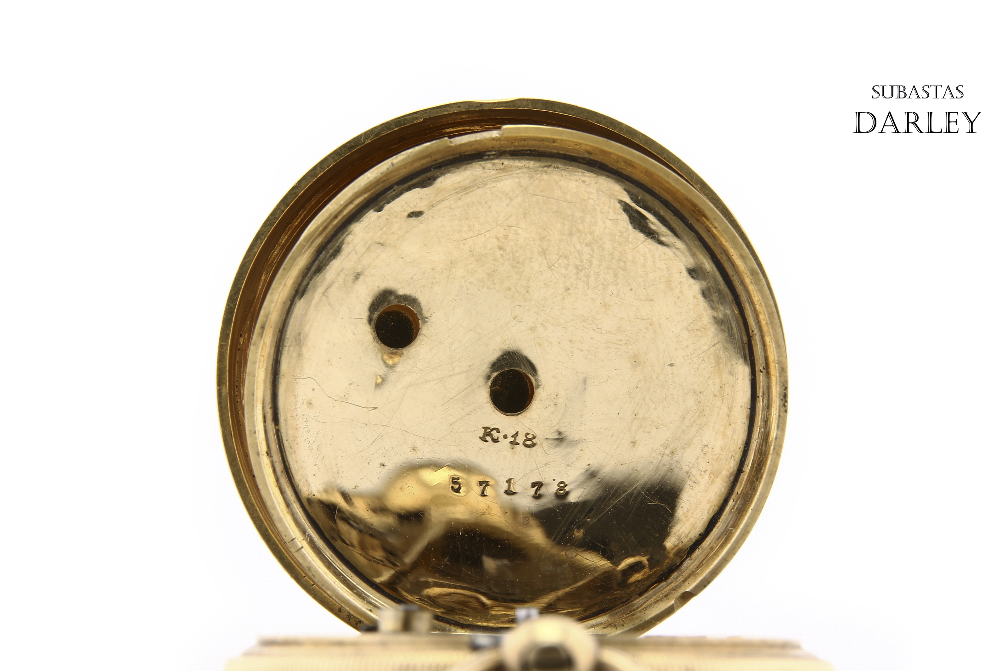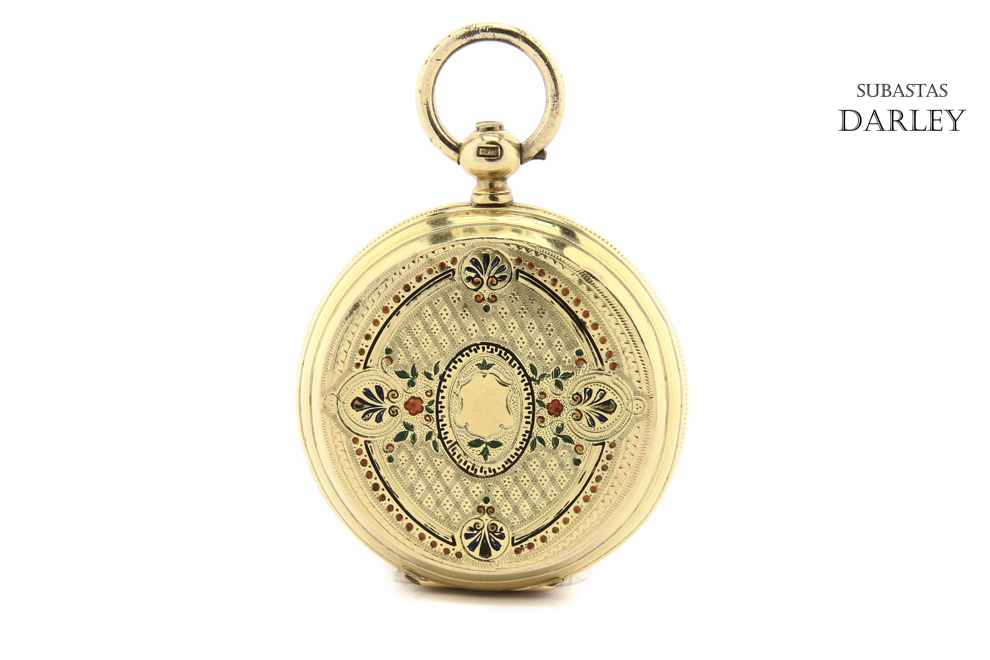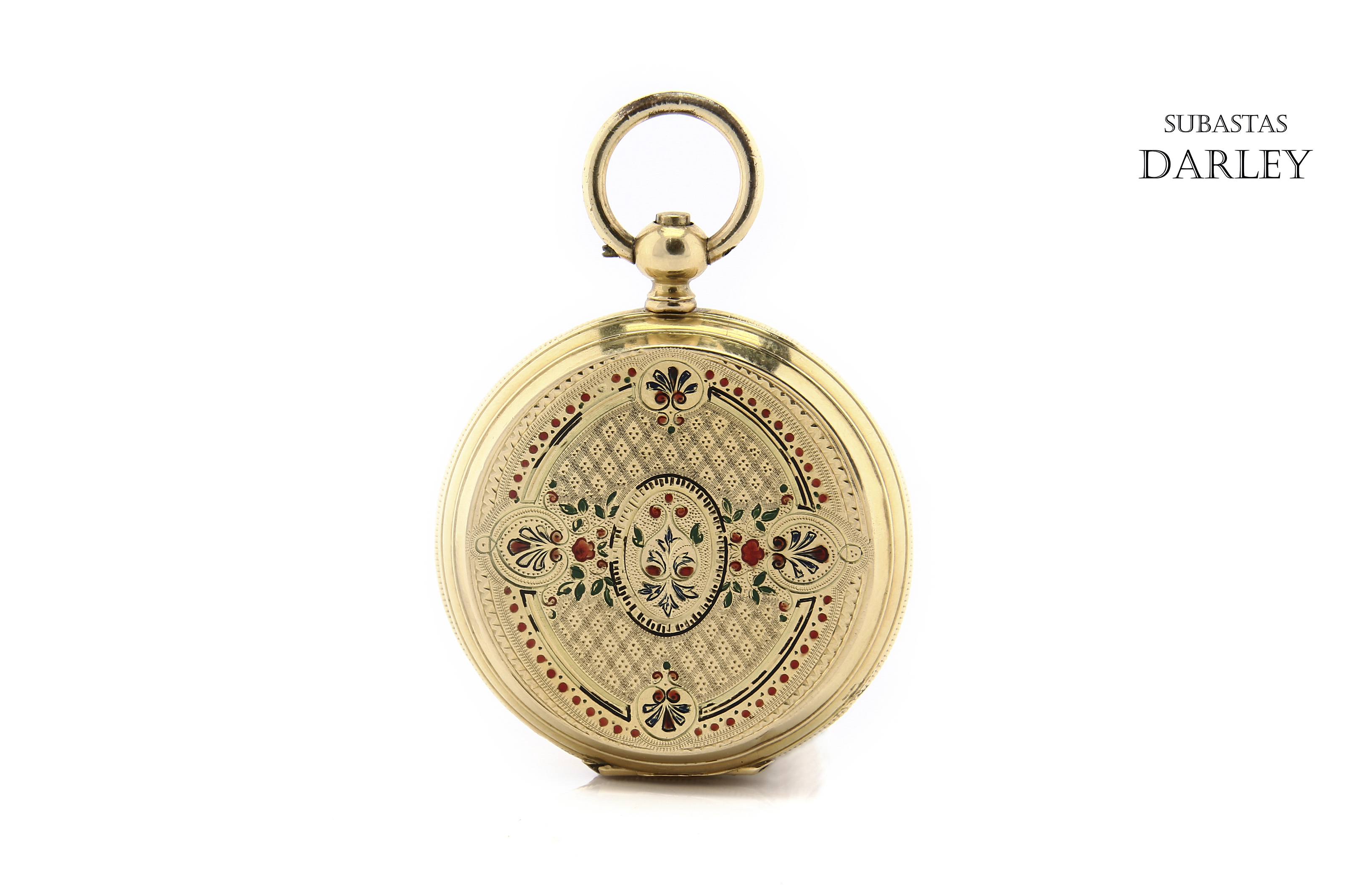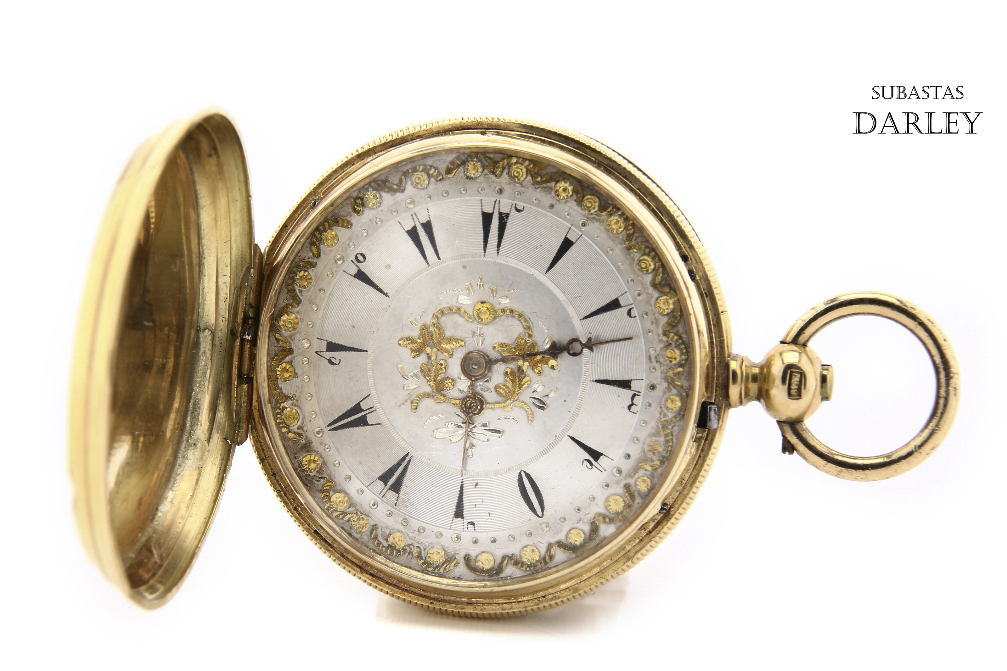 Pocket watch with lid. Engraved metal dial with gold decoration. The hours are indicated in black. On the inside of the lid is engraved: 18k. On the inner cover is engraved on the obverse: Cylindre/ Huit Rubis/ Lebet Geneve/ nº 104976.