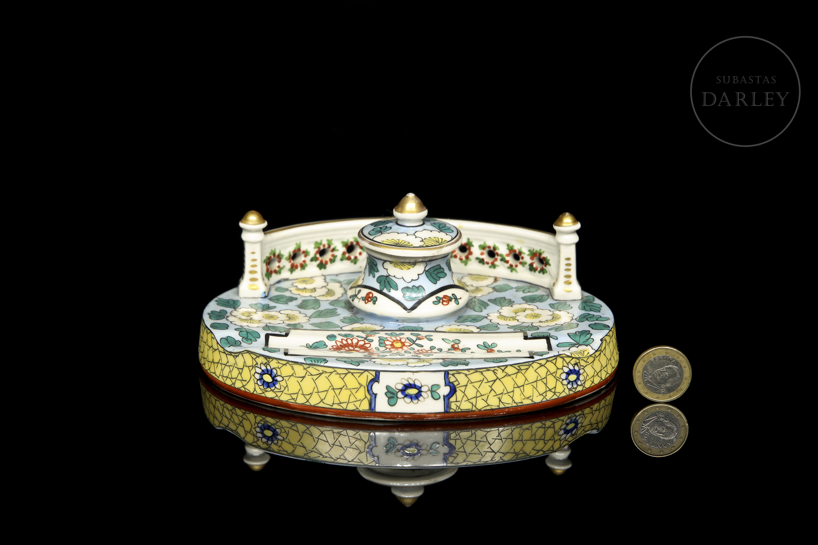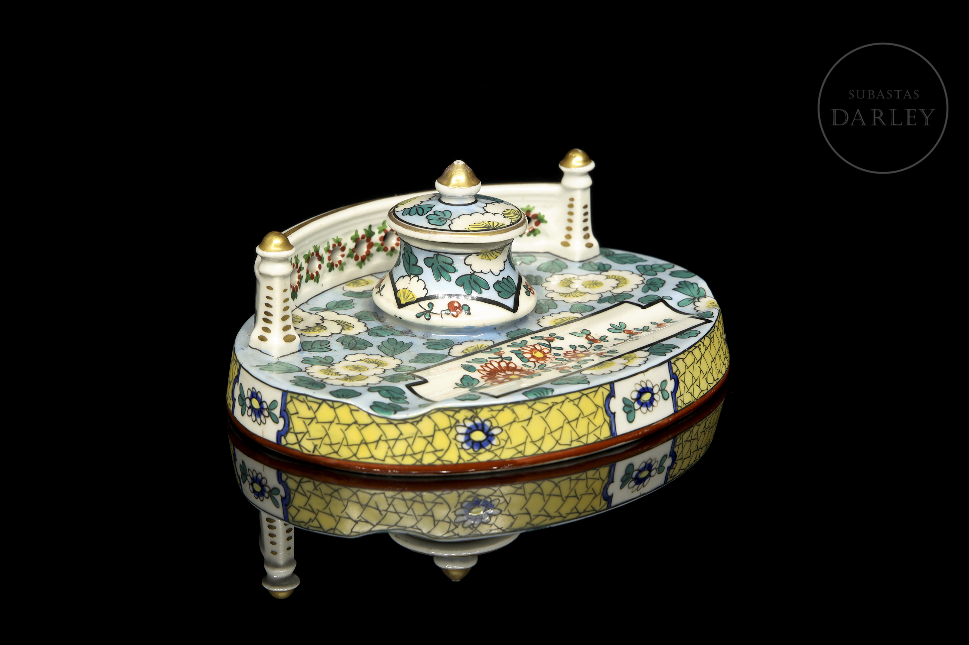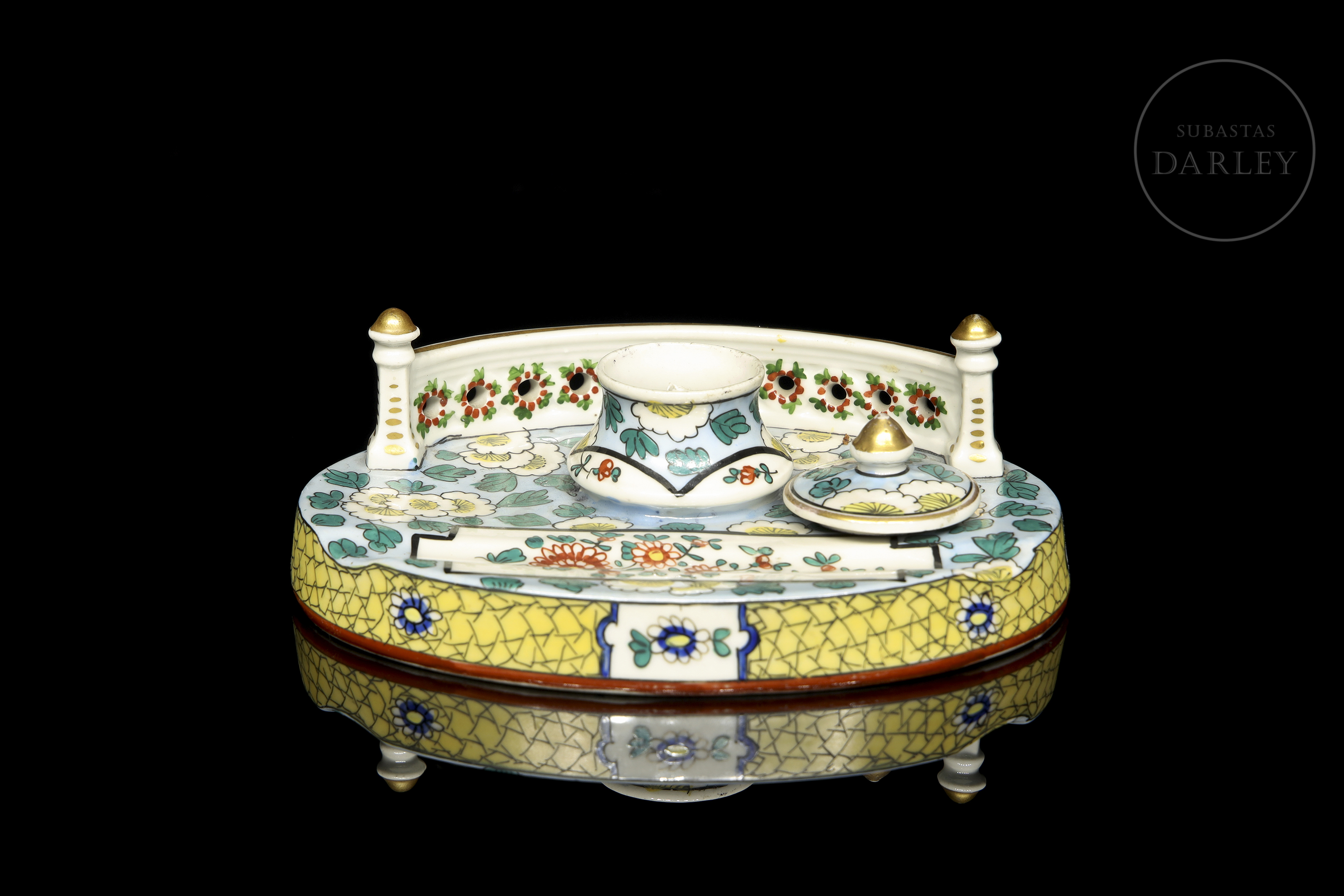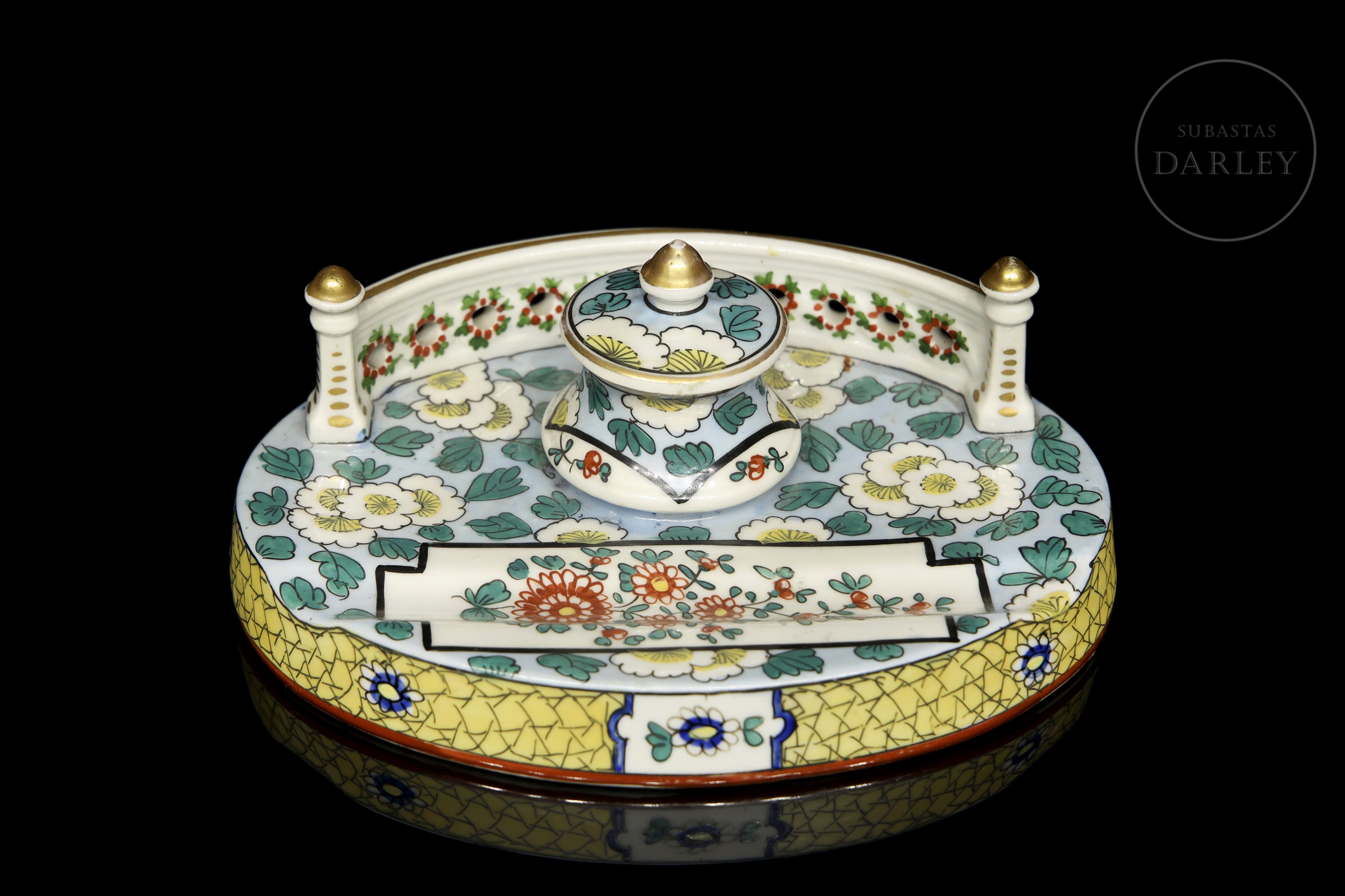 Limoges porcelain writing desk with inkwell and pen stand. The decoration follows a floral theme simulating a balcony or garden. On the lower part there is an identifying Limoges stamp. In good condition.