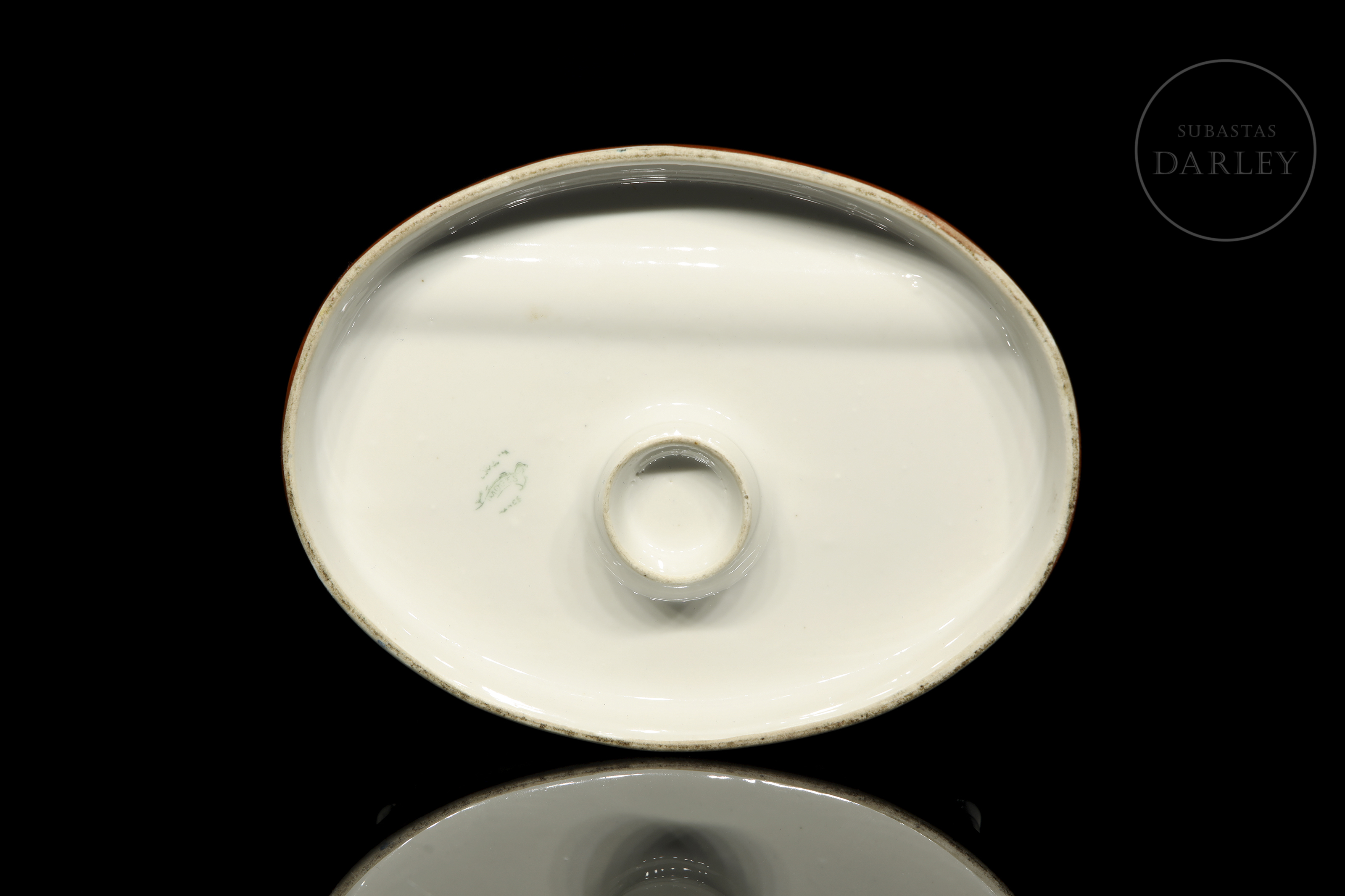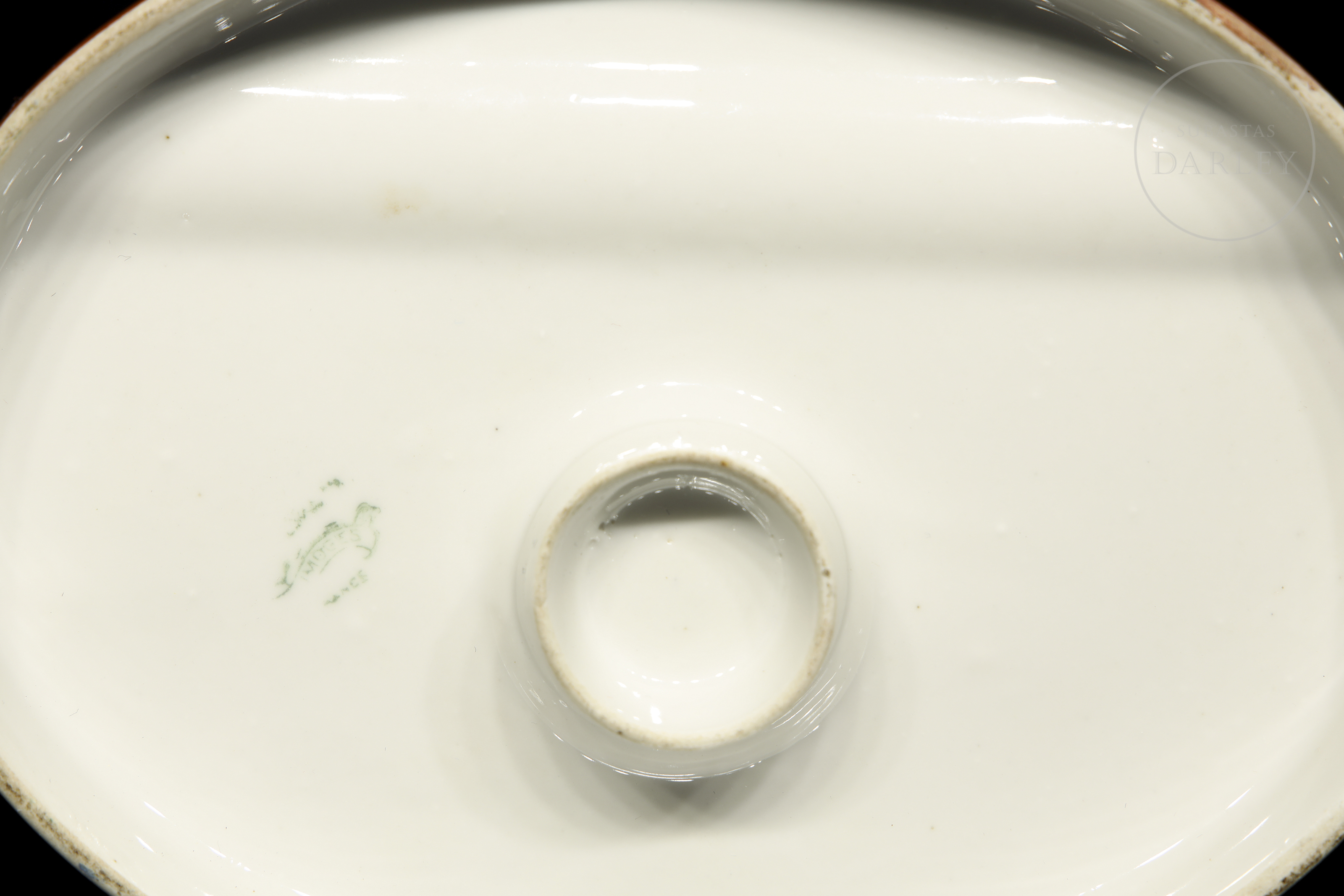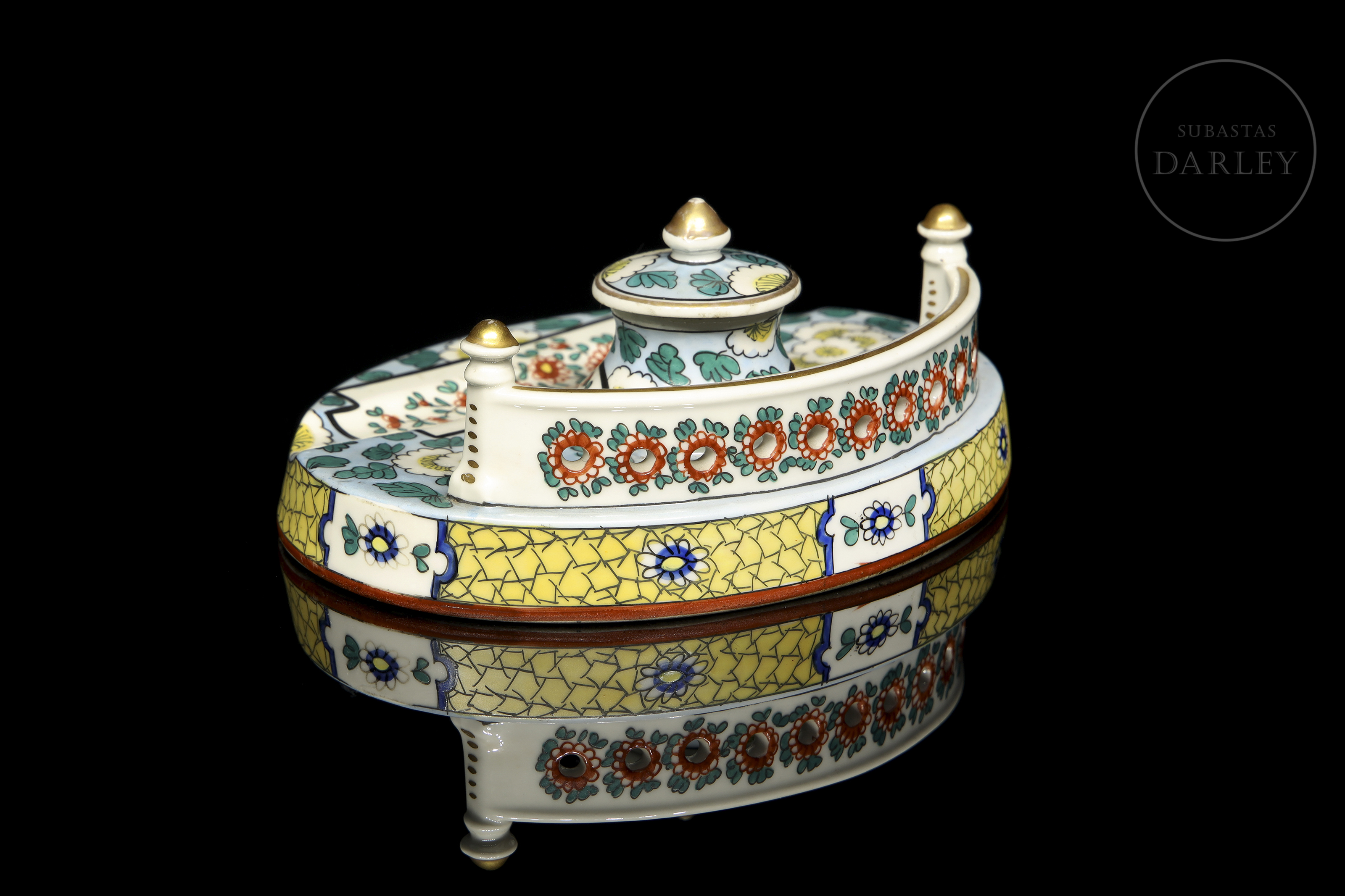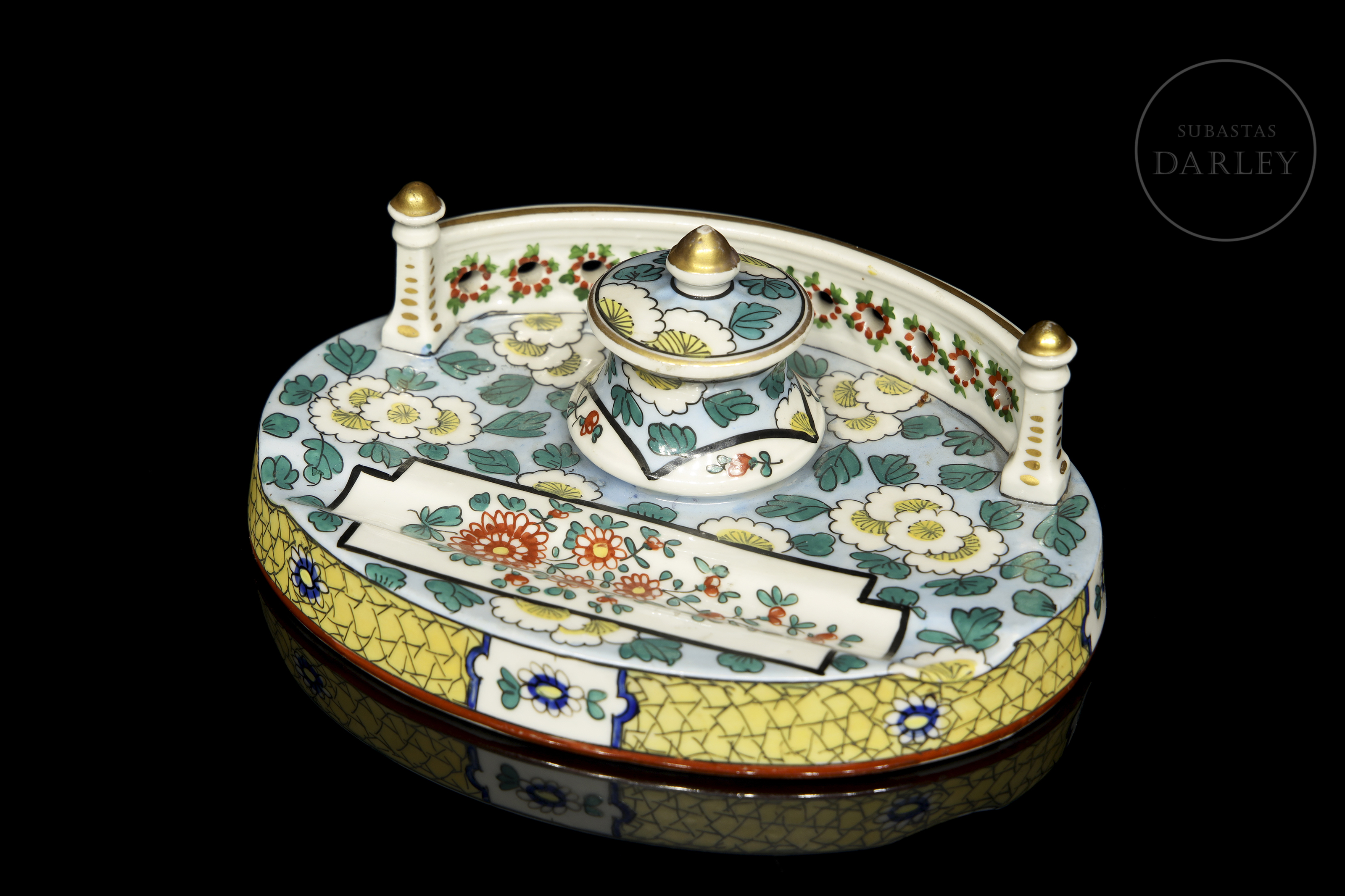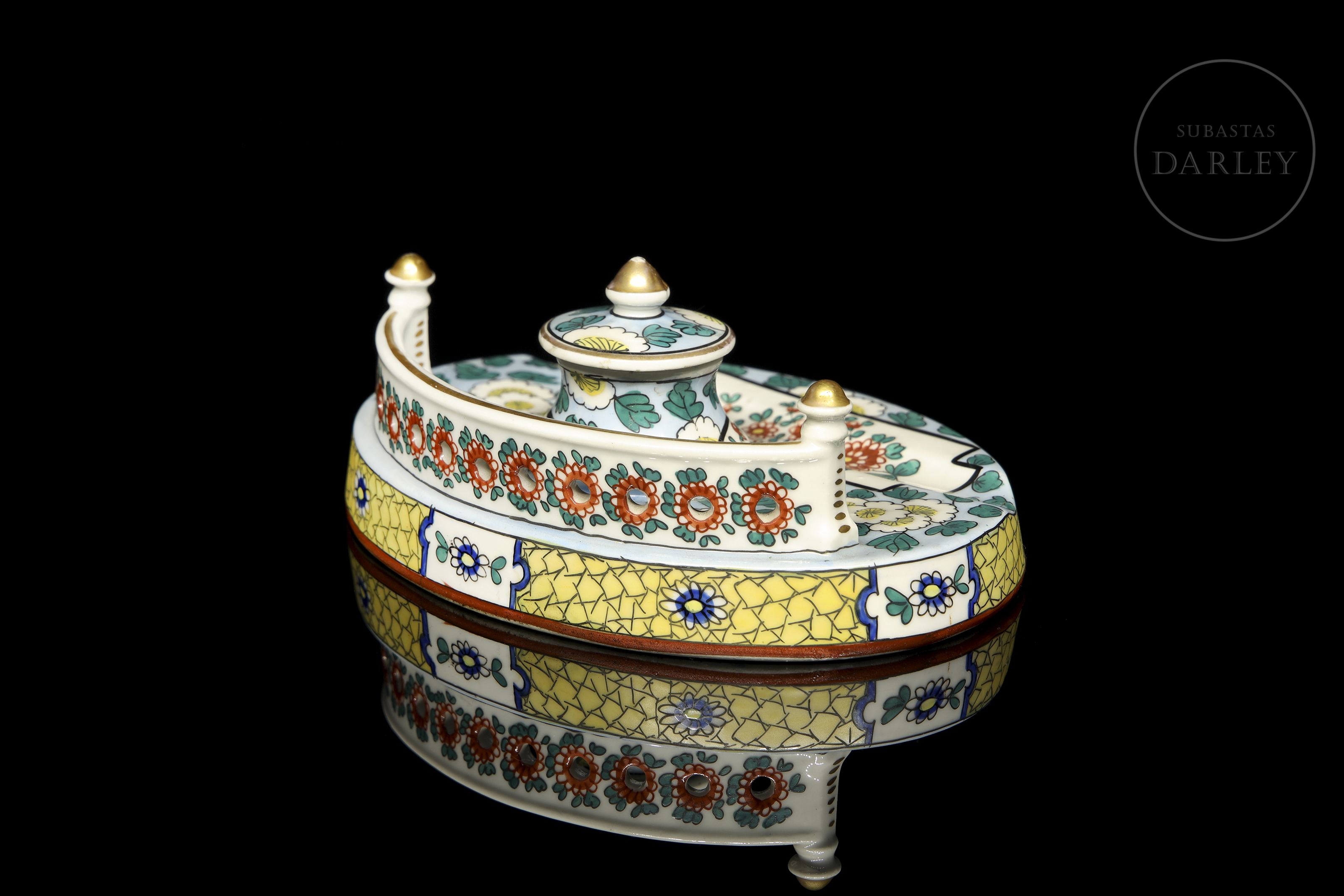 Limoges porcelain writing desk with inkwell and pen stand. The decoration follows a floral theme simulating a balcony or garden. On the lower part there is an identifying Limoges stamp. In good condition.
