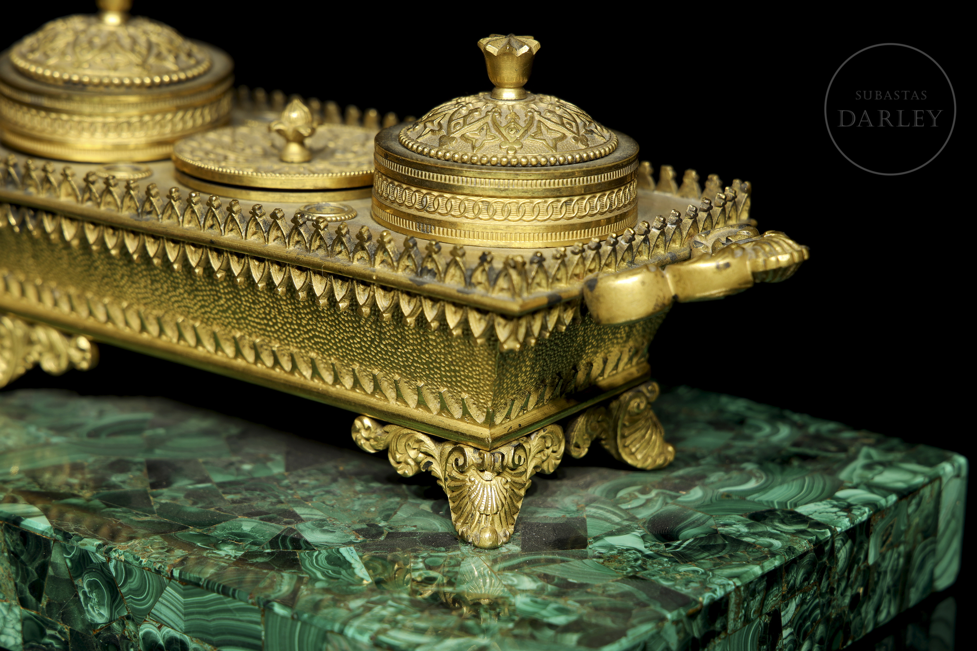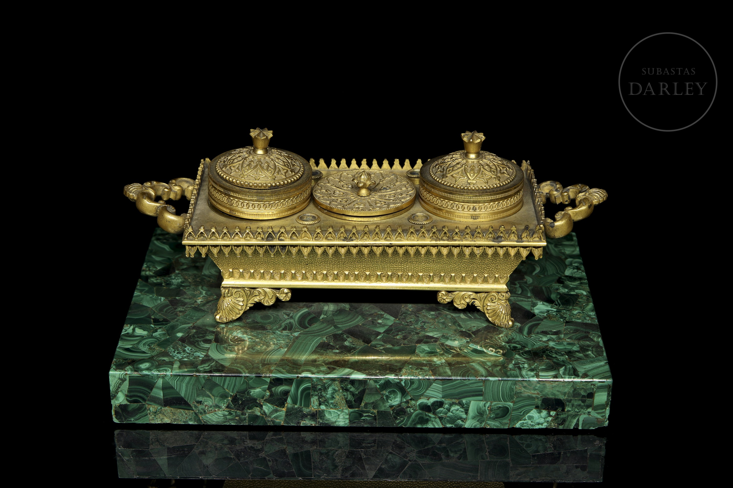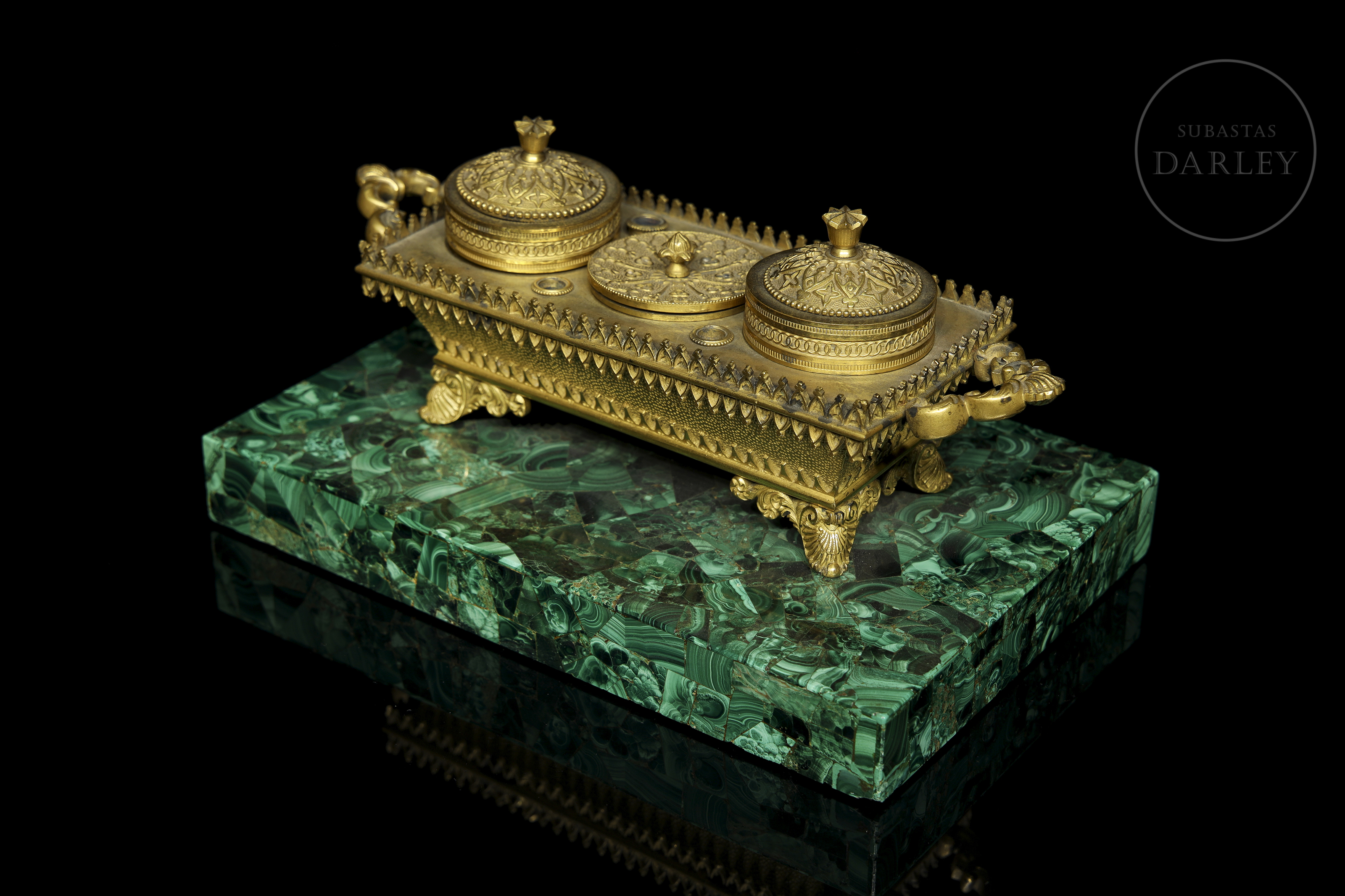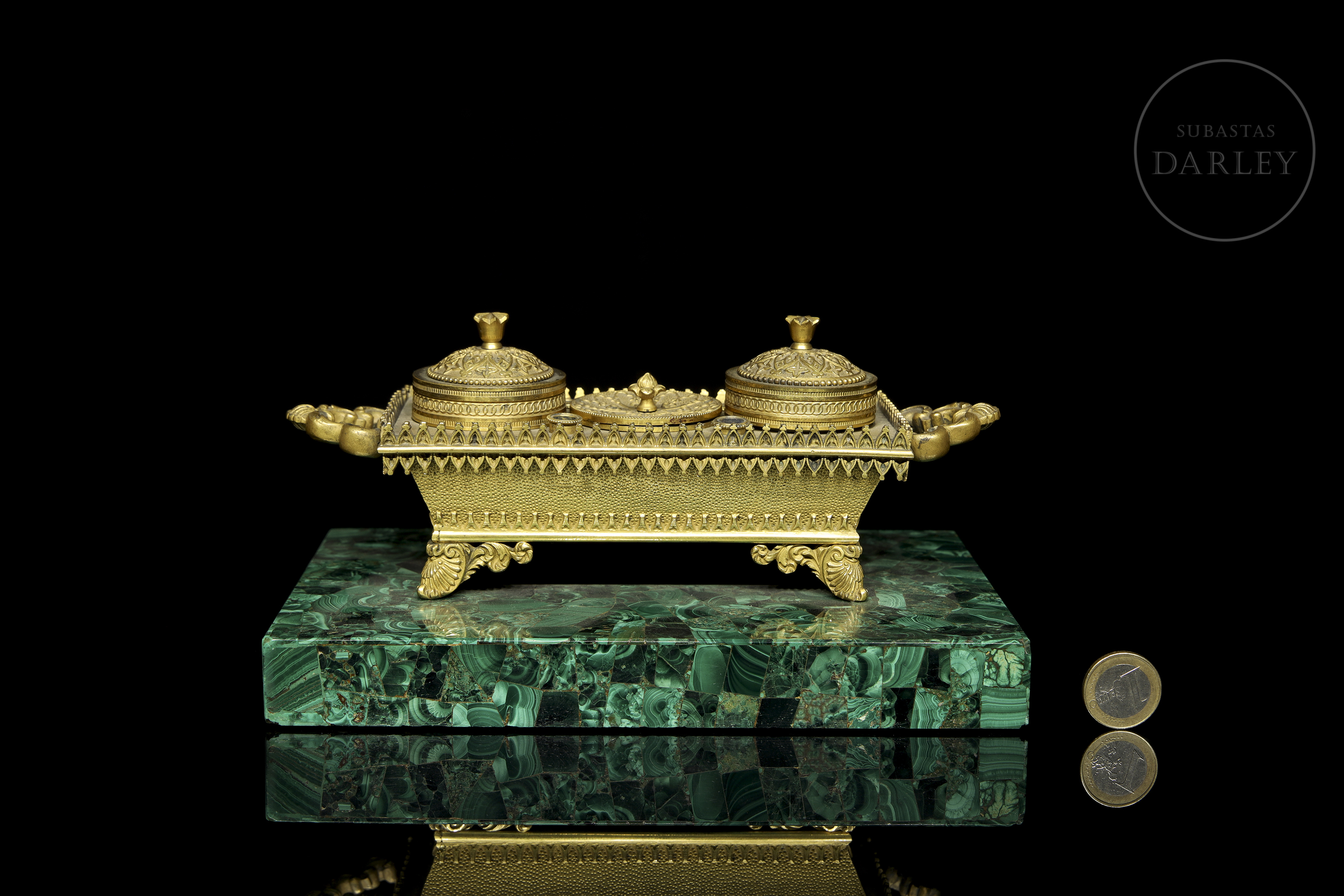 A gilt-finished metal writing desk with a double glass inkwell. Exalted piece on a green malachite base, in the Louis XIV style. In good condition, with wear due to age. No stamp or maker's markings visible.