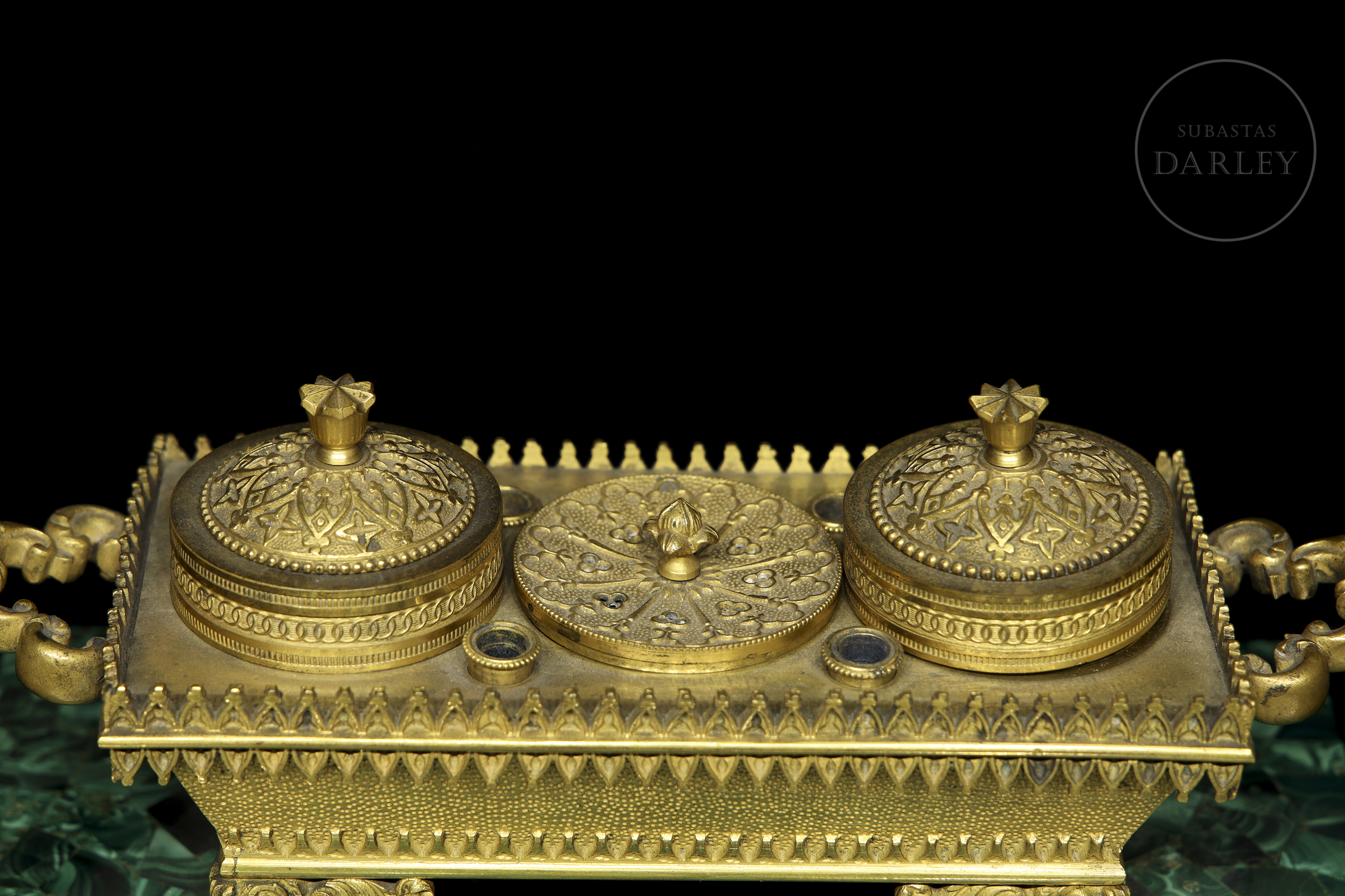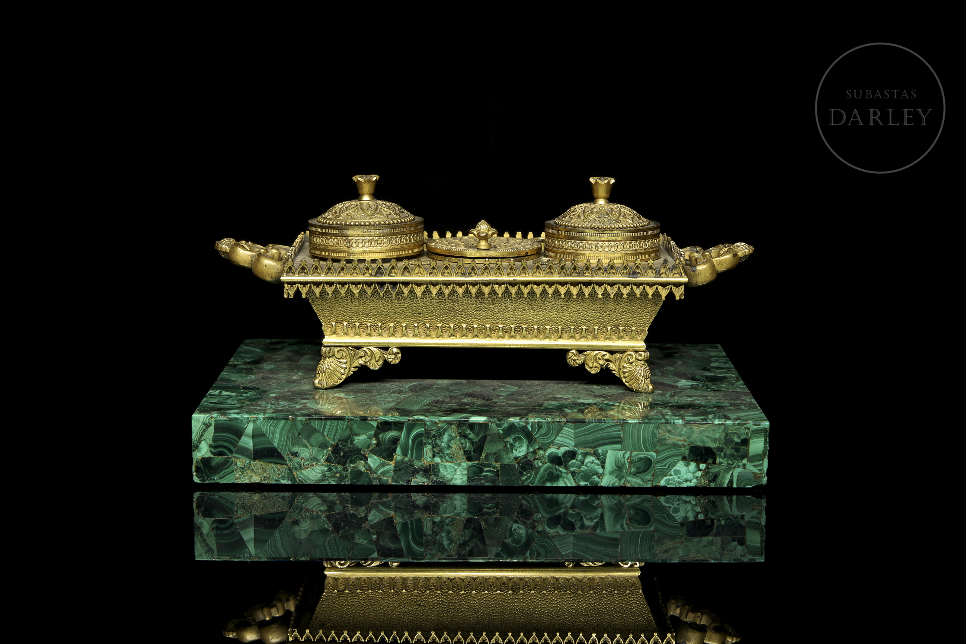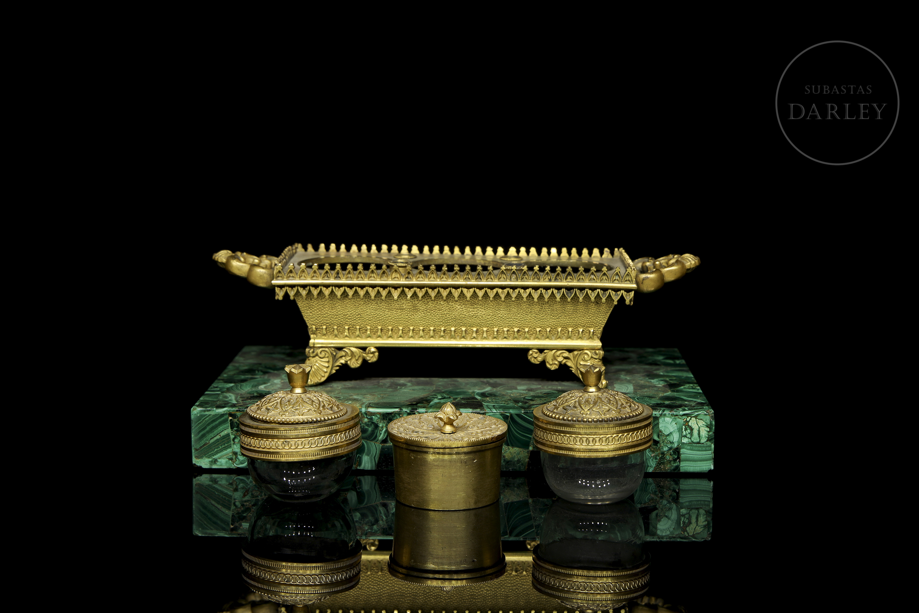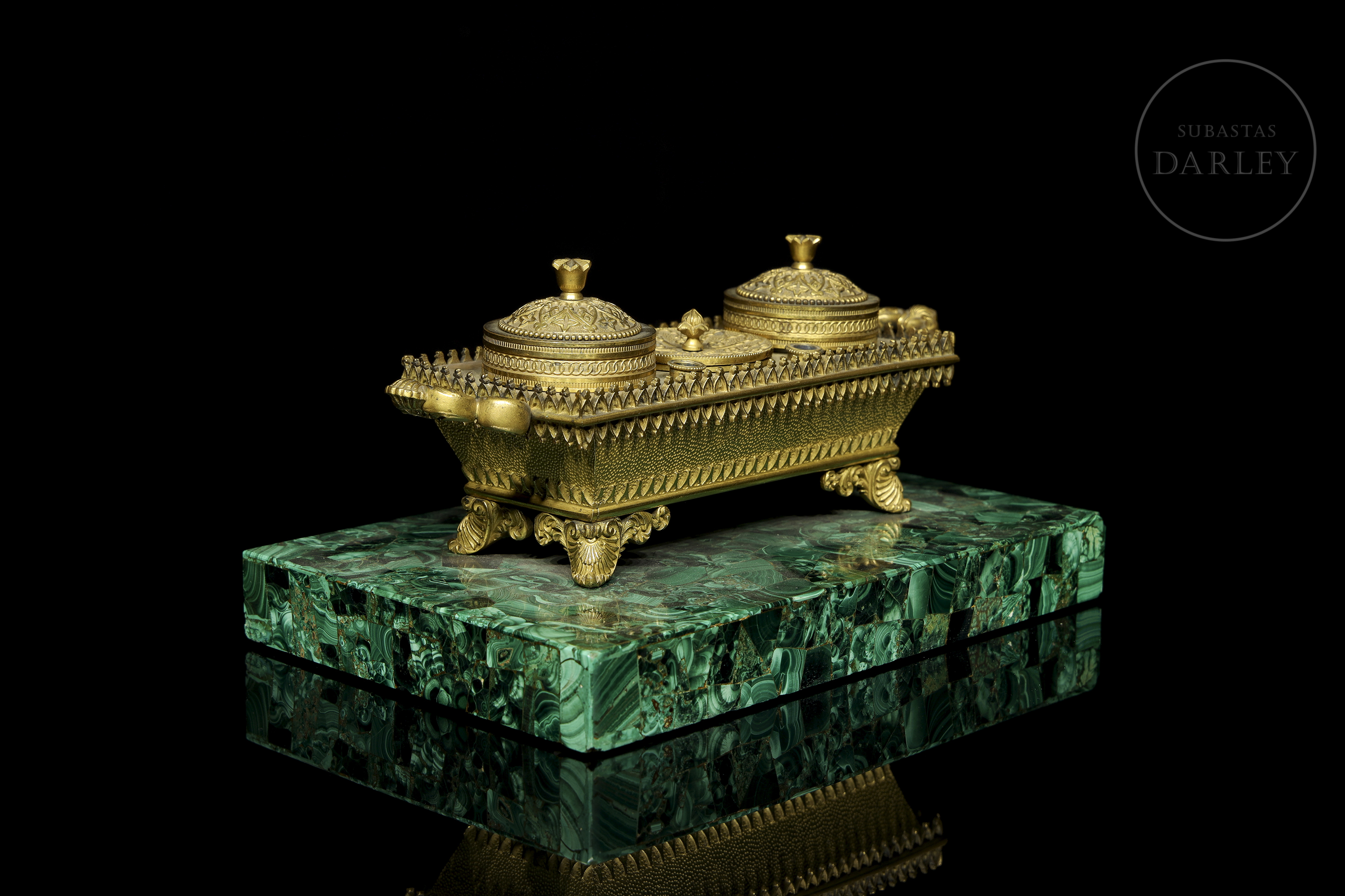 A gilt-finished metal writing desk with a double glass inkwell. Exalted piece on a green malachite base, in the Louis XIV style. In good condition, with wear due to age. No stamp or maker's markings visible.