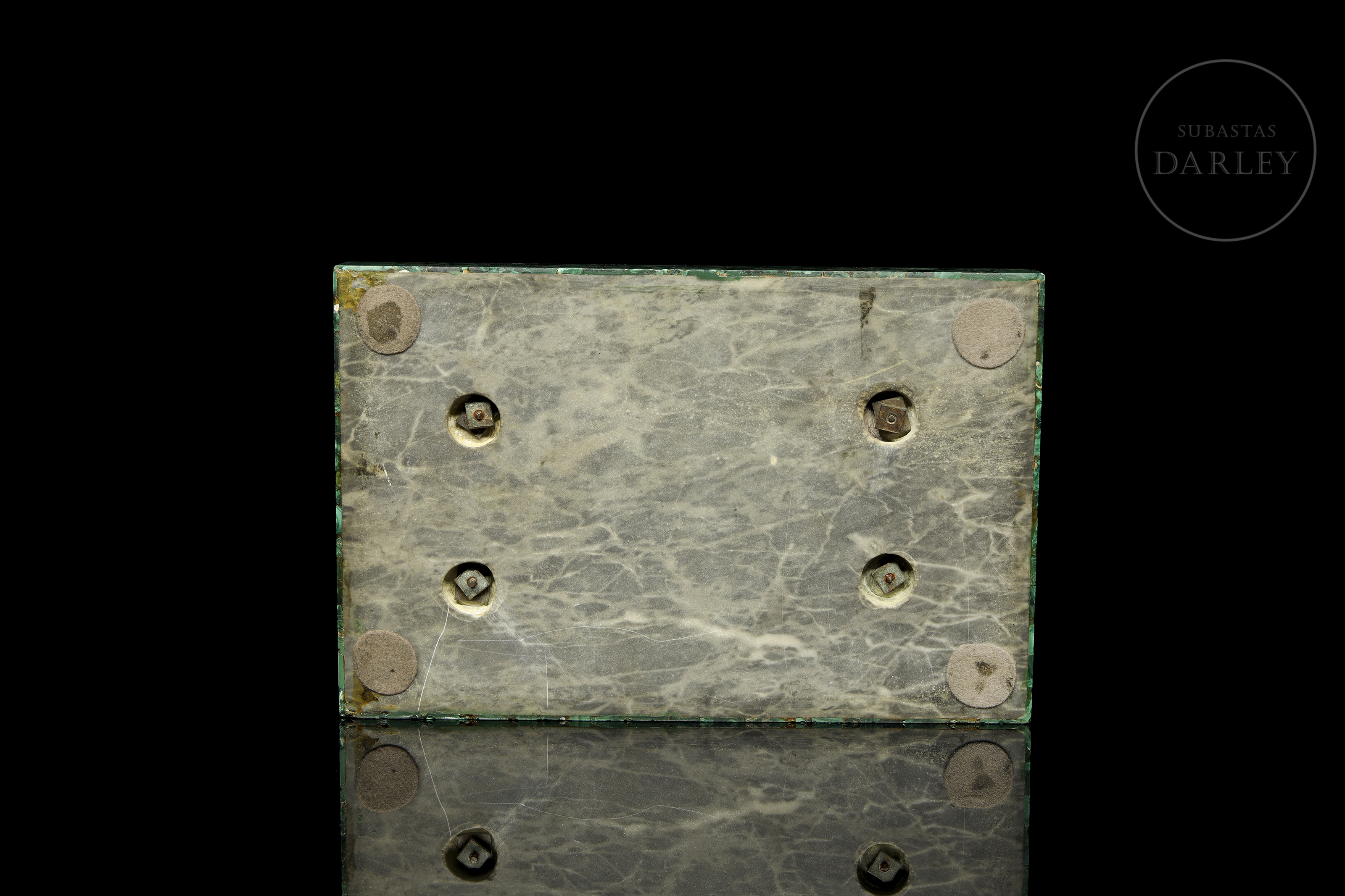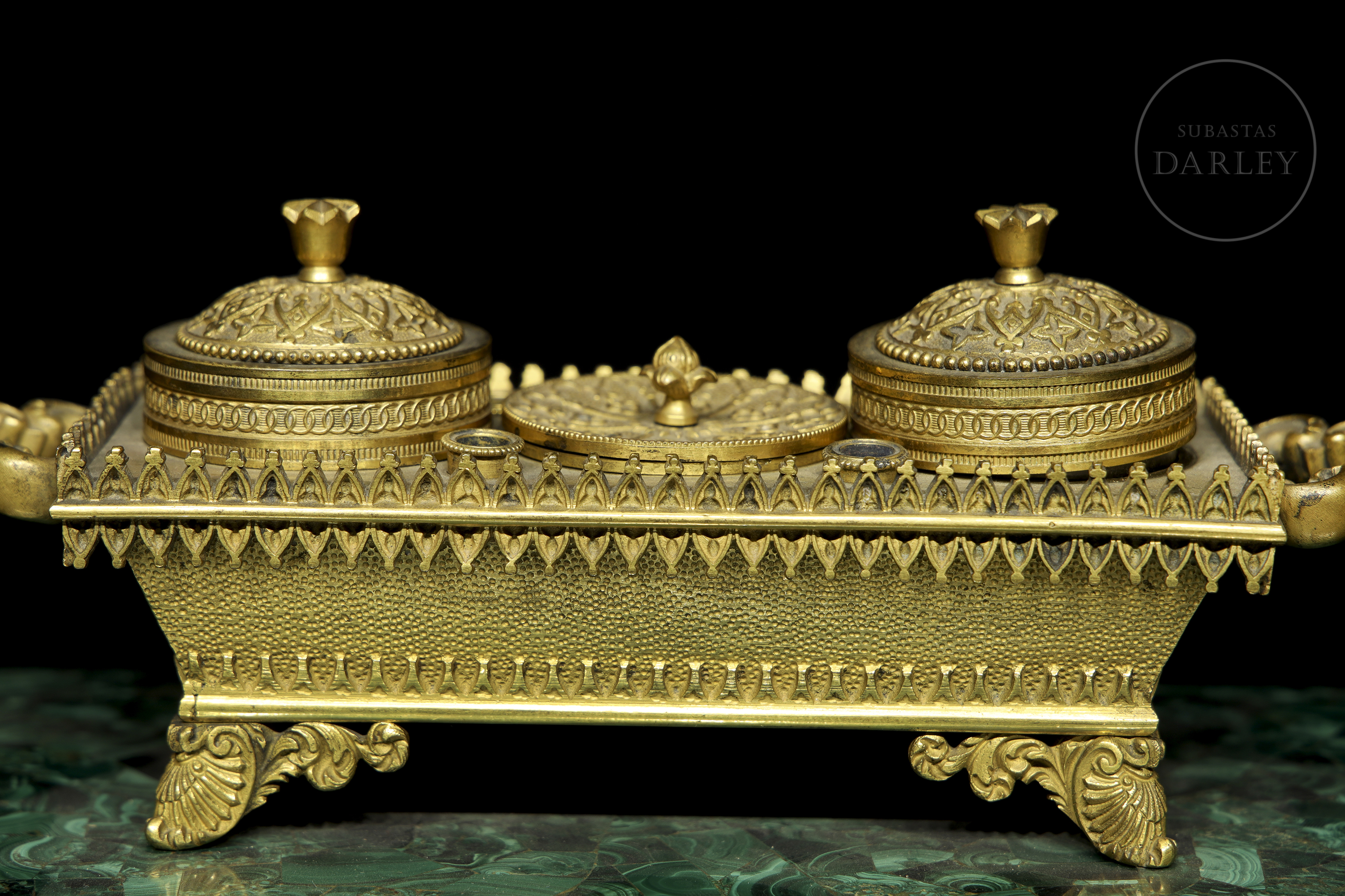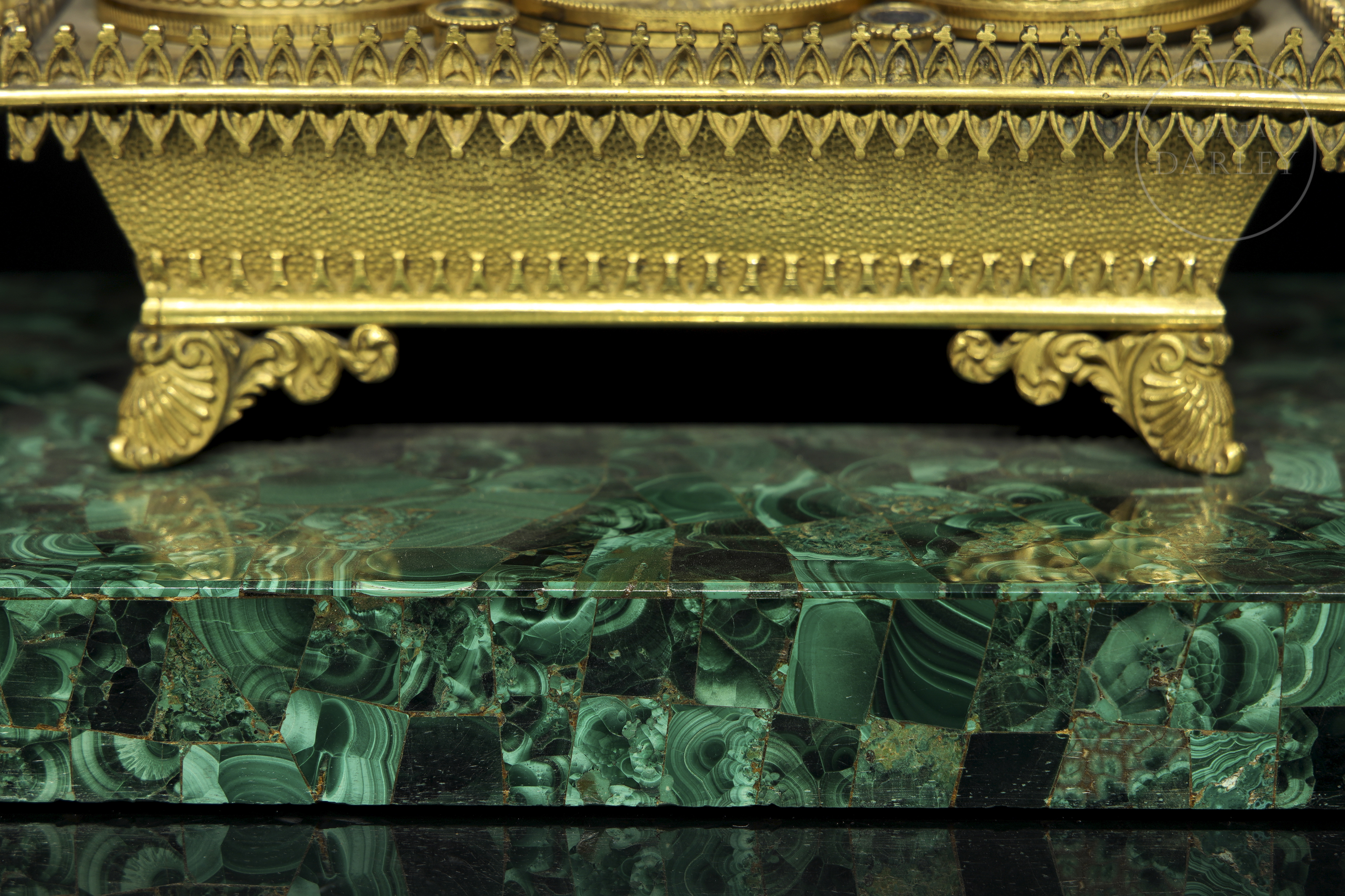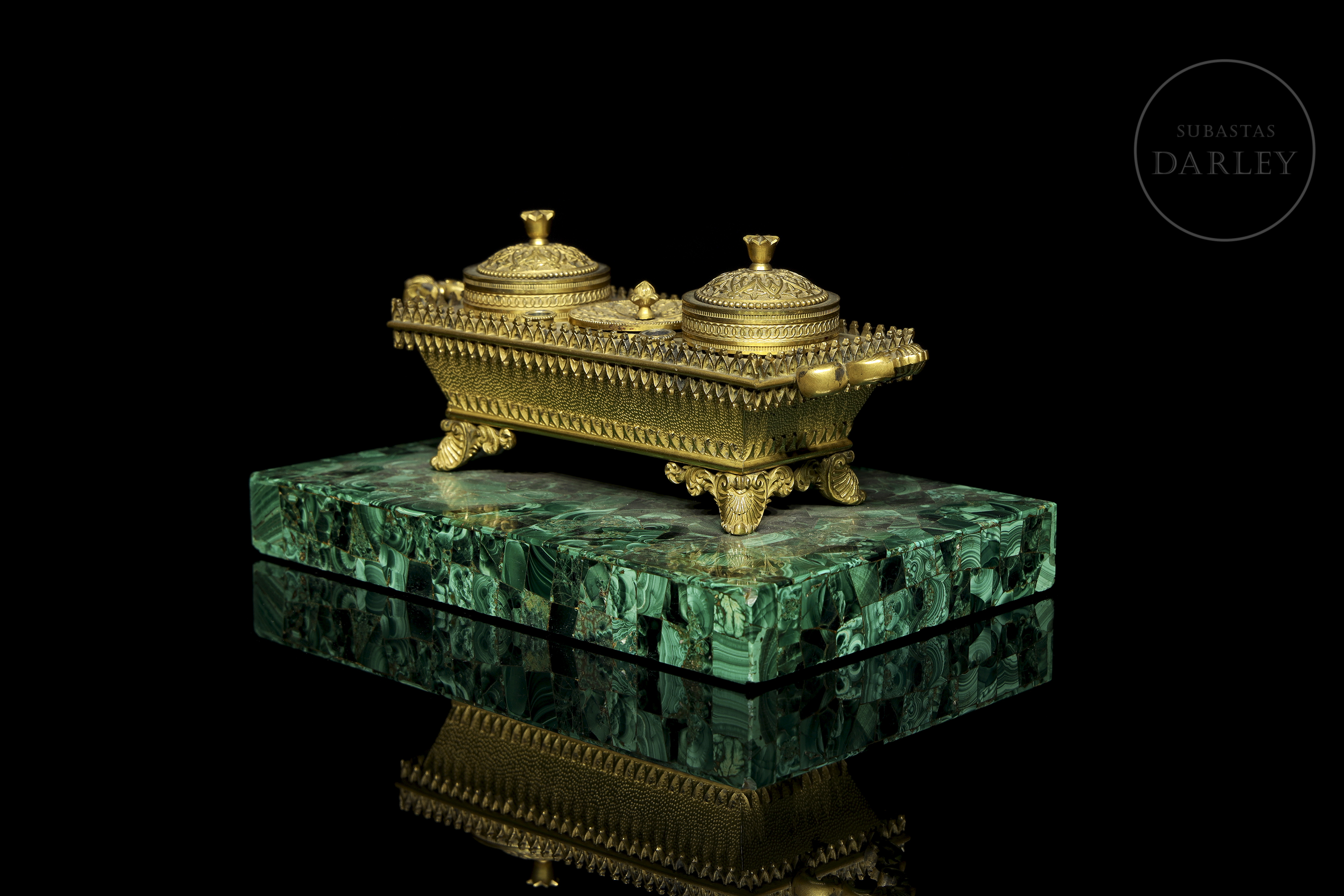 A gilt-finished metal writing desk with a double glass inkwell. Exalted piece on a green malachite base, in the Louis XIV style. In good condition, with wear due to age. No stamp or maker's markings visible.