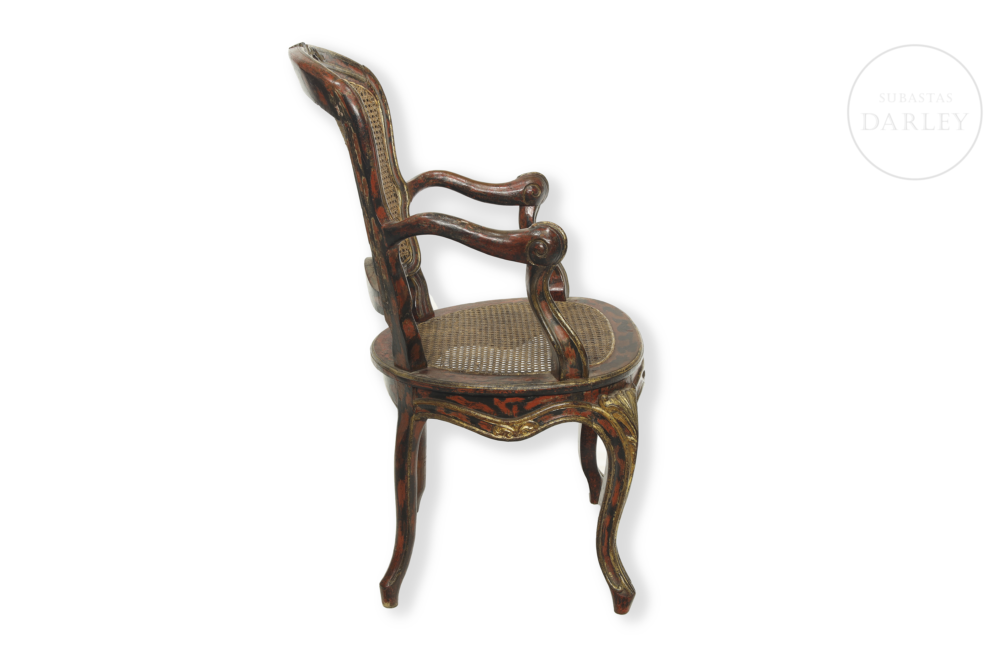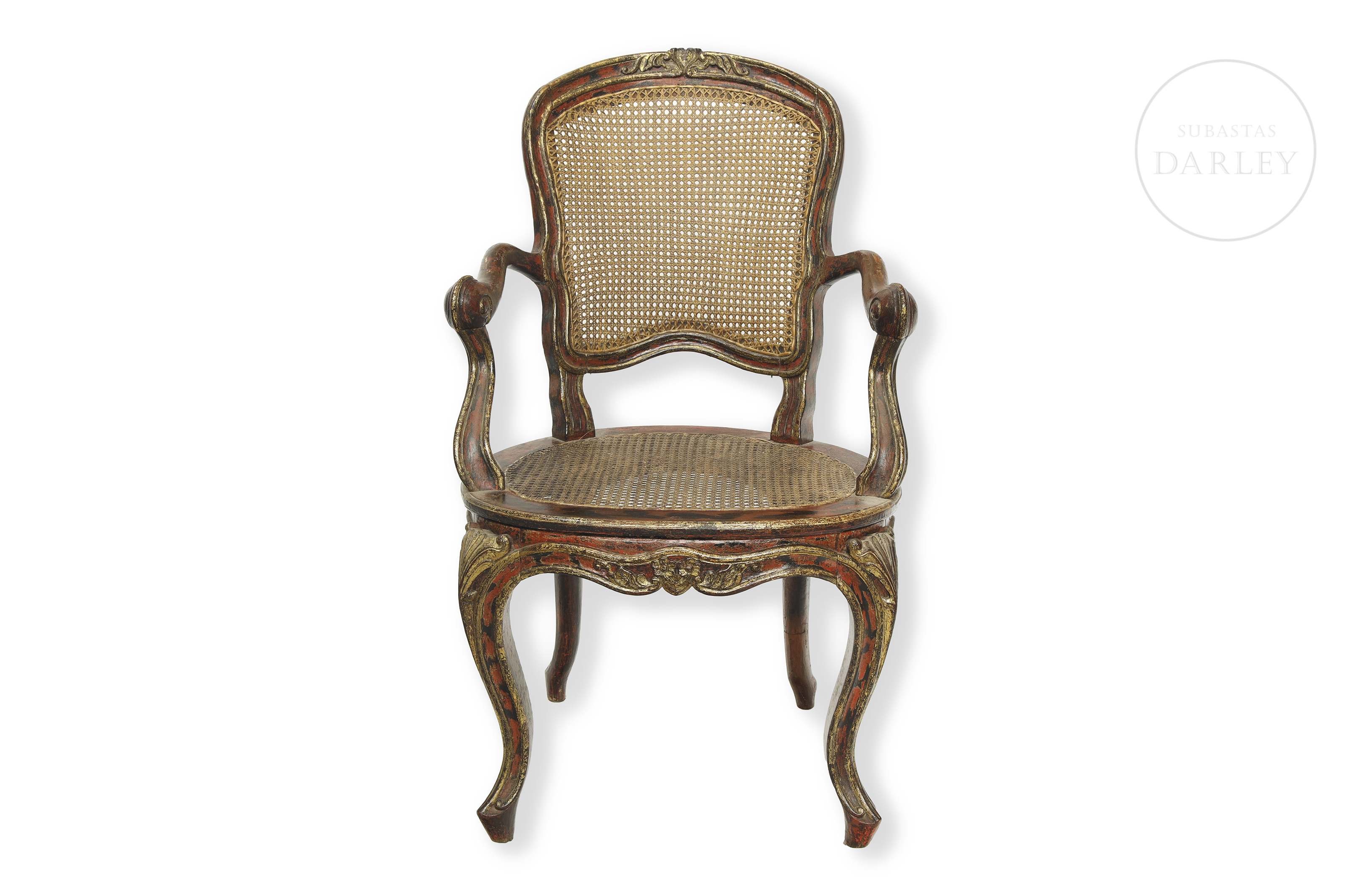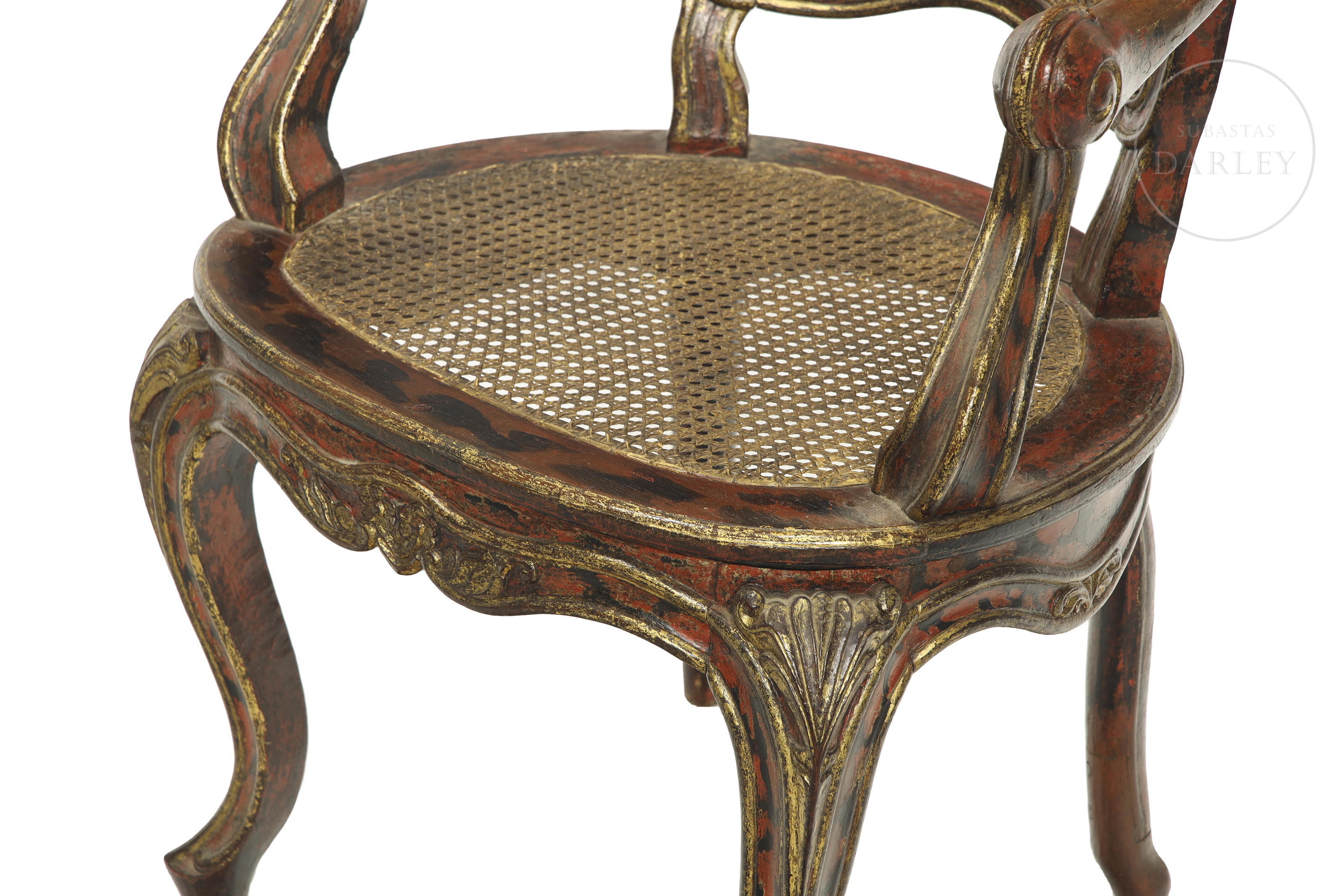 Louis XV style carved wooden chair with cabriolé legs and red and gold lacquered wooden frame. Seat and backrest with later period latticework support. No visible signature or manufacturer's mark.