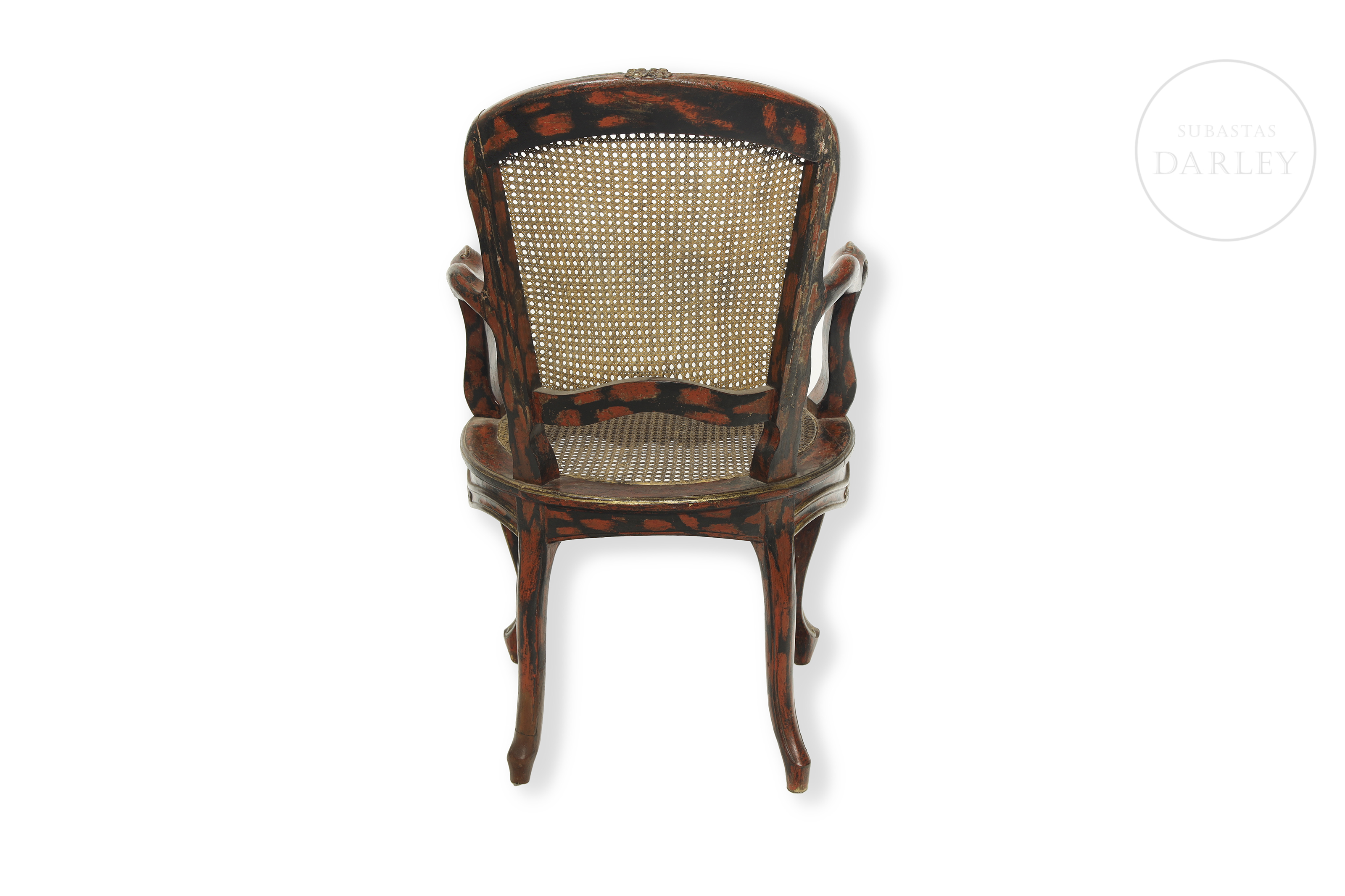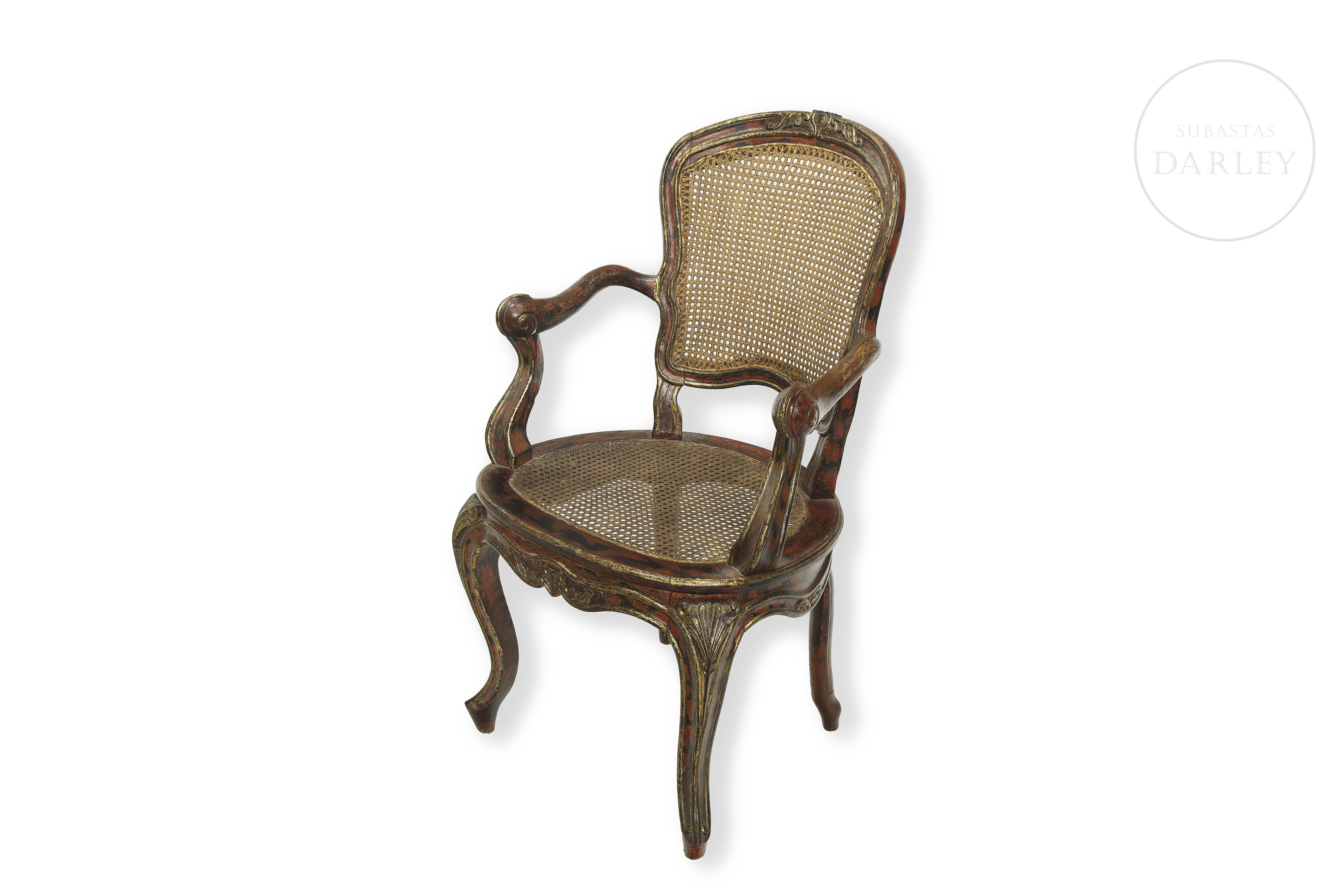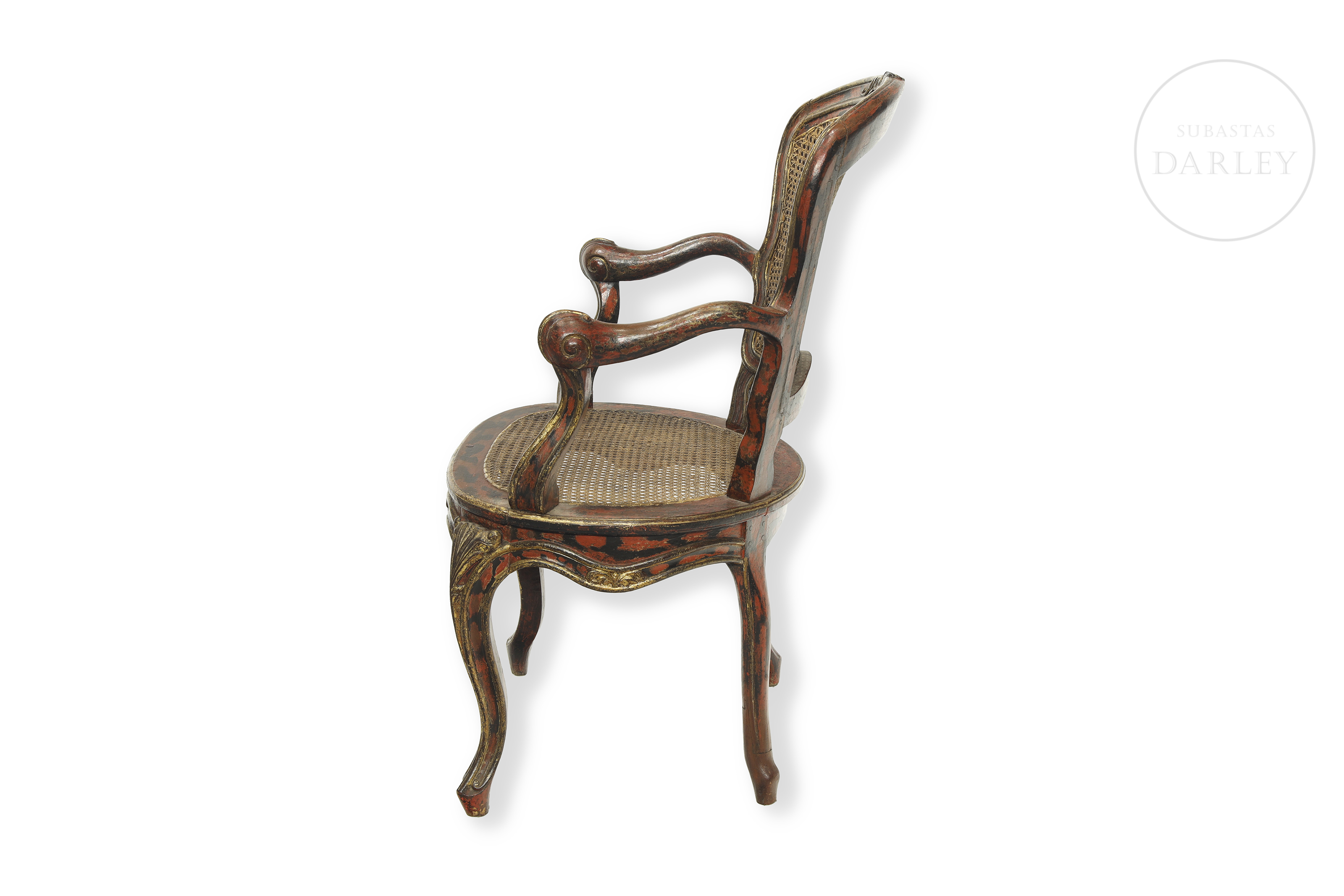 Louis XV style carved wooden chair with cabriolé legs and red and gold lacquered wooden frame. Seat and backrest with later period latticework support. No visible signature or manufacturer's mark.