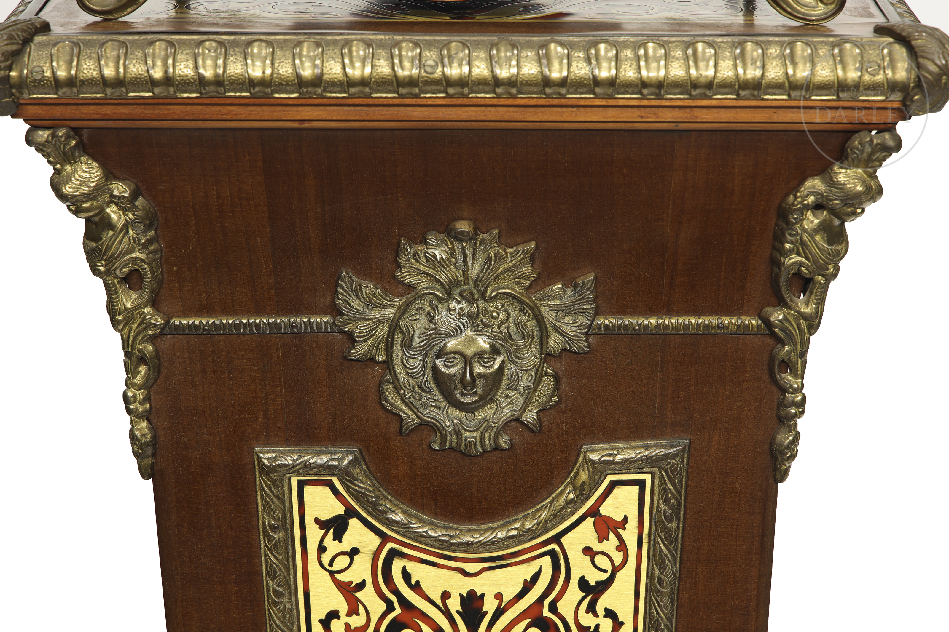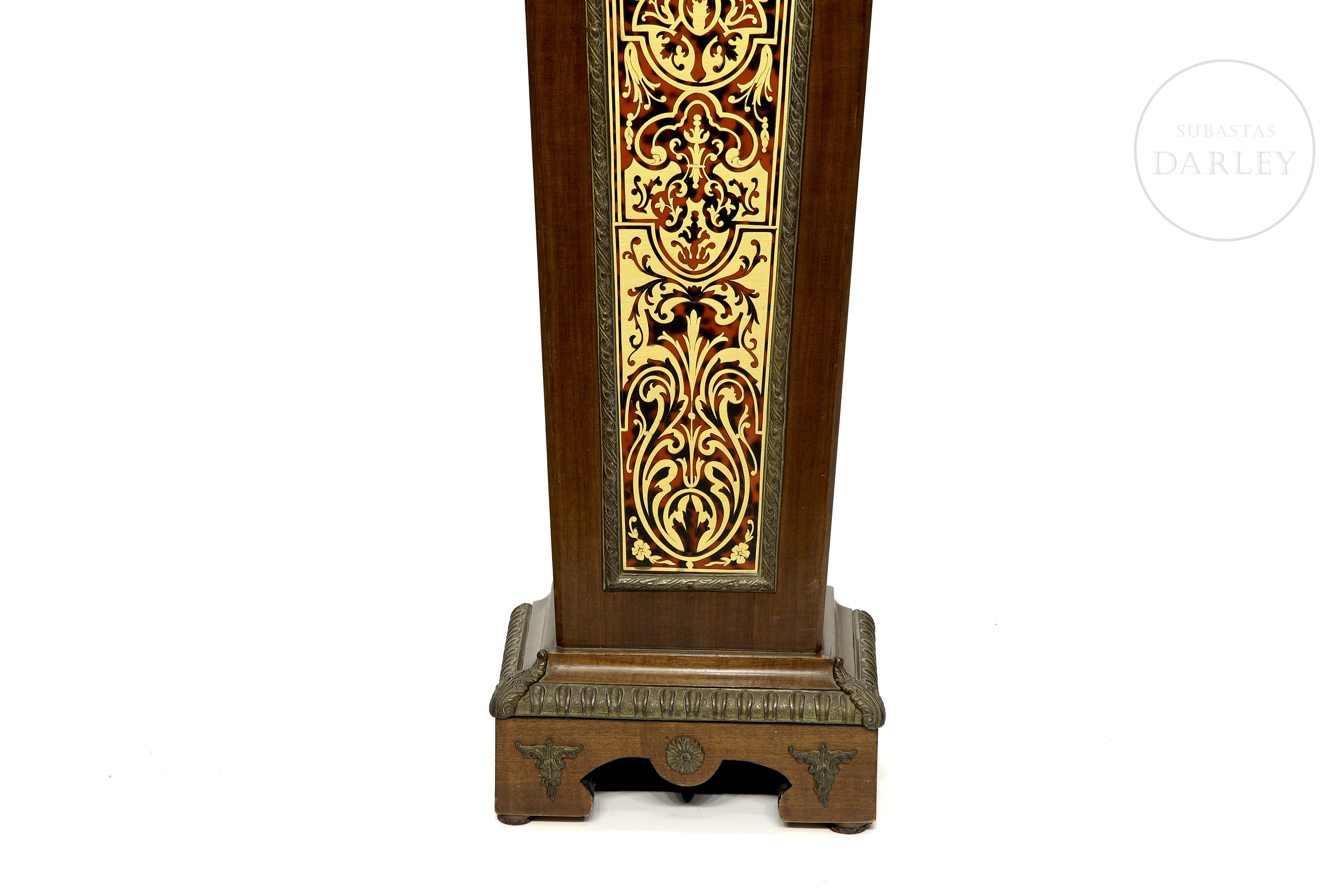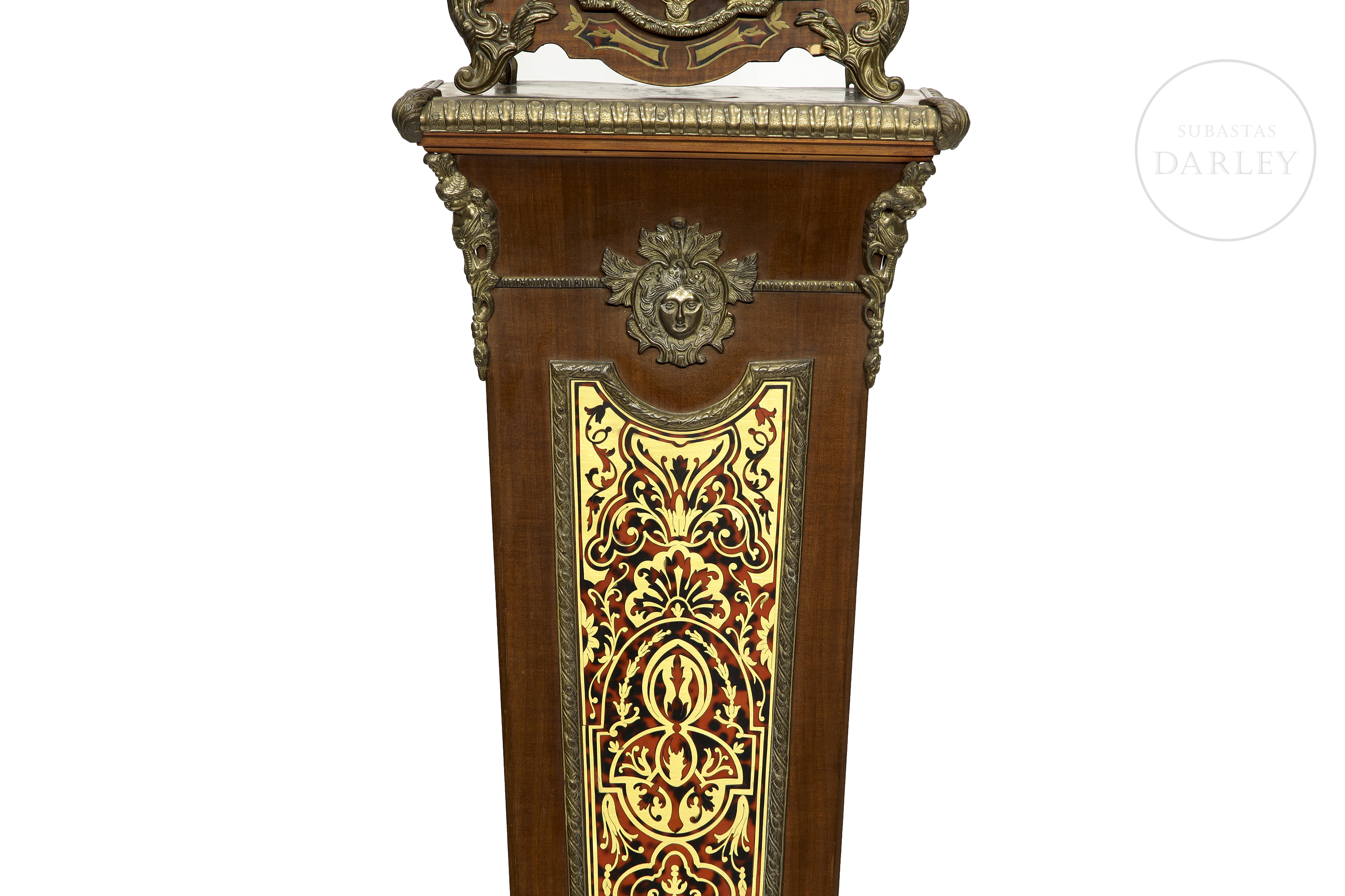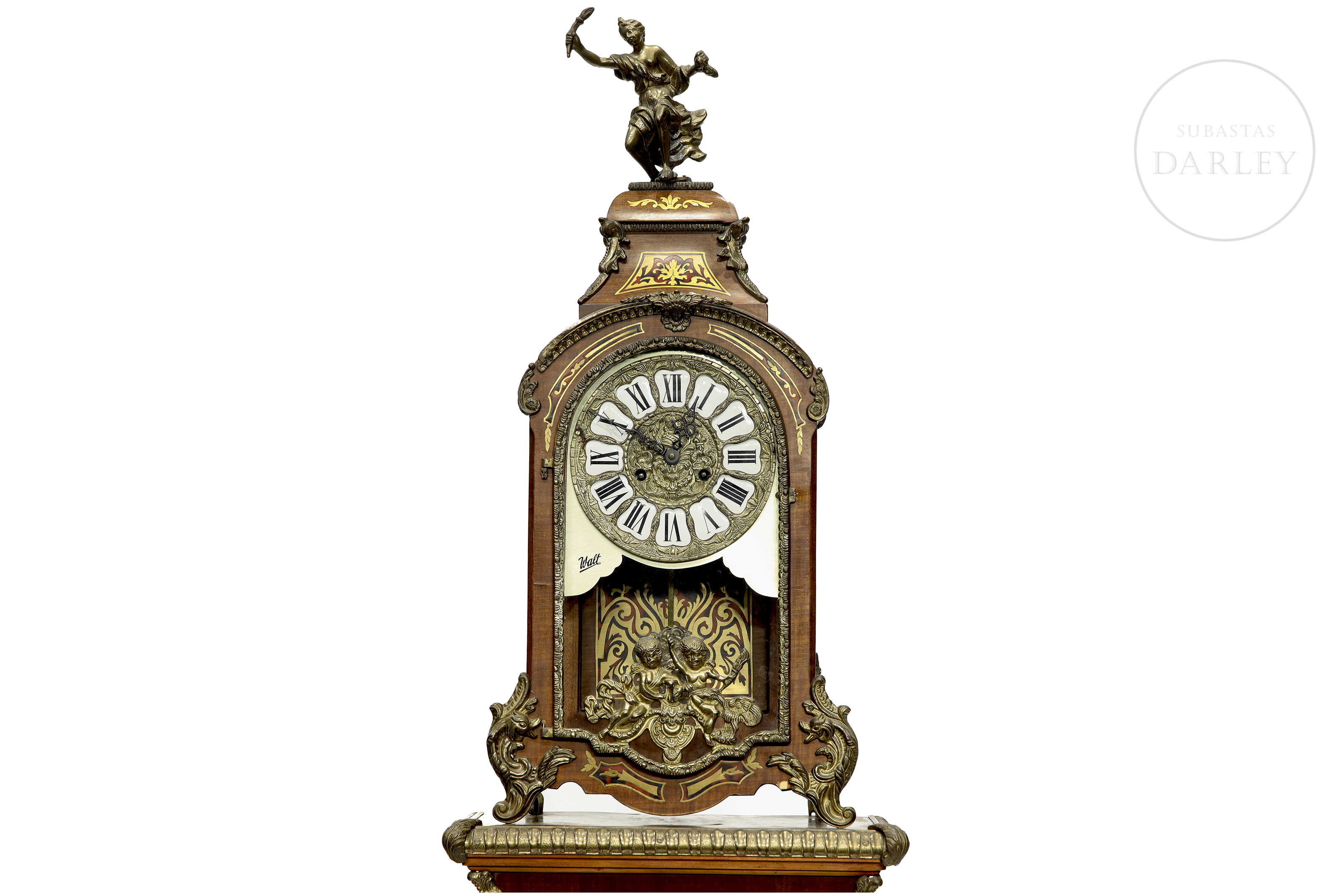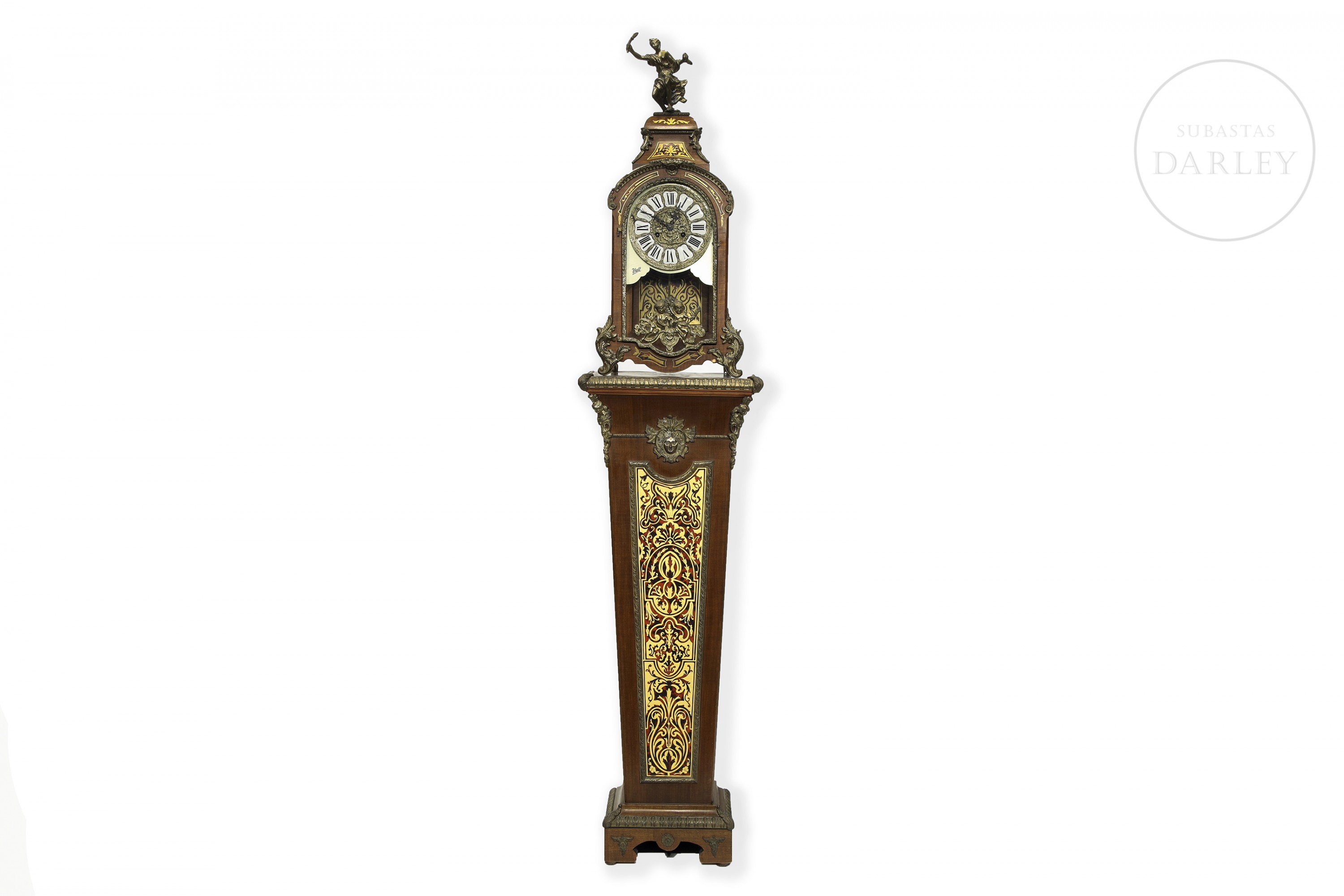 A two-part clock, comprising a case and a tall stand. Decorated with fittings and reliefs of cherubs and bronze medallions; floral marquetry and crowned with a sculpture of a lady in movement.