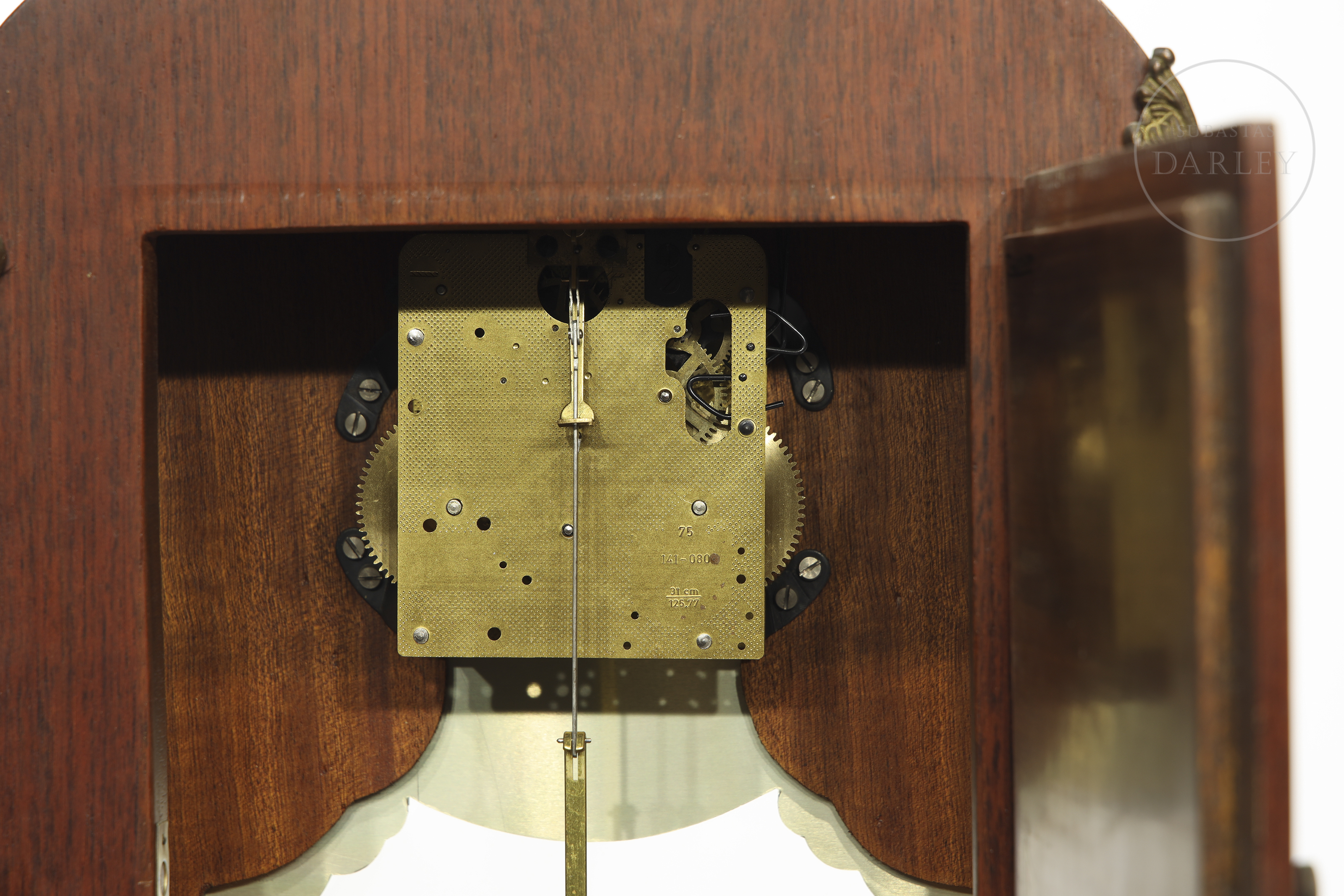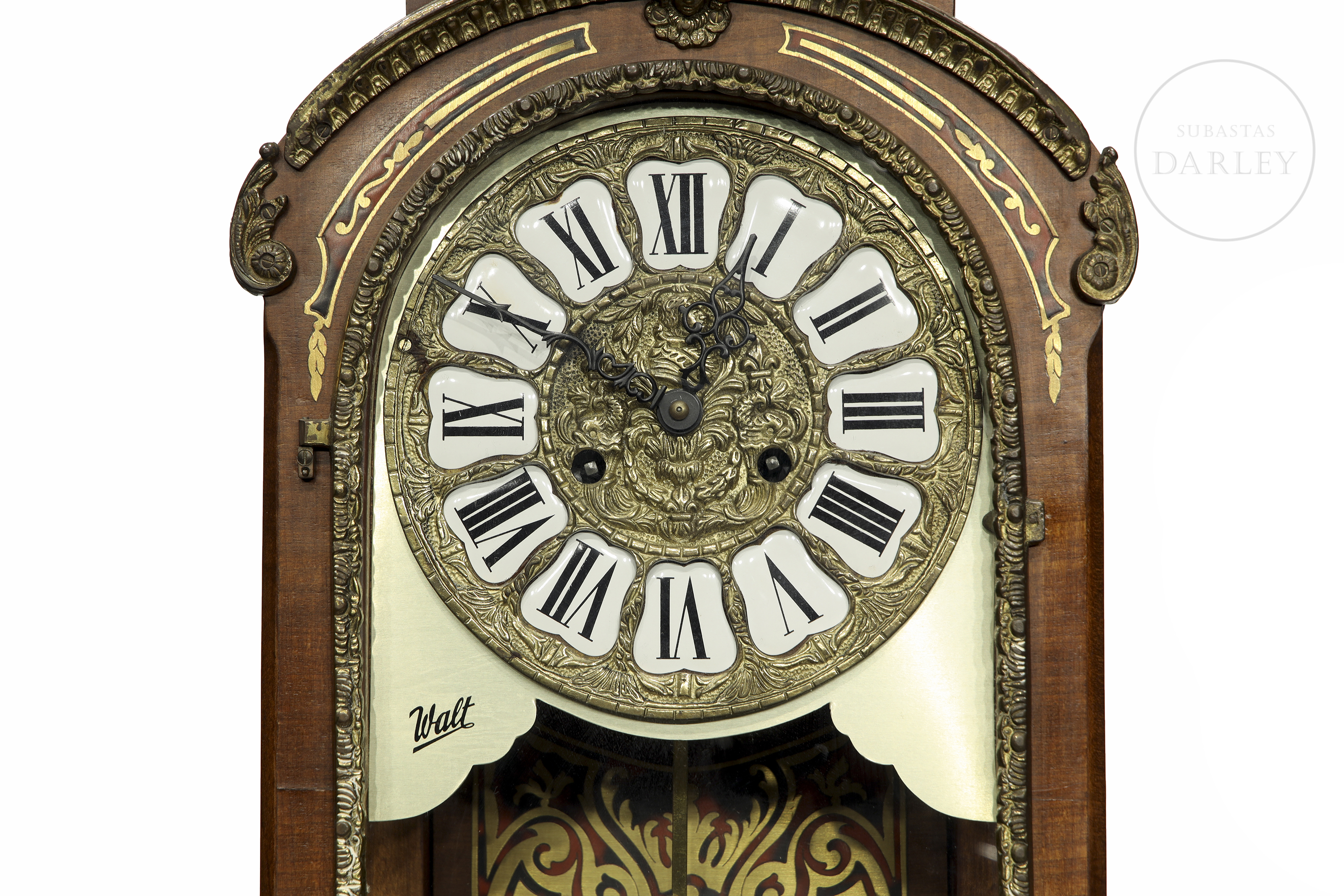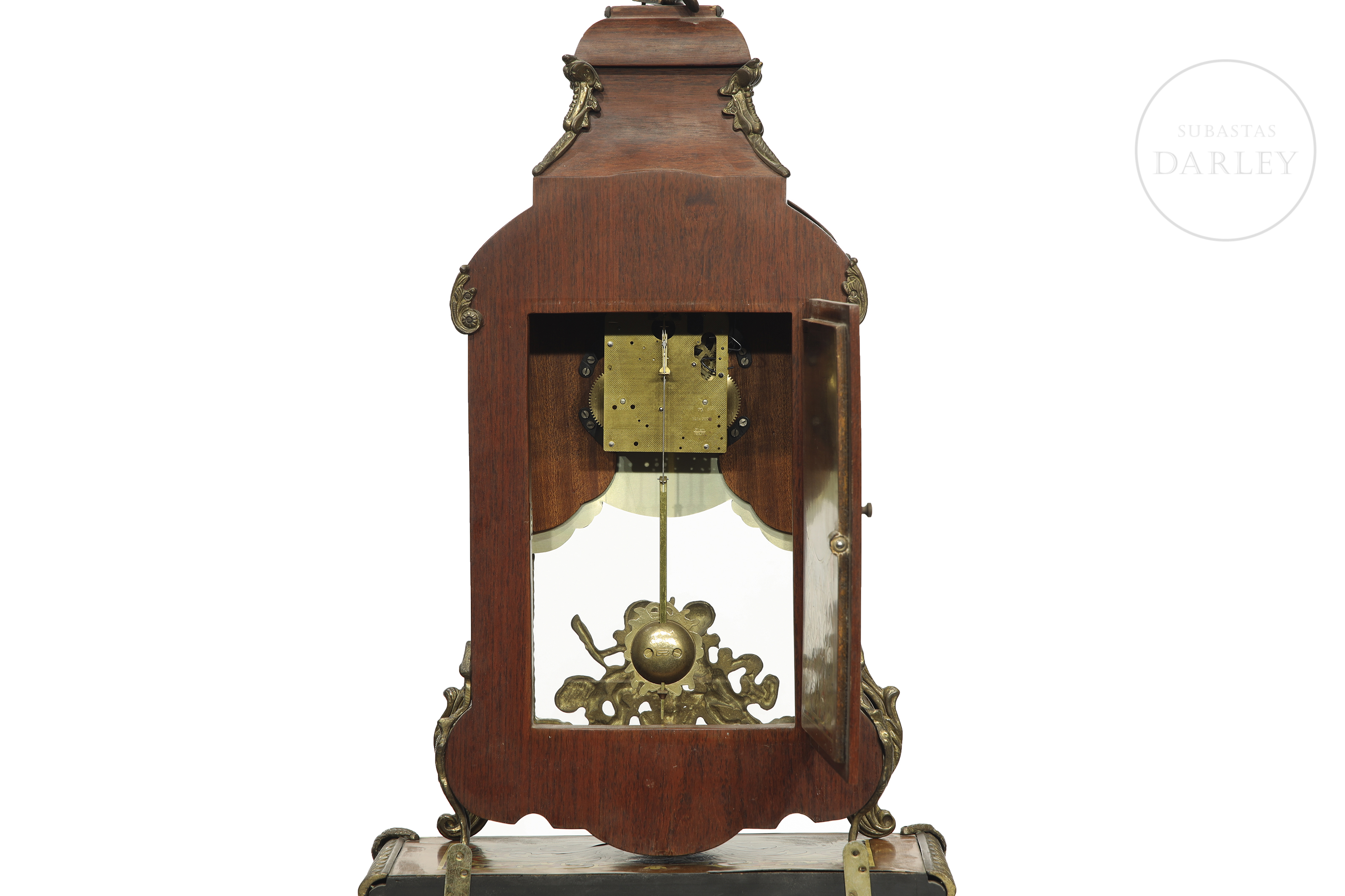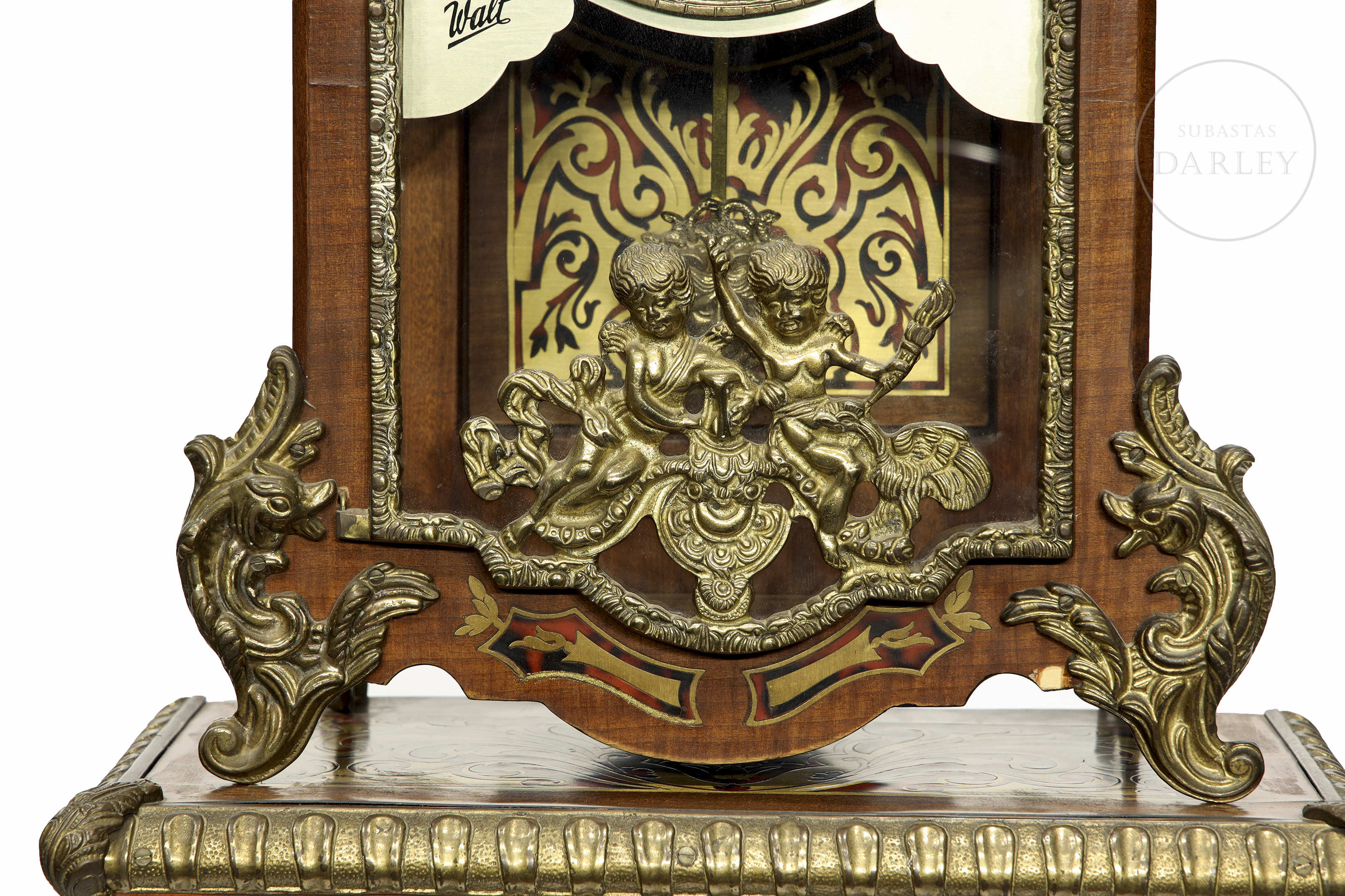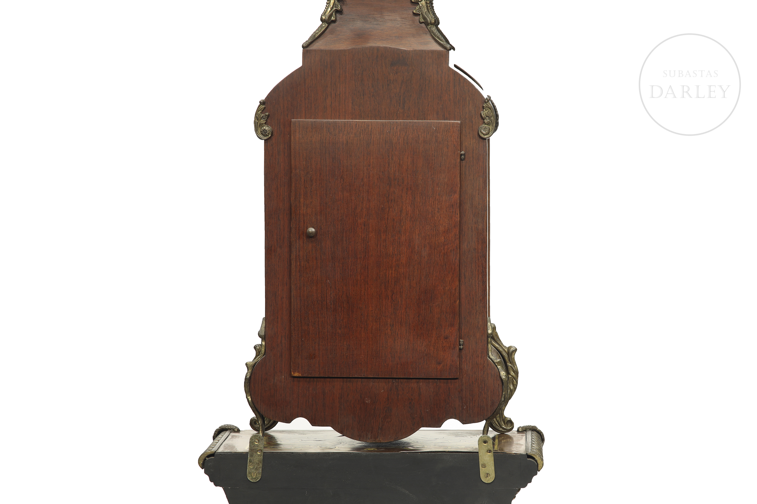 A two-part clock, comprising a case and a tall stand. Decorated with fittings and reliefs of cherubs and bronze medallions; floral marquetry and crowned with a sculpture of a lady in movement.