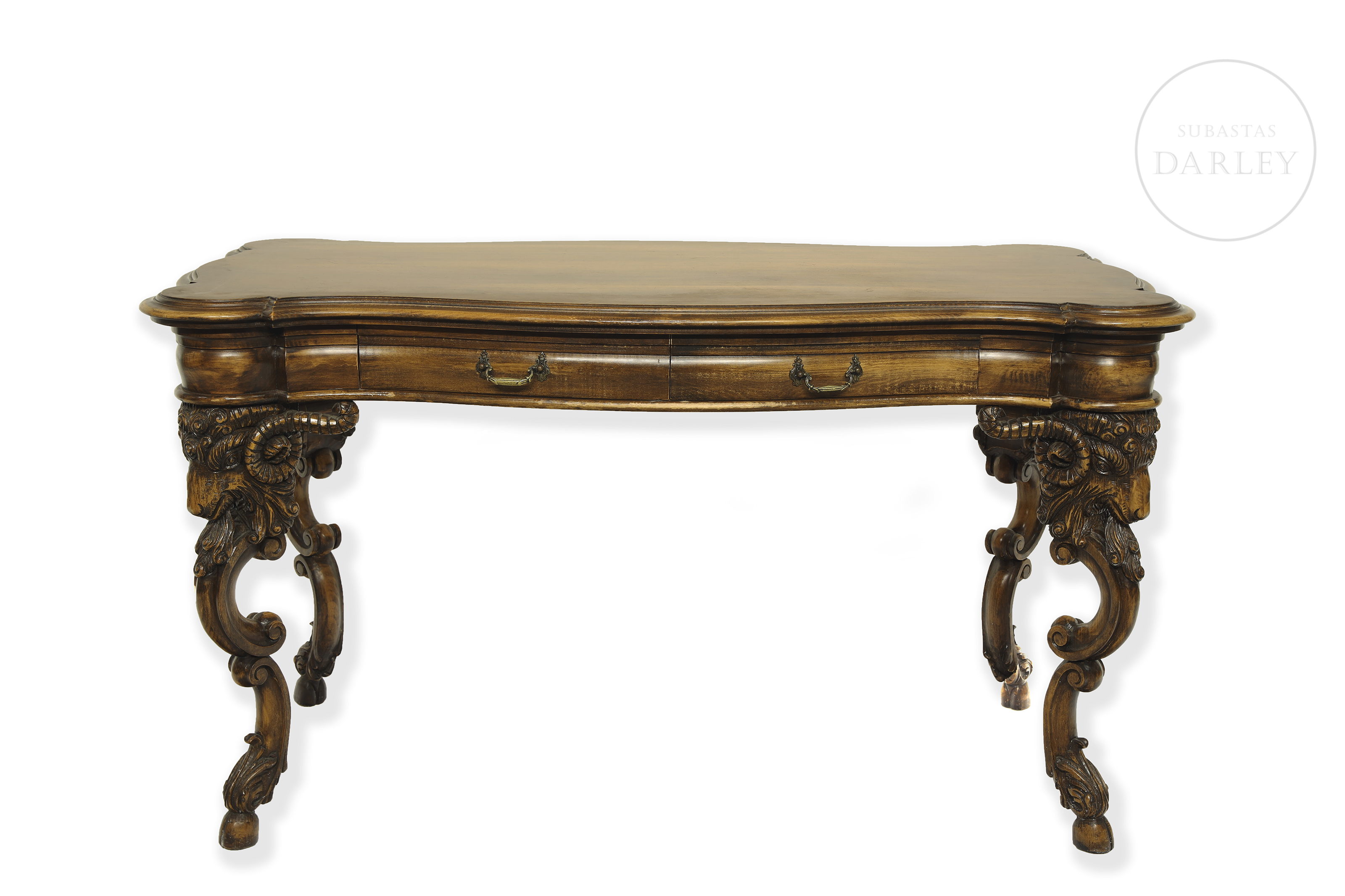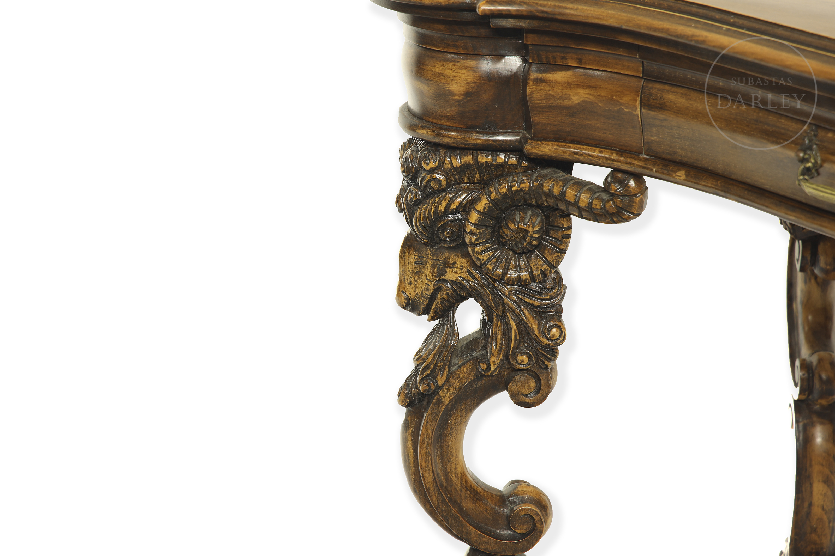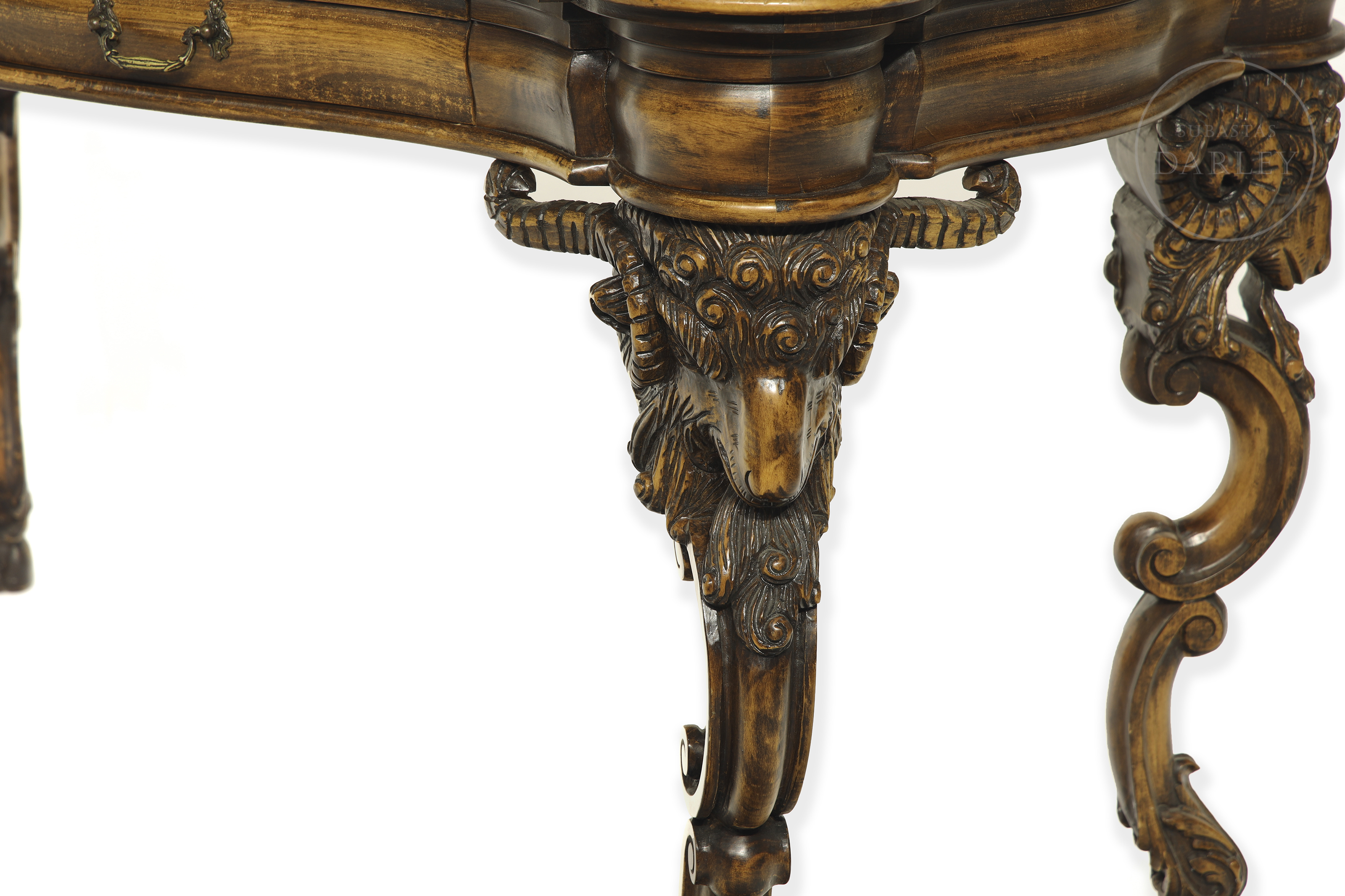 Desk in carved and veneered wood. It has a rounded-edged top with two front drawers and carved wooden legs with reliefs imitating the head and leg of a large ram.