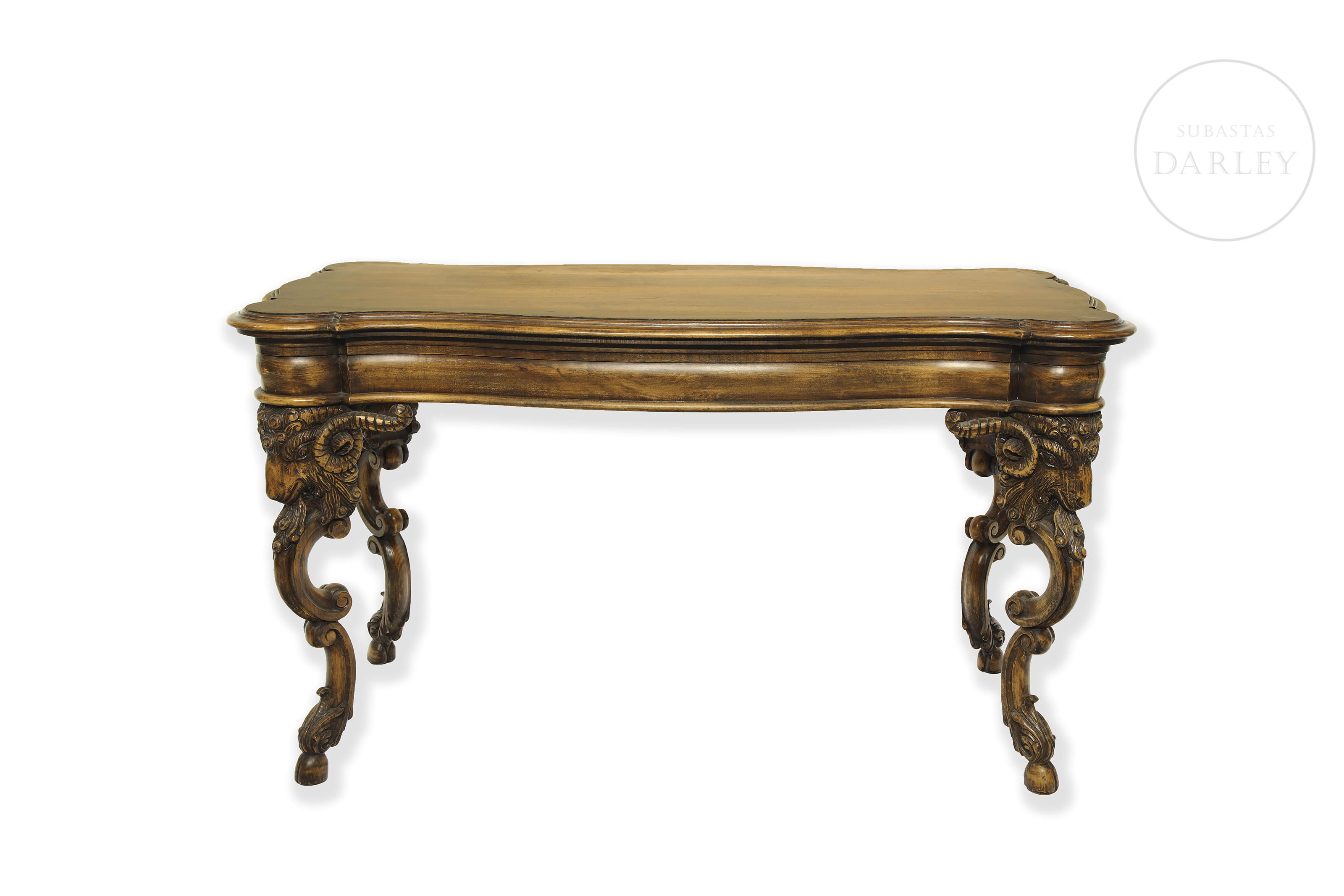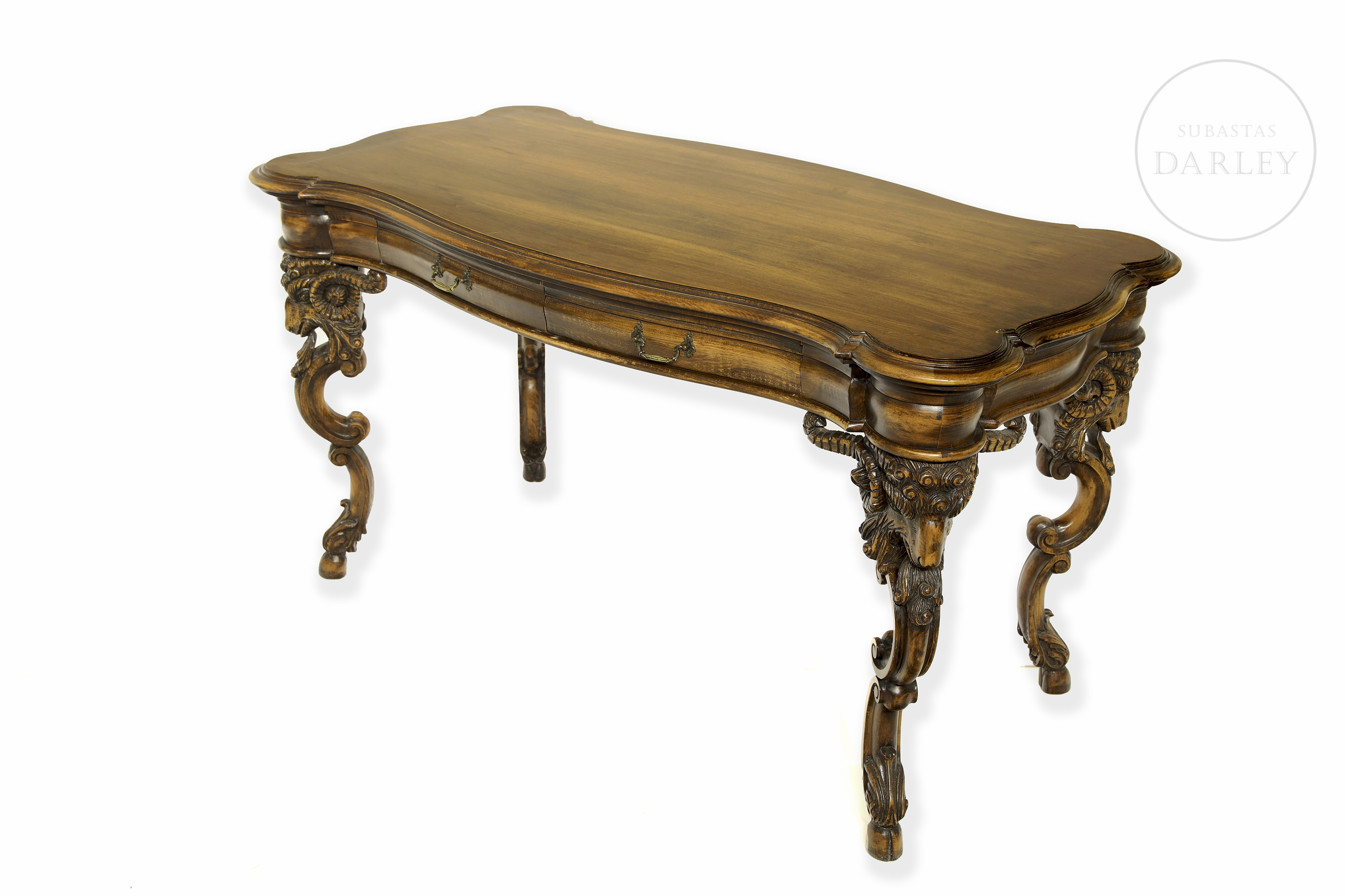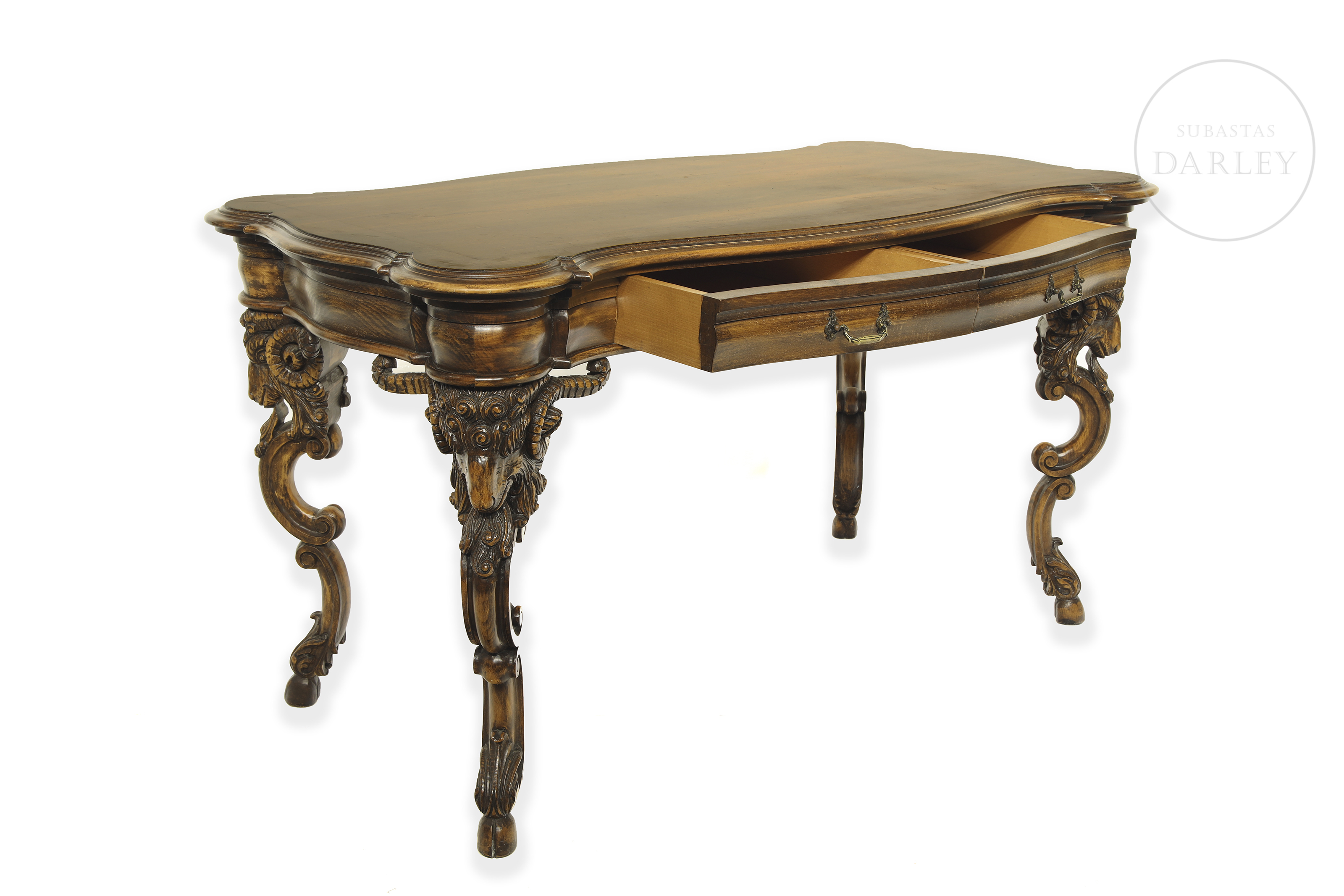 Desk in carved and veneered wood. It has a rounded-edged top with two front drawers and carved wooden legs with reliefs imitating the head and leg of a large ram.