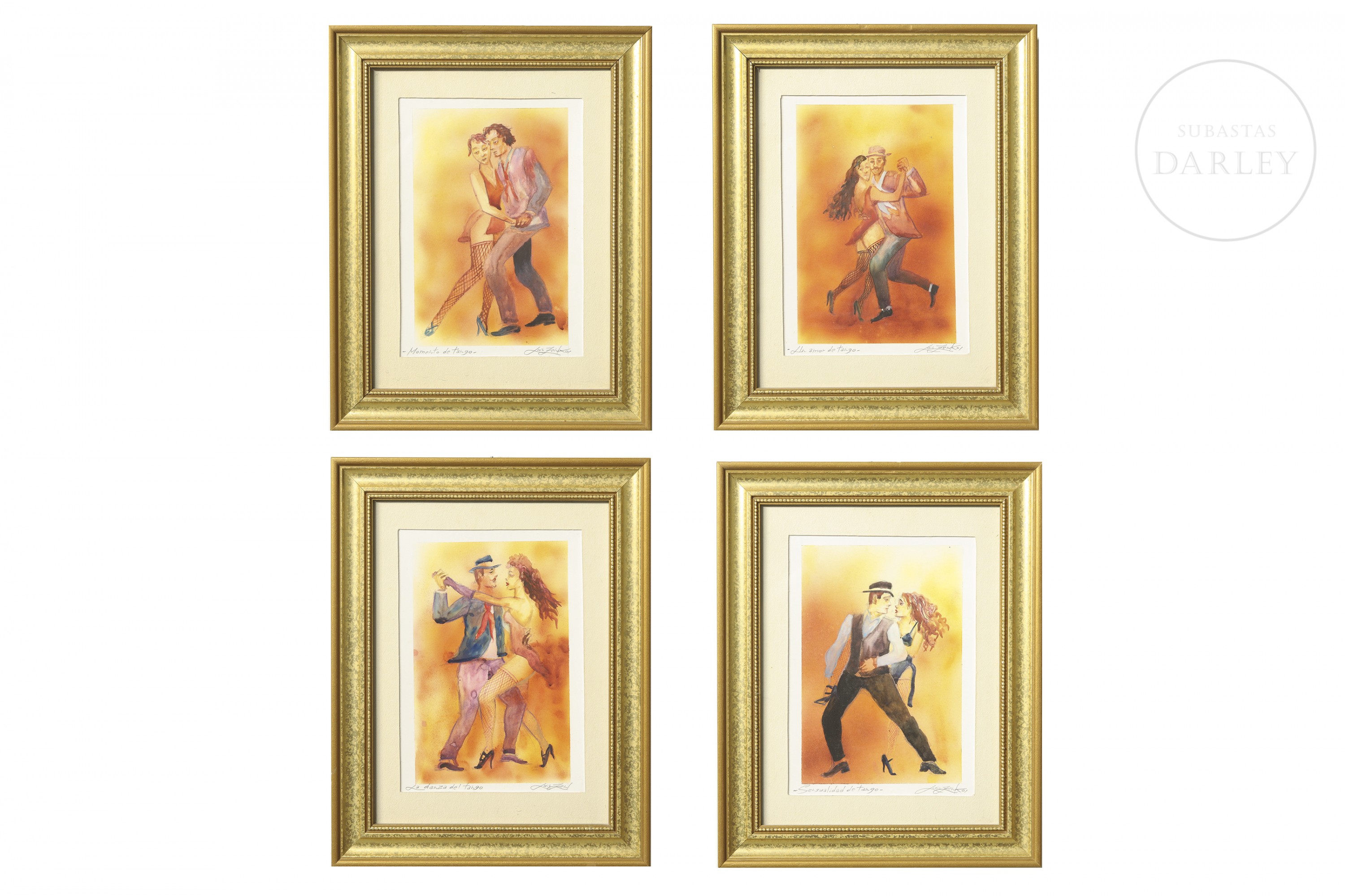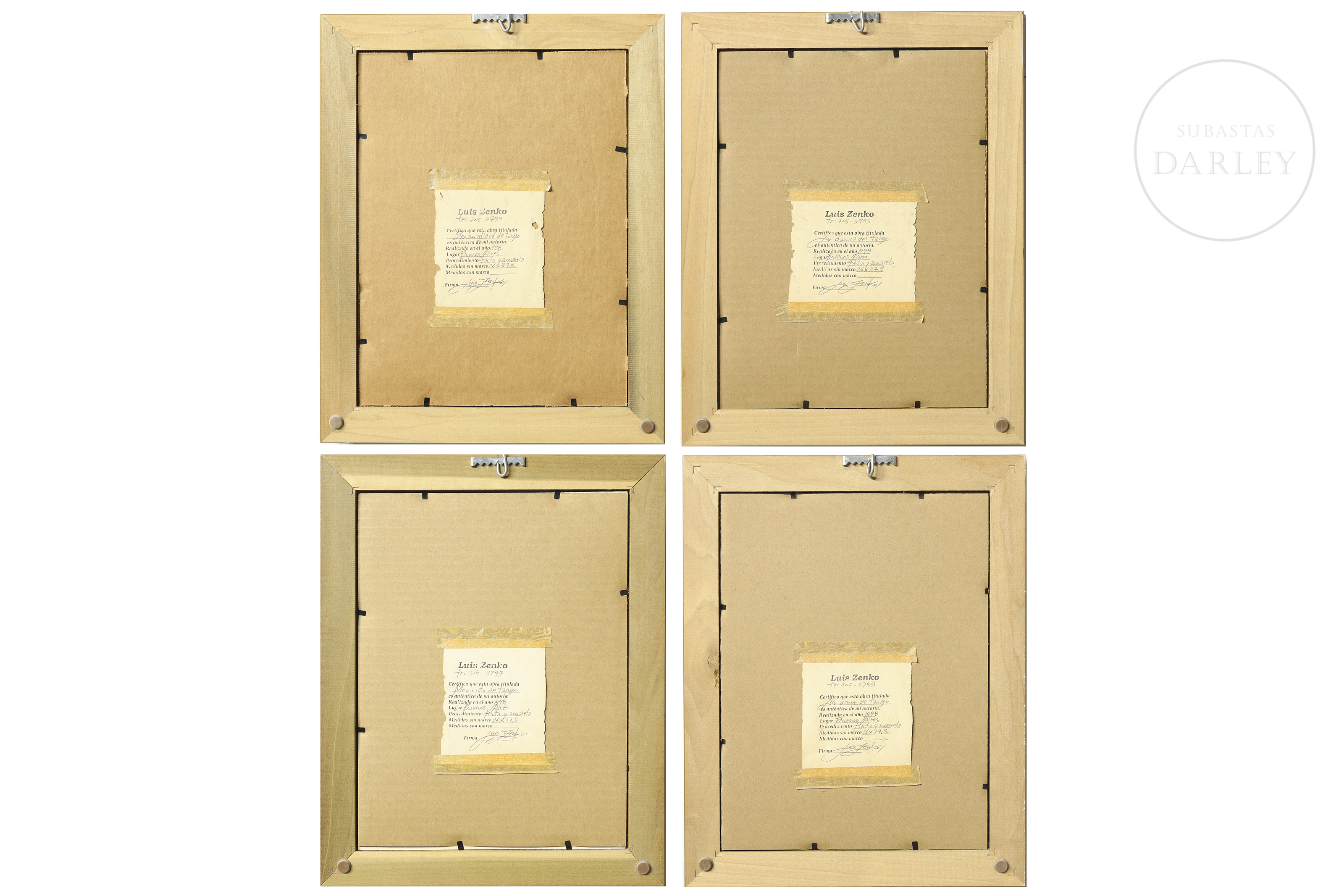 Set of four mixed media paintings on paper. Signed and titled in the lower margin. With explanatory label on the back.