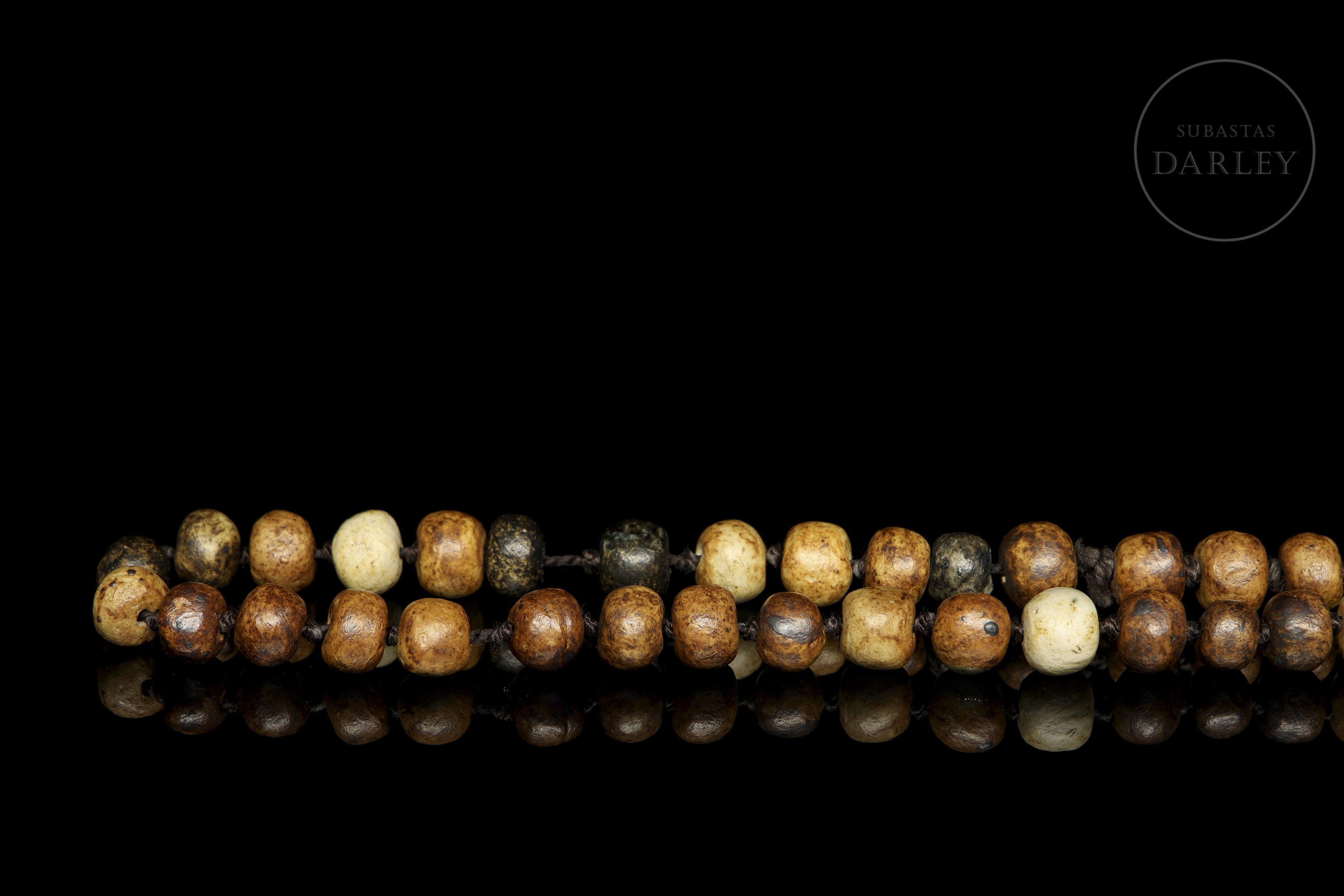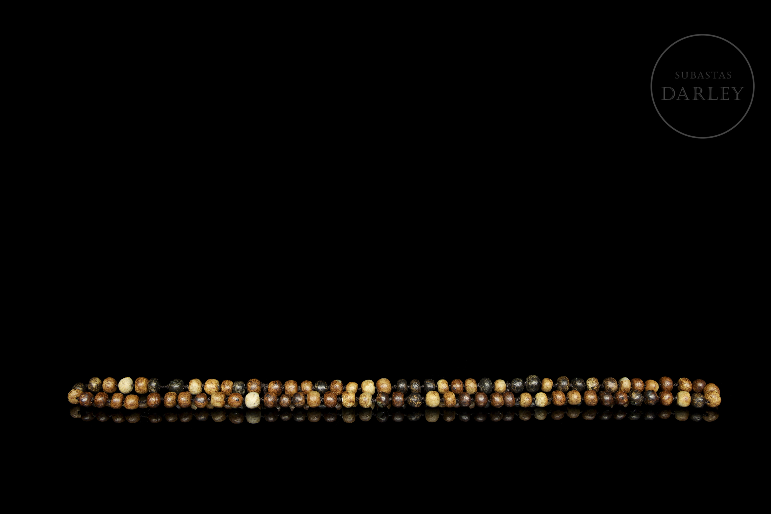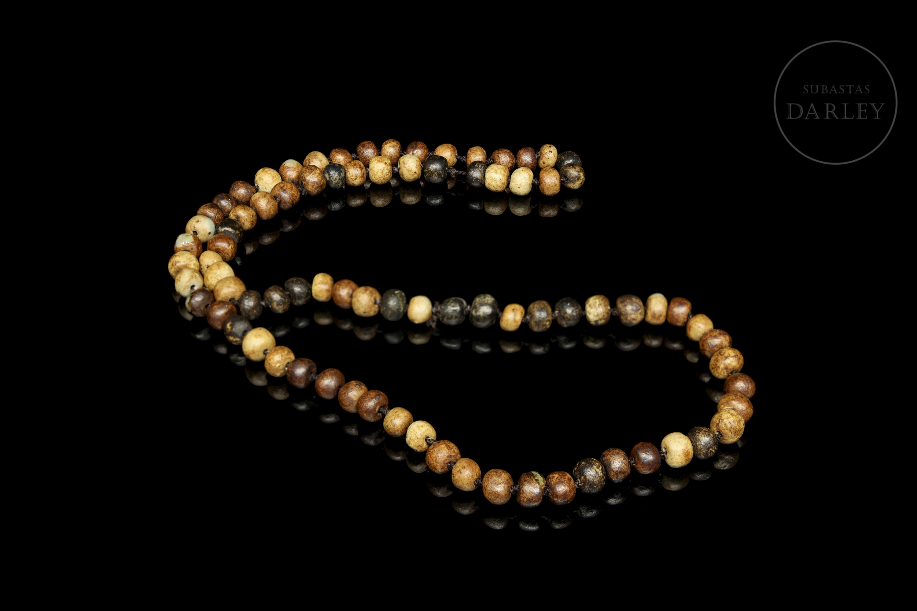 Necklace composed of a total of 83 spherical stone beads in shades of brown, ochre and black, with a polished surface and slight irregularities typical of their age. Qing Dynasty (1644–1912).
