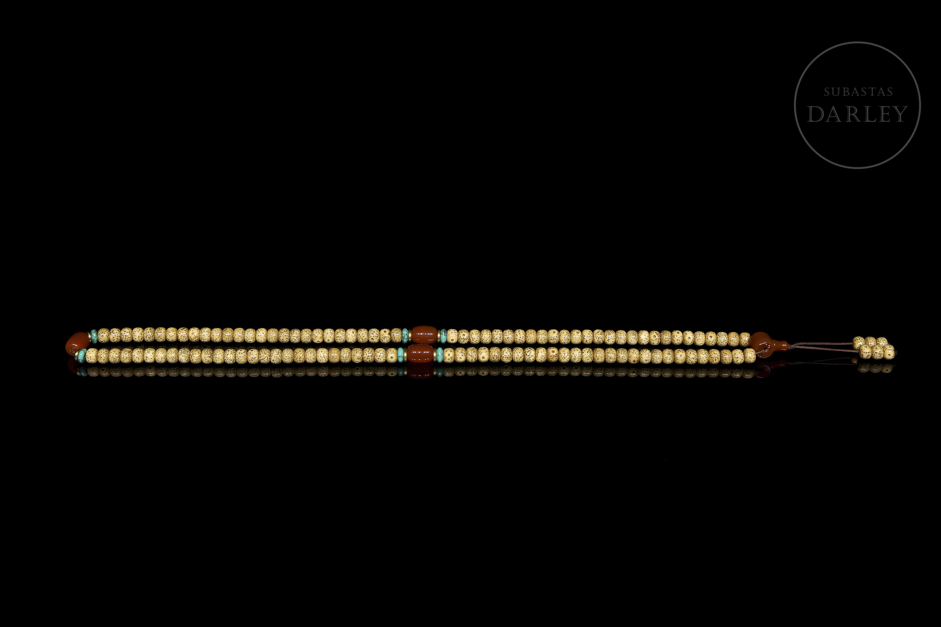 Necklace or ‘mala’ used for meditation and mantra recitation. Composed of 108 spherical seed beads, 6 disc-shaped turquoise beads with rounded edges, and 4 cylindrical agate beads.