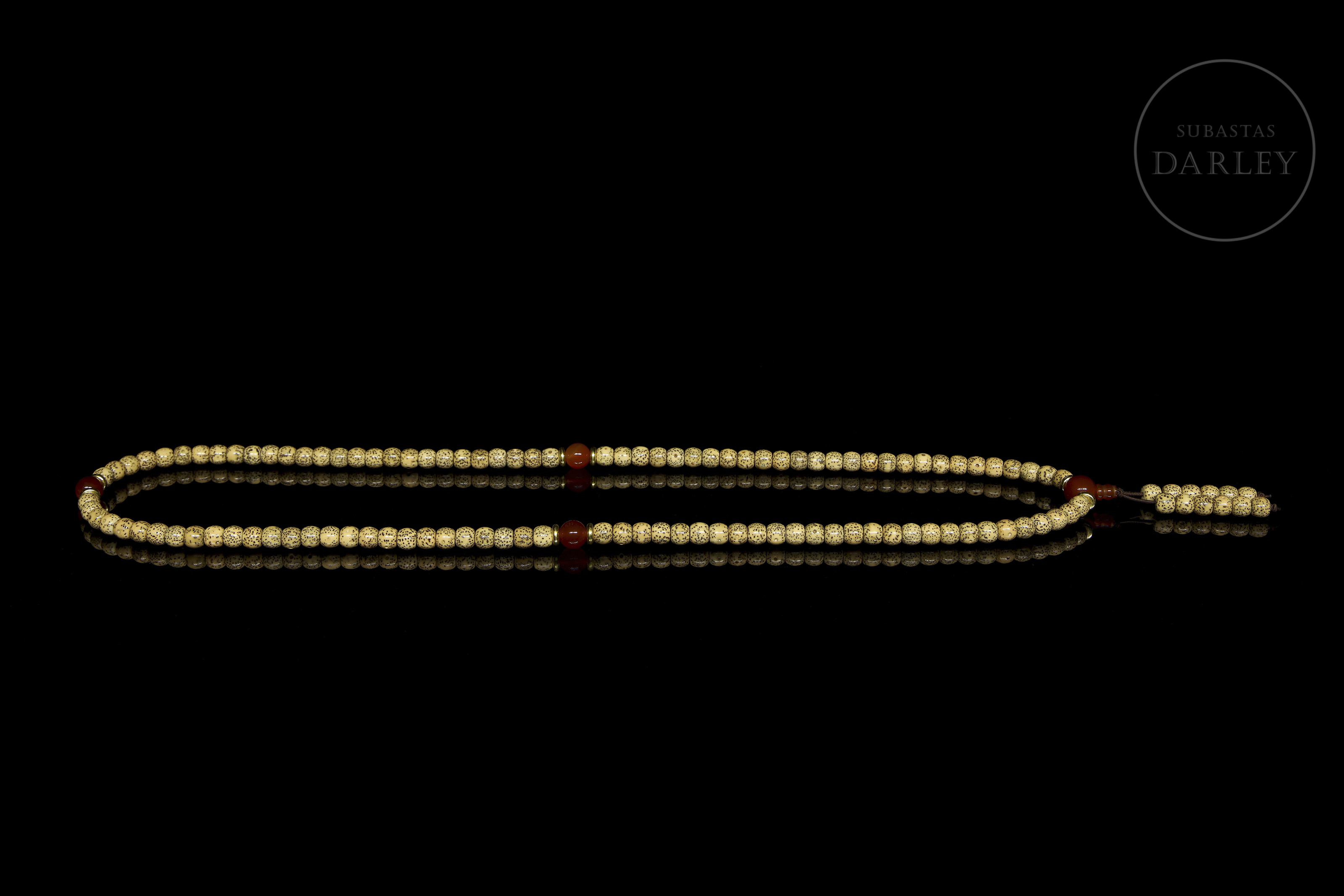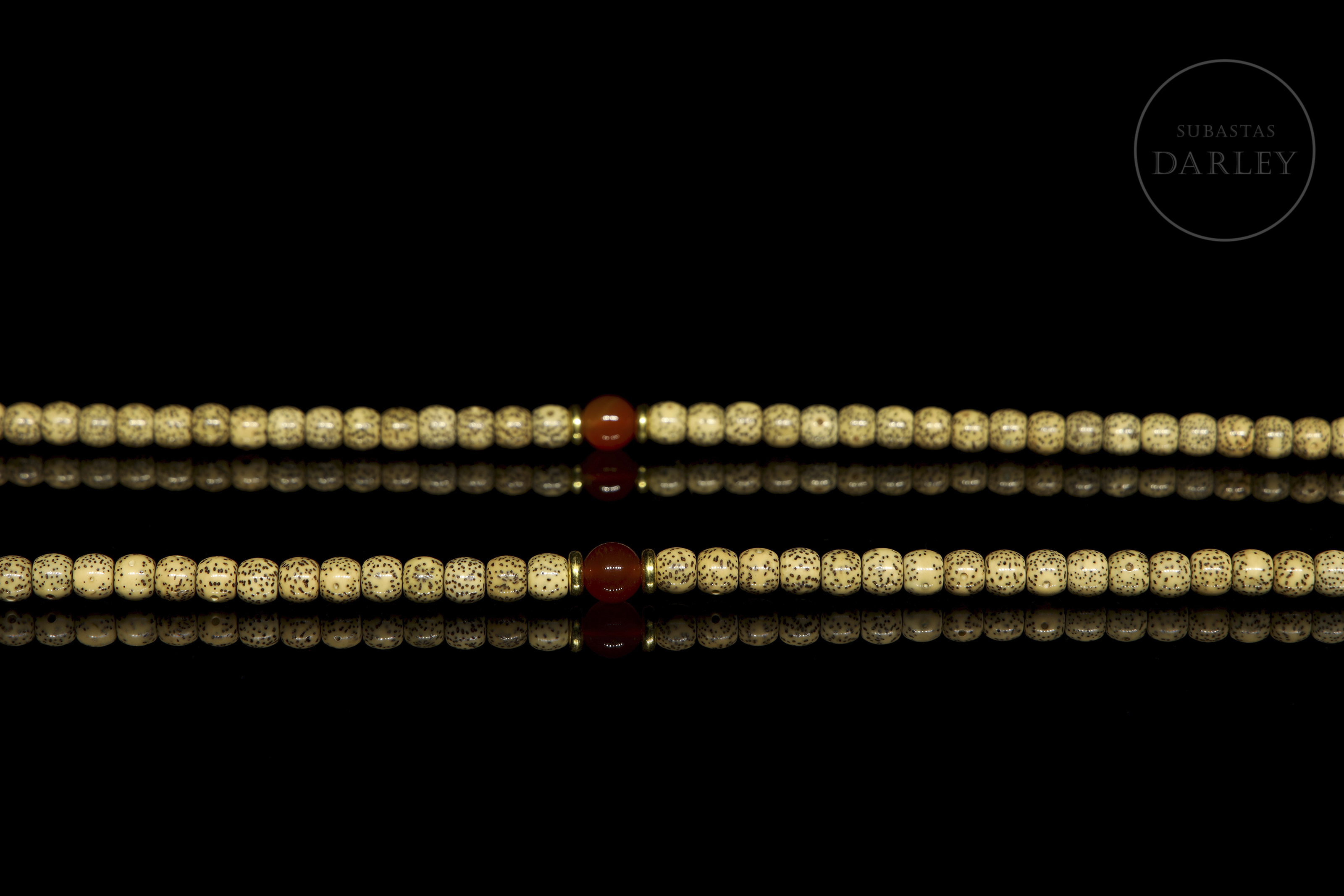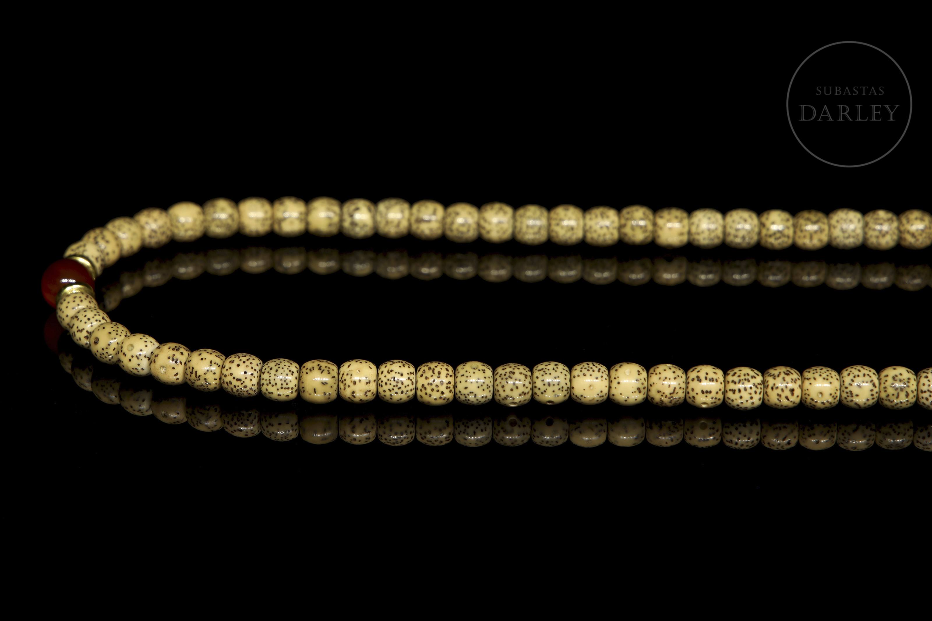 Prayer necklace or ‘mala’ composed of 125 beads, 120 of which are natural speckled seed beads and 5 are reddish agate beads. The set is assembled with a short two-row tassel finish.