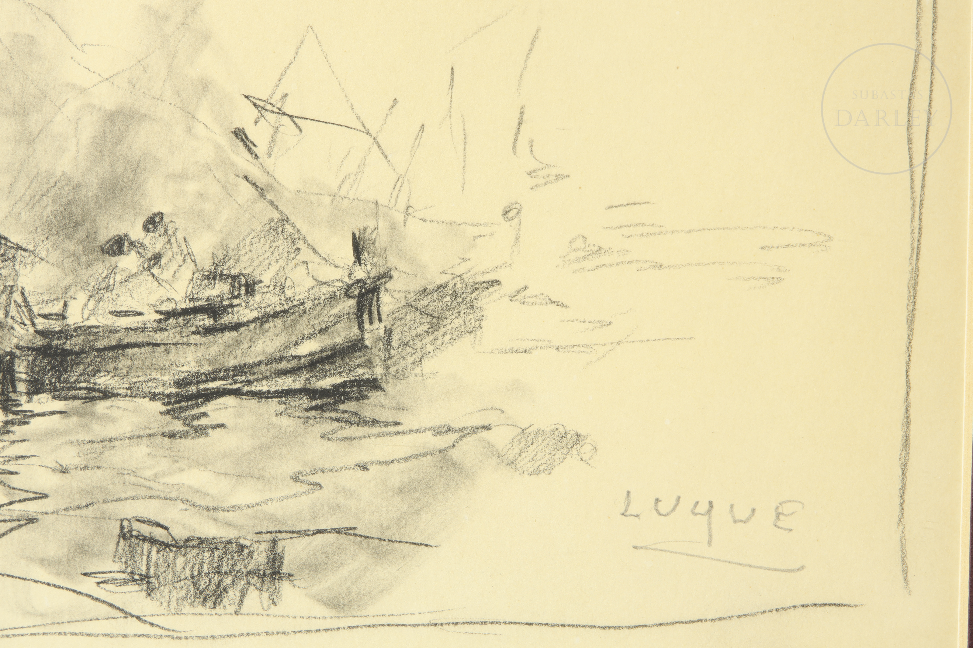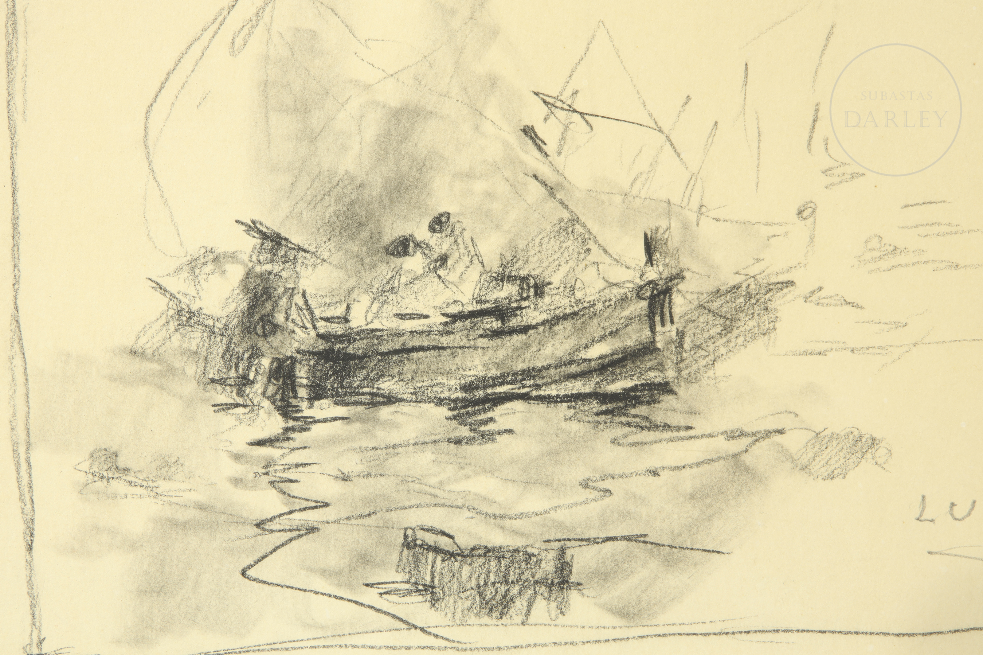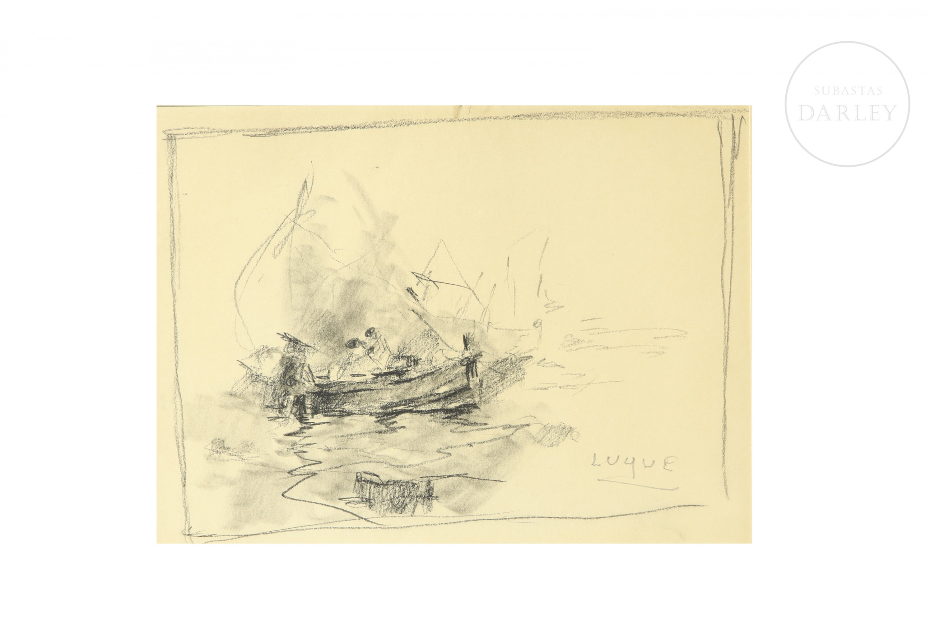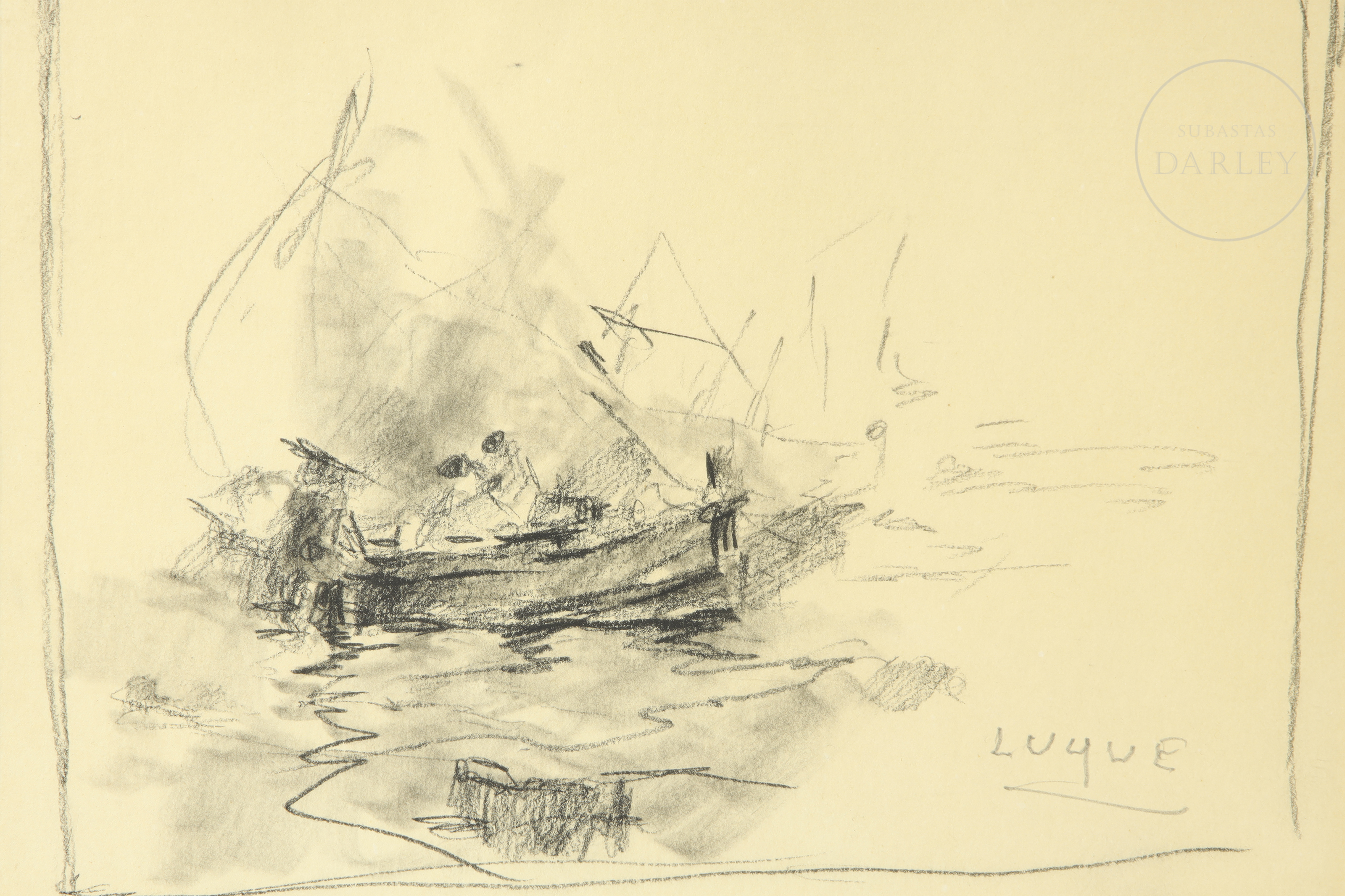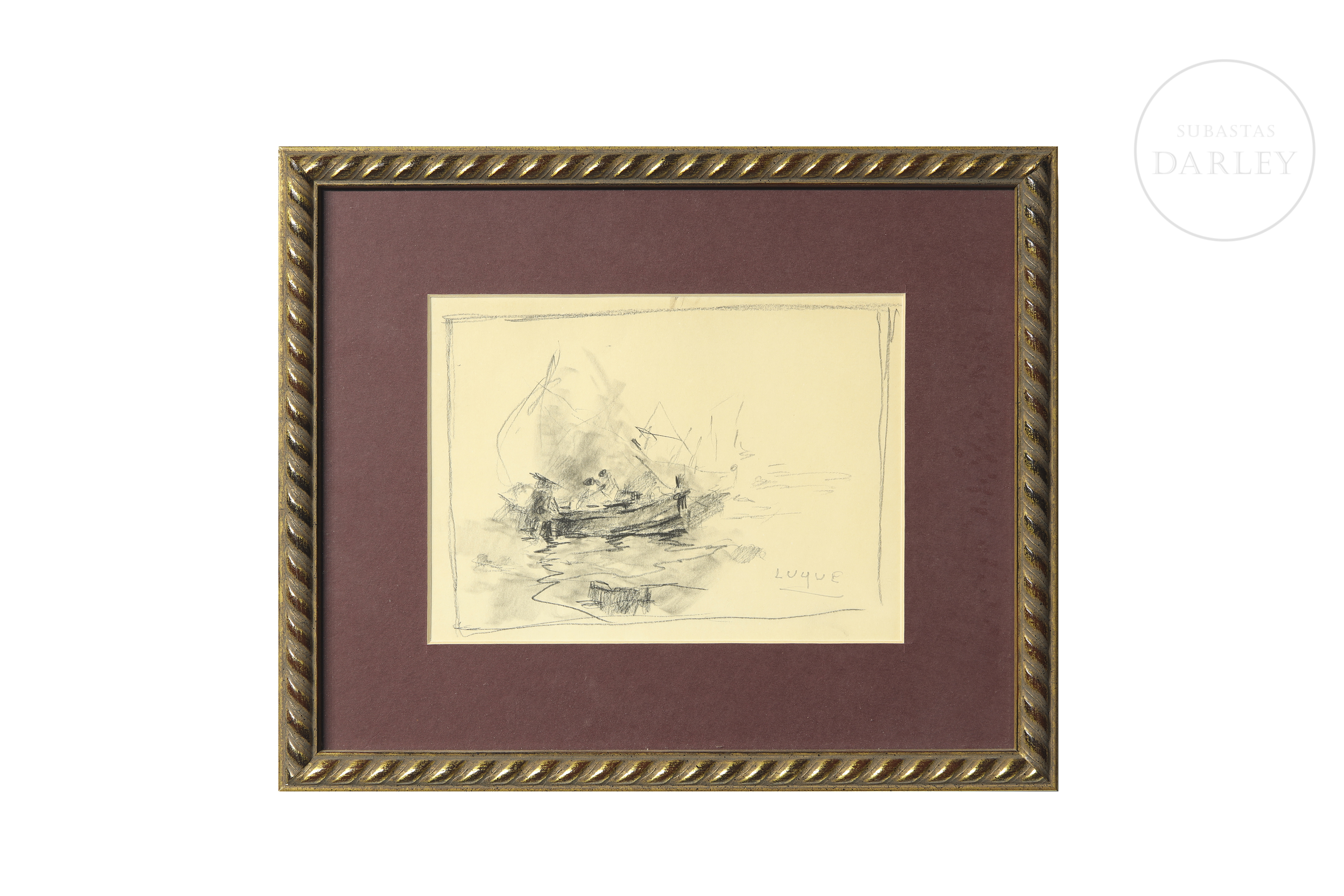 Graphite on paper. Pencil sketch depicting a seascape with several traditional Valencian boats. Signed ‘Luque’ in the lower right corner.