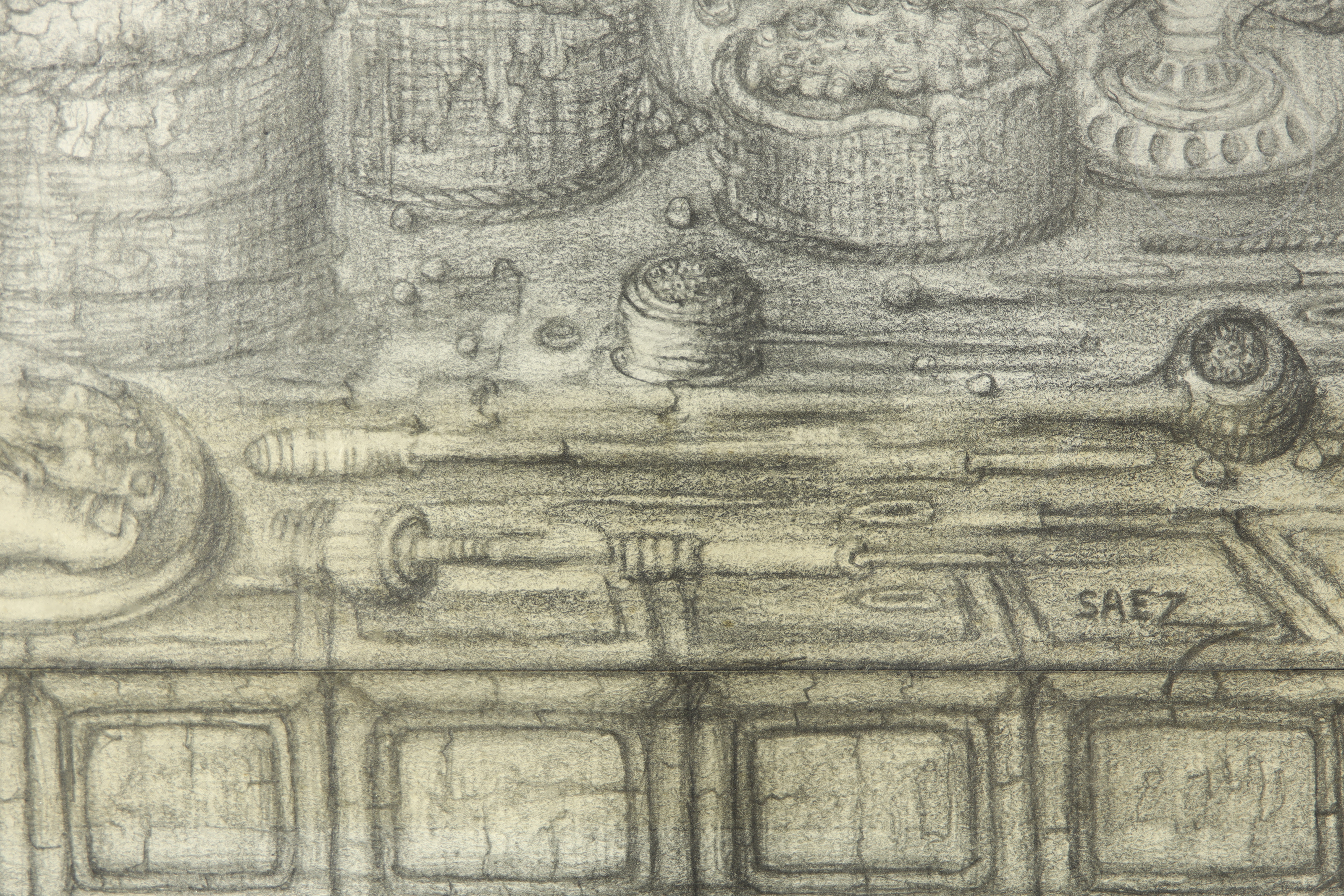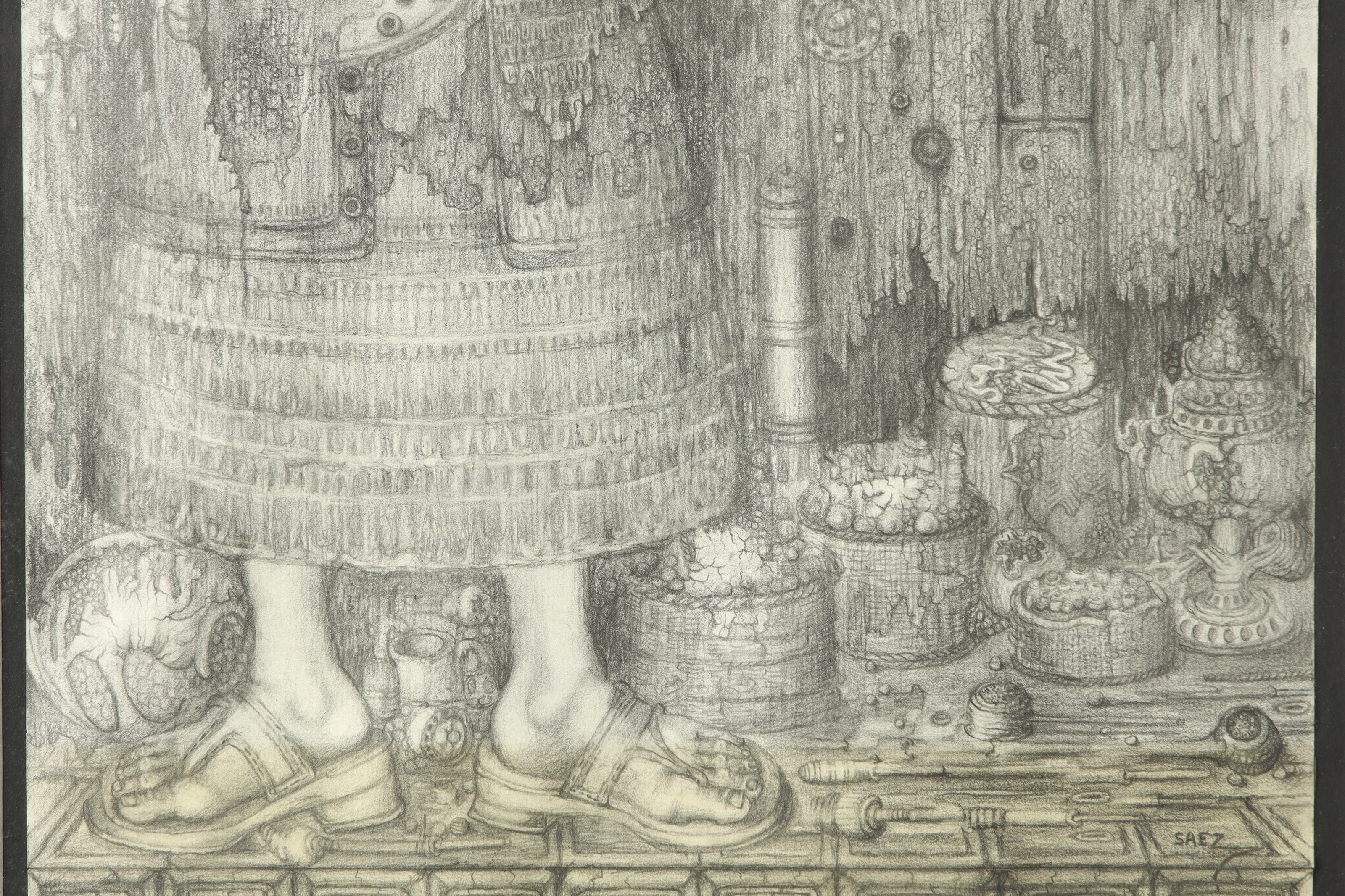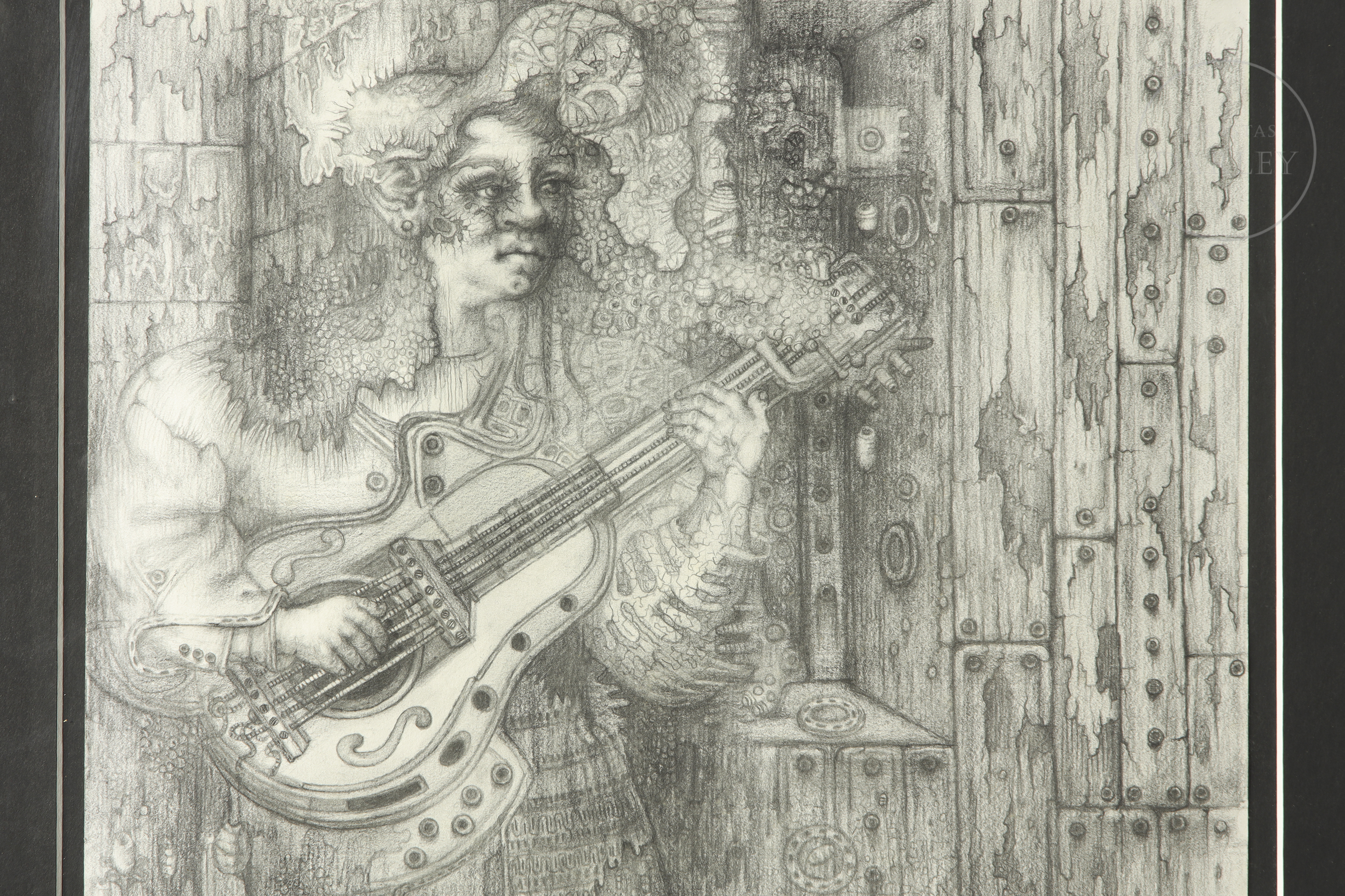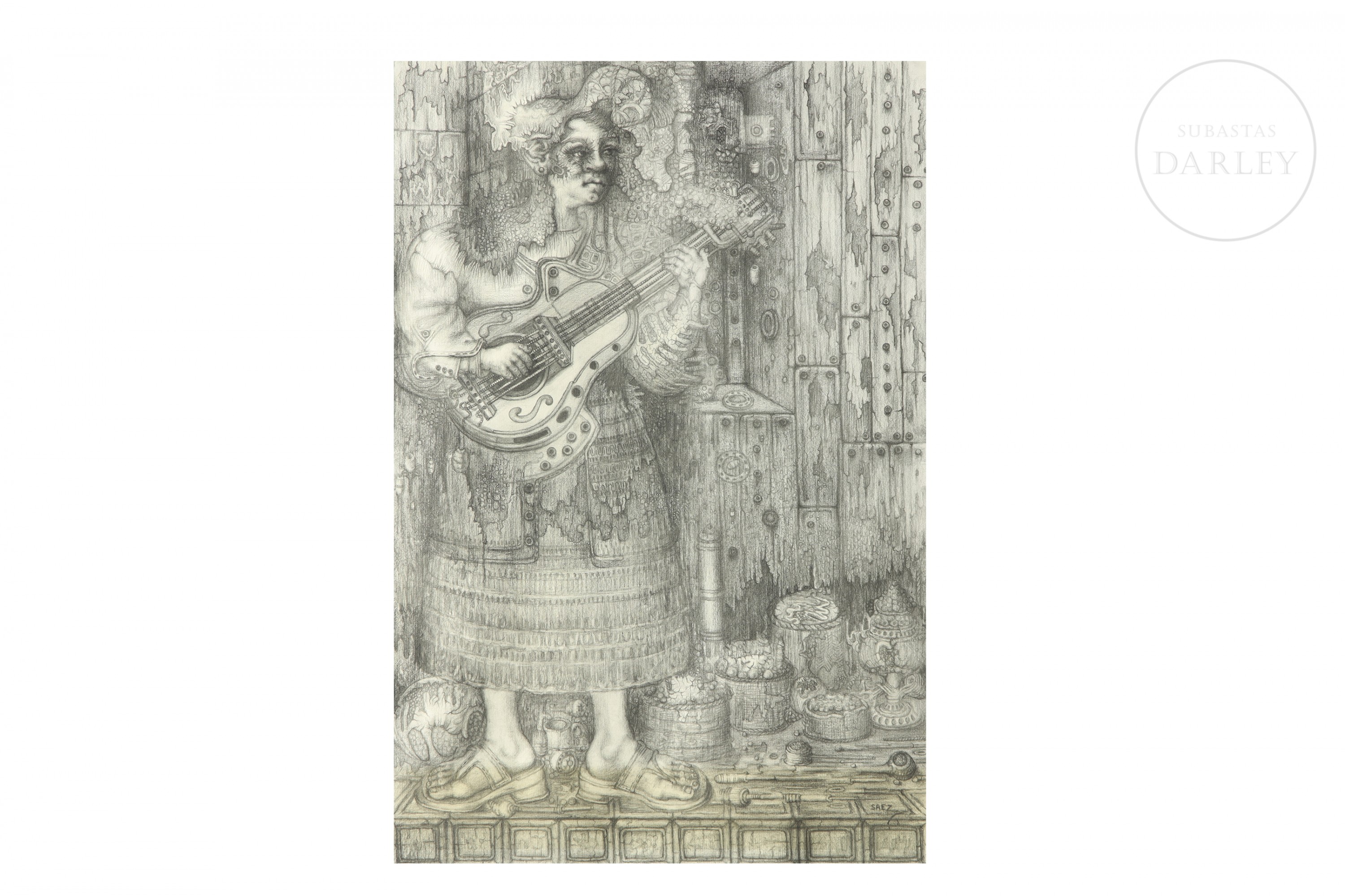 Graphite on paper. Composition depicting a female figure playing a guitar in a dreamlike setting. Signed ‘SAEZ’ in the lower right corner.