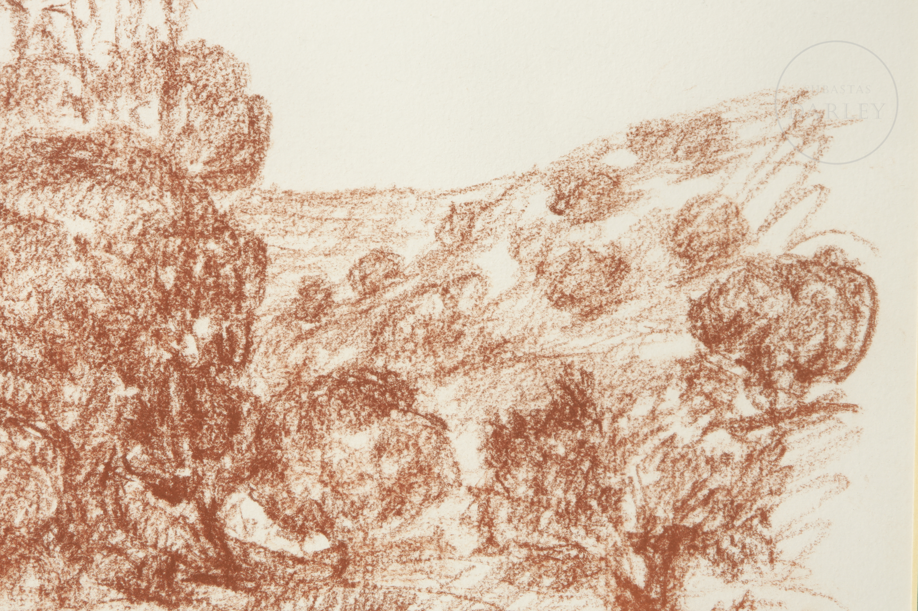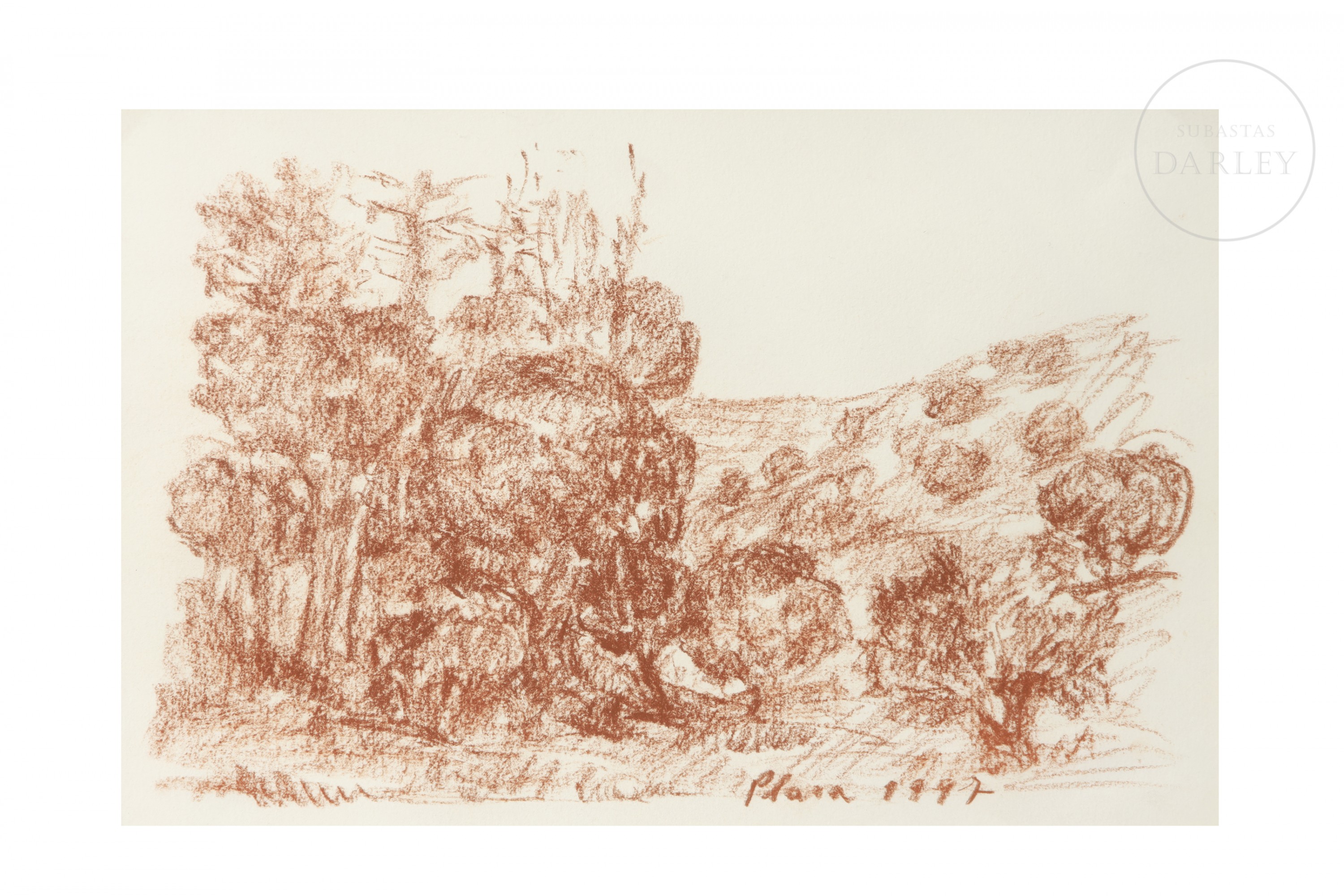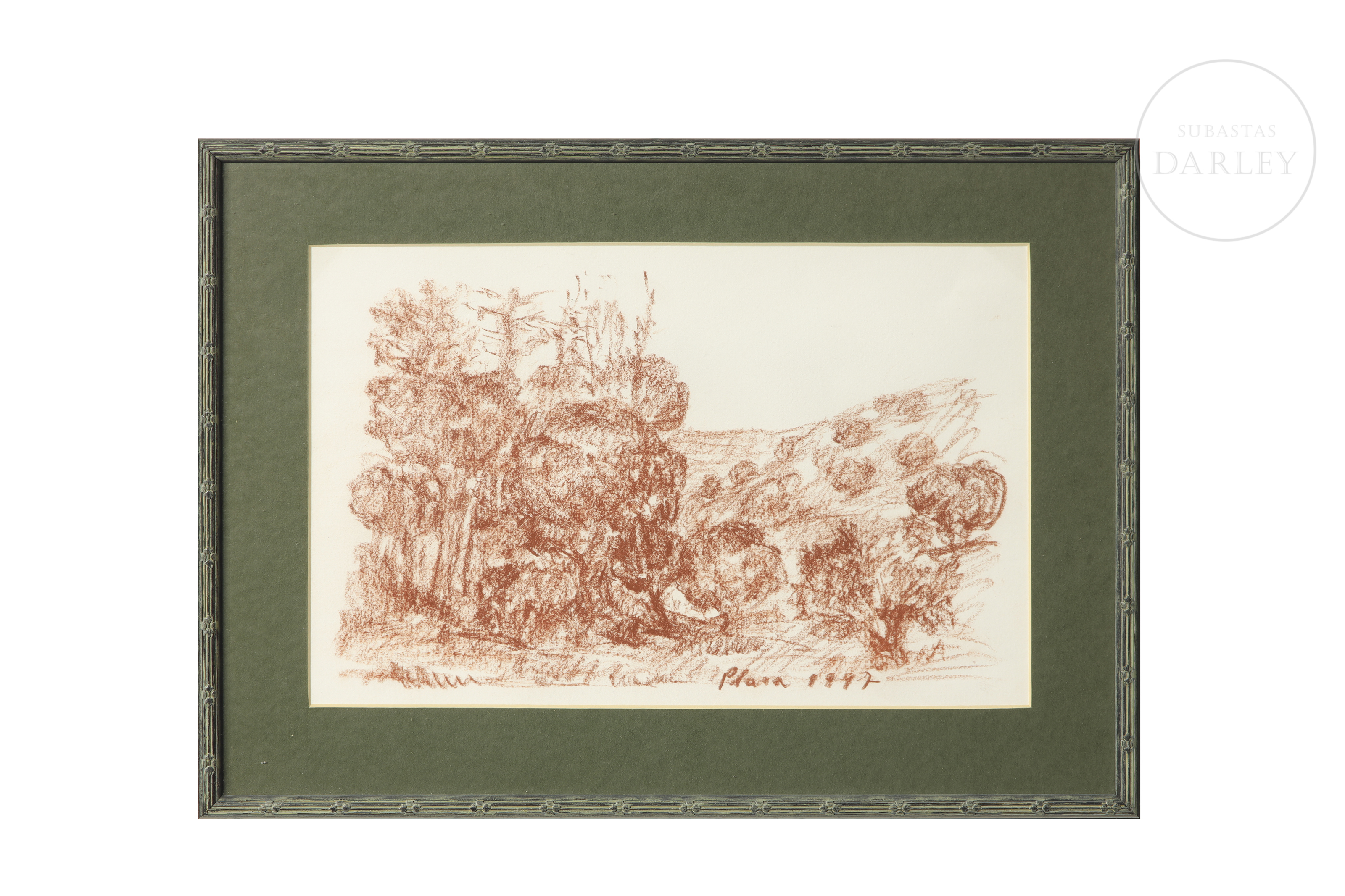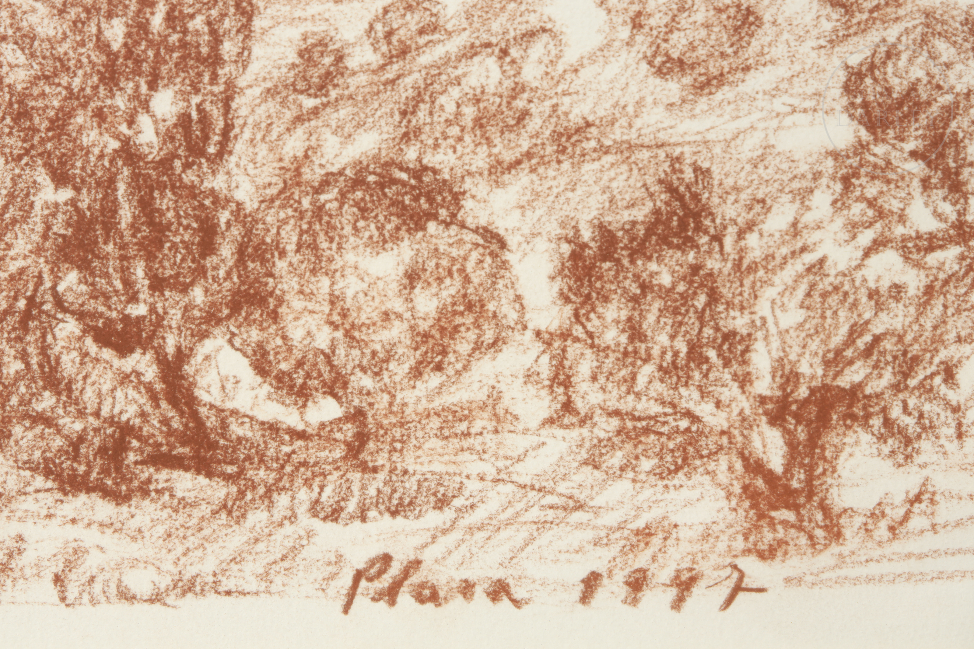 Red chalk on paper. Red chalk drawing depicting a landscape of trees and hills, rendered with textured, energetic strokes. Signed and dated ‘Plana 1997’ at the bottom.