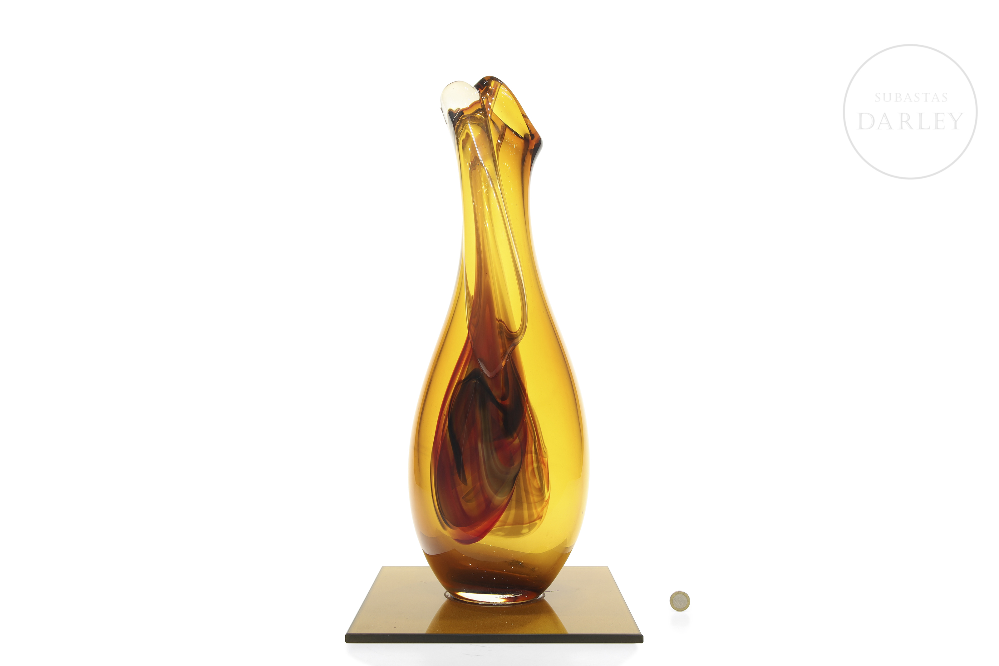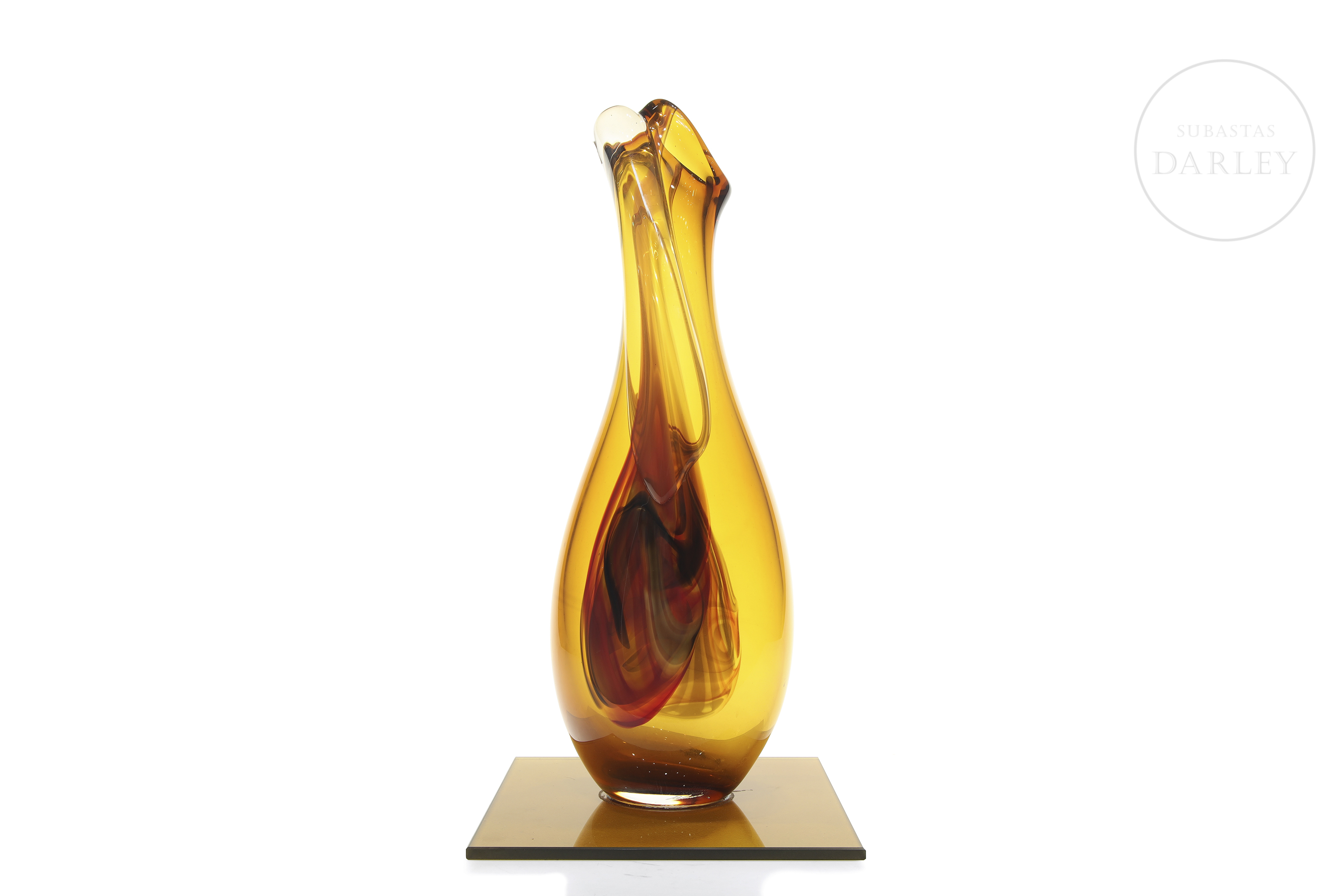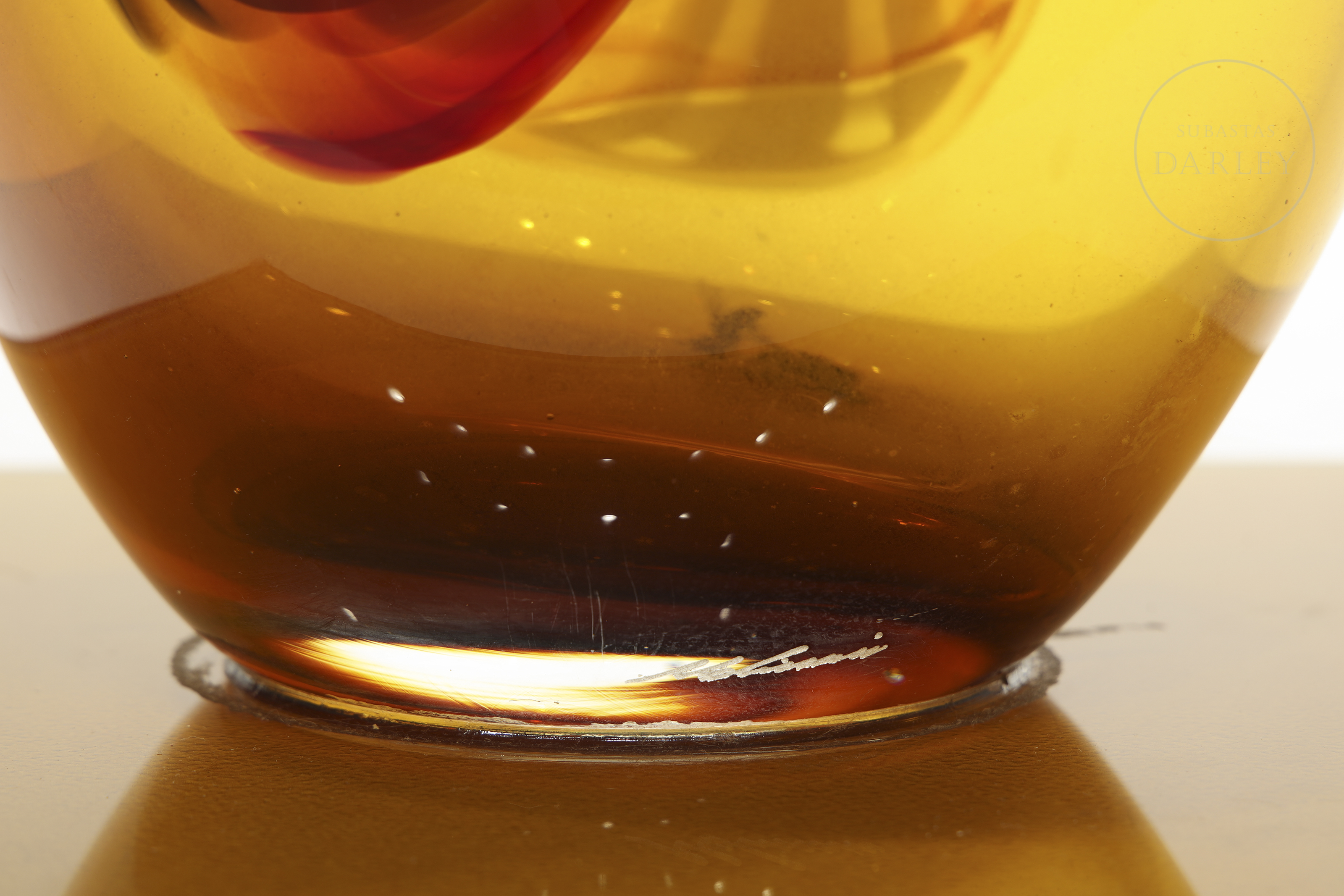 Beautiful Murano glass vase. Signed “Molinari” on one of the lower sides. The vase, amber coloured with a dark reddish heart, is attached to the base by an adhesive. No visible chips or cracks.