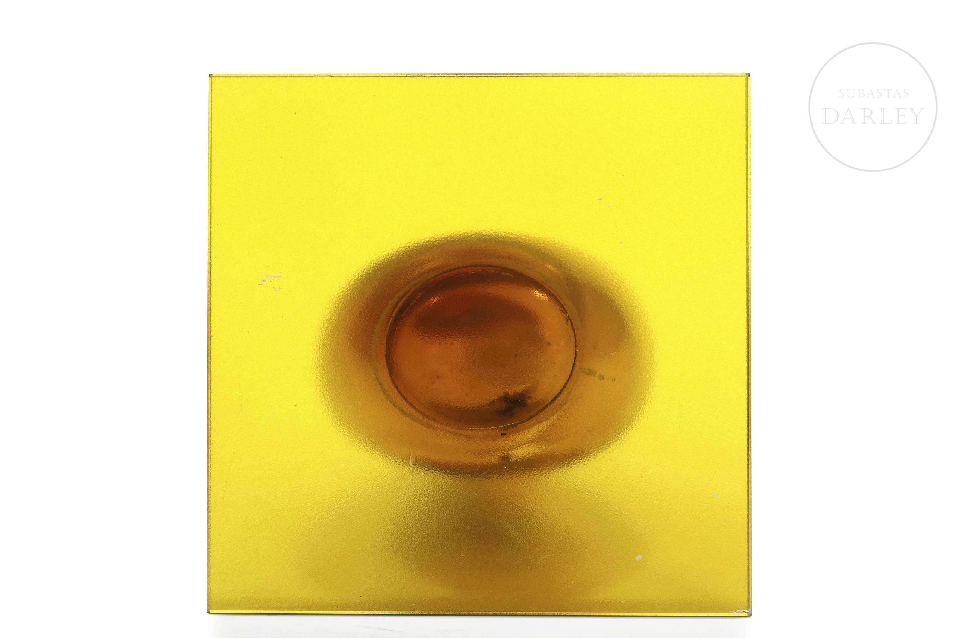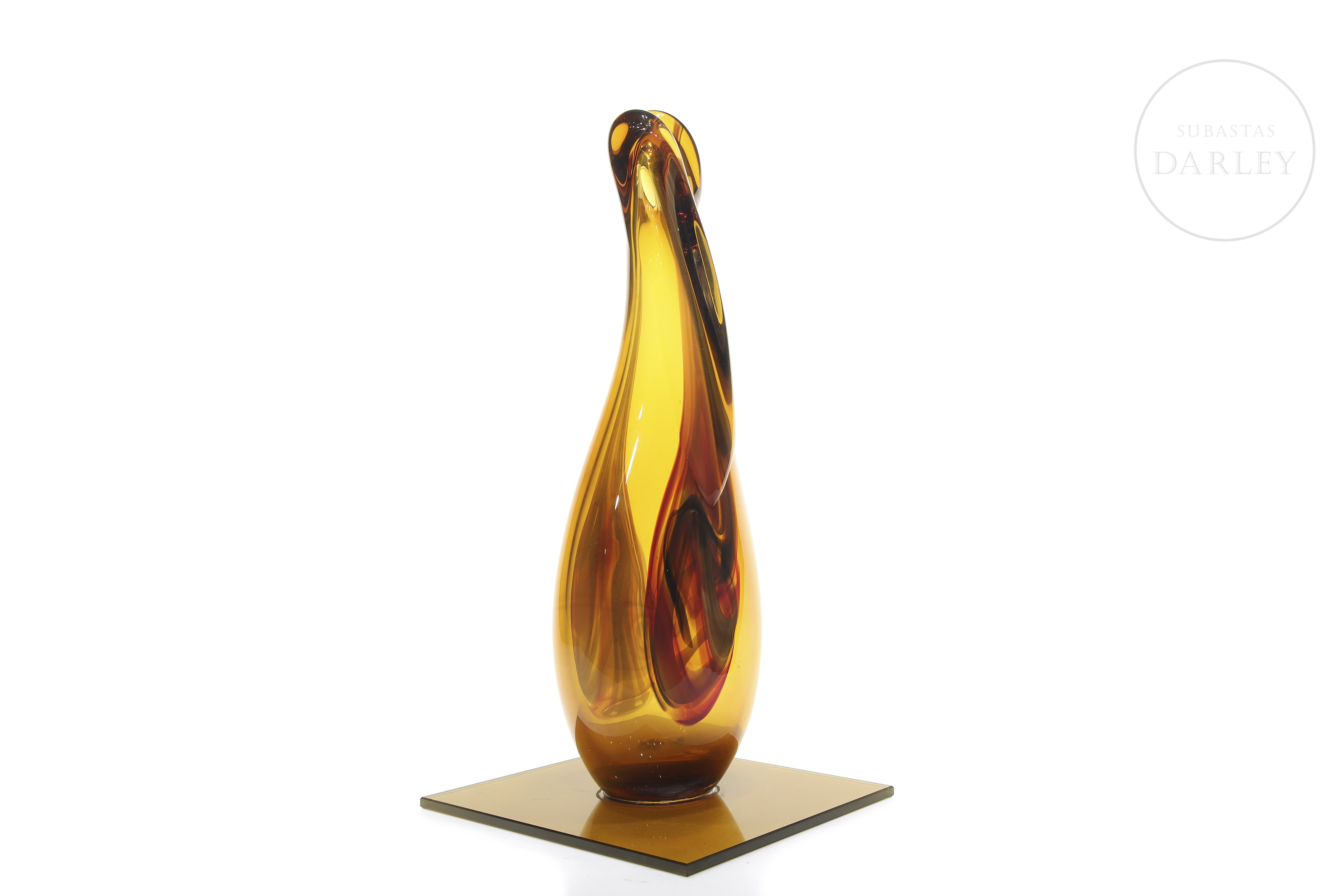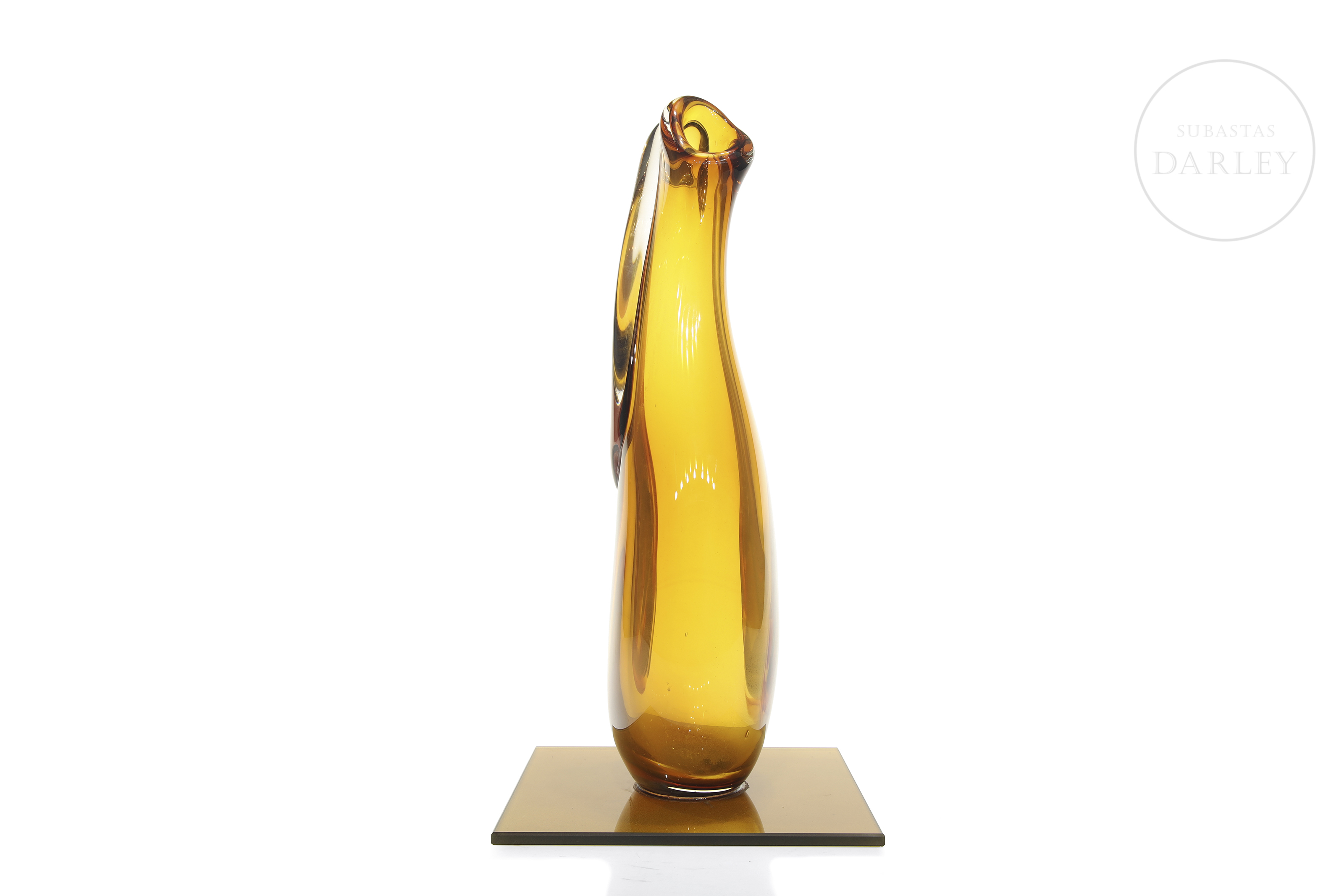 Beautiful Murano glass vase. Signed “Molinari” on one of the lower sides. The vase, amber coloured with a dark reddish heart, is attached to the base by an adhesive. No visible chips or cracks.