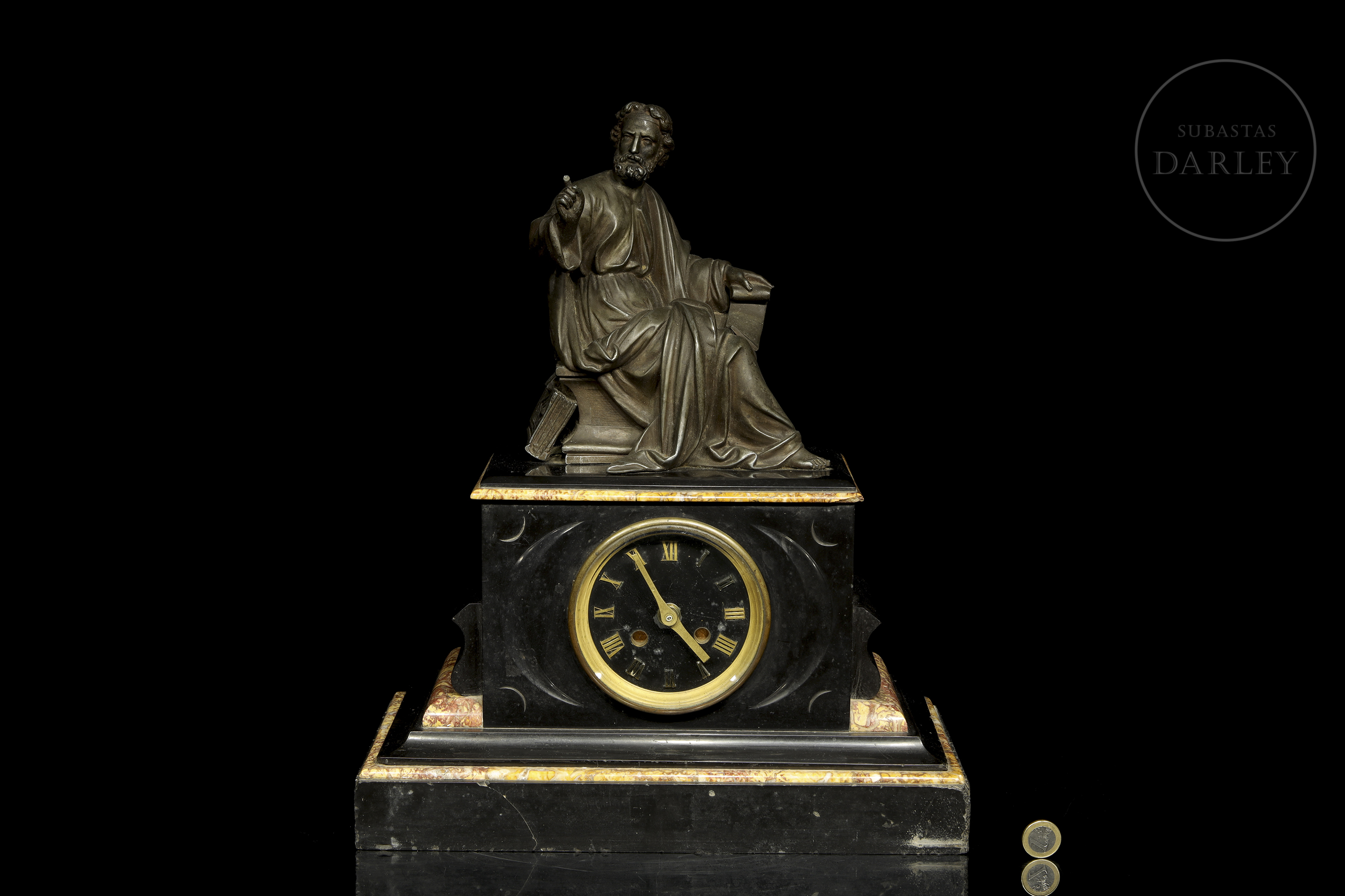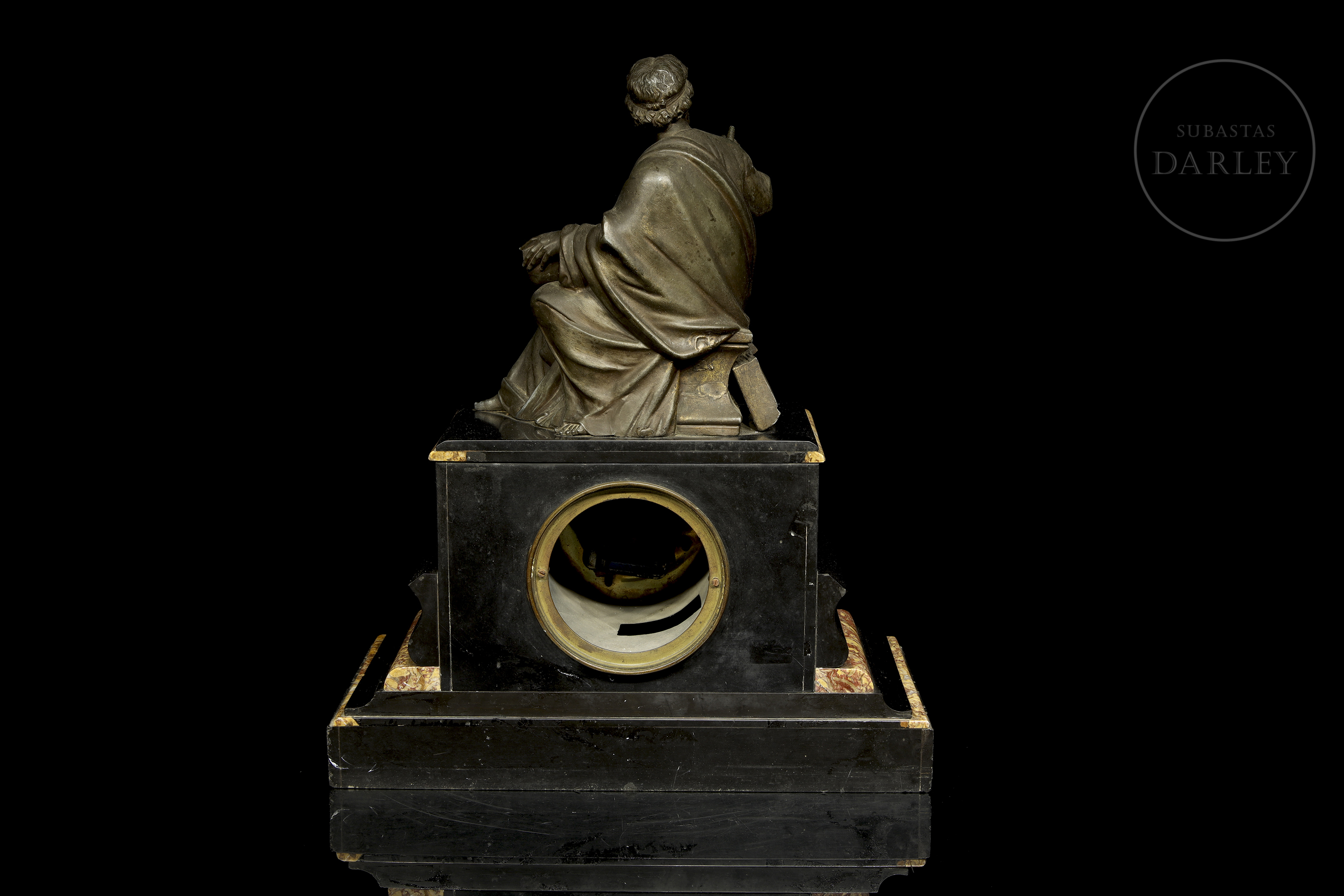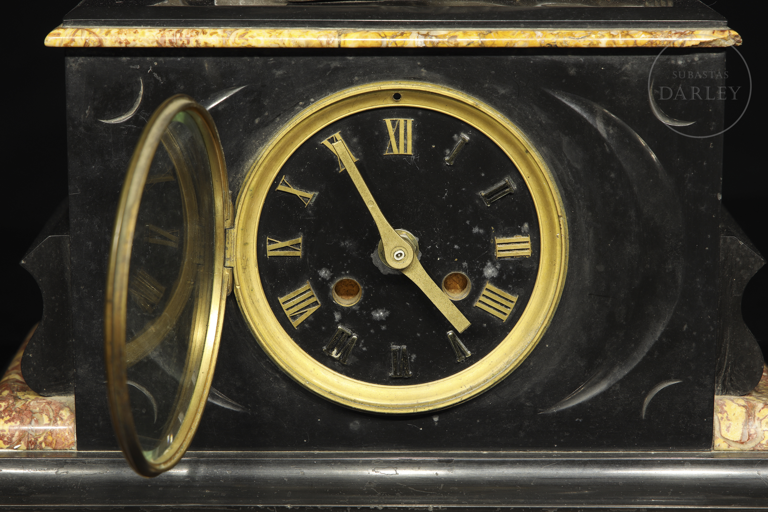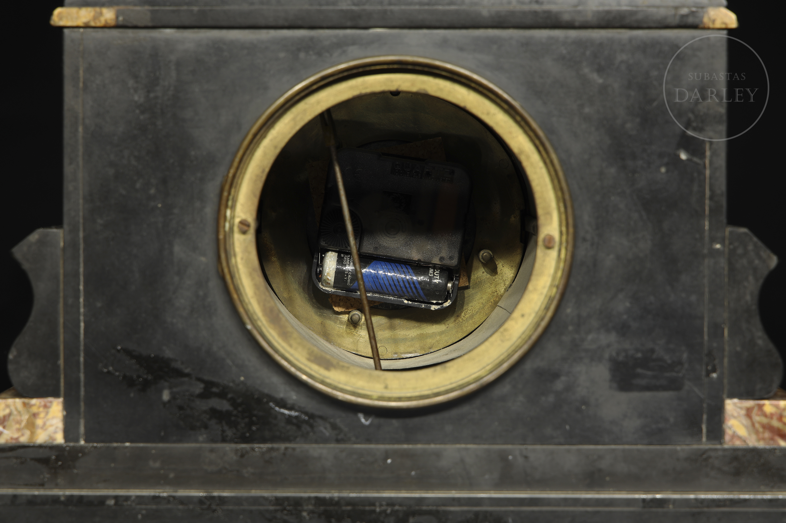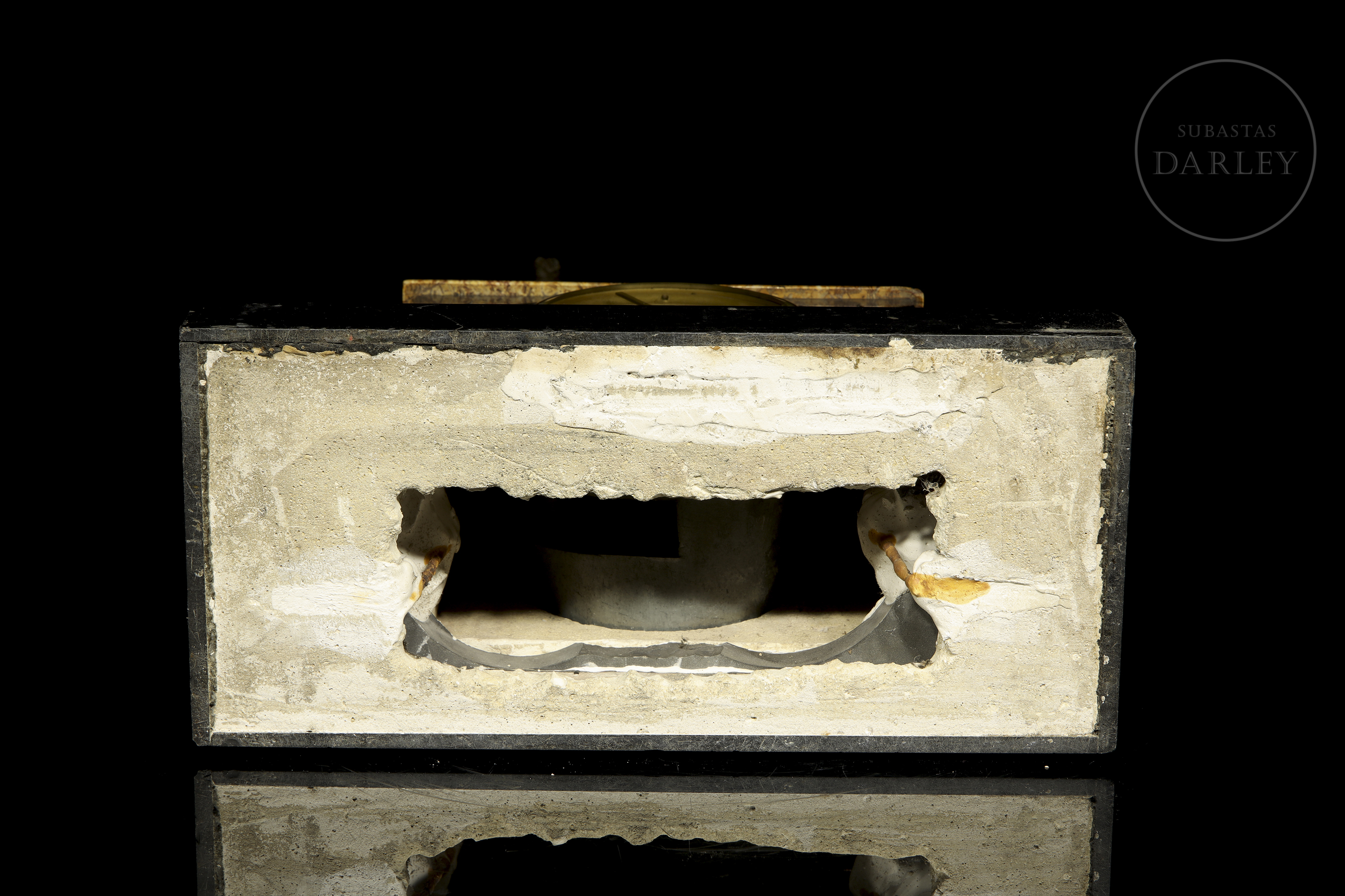 Black marble table clock, decorated with a calamine sculpture in the upper area. It has an adapted battery-operated mechanism. With wear and slight losses.