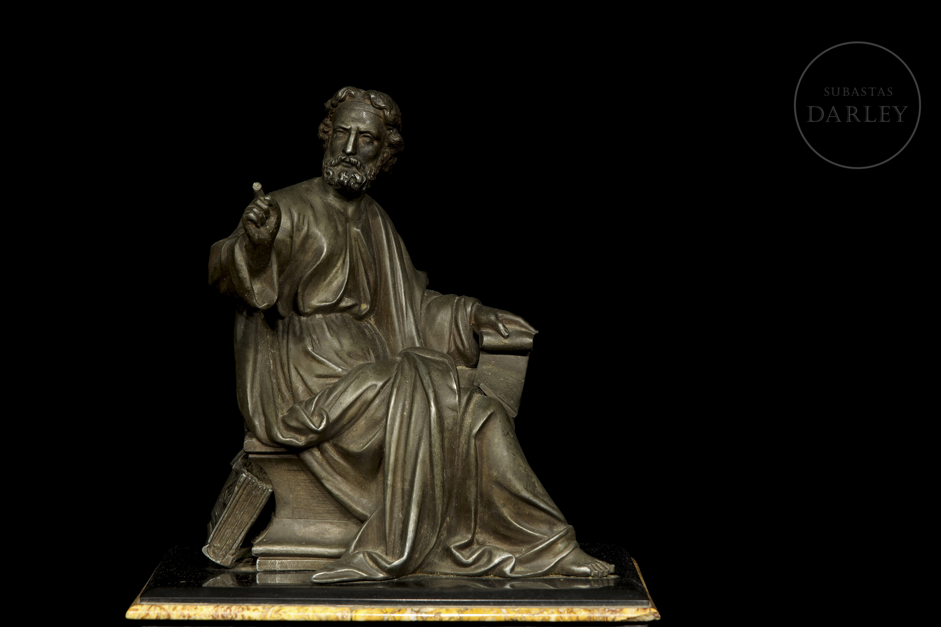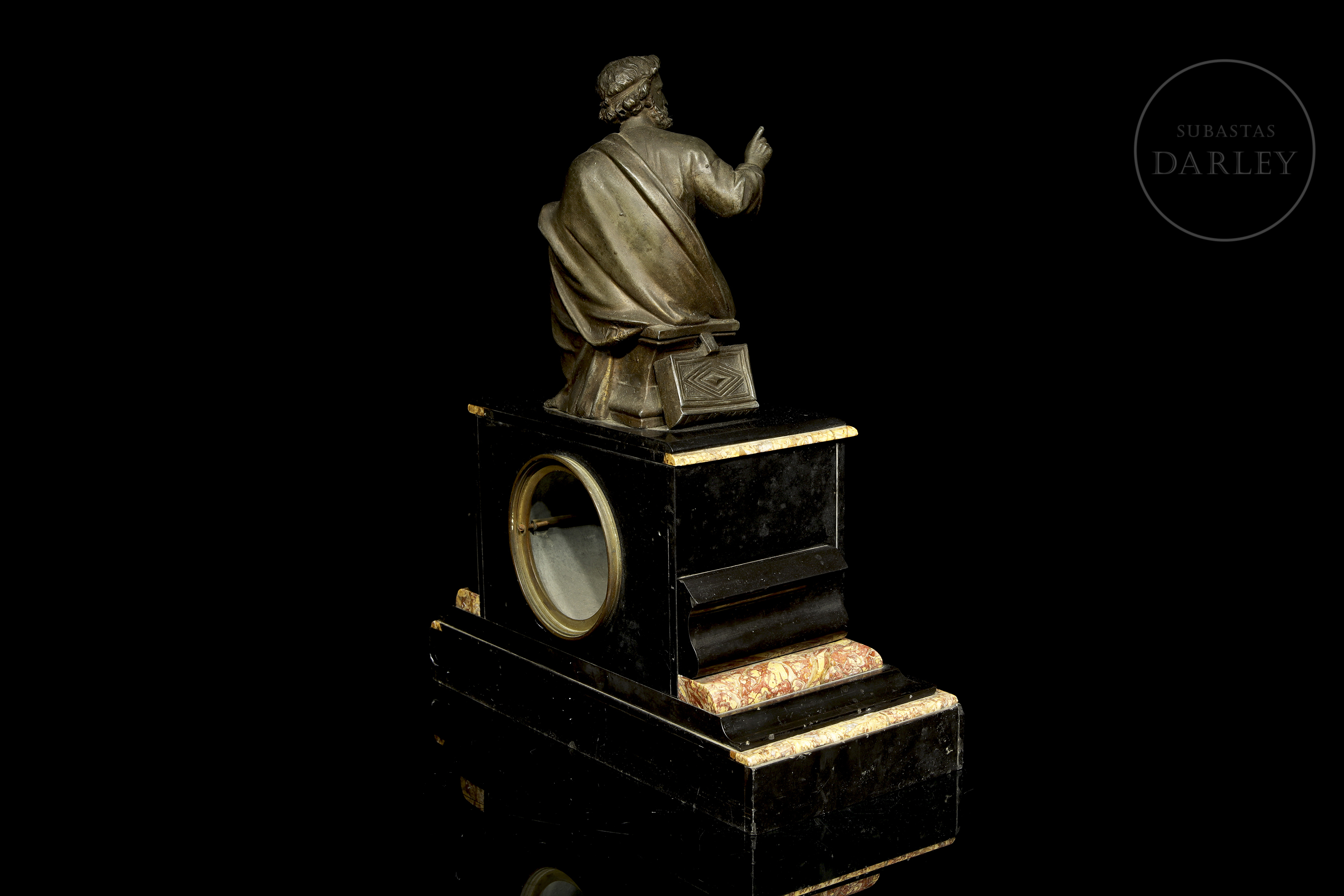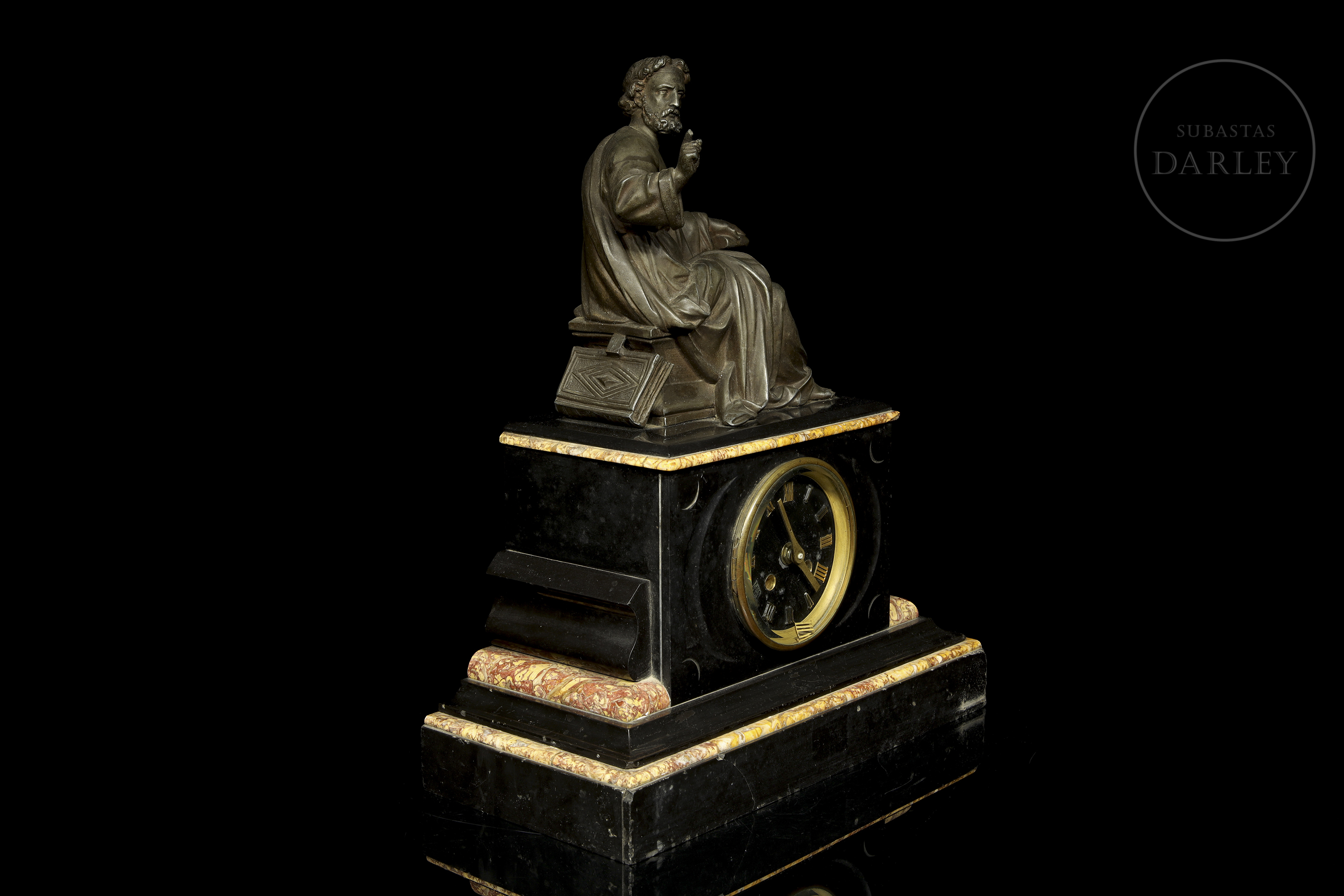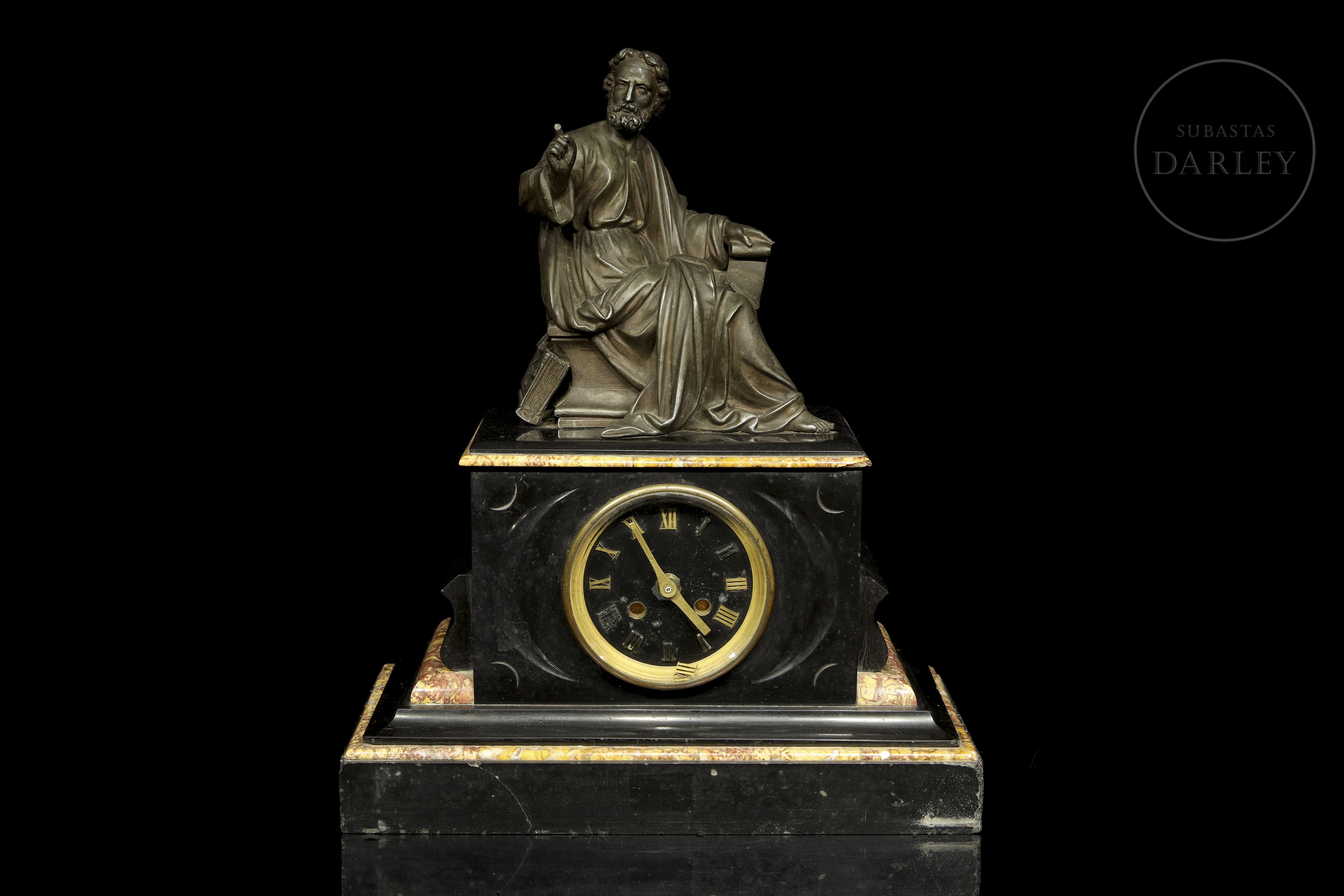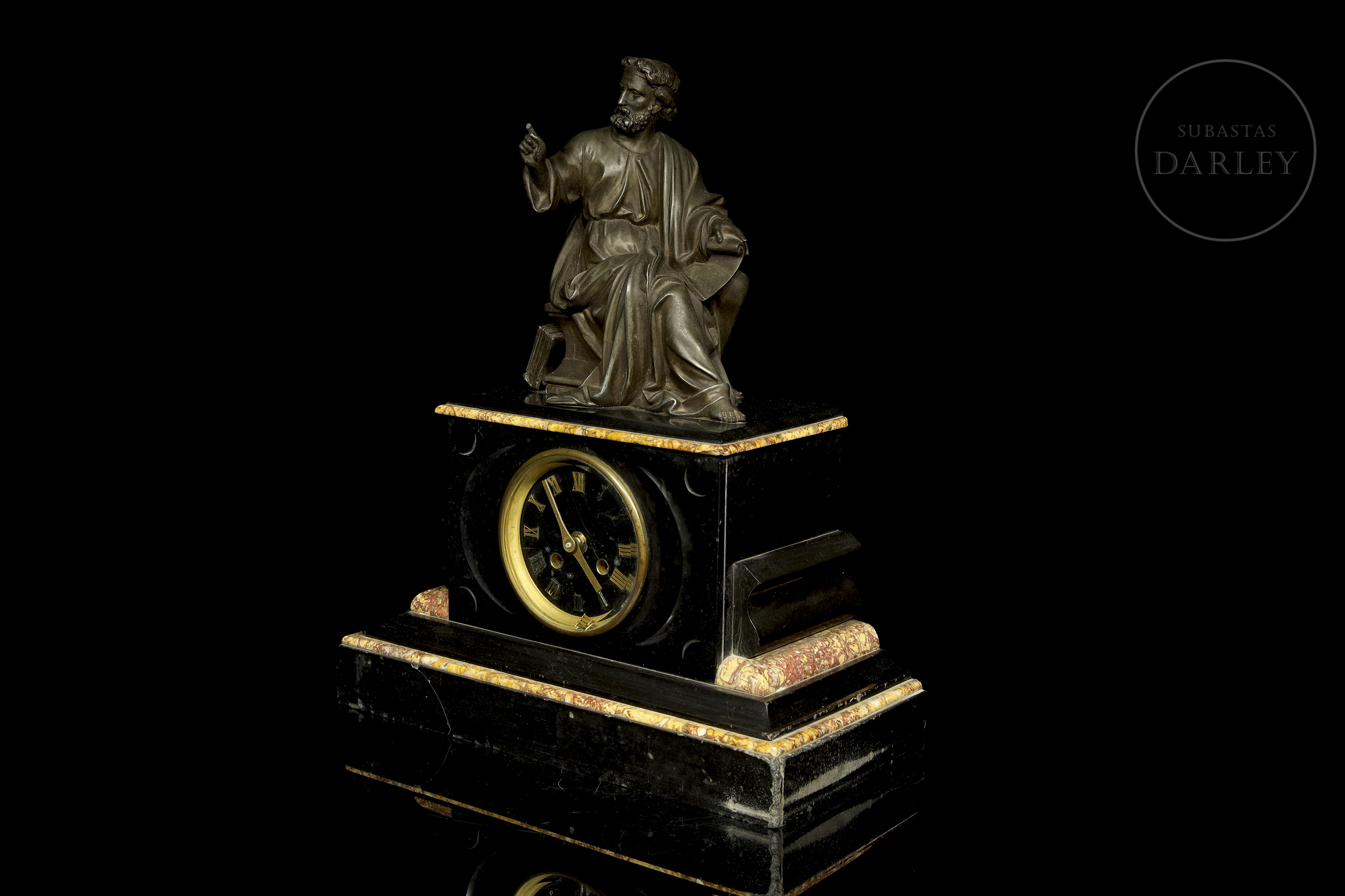 Black marble table clock, decorated with a calamine sculpture in the upper area. It has an adapted battery-operated mechanism. With wear and slight losses.